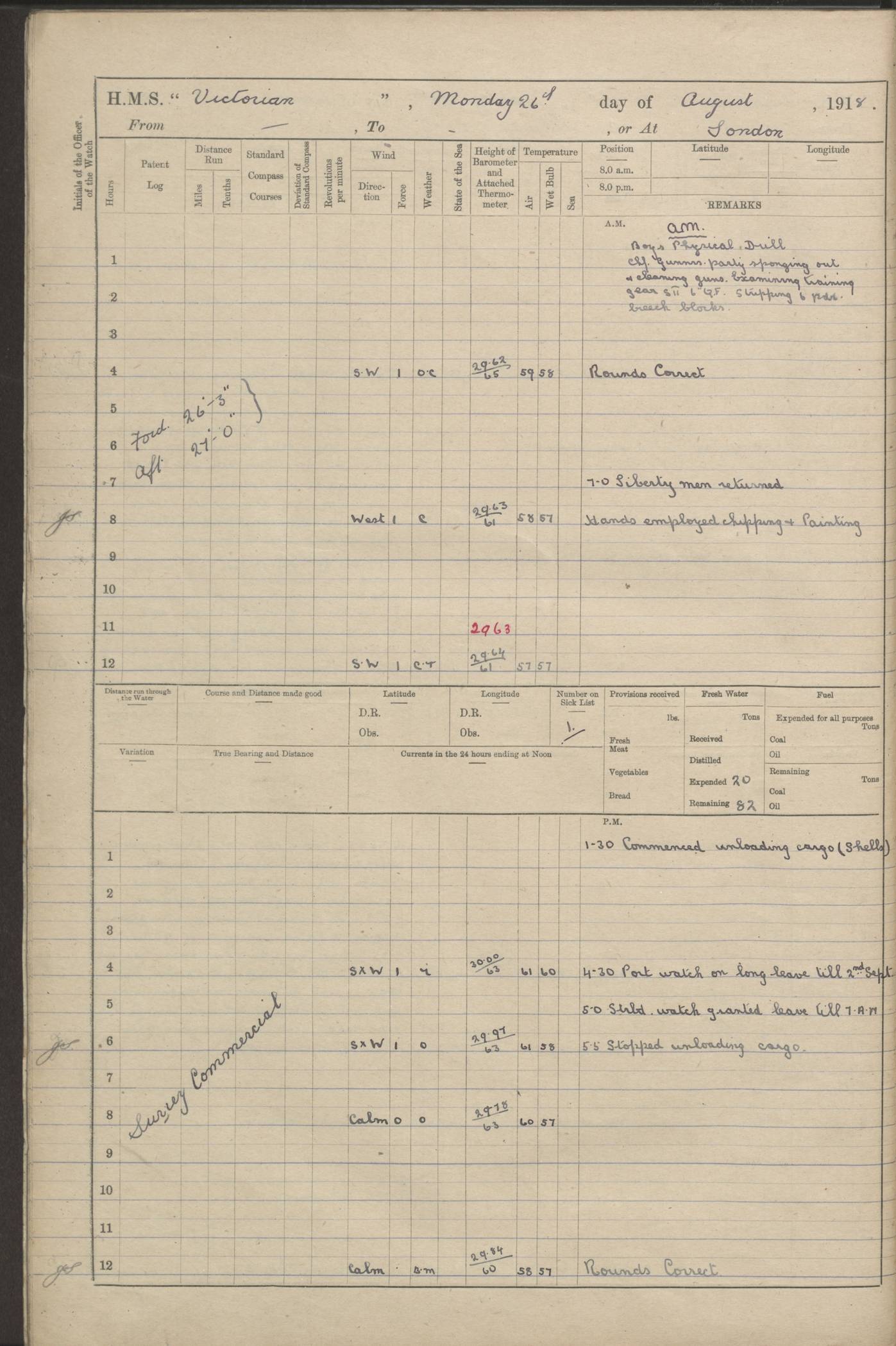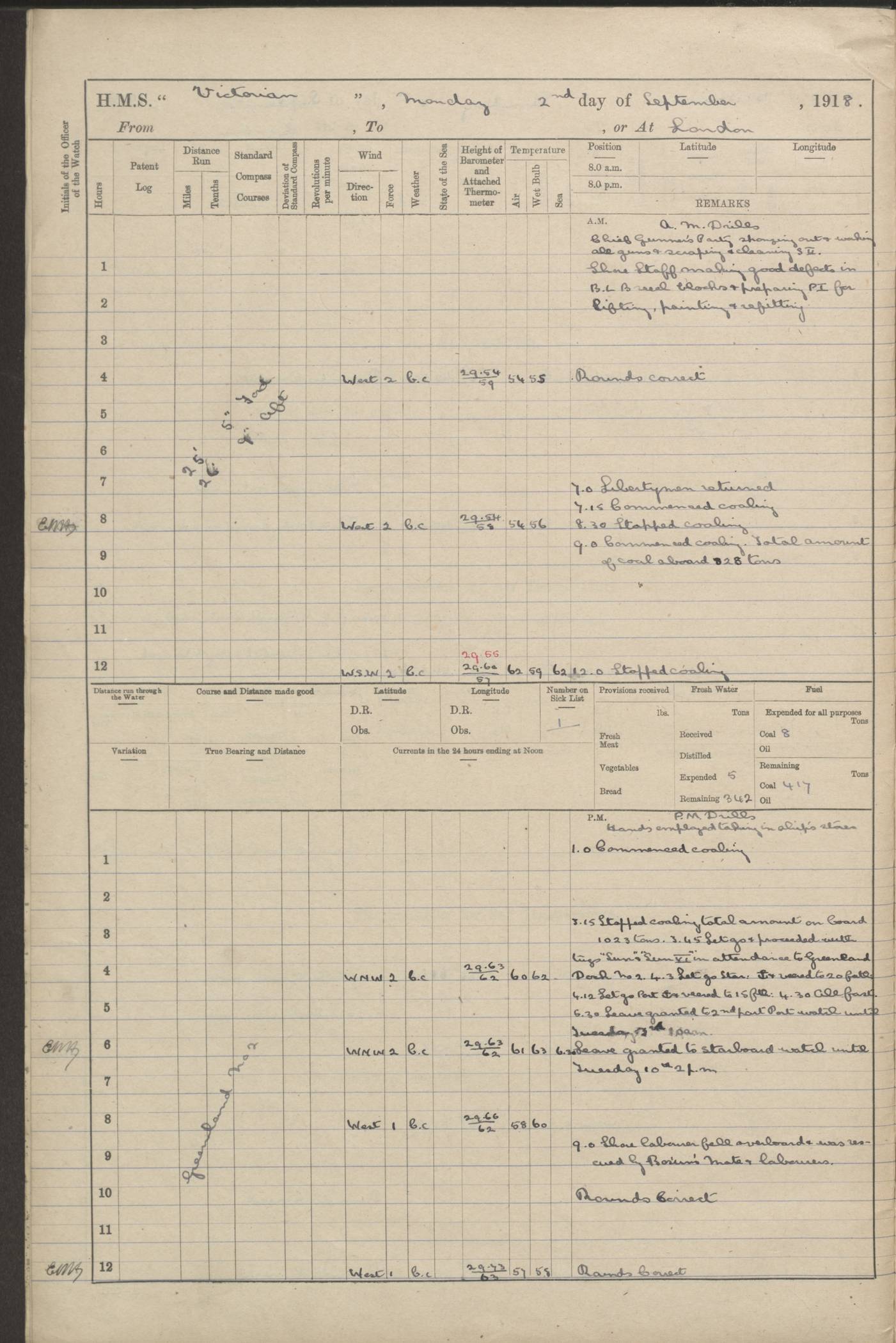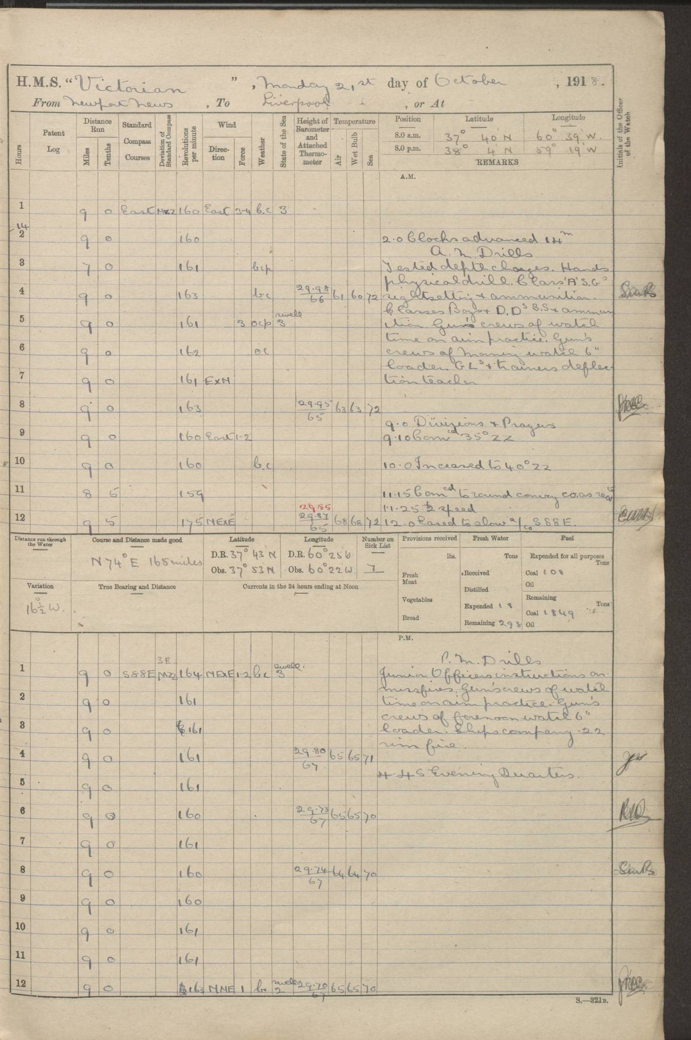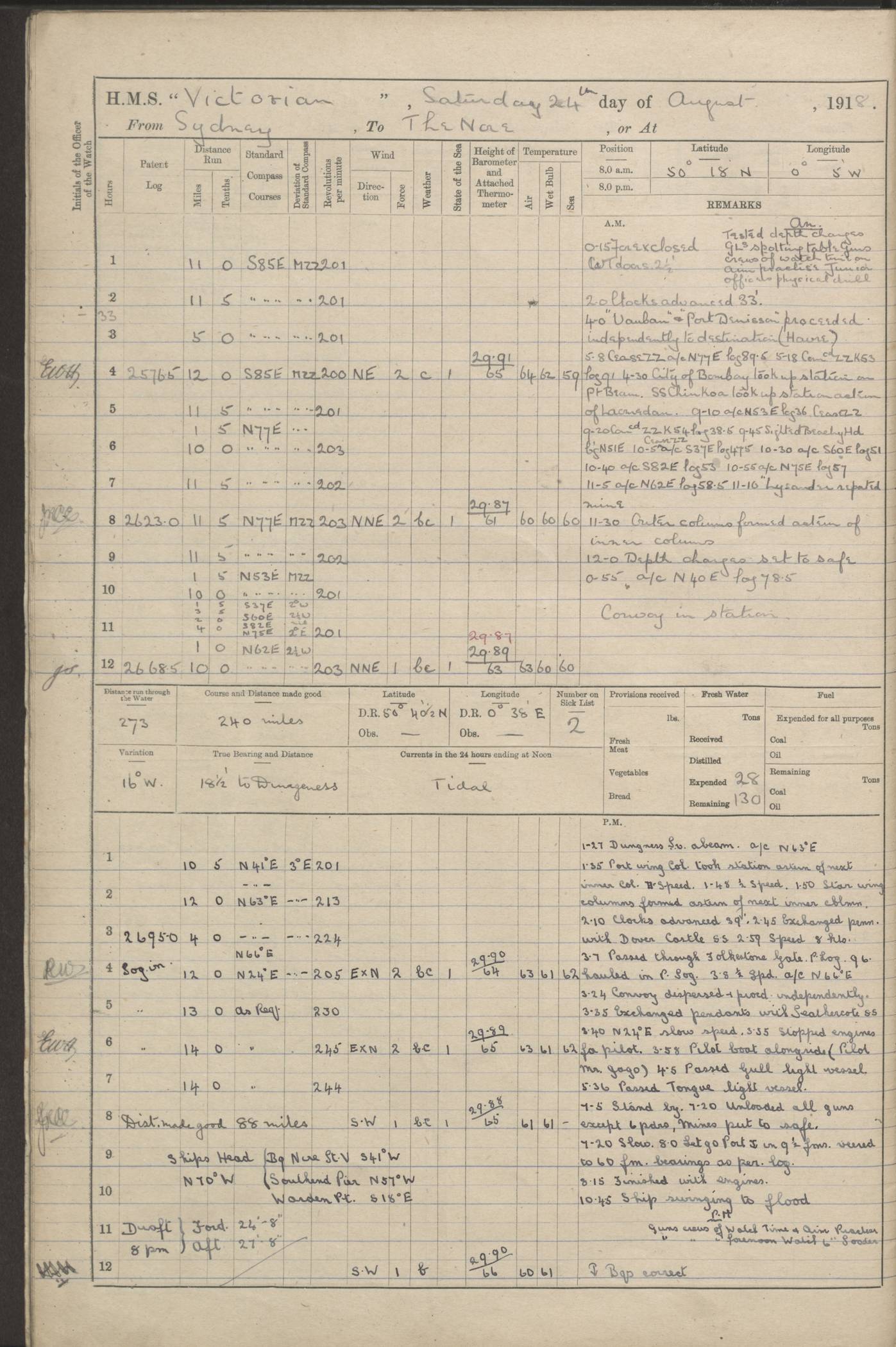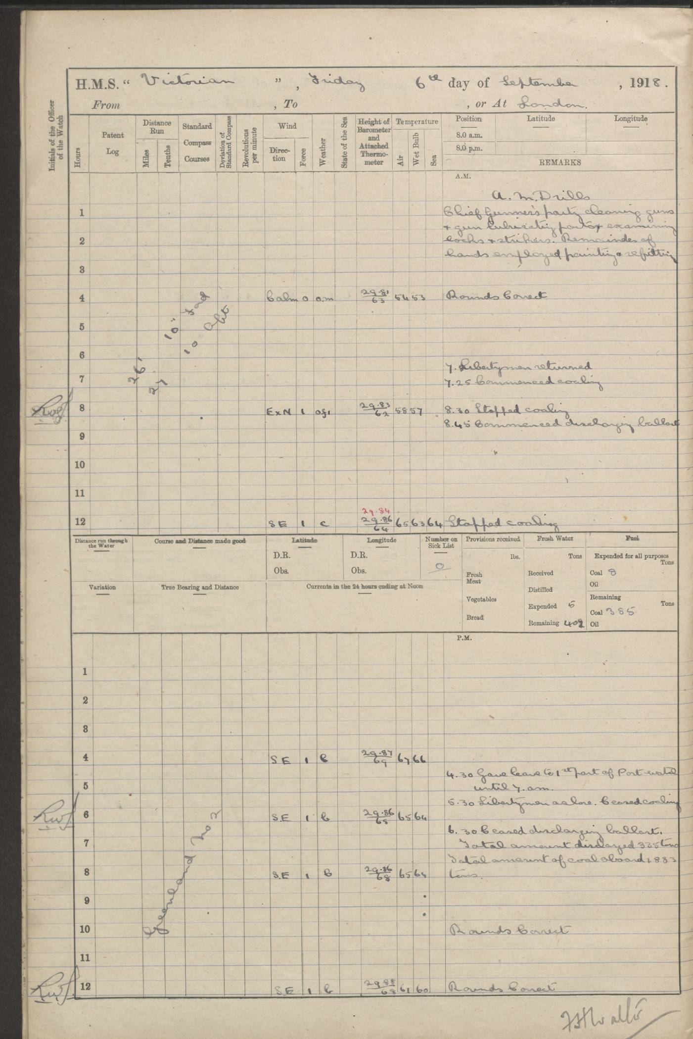 (Maps prepared using Journey Plotter, developed by Maikel. The Plots can only be approximate. They are made by joining-up positions on successive days, and sometimes positions are not given. There will therefore be occasions when the ship appears to have travelled overland) LOGS FOR AUGUST 1914 4caf8c39cadfd341970352c4: (http://oldweather.s3.amazonaws.com/ADM53-67374/ADM53-67374-001_0.jpg) 4caf8c39cadfd341970352c5: (http://oldweather.s3.amazonaws.com/ADM53-67374/ADM53-67374-001_1.jpg) 4caf8c39cadfd341970352c6: (http://oldweather.s3.amazonaws.com/ADM53-67374/ADM53-67374-002_0.jpg) 4caf8c39cadfd341970352c7: (http://oldweather.s3.amazonaws.com/ADM53-67374/ADM53-67374-002_1.jpg) 4caf8c39cadfd341970352c8: (http://oldweather.s3.amazonaws.com/ADM53-67374/ADM53-67374-003_0.jpg) 4caf8c39cadfd341970352c9: (http://oldweather.s3.amazonaws.com/ADM53-67374/ADM53-67374-003_1.jpg) 4caf8c39cadfd341970352ca: (http://oldweather.s3.amazonaws.com/ADM53-67374/ADM53-67374-004_0.jpg) 4caf8c39cadfd341970352cb: (http://oldweather.s3.amazonaws.com/ADM53-67374/ADM53-67374-004_1.jpg) 4caf8c39cadfd341970352cc: (http://oldweather.s3.amazonaws.com/ADM53-67374/ADM53-67374-005_0.jpg) 4caf8c39cadfd341970352cd: (http://oldweather.s3.amazonaws.com/ADM53-67374/ADM53-67374-005_1.jpg) Establishment of ship’s company Officers 44 Seamen 114 Boys ‒ Marines 38 Engine-room establishment 75 Other non-executive ratings 44 Total 315 BAROMETER Mercurial or aneroid: Mercurial Name of maker and number: Dobbie McInnes Height of cistern above sea: 55ft Error of mercurial barometer: .10 too low at 29.28 Thermometers for air temperature Position in ship: Fore bridge Whether in screen: Yes Maker and number: AC Cossor 3942C Date: From August 23 POSITION OF STANDARD COMPASS Top of wheel house on bridge DEVIATION OF STANDARD COMPASS Date obtained: August 23rd 1914 Position: River Mersey ARMAMENT Position: 2 guns forecastle head 2 guns forward house 2 guns after house 2 guns poop Number and nature of guns and mounting: 8 4.7” QF; P111 mountings TORPEDO ARMAMENT None BOATS Number of each carried: 8 Length and description: A lifeboats (wood) 26.2 ft Number of each carried: 4 Length and description: A lifeboats (steel) 26.0 ft MISCELLANEOUS INFORMATION Draught of water with bunkers full, and complete with provisions, stores and water: 26 ft 11 in forward; 29 ft 5 in aft Load draught: 26 ft 11 in forward; 29 ft 5 in aft Number of tons of coal carried (43 cubic feet per ton): 4541 Number of tons of oil fuel carried: None Quantity of water carried: For boilers 230; for drinking 700 THE VOYAGES OF HMS VICTORIAN 1914