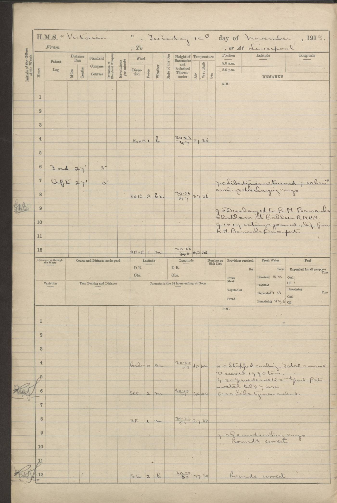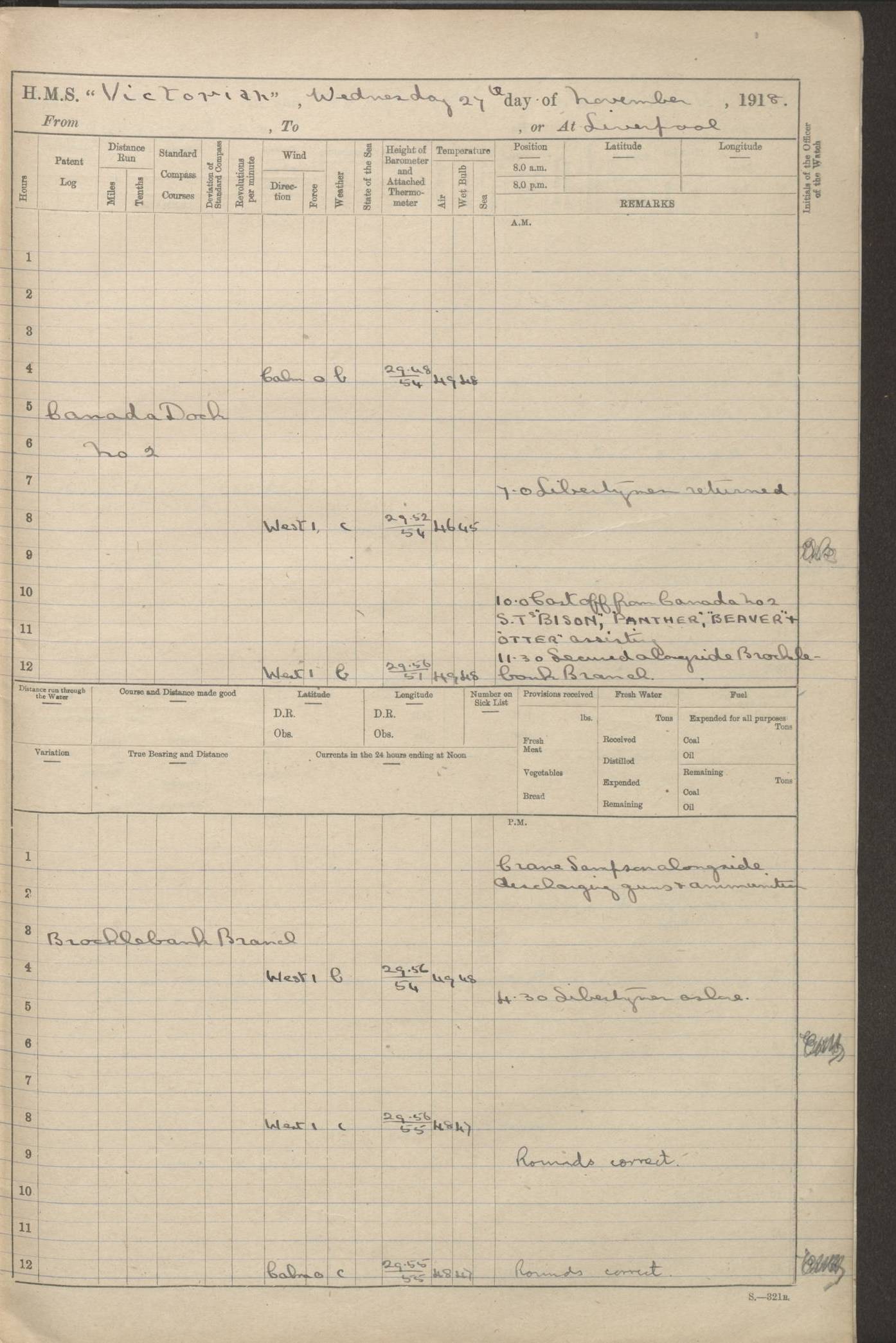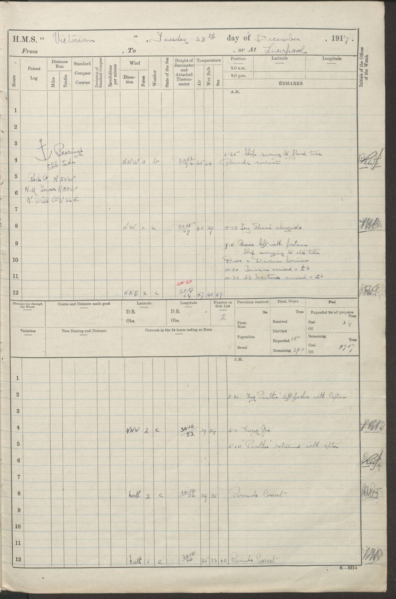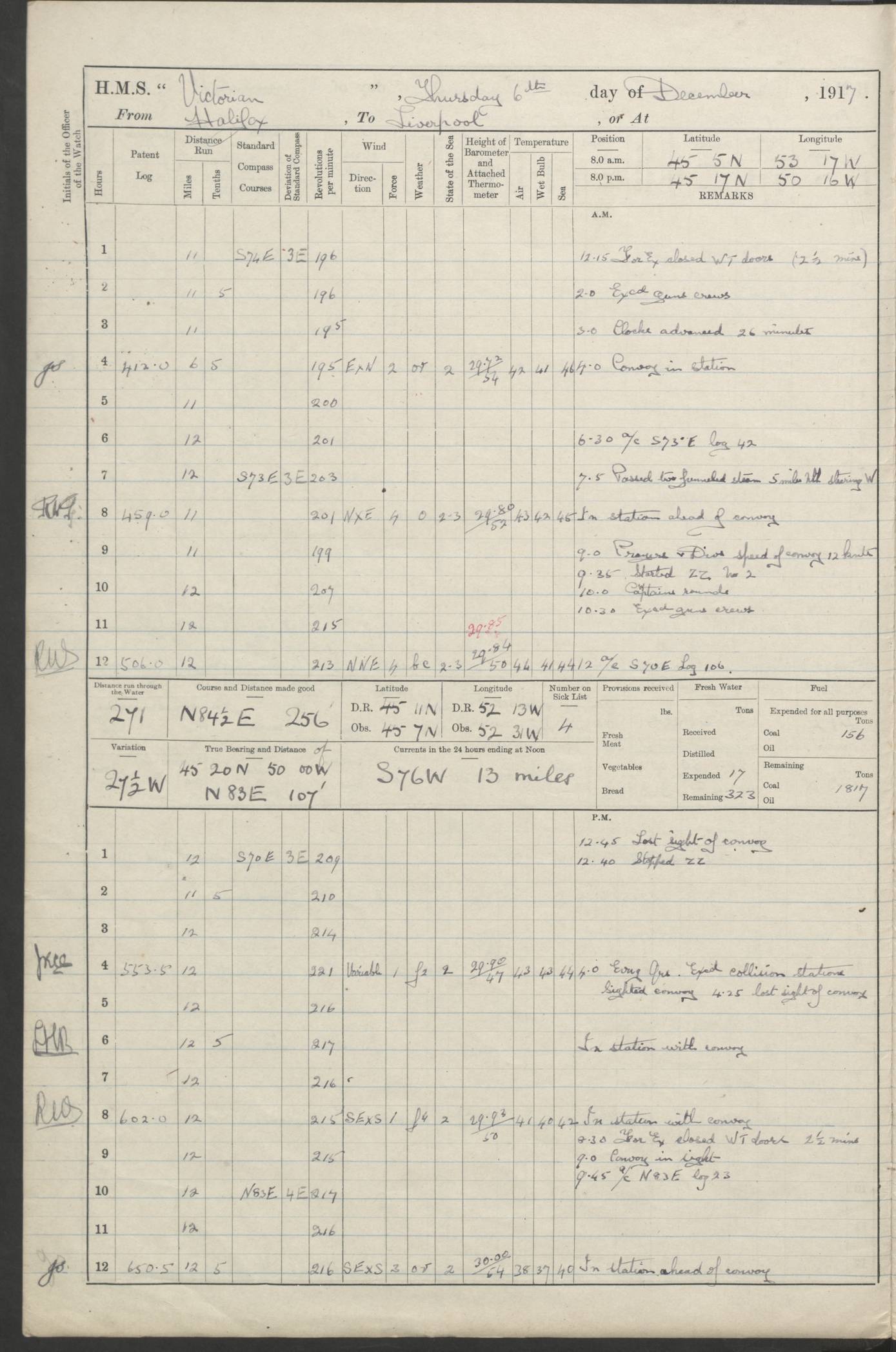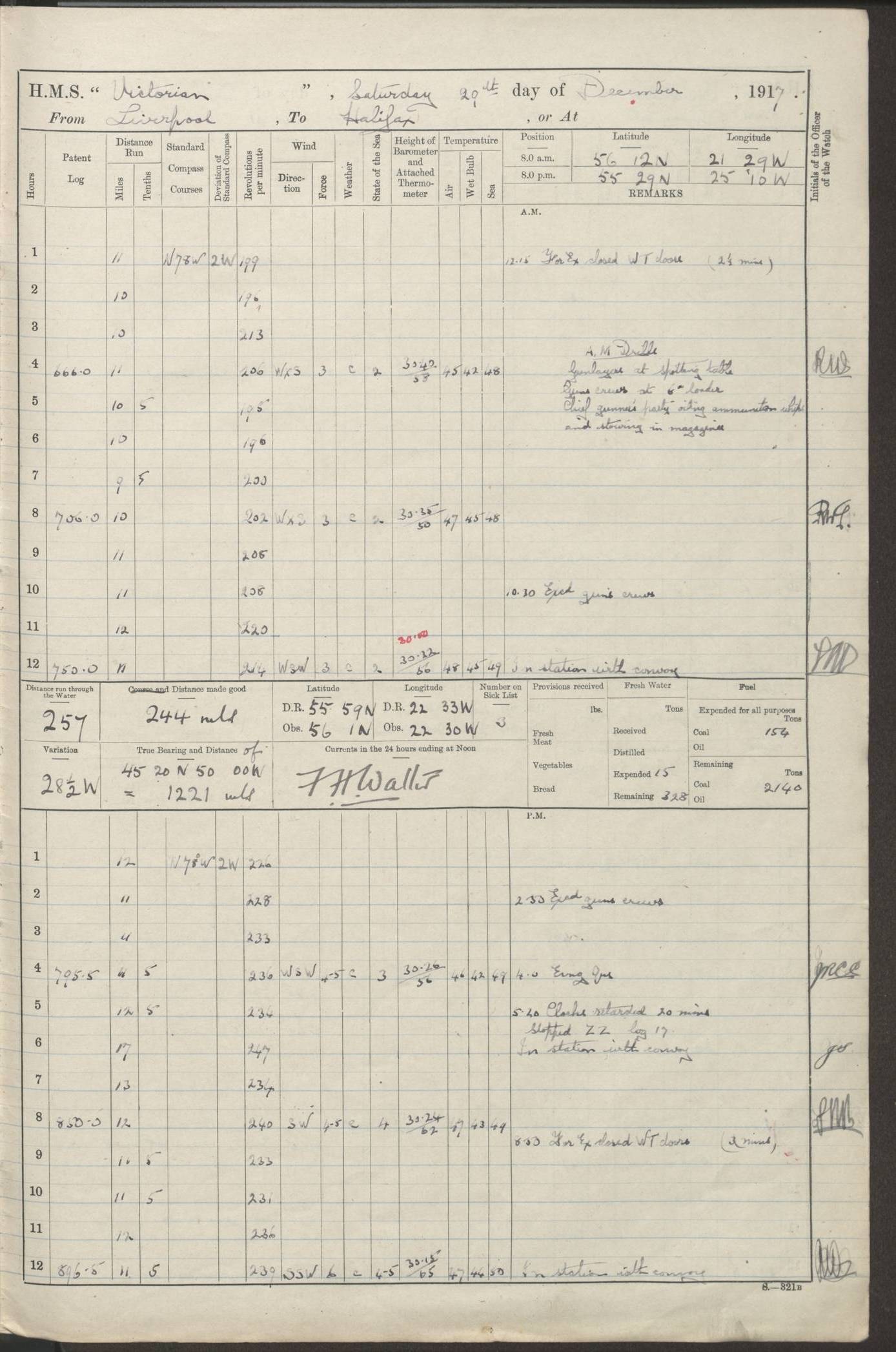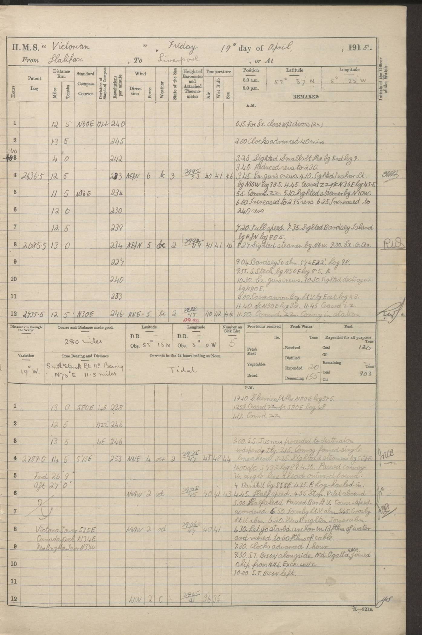 (Maps prepared using Journey Plotter, developed by Maikel. The Plots can only be approximate. They are made by joining-up positions on successive days, and sometimes positions are not given. There will therefore be occasions when the ship appears to have travelled overland) LOGS FOR AUGUST 1914 4caf8c39cadfd341970352c4: (http://oldweather.s3.amazonaws.com/ADM53-67374/ADM53-67374-001_0.jpg) 4caf8c39cadfd341970352c5: (http://oldweather.s3.amazonaws.com/ADM53-67374/ADM53-67374-001_1.jpg) 4caf8c39cadfd341970352c6: (http://oldweather.s3.amazonaws.com/ADM53-67374/ADM53-67374-002_0.jpg) 4caf8c39cadfd341970352c7: (http://oldweather.s3.amazonaws.com/ADM53-67374/ADM53-67374-002_1.jpg) 4caf8c39cadfd341970352c8: (http://oldweather.s3.amazonaws.com/ADM53-67374/ADM53-67374-003_0.jpg) 4caf8c39cadfd341970352c9: (http://oldweather.s3.amazonaws.com/ADM53-67374/ADM53-67374-003_1.jpg) 4caf8c39cadfd341970352ca: (http://oldweather.s3.amazonaws.com/ADM53-67374/ADM53-67374-004_0.jpg) 4caf8c39cadfd341970352cb: (http://oldweather.s3.amazonaws.com/ADM53-67374/ADM53-67374-004_1.jpg) 4caf8c39cadfd341970352cc: (http://oldweather.s3.amazonaws.com/ADM53-67374/ADM53-67374-005_0.jpg) 4caf8c39cadfd341970352cd: (http://oldweather.s3.amazonaws.com/ADM53-67374/ADM53-67374-005_1.jpg) Establishment of ship’s company Officers 44 Seamen 114 Boys ‒ Marines 38 Engine-room establishment 75 Other non-executive ratings 44 Total 315 BAROMETER Mercurial or aneroid: Mercurial Name of maker and number: Dobbie McInnes Height of cistern above sea: 55ft Error of mercurial barometer: .10 too low at 29.28 Thermometers for air temperature Position in ship: Fore bridge Whether in screen: Yes Maker and number: AC Cossor 3942C Date: From August 23 POSITION OF STANDARD COMPASS Top of wheel house on bridge DEVIATION OF STANDARD COMPASS Date obtained: August 23rd 1914 Position: River Mersey ARMAMENT Position: 2 guns forecastle head 2 guns forward house 2 guns after house 2 guns poop Number and nature of guns and mounting: 8 4.7” QF; P111 mountings TORPEDO ARMAMENT None BOATS Number of each carried: 8 Length and description: A lifeboats (wood) 26.2 ft Number of each carried: 4 Length and description: A lifeboats (steel) 26.0 ft MISCELLANEOUS INFORMATION Draught of water with bunkers full, and complete with provisions, stores and water: 26 ft 11 in forward; 29 ft 5 in aft Load draught: 26 ft 11 in forward; 29 ft 5 in aft Number of tons of coal carried (43 cubic feet per ton): 4541 Number of tons of oil fuel carried: None Quantity of water carried: For boilers 230; for drinking 700 THE VOYAGES OF HMS VICTORIAN 1914