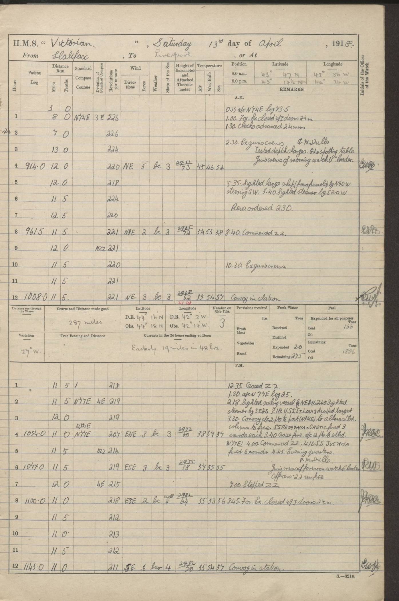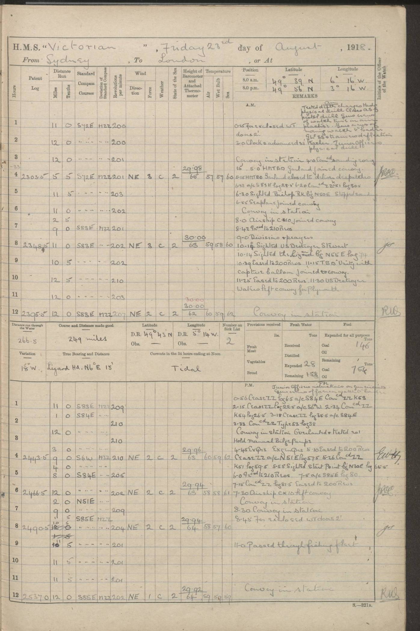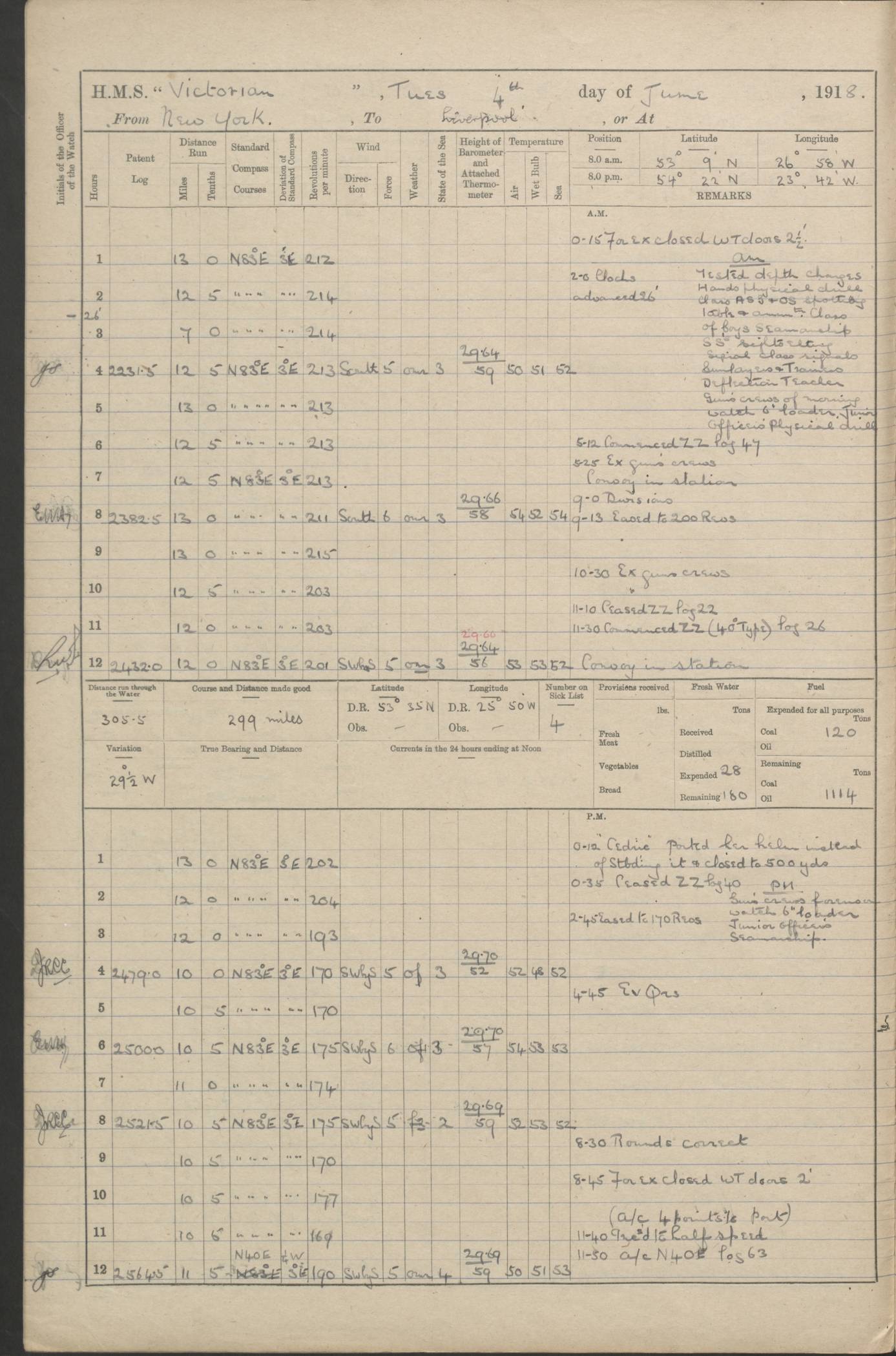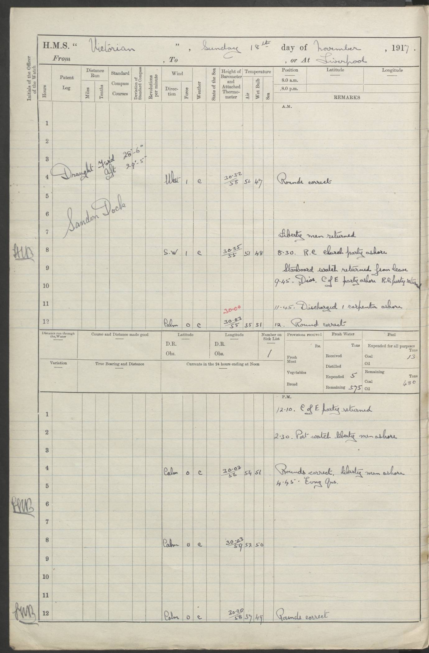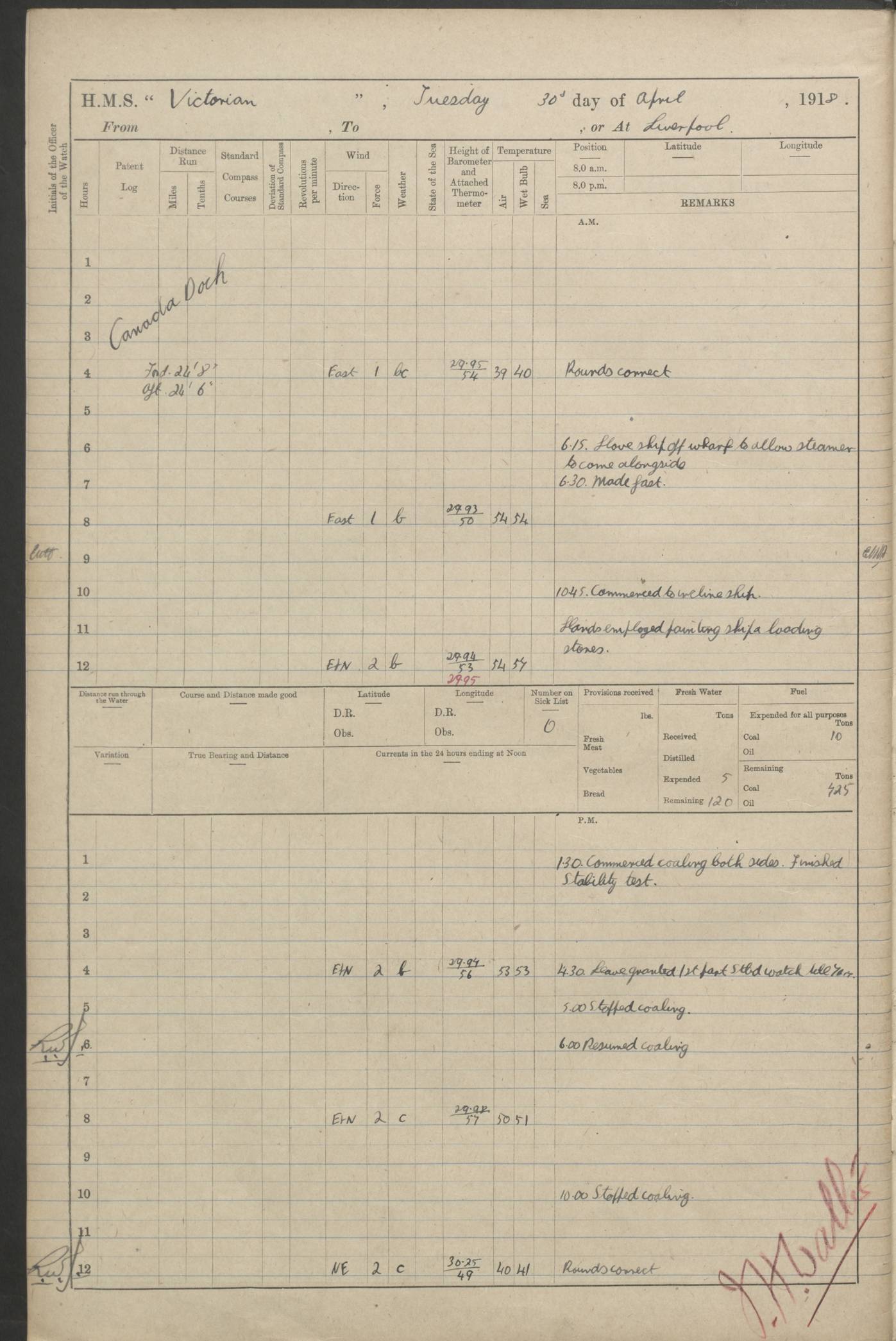 (Maps prepared using Journey Plotter, developed by Maikel. The Plots can only be approximate. They are made by joining-up positions on successive days, and sometimes positions are not given. There will therefore be occasions when the ship appears to have travelled overland) LOGS FOR AUGUST 1914 4caf8c39cadfd341970352c4: (http://oldweather.s3.amazonaws.com/ADM53-67374/ADM53-67374-001_0.jpg) 4caf8c39cadfd341970352c5: (http://oldweather.s3.amazonaws.com/ADM53-67374/ADM53-67374-001_1.jpg) 4caf8c39cadfd341970352c6: (http://oldweather.s3.amazonaws.com/ADM53-67374/ADM53-67374-002_0.jpg) 4caf8c39cadfd341970352c7: (http://oldweather.s3.amazonaws.com/ADM53-67374/ADM53-67374-002_1.jpg) 4caf8c39cadfd341970352c8: (http://oldweather.s3.amazonaws.com/ADM53-67374/ADM53-67374-003_0.jpg) 4caf8c39cadfd341970352c9: (http://oldweather.s3.amazonaws.com/ADM53-67374/ADM53-67374-003_1.jpg) 4caf8c39cadfd341970352ca: (http://oldweather.s3.amazonaws.com/ADM53-67374/ADM53-67374-004_0.jpg) 4caf8c39cadfd341970352cb: (http://oldweather.s3.amazonaws.com/ADM53-67374/ADM53-67374-004_1.jpg) 4caf8c39cadfd341970352cc: (http://oldweather.s3.amazonaws.com/ADM53-67374/ADM53-67374-005_0.jpg) 4caf8c39cadfd341970352cd: (http://oldweather.s3.amazonaws.com/ADM53-67374/ADM53-67374-005_1.jpg) Establishment of ship’s company Officers 44 Seamen 114 Boys ‒ Marines 38 Engine-room establishment 75 Other non-executive ratings 44 Total 315 BAROMETER Mercurial or aneroid: Mercurial Name of maker and number: Dobbie McInnes Height of cistern above sea: 55ft Error of mercurial barometer: .10 too low at 29.28 Thermometers for air temperature Position in ship: Fore bridge Whether in screen: Yes Maker and number: AC Cossor 3942C Date: From August 23 POSITION OF STANDARD COMPASS Top of wheel house on bridge DEVIATION OF STANDARD COMPASS Date obtained: August 23rd 1914 Position: River Mersey ARMAMENT Position: 2 guns forecastle head 2 guns forward house 2 guns after house 2 guns poop Number and nature of guns and mounting: 8 4.7” QF; P111 mountings TORPEDO ARMAMENT None BOATS Number of each carried: 8 Length and description: A lifeboats (wood) 26.2 ft Number of each carried: 4 Length and description: A lifeboats (steel) 26.0 ft MISCELLANEOUS INFORMATION Draught of water with bunkers full, and complete with provisions, stores and water: 26 ft 11 in forward; 29 ft 5 in aft Load draught: 26 ft 11 in forward; 29 ft 5 in aft Number of tons of coal carried (43 cubic feet per ton): 4541 Number of tons of oil fuel carried: None Quantity of water carried: For boilers 230; for drinking 700 THE VOYAGES OF HMS VICTORIAN 1914