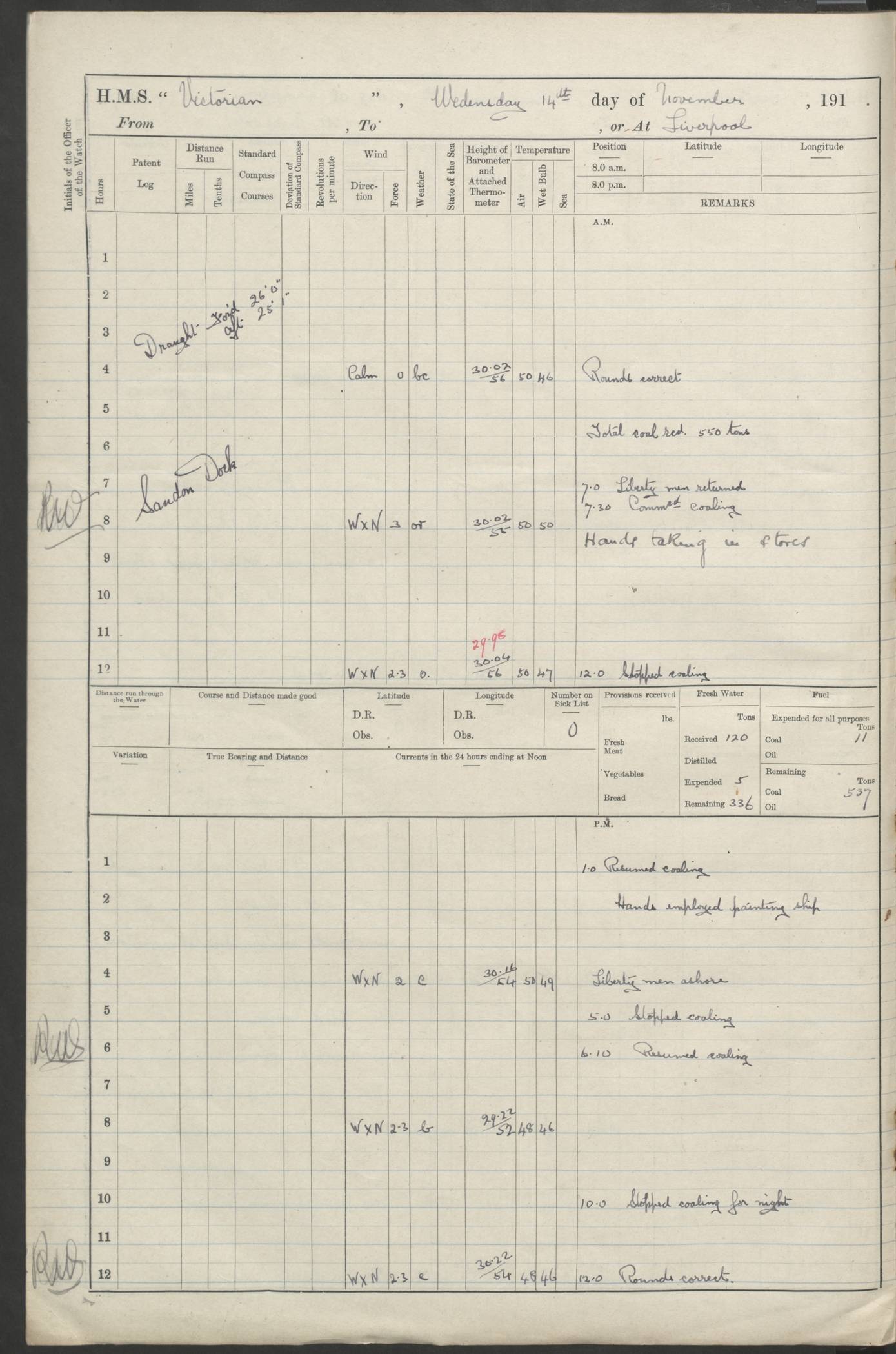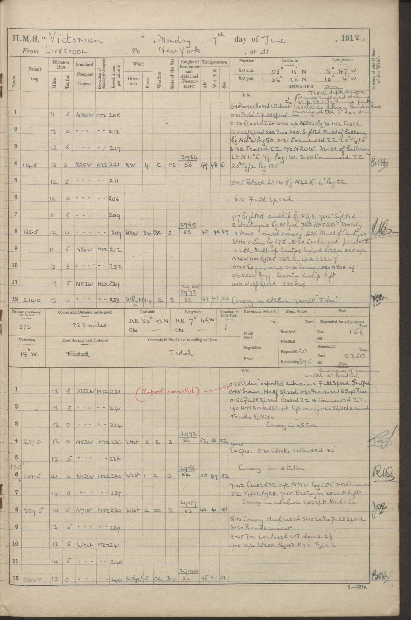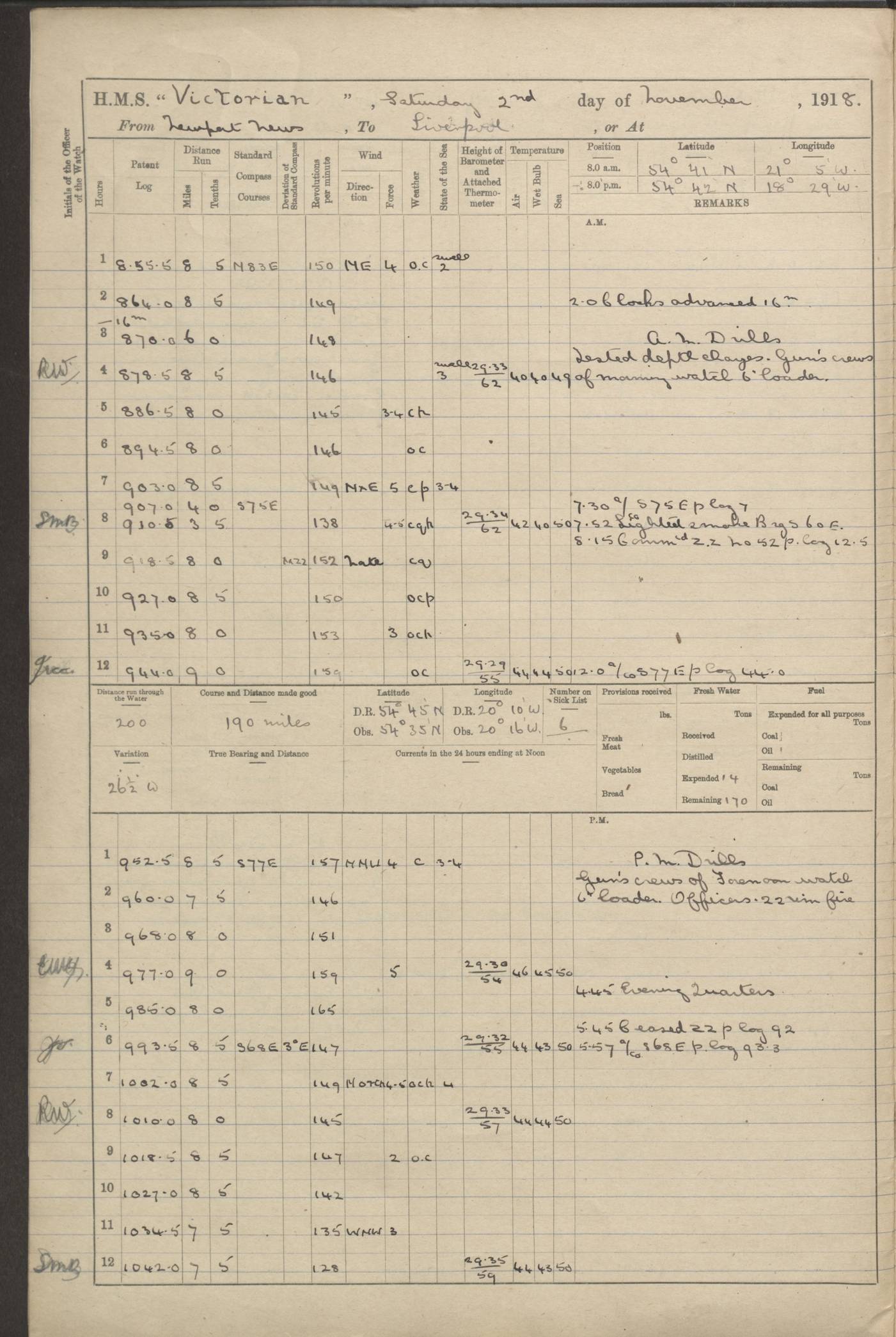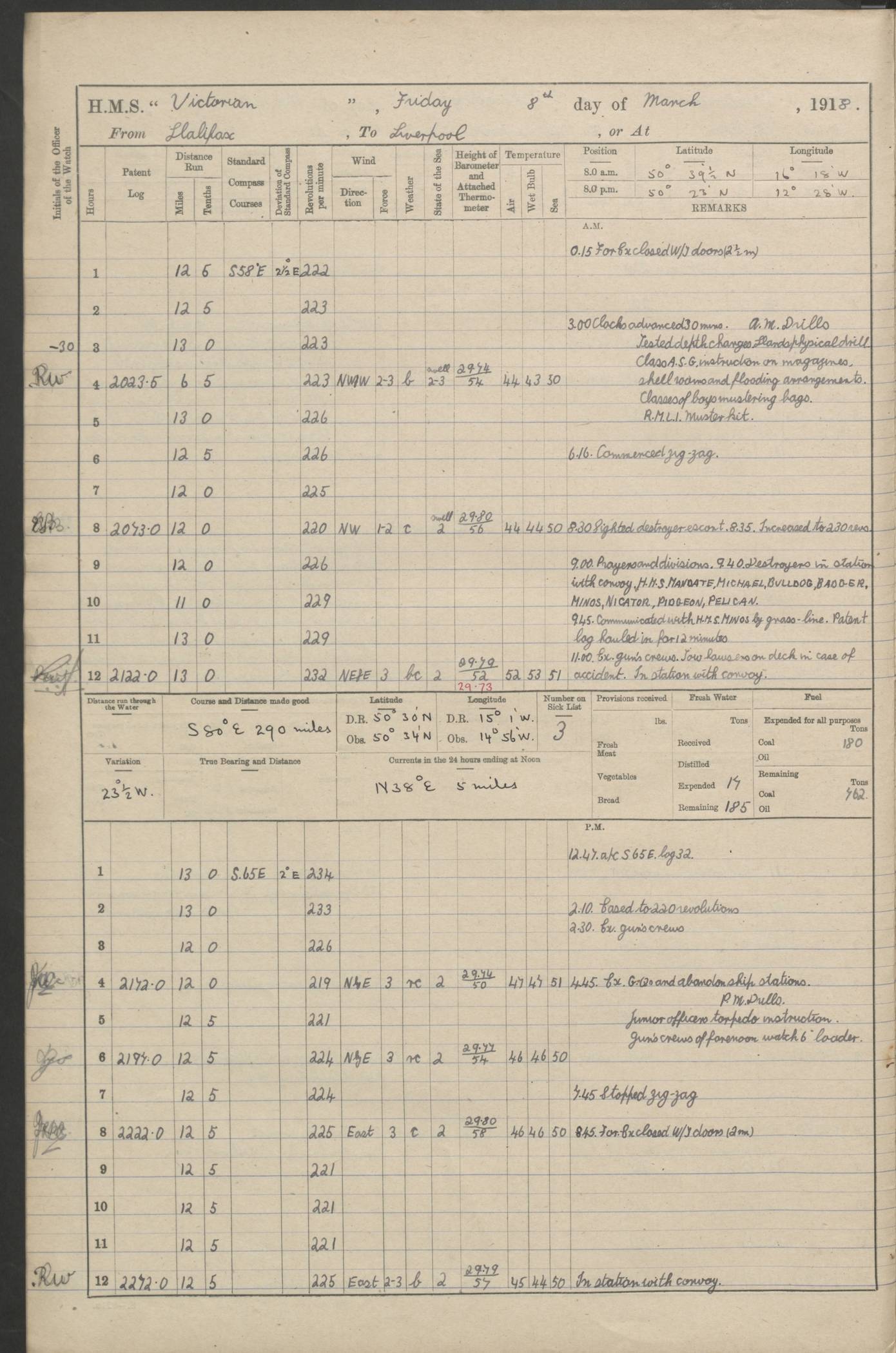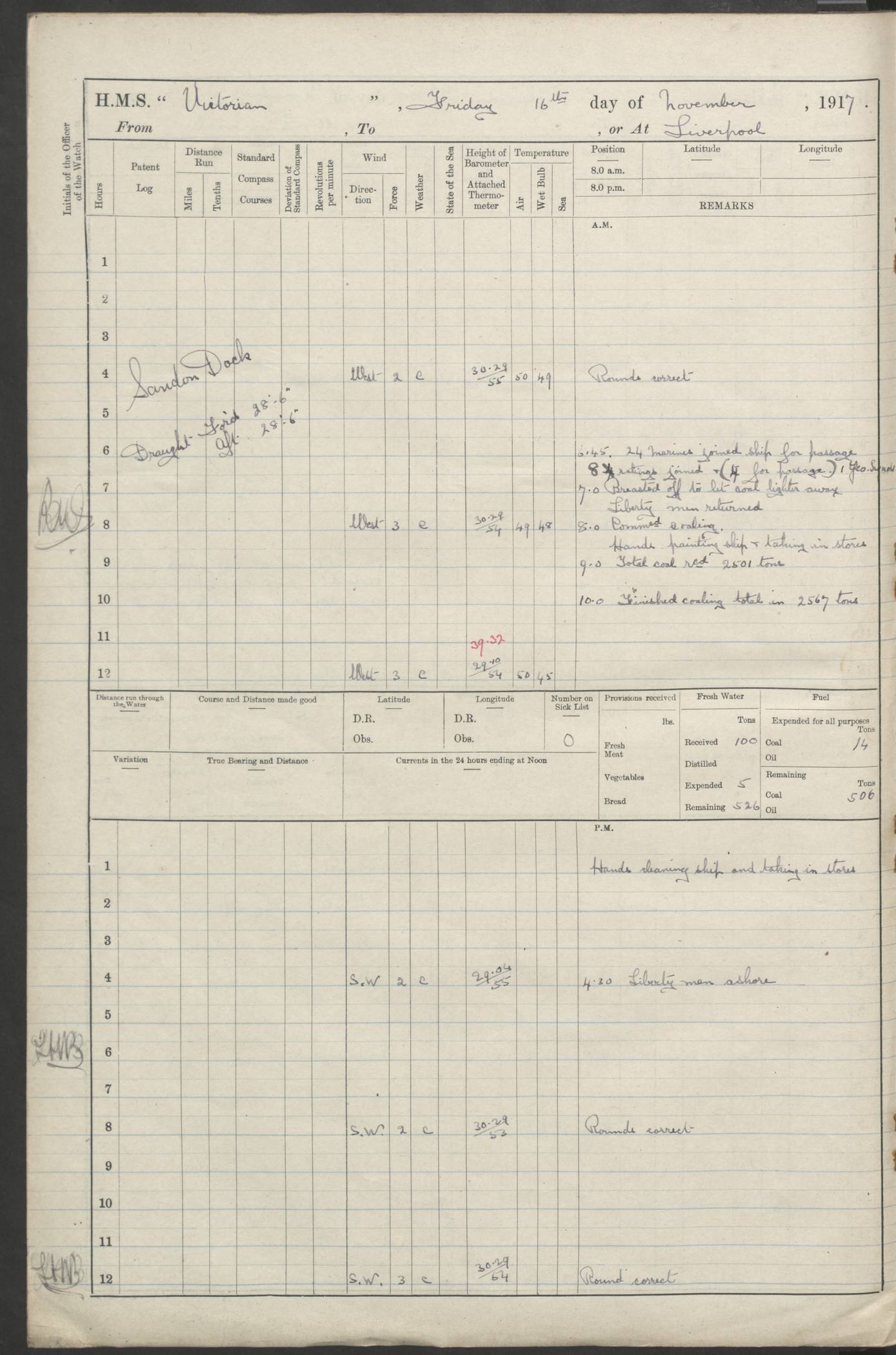 (Maps prepared using Journey Plotter, developed by Maikel. The Plots can only be approximate. They are made by joining-up positions on successive days, and sometimes positions are not given. There will therefore be occasions when the ship appears to have travelled overland) LOGS FOR AUGUST 1914 4caf8c39cadfd341970352c4: (http://oldweather.s3.amazonaws.com/ADM53-67374/ADM53-67374-001_0.jpg) 4caf8c39cadfd341970352c5: (http://oldweather.s3.amazonaws.com/ADM53-67374/ADM53-67374-001_1.jpg) 4caf8c39cadfd341970352c6: (http://oldweather.s3.amazonaws.com/ADM53-67374/ADM53-67374-002_0.jpg) 4caf8c39cadfd341970352c7: (http://oldweather.s3.amazonaws.com/ADM53-67374/ADM53-67374-002_1.jpg) 4caf8c39cadfd341970352c8: (http://oldweather.s3.amazonaws.com/ADM53-67374/ADM53-67374-003_0.jpg) 4caf8c39cadfd341970352c9: (http://oldweather.s3.amazonaws.com/ADM53-67374/ADM53-67374-003_1.jpg) 4caf8c39cadfd341970352ca: (http://oldweather.s3.amazonaws.com/ADM53-67374/ADM53-67374-004_0.jpg) 4caf8c39cadfd341970352cb: (http://oldweather.s3.amazonaws.com/ADM53-67374/ADM53-67374-004_1.jpg) 4caf8c39cadfd341970352cc: (http://oldweather.s3.amazonaws.com/ADM53-67374/ADM53-67374-005_0.jpg) 4caf8c39cadfd341970352cd: (http://oldweather.s3.amazonaws.com/ADM53-67374/ADM53-67374-005_1.jpg) Establishment of ship’s company Officers 44 Seamen 114 Boys ‒ Marines 38 Engine-room establishment 75 Other non-executive ratings 44 Total 315 BAROMETER Mercurial or aneroid: Mercurial Name of maker and number: Dobbie McInnes Height of cistern above sea: 55ft Error of mercurial barometer: .10 too low at 29.28 Thermometers for air temperature Position in ship: Fore bridge Whether in screen: Yes Maker and number: AC Cossor 3942C Date: From August 23 POSITION OF STANDARD COMPASS Top of wheel house on bridge DEVIATION OF STANDARD COMPASS Date obtained: August 23rd 1914 Position: River Mersey ARMAMENT Position: 2 guns forecastle head 2 guns forward house 2 guns after house 2 guns poop Number and nature of guns and mounting: 8 4.7” QF; P111 mountings TORPEDO ARMAMENT None BOATS Number of each carried: 8 Length and description: A lifeboats (wood) 26.2 ft Number of each carried: 4 Length and description: A lifeboats (steel) 26.0 ft MISCELLANEOUS INFORMATION Draught of water with bunkers full, and complete with provisions, stores and water: 26 ft 11 in forward; 29 ft 5 in aft Load draught: 26 ft 11 in forward; 29 ft 5 in aft Number of tons of coal carried (43 cubic feet per ton): 4541 Number of tons of oil fuel carried: None Quantity of water carried: For boilers 230; for drinking 700 THE VOYAGES OF HMS VICTORIAN 1914