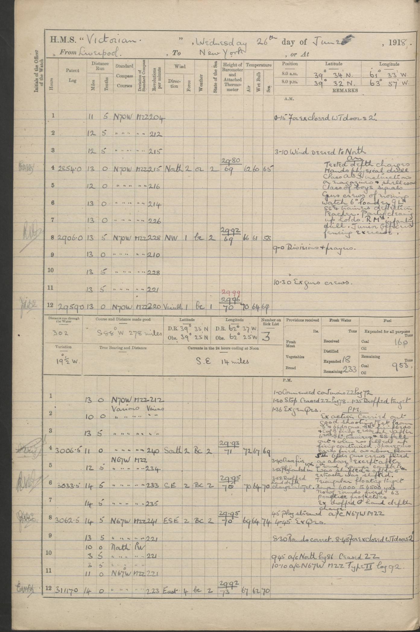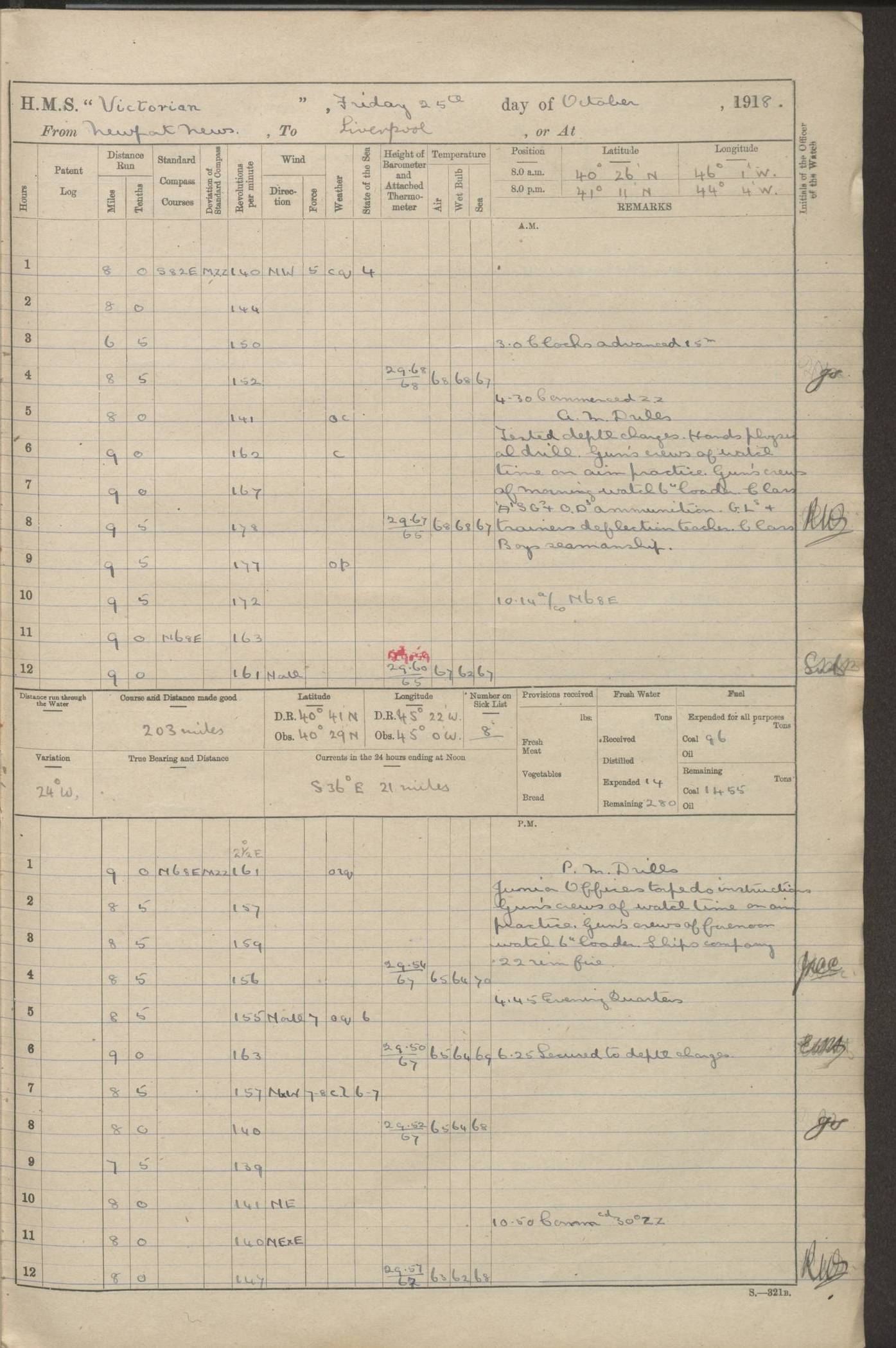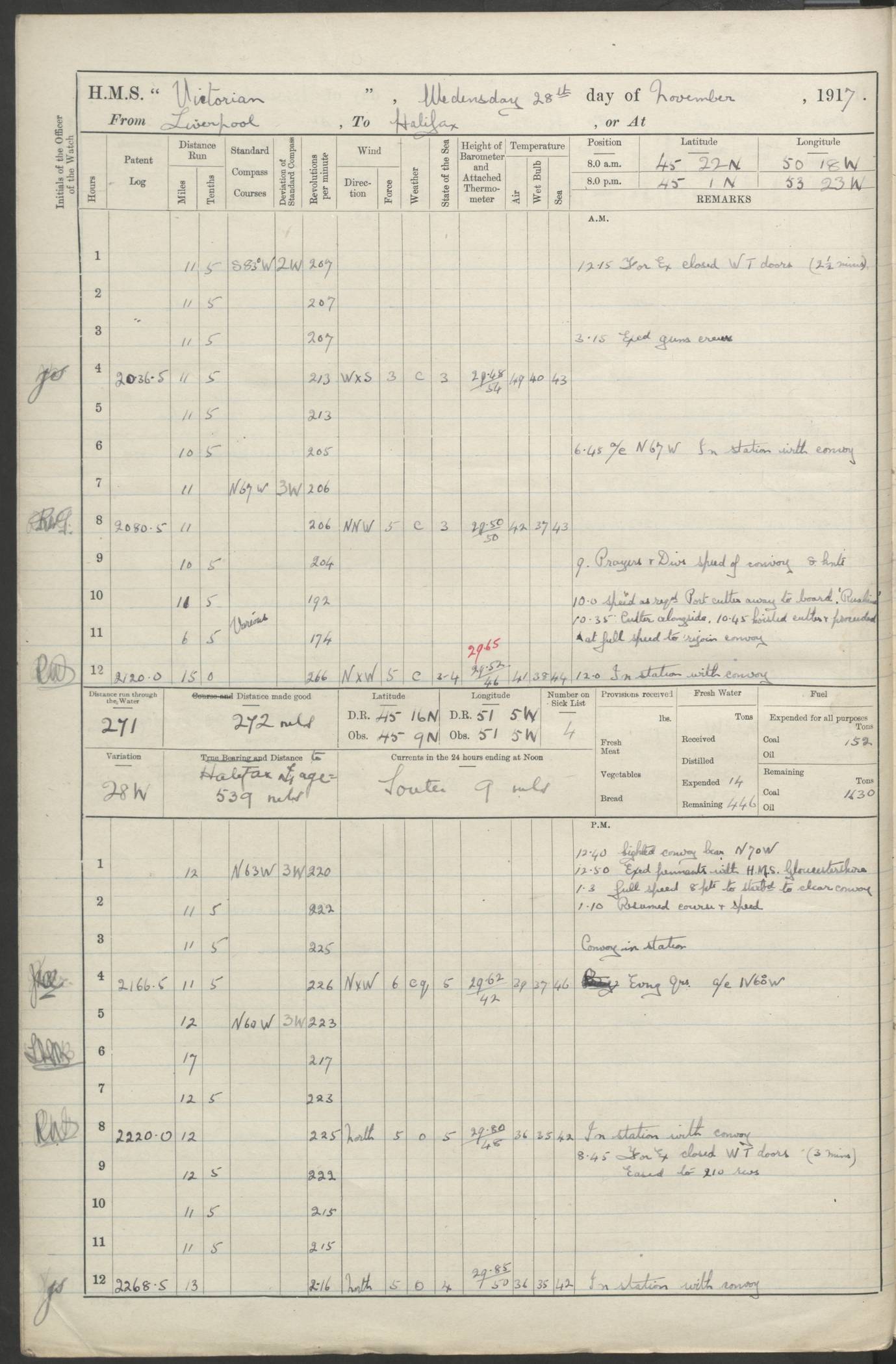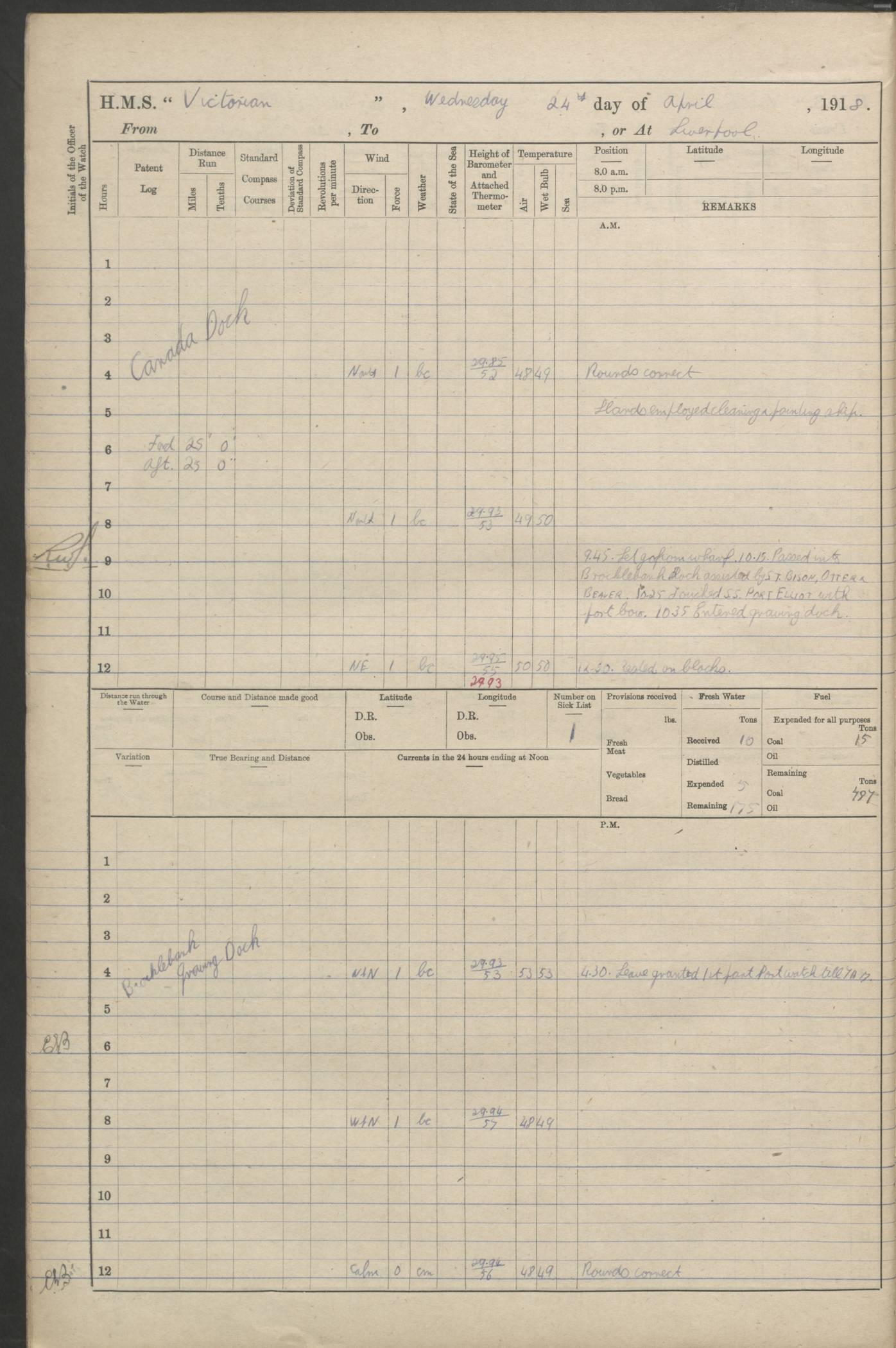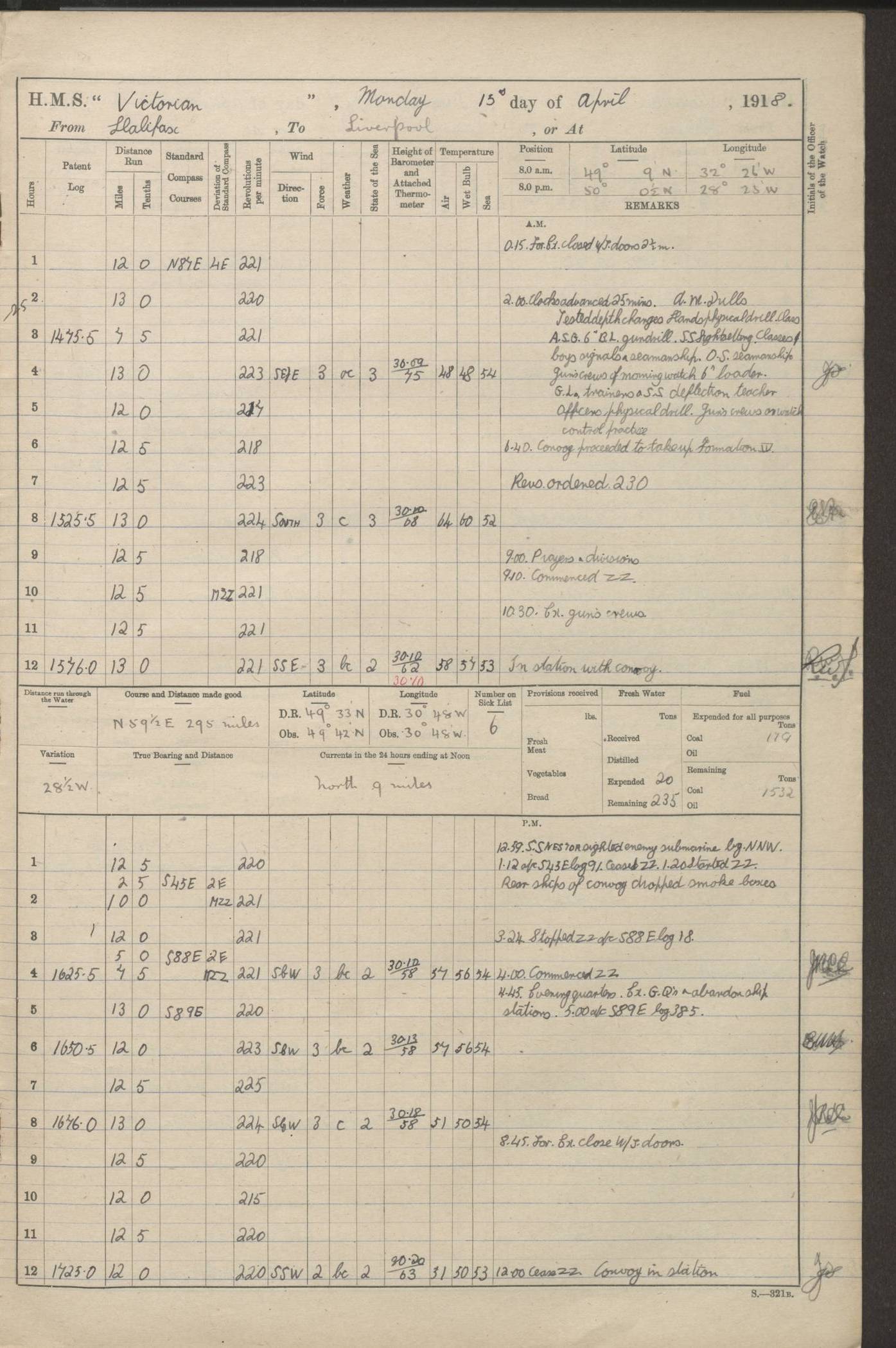 (Maps prepared using Journey Plotter, developed by Maikel. The Plots can only be approximate. They are made by joining-up positions on successive days, and sometimes positions are not given. There will therefore be occasions when the ship appears to have travelled overland) LOGS FOR AUGUST 1914 4caf8c39cadfd341970352c4: (http://oldweather.s3.amazonaws.com/ADM53-67374/ADM53-67374-001_0.jpg) 4caf8c39cadfd341970352c5: (http://oldweather.s3.amazonaws.com/ADM53-67374/ADM53-67374-001_1.jpg) 4caf8c39cadfd341970352c6: (http://oldweather.s3.amazonaws.com/ADM53-67374/ADM53-67374-002_0.jpg) 4caf8c39cadfd341970352c7: (http://oldweather.s3.amazonaws.com/ADM53-67374/ADM53-67374-002_1.jpg) 4caf8c39cadfd341970352c8: (http://oldweather.s3.amazonaws.com/ADM53-67374/ADM53-67374-003_0.jpg) 4caf8c39cadfd341970352c9: (http://oldweather.s3.amazonaws.com/ADM53-67374/ADM53-67374-003_1.jpg) 4caf8c39cadfd341970352ca: (http://oldweather.s3.amazonaws.com/ADM53-67374/ADM53-67374-004_0.jpg) 4caf8c39cadfd341970352cb: (http://oldweather.s3.amazonaws.com/ADM53-67374/ADM53-67374-004_1.jpg) 4caf8c39cadfd341970352cc: (http://oldweather.s3.amazonaws.com/ADM53-67374/ADM53-67374-005_0.jpg) 4caf8c39cadfd341970352cd: (http://oldweather.s3.amazonaws.com/ADM53-67374/ADM53-67374-005_1.jpg) Establishment of ship’s company Officers 44 Seamen 114 Boys ‒ Marines 38 Engine-room establishment 75 Other non-executive ratings 44 Total 315 BAROMETER Mercurial or aneroid: Mercurial Name of maker and number: Dobbie McInnes Height of cistern above sea: 55ft Error of mercurial barometer: .10 too low at 29.28 Thermometers for air temperature Position in ship: Fore bridge Whether in screen: Yes Maker and number: AC Cossor 3942C Date: From August 23 POSITION OF STANDARD COMPASS Top of wheel house on bridge DEVIATION OF STANDARD COMPASS Date obtained: August 23rd 1914 Position: River Mersey ARMAMENT Position: 2 guns forecastle head 2 guns forward house 2 guns after house 2 guns poop Number and nature of guns and mounting: 8 4.7” QF; P111 mountings TORPEDO ARMAMENT None BOATS Number of each carried: 8 Length and description: A lifeboats (wood) 26.2 ft Number of each carried: 4 Length and description: A lifeboats (steel) 26.0 ft MISCELLANEOUS INFORMATION Draught of water with bunkers full, and complete with provisions, stores and water: 26 ft 11 in forward; 29 ft 5 in aft Load draught: 26 ft 11 in forward; 29 ft 5 in aft Number of tons of coal carried (43 cubic feet per ton): 4541 Number of tons of oil fuel carried: None Quantity of water carried: For boilers 230; for drinking 700 THE VOYAGES OF HMS VICTORIAN 1914
