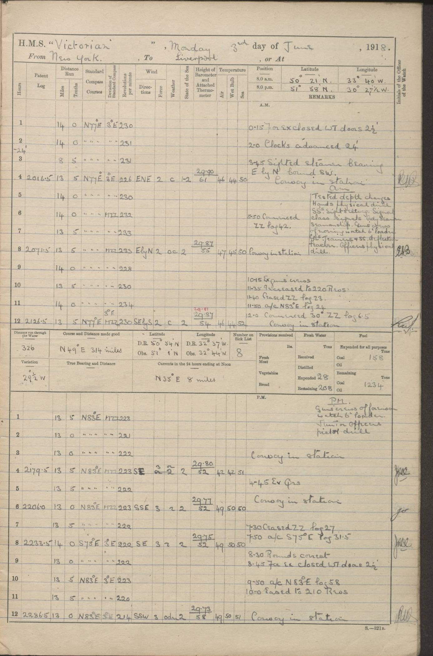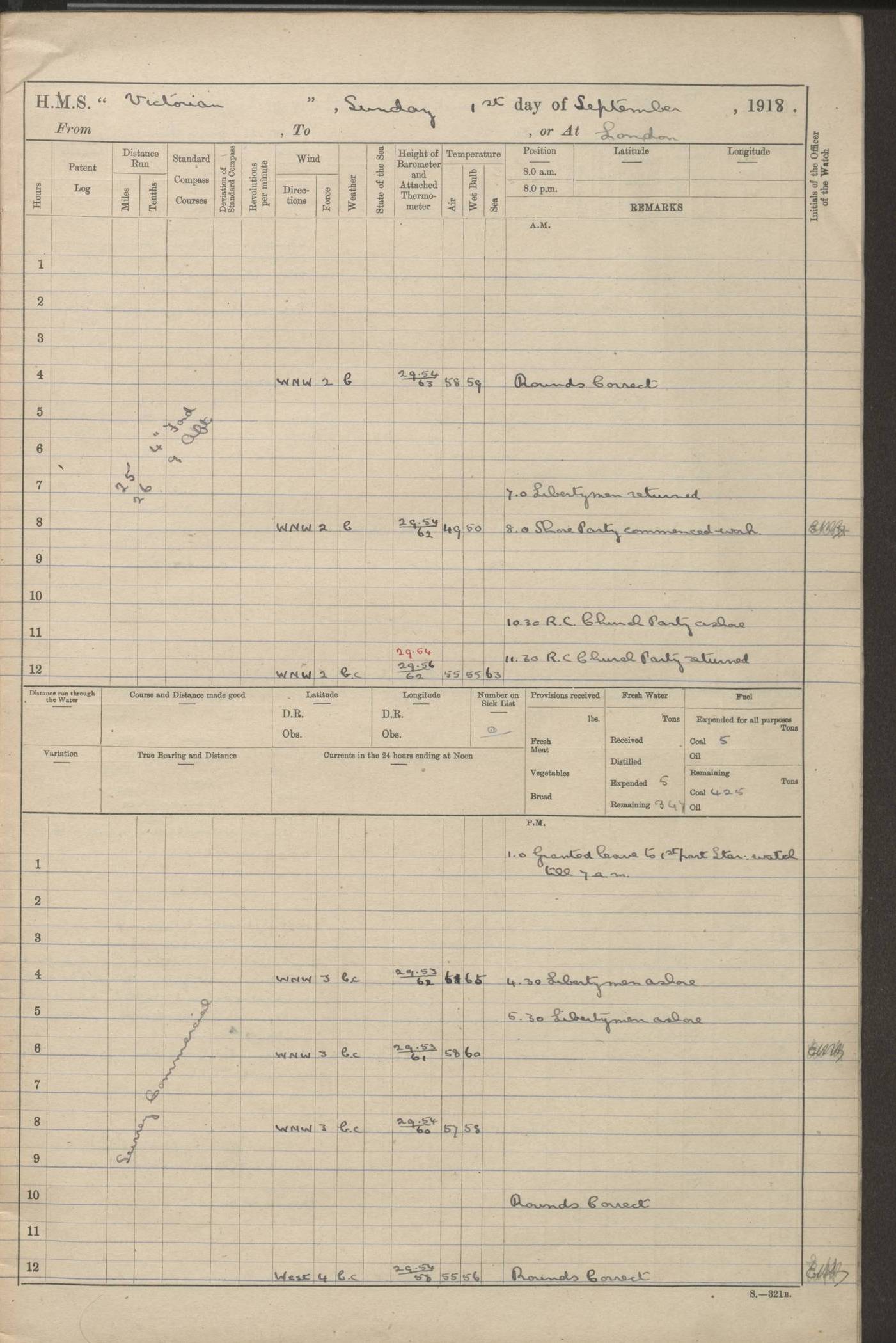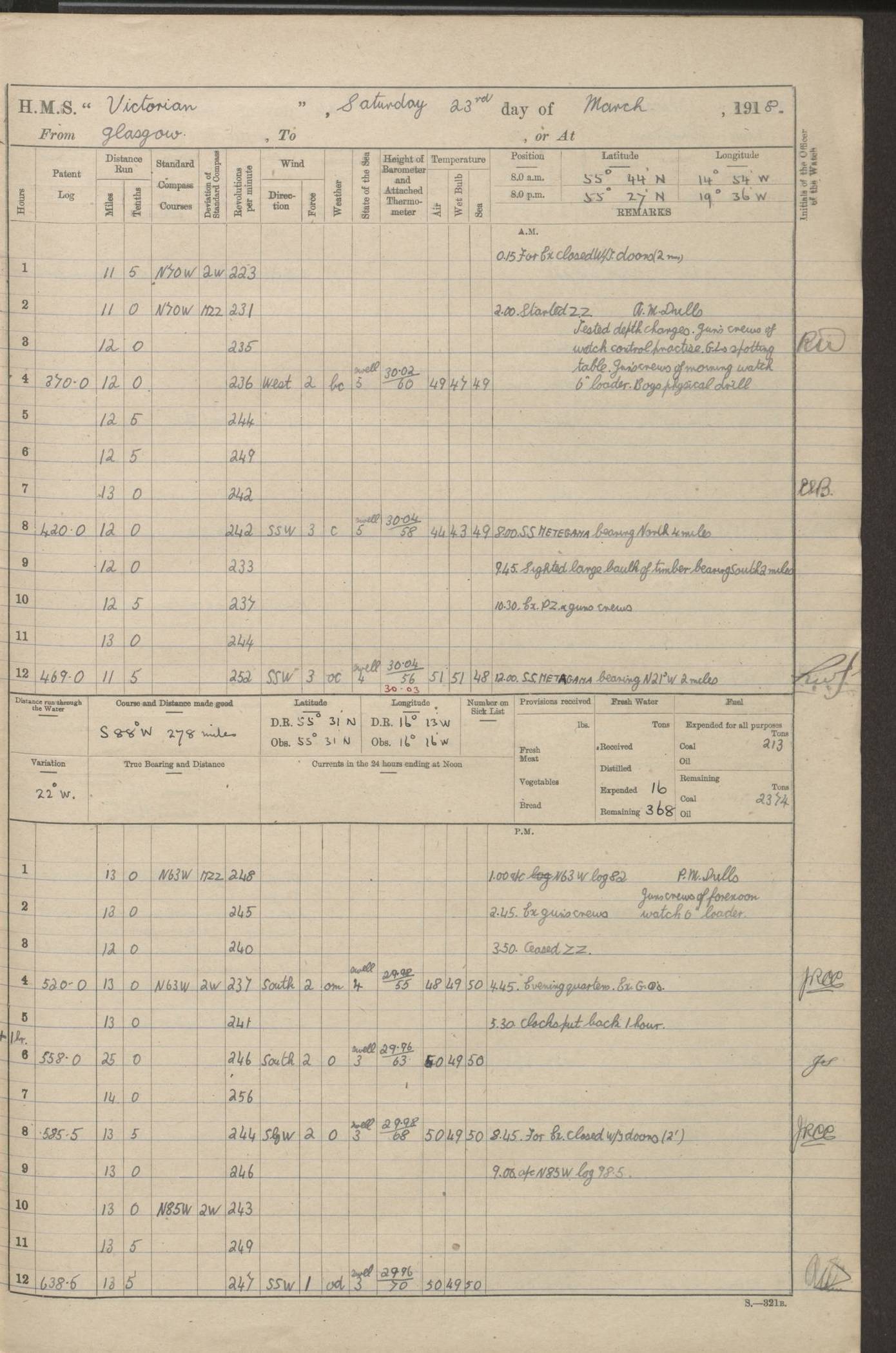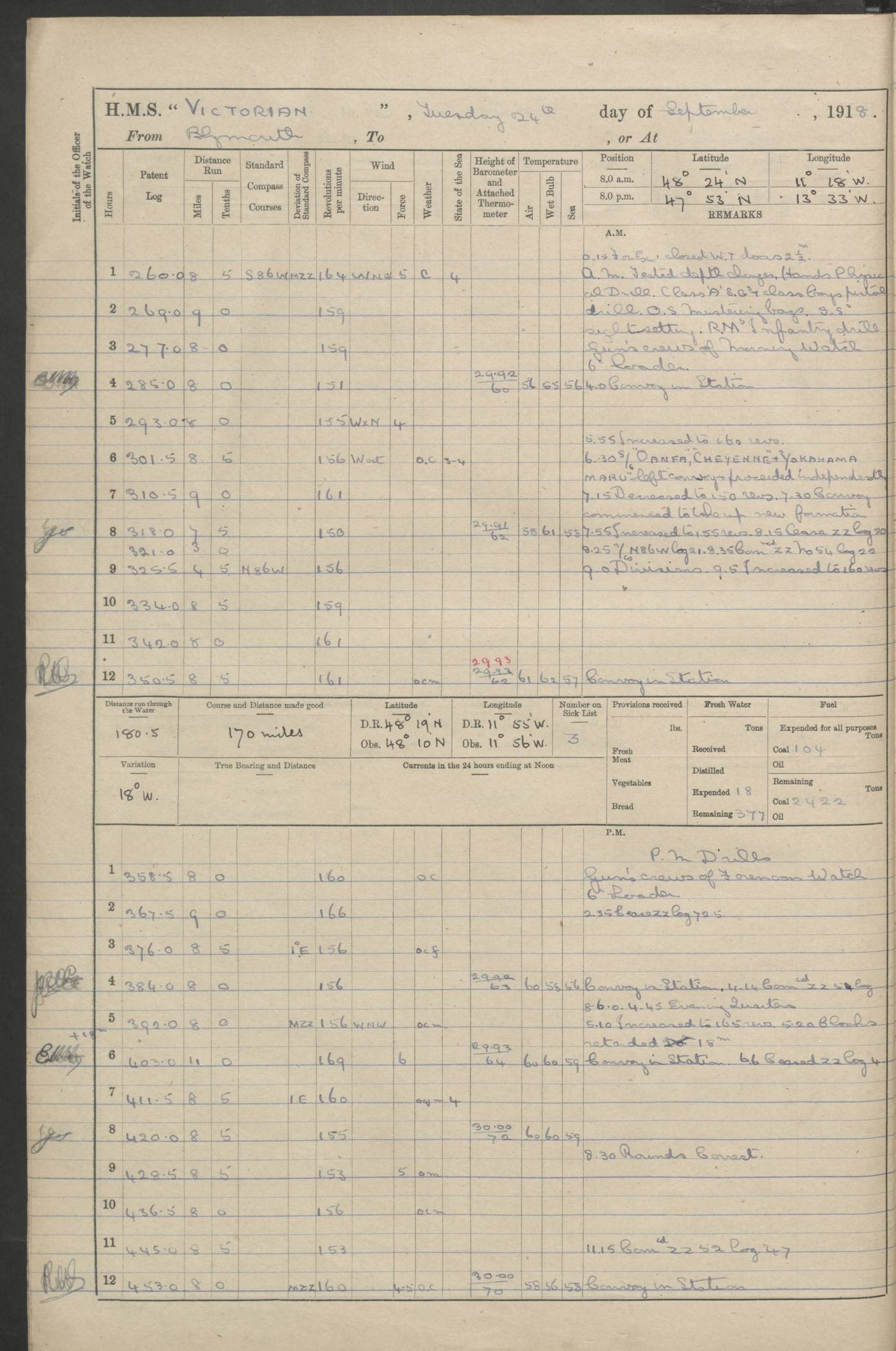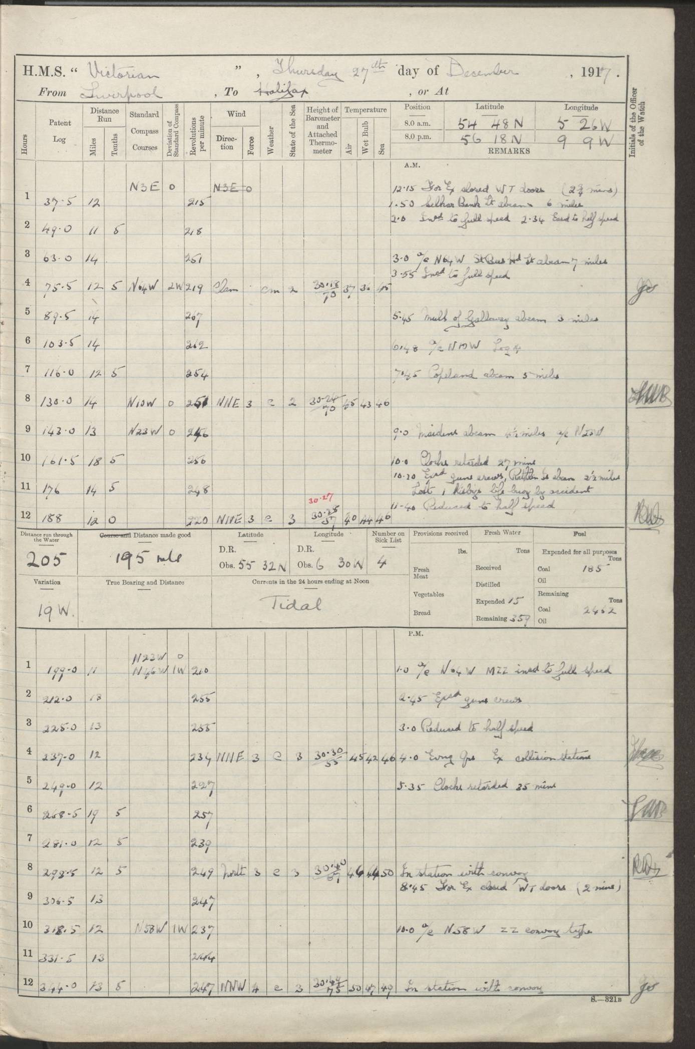 (Maps prepared using Journey Plotter, developed by Maikel. The Plots can only be approximate. They are made by joining-up positions on successive days, and sometimes positions are not given. There will therefore be occasions when the ship appears to have travelled overland) LOGS FOR AUGUST 1914 4caf8c39cadfd341970352c4: (http://oldweather.s3.amazonaws.com/ADM53-67374/ADM53-67374-001_0.jpg) 4caf8c39cadfd341970352c5: (http://oldweather.s3.amazonaws.com/ADM53-67374/ADM53-67374-001_1.jpg) 4caf8c39cadfd341970352c6: (http://oldweather.s3.amazonaws.com/ADM53-67374/ADM53-67374-002_0.jpg) 4caf8c39cadfd341970352c7: (http://oldweather.s3.amazonaws.com/ADM53-67374/ADM53-67374-002_1.jpg) 4caf8c39cadfd341970352c8: (http://oldweather.s3.amazonaws.com/ADM53-67374/ADM53-67374-003_0.jpg) 4caf8c39cadfd341970352c9: (http://oldweather.s3.amazonaws.com/ADM53-67374/ADM53-67374-003_1.jpg) 4caf8c39cadfd341970352ca: (http://oldweather.s3.amazonaws.com/ADM53-67374/ADM53-67374-004_0.jpg) 4caf8c39cadfd341970352cb: (http://oldweather.s3.amazonaws.com/ADM53-67374/ADM53-67374-004_1.jpg) 4caf8c39cadfd341970352cc: (http://oldweather.s3.amazonaws.com/ADM53-67374/ADM53-67374-005_0.jpg) 4caf8c39cadfd341970352cd: (http://oldweather.s3.amazonaws.com/ADM53-67374/ADM53-67374-005_1.jpg) Establishment of ship’s company Officers 44 Seamen 114 Boys ‒ Marines 38 Engine-room establishment 75 Other non-executive ratings 44 Total 315 BAROMETER Mercurial or aneroid: Mercurial Name of maker and number: Dobbie McInnes Height of cistern above sea: 55ft Error of mercurial barometer: .10 too low at 29.28 Thermometers for air temperature Position in ship: Fore bridge Whether in screen: Yes Maker and number: AC Cossor 3942C Date: From August 23 POSITION OF STANDARD COMPASS Top of wheel house on bridge DEVIATION OF STANDARD COMPASS Date obtained: August 23rd 1914 Position: River Mersey ARMAMENT Position: 2 guns forecastle head 2 guns forward house 2 guns after house 2 guns poop Number and nature of guns and mounting: 8 4.7” QF; P111 mountings TORPEDO ARMAMENT None BOATS Number of each carried: 8 Length and description: A lifeboats (wood) 26.2 ft Number of each carried: 4 Length and description: A lifeboats (steel) 26.0 ft MISCELLANEOUS INFORMATION Draught of water with bunkers full, and complete with provisions, stores and water: 26 ft 11 in forward; 29 ft 5 in aft Load draught: 26 ft 11 in forward; 29 ft 5 in aft Number of tons of coal carried (43 cubic feet per ton): 4541 Number of tons of oil fuel carried: None Quantity of water carried: For boilers 230; for drinking 700 THE VOYAGES OF HMS VICTORIAN 1914