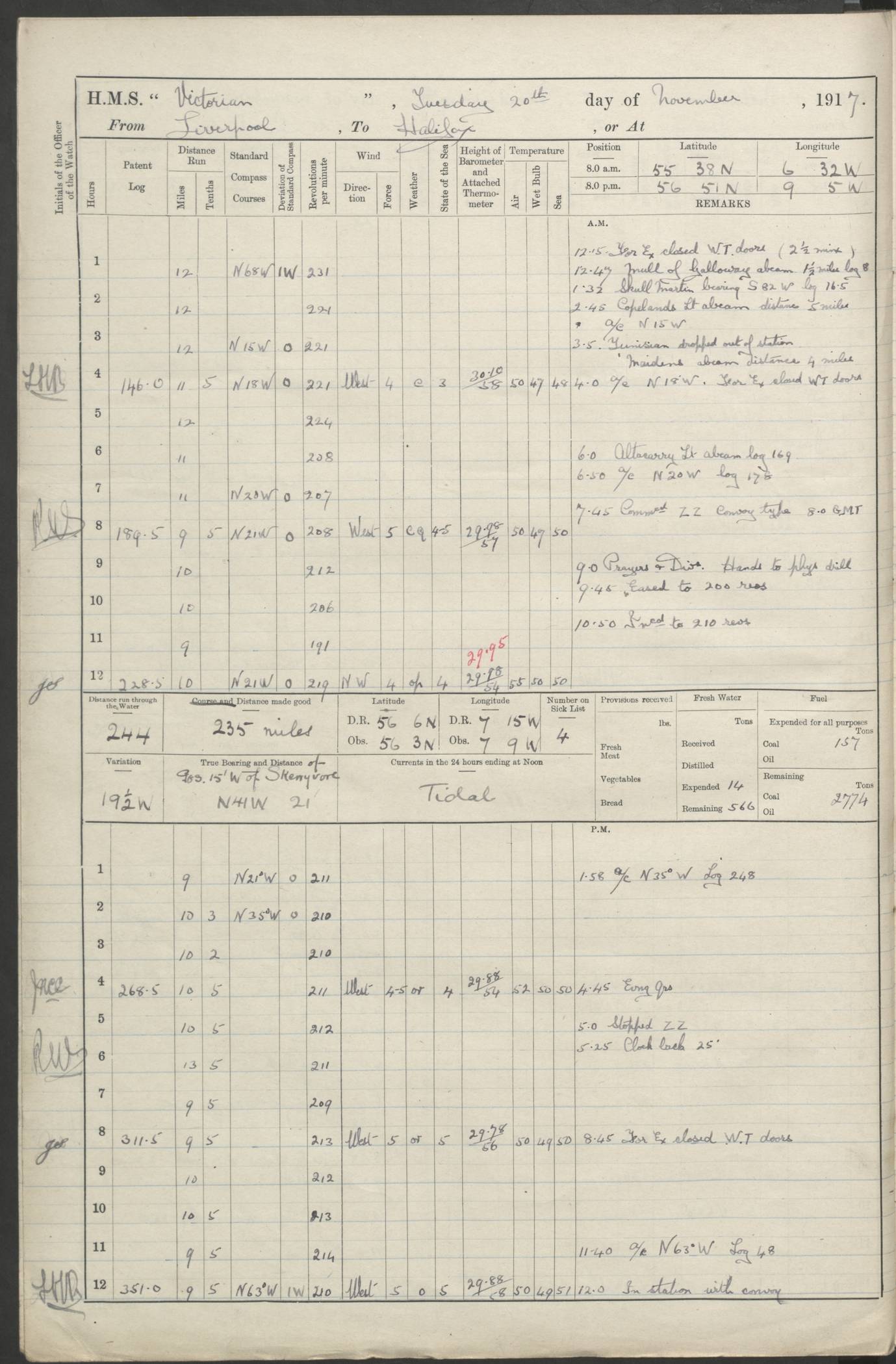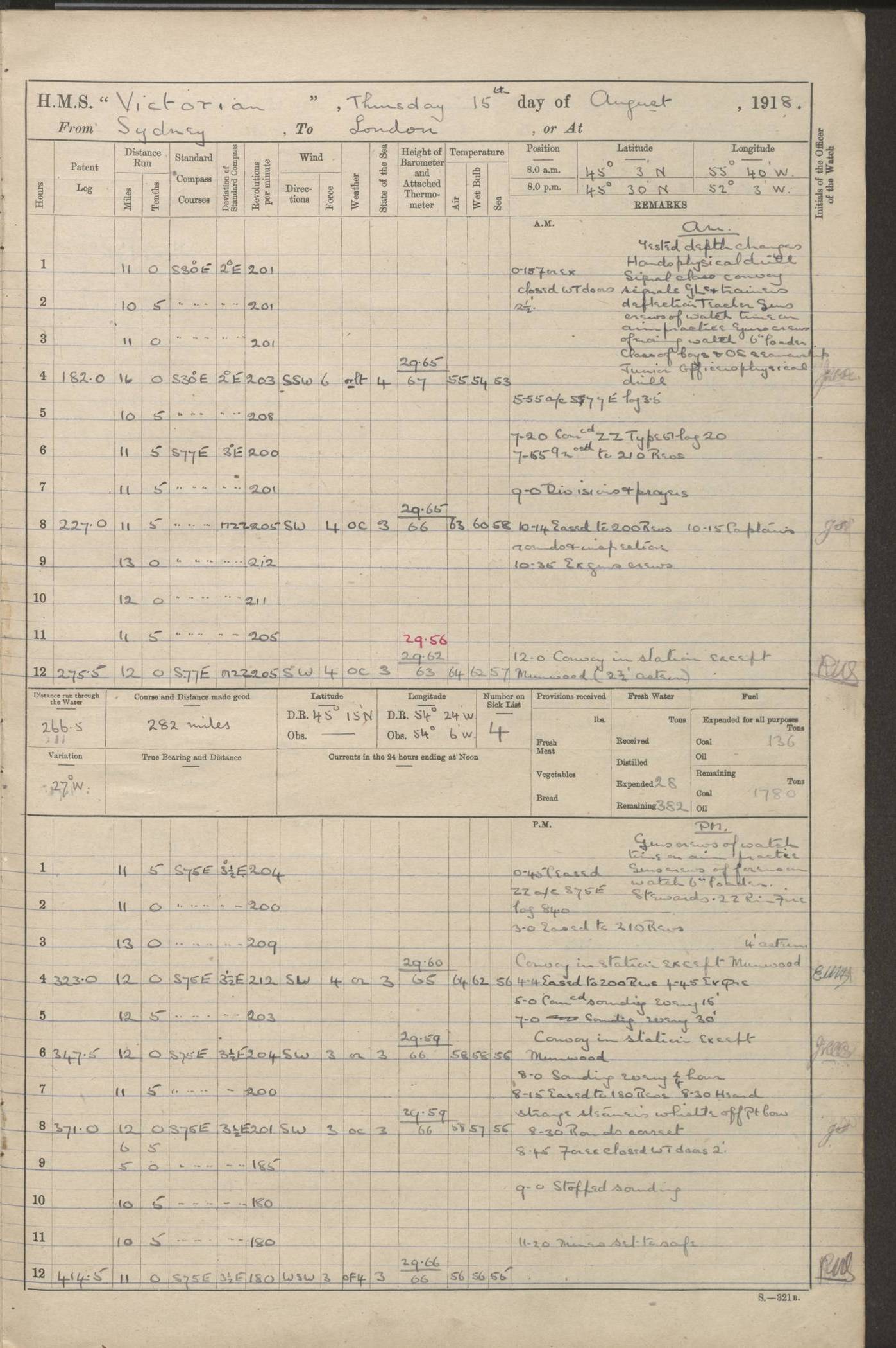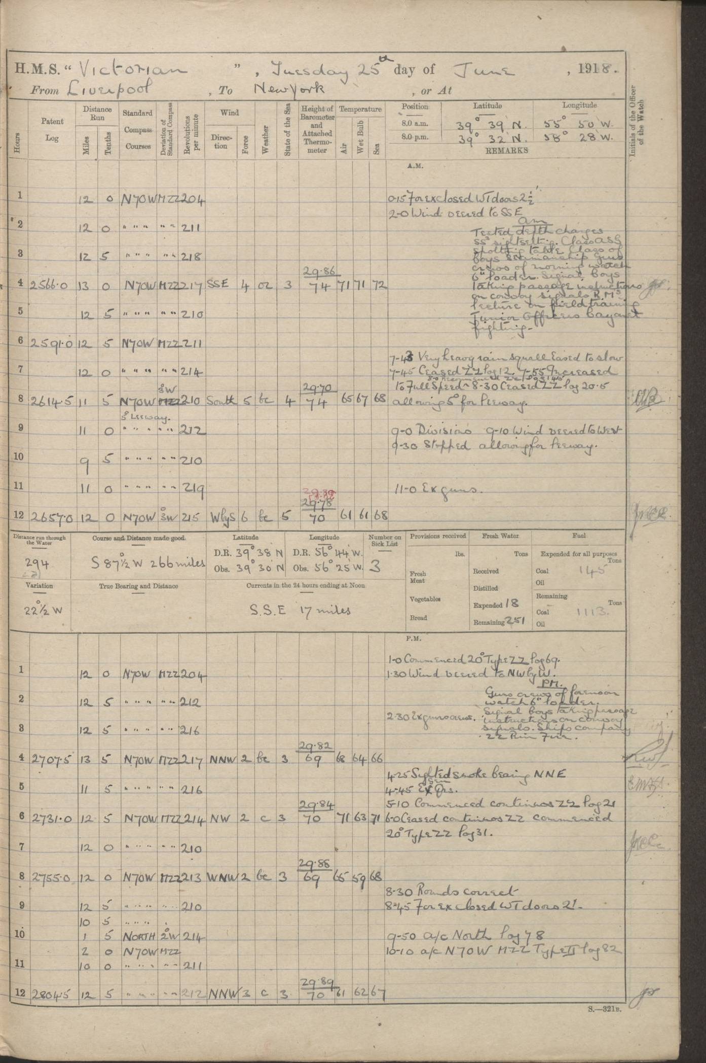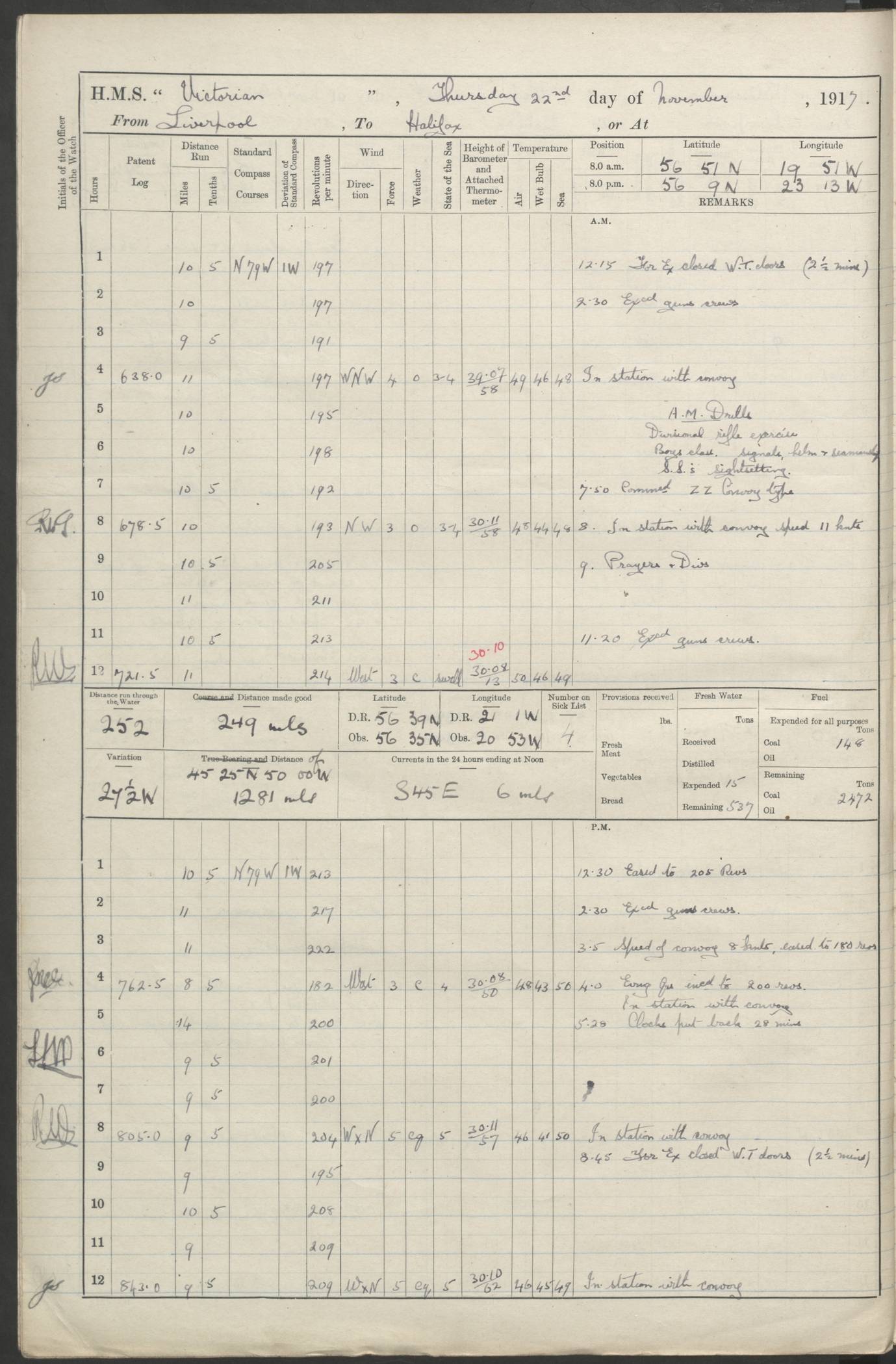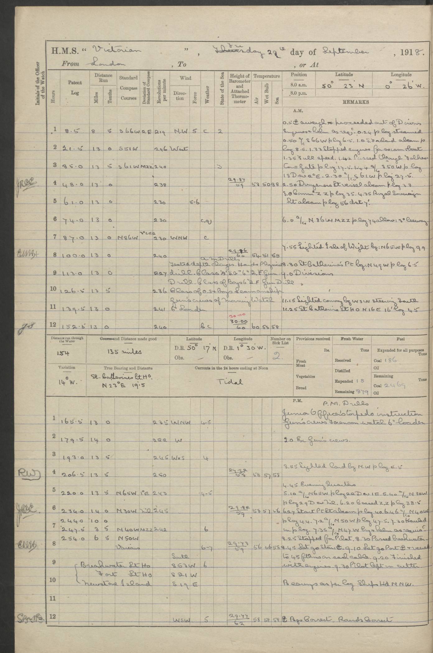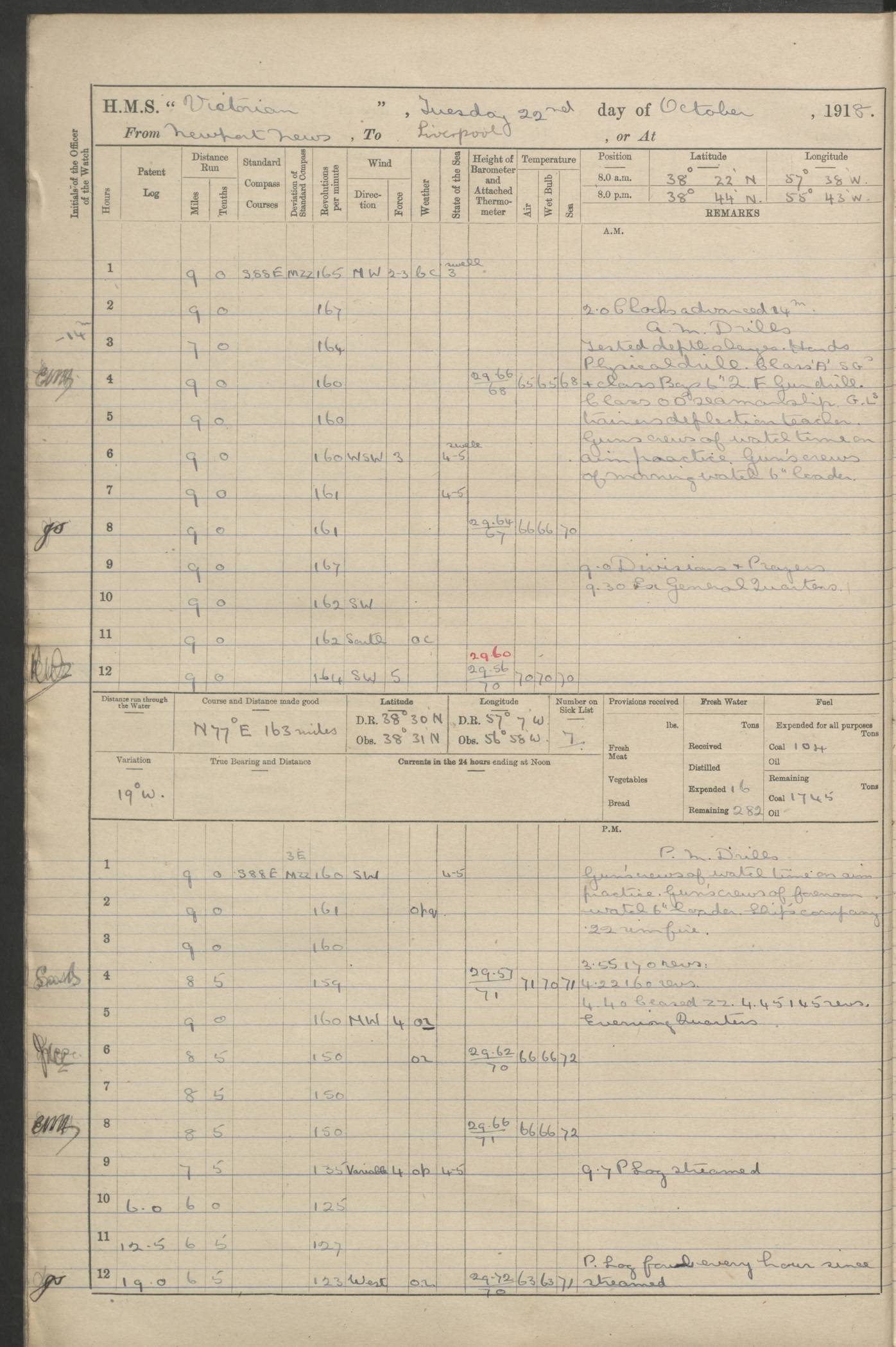 (Maps prepared using Journey Plotter, developed by Maikel. The Plots can only be approximate. They are made by joining-up positions on successive days, and sometimes positions are not given. There will therefore be occasions when the ship appears to have travelled overland) LOGS FOR AUGUST 1914 4caf8c39cadfd341970352c4: (http://oldweather.s3.amazonaws.com/ADM53-67374/ADM53-67374-001_0.jpg) 4caf8c39cadfd341970352c5: (http://oldweather.s3.amazonaws.com/ADM53-67374/ADM53-67374-001_1.jpg) 4caf8c39cadfd341970352c6: (http://oldweather.s3.amazonaws.com/ADM53-67374/ADM53-67374-002_0.jpg) 4caf8c39cadfd341970352c7: (http://oldweather.s3.amazonaws.com/ADM53-67374/ADM53-67374-002_1.jpg) 4caf8c39cadfd341970352c8: (http://oldweather.s3.amazonaws.com/ADM53-67374/ADM53-67374-003_0.jpg) 4caf8c39cadfd341970352c9: (http://oldweather.s3.amazonaws.com/ADM53-67374/ADM53-67374-003_1.jpg) 4caf8c39cadfd341970352ca: (http://oldweather.s3.amazonaws.com/ADM53-67374/ADM53-67374-004_0.jpg) 4caf8c39cadfd341970352cb: (http://oldweather.s3.amazonaws.com/ADM53-67374/ADM53-67374-004_1.jpg) 4caf8c39cadfd341970352cc: (http://oldweather.s3.amazonaws.com/ADM53-67374/ADM53-67374-005_0.jpg) 4caf8c39cadfd341970352cd: (http://oldweather.s3.amazonaws.com/ADM53-67374/ADM53-67374-005_1.jpg) Establishment of ship’s company Officers 44 Seamen 114 Boys ‒ Marines 38 Engine-room establishment 75 Other non-executive ratings 44 Total 315 BAROMETER Mercurial or aneroid: Mercurial Name of maker and number: Dobbie McInnes Height of cistern above sea: 55ft Error of mercurial barometer: .10 too low at 29.28 Thermometers for air temperature Position in ship: Fore bridge Whether in screen: Yes Maker and number: AC Cossor 3942C Date: From August 23 POSITION OF STANDARD COMPASS Top of wheel house on bridge DEVIATION OF STANDARD COMPASS Date obtained: August 23rd 1914 Position: River Mersey ARMAMENT Position: 2 guns forecastle head 2 guns forward house 2 guns after house 2 guns poop Number and nature of guns and mounting: 8 4.7” QF; P111 mountings TORPEDO ARMAMENT None BOATS Number of each carried: 8 Length and description: A lifeboats (wood) 26.2 ft Number of each carried: 4 Length and description: A lifeboats (steel) 26.0 ft MISCELLANEOUS INFORMATION Draught of water with bunkers full, and complete with provisions, stores and water: 26 ft 11 in forward; 29 ft 5 in aft Load draught: 26 ft 11 in forward; 29 ft 5 in aft Number of tons of coal carried (43 cubic feet per ton): 4541 Number of tons of oil fuel carried: None Quantity of water carried: For boilers 230; for drinking 700 THE VOYAGES OF HMS VICTORIAN 1914