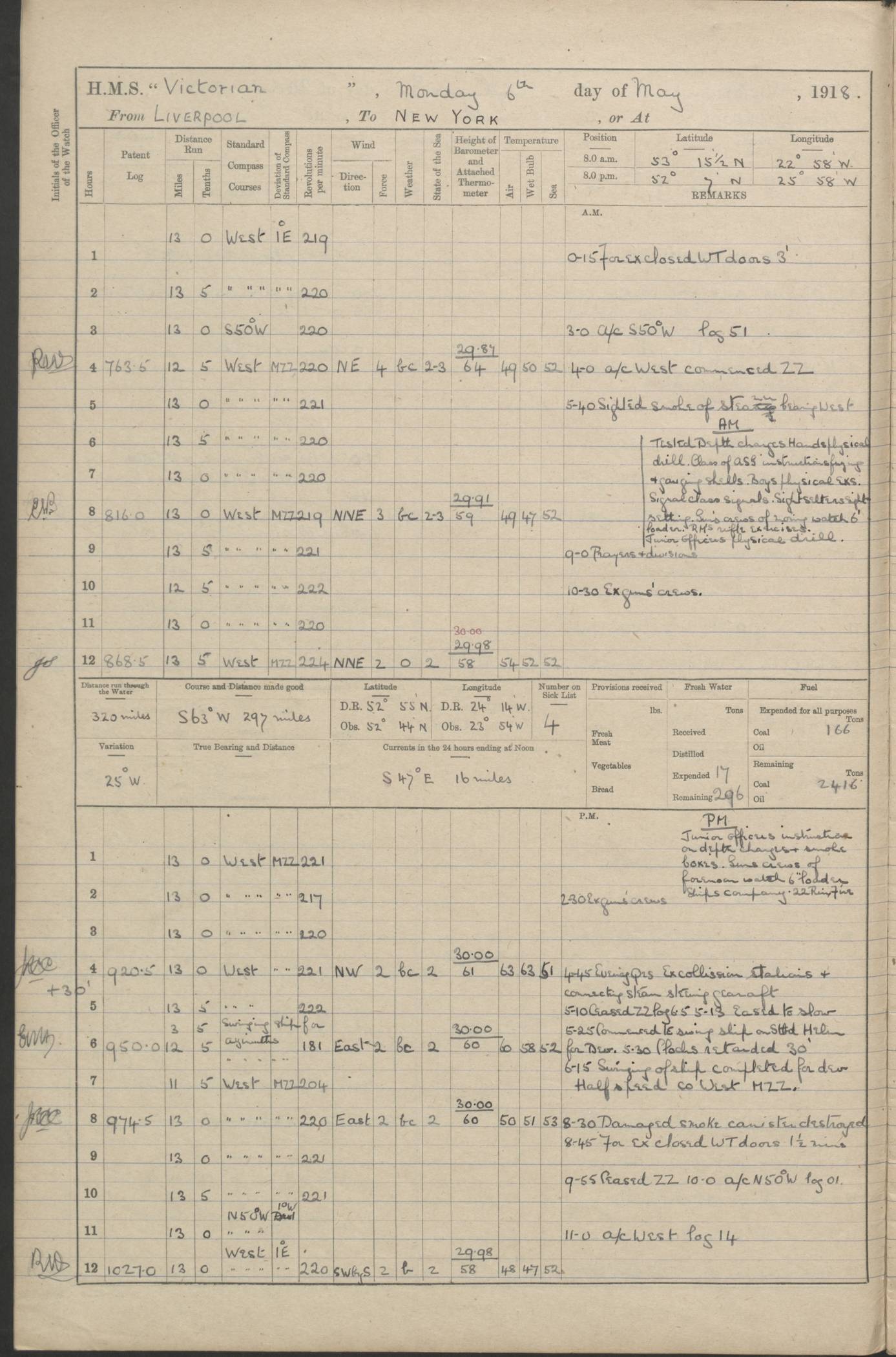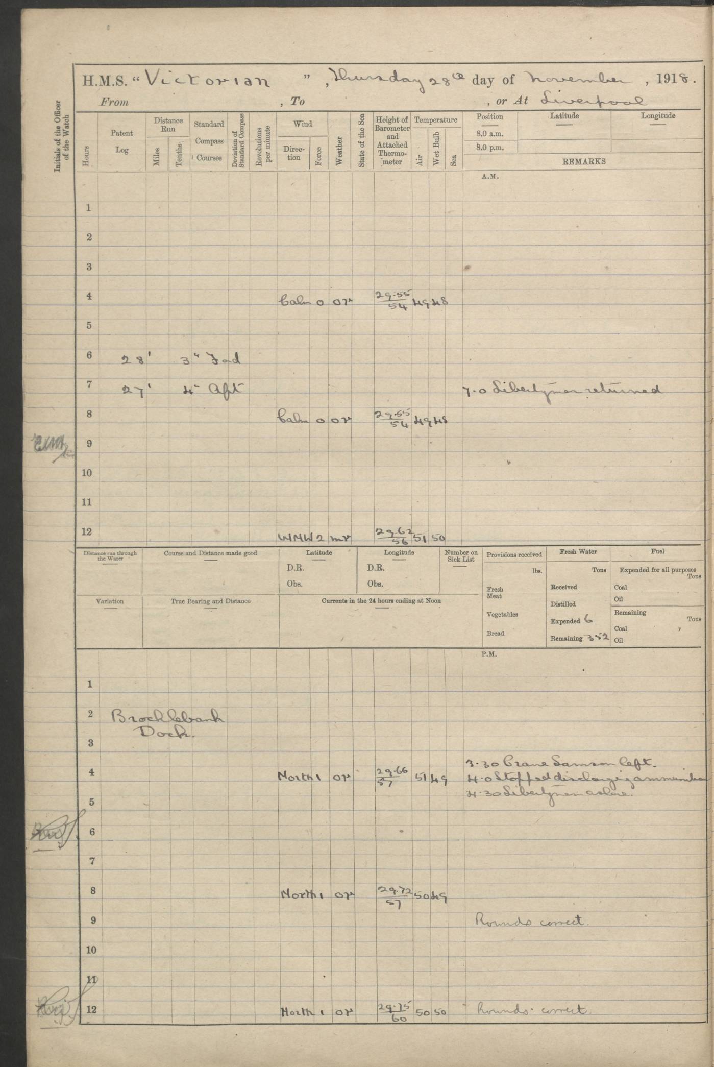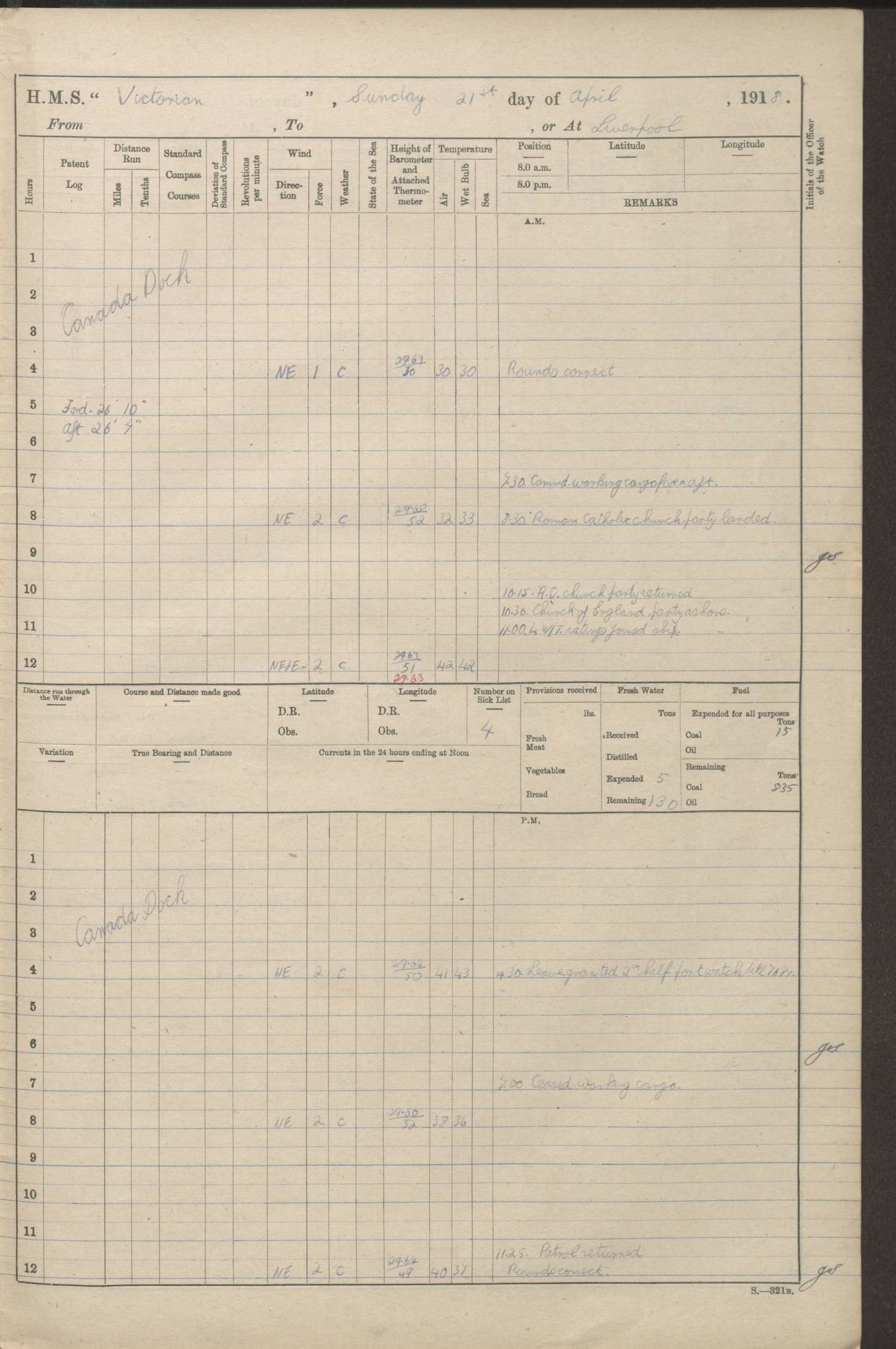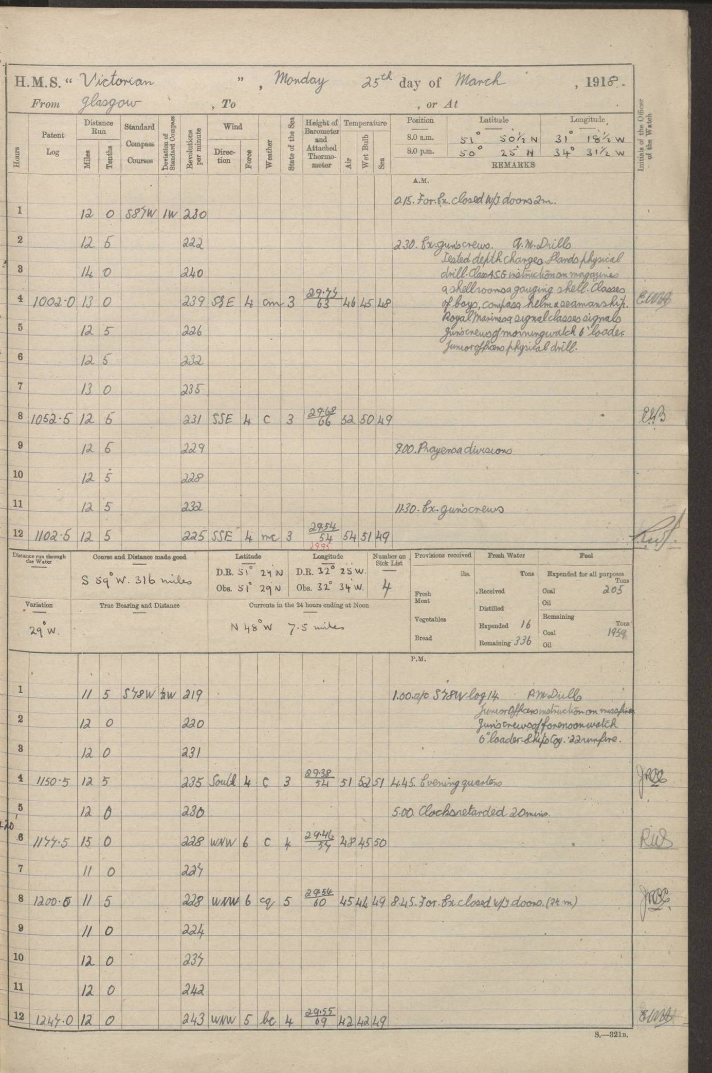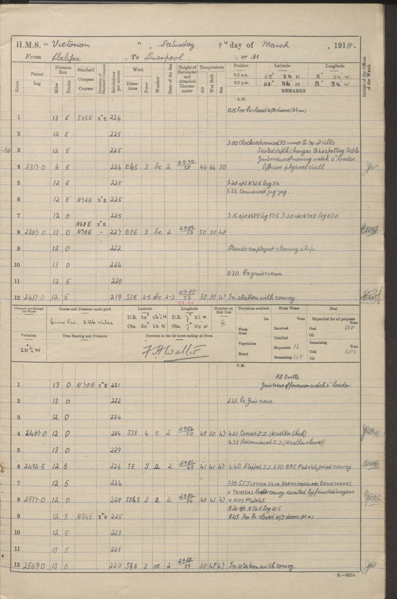(Maps prepared using Journey Plotter, developed by Maikel. The Plots can only be approximate. They are made by joining-up positions on successive days, and sometimes positions are not given. There will therefore be occasions when the ship appears to have travelled overland) LOGS FOR AUGUST 1914 4caf8c39cadfd341970352c4: (http://oldweather.s3.amazonaws.com/ADM53-67374/ADM53-67374-001_0.jpg) 4caf8c39cadfd341970352c5: (http://oldweather.s3.amazonaws.com/ADM53-67374/ADM53-67374-001_1.jpg) 4caf8c39cadfd341970352c6: (http://oldweather.s3.amazonaws.com/ADM53-67374/ADM53-67374-002_0.jpg) 4caf8c39cadfd341970352c7: (http://oldweather.s3.amazonaws.com/ADM53-67374/ADM53-67374-002_1.jpg) 4caf8c39cadfd341970352c8: (http://oldweather.s3.amazonaws.com/ADM53-67374/ADM53-67374-003_0.jpg) 4caf8c39cadfd341970352c9: (http://oldweather.s3.amazonaws.com/ADM53-67374/ADM53-67374-003_1.jpg) 4caf8c39cadfd341970352ca: (http://oldweather.s3.amazonaws.com/ADM53-67374/ADM53-67374-004_0.jpg) 4caf8c39cadfd341970352cb: (http://oldweather.s3.amazonaws.com/ADM53-67374/ADM53-67374-004_1.jpg) 4caf8c39cadfd341970352cc: (http://oldweather.s3.amazonaws.com/ADM53-67374/ADM53-67374-005_0.jpg) 4caf8c39cadfd341970352cd: (http://oldweather.s3.amazonaws.com/ADM53-67374/ADM53-67374-005_1.jpg) Establishment of ship’s company Officers 44 Seamen 114 Boys ‒ Marines 38 Engine-room establishment 75 Other non-executive ratings 44 Total 315 BAROMETER Mercurial or aneroid: Mercurial Name of maker and number: Dobbie McInnes Height of cistern above sea: 55ft Error of mercurial barometer: .10 too low at 29.28 Thermometers for air temperature Position in ship: Fore bridge Whether in screen: Yes Maker and number: AC Cossor 3942C Date: From August 23 POSITION OF STANDARD COMPASS Top of wheel house on bridge DEVIATION OF STANDARD COMPASS Date obtained: August 23rd 1914 Position: River Mersey ARMAMENT Position: 2 guns forecastle head 2 guns forward house 2 guns after house 2 guns poop Number and nature of guns and mounting: 8 4.7” QF; P111 mountings TORPEDO ARMAMENT None BOATS Number of each carried: 8 Length and description: A lifeboats (wood) 26.2 ft Number of each carried: 4 Length and description: A lifeboats (steel) 26.0 ft MISCELLANEOUS INFORMATION Draught of water with bunkers full, and complete with provisions, stores and water: 26 ft 11 in forward; 29 ft 5 in aft Load draught: 26 ft 11 in forward; 29 ft 5 in aft Number of tons of coal carried (43 cubic feet per ton): 4541 Number of tons of oil fuel carried: None Quantity of water carried: For boilers 230; for drinking 700 THE VOYAGES OF HMS VICTORIAN 1914