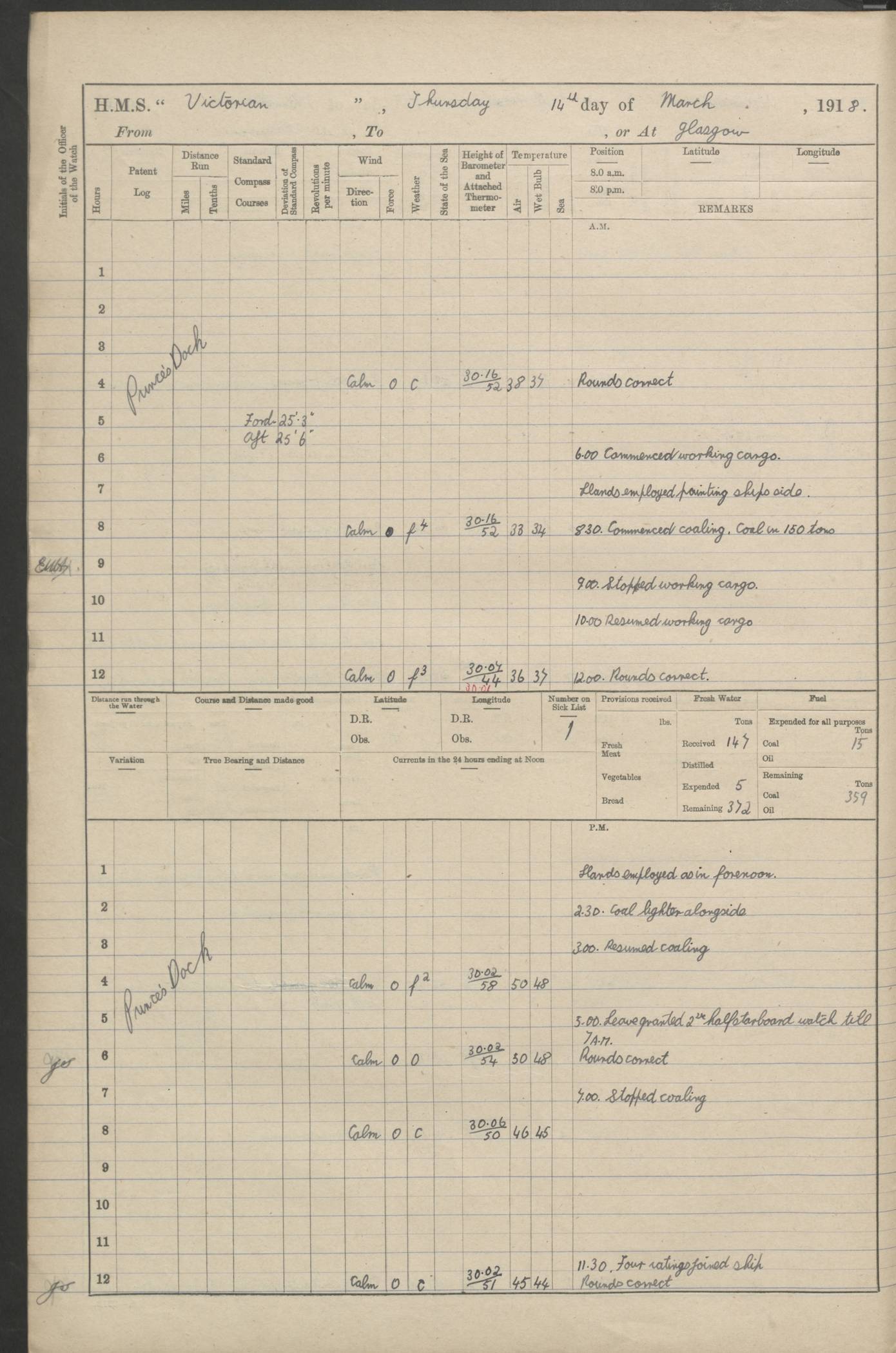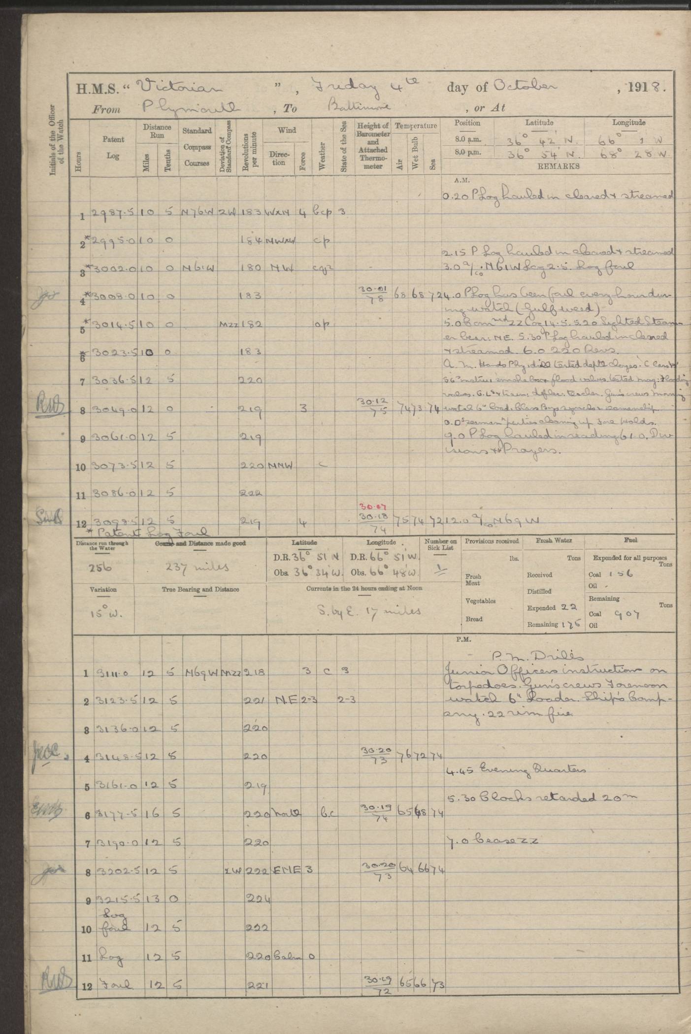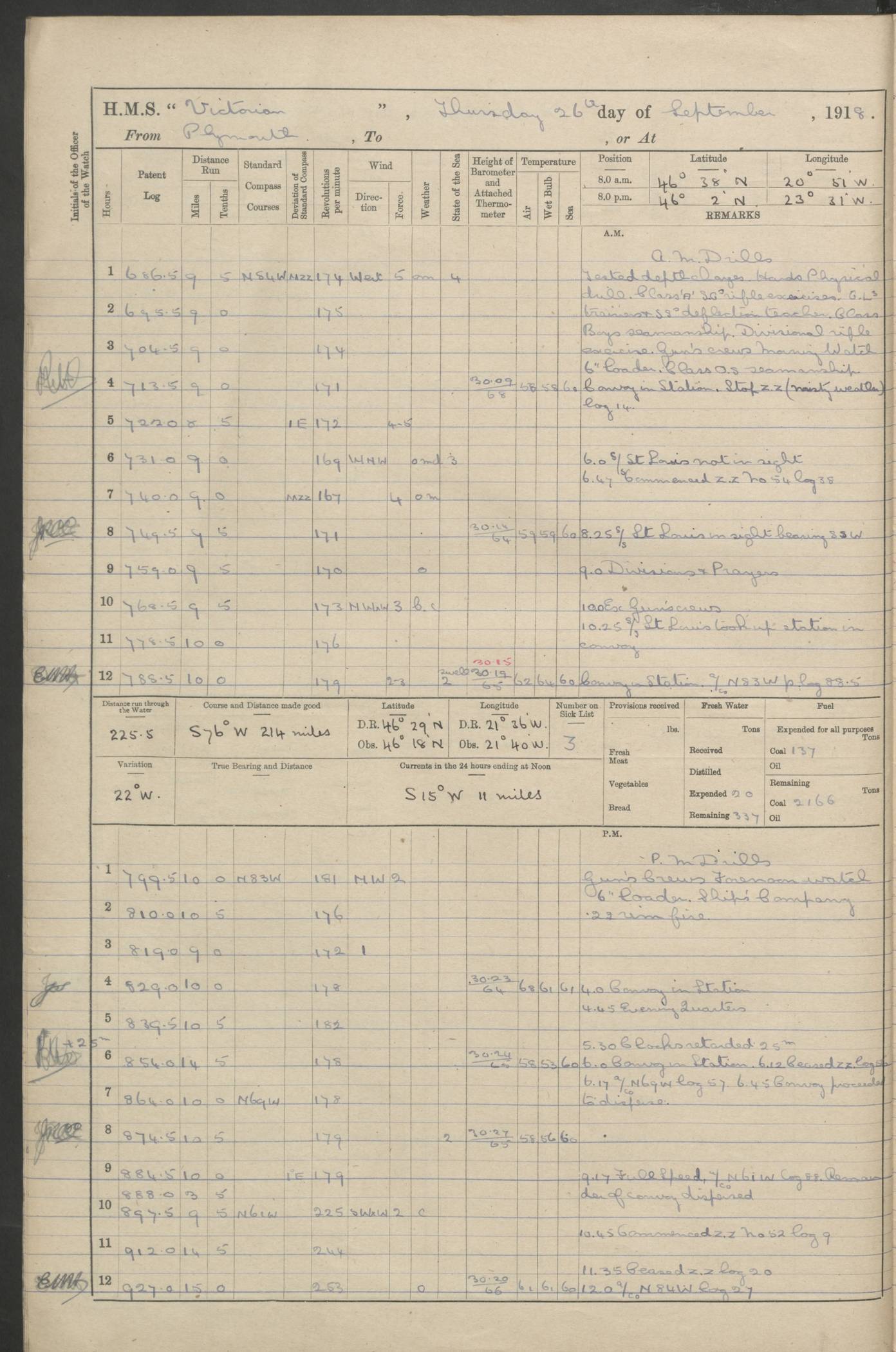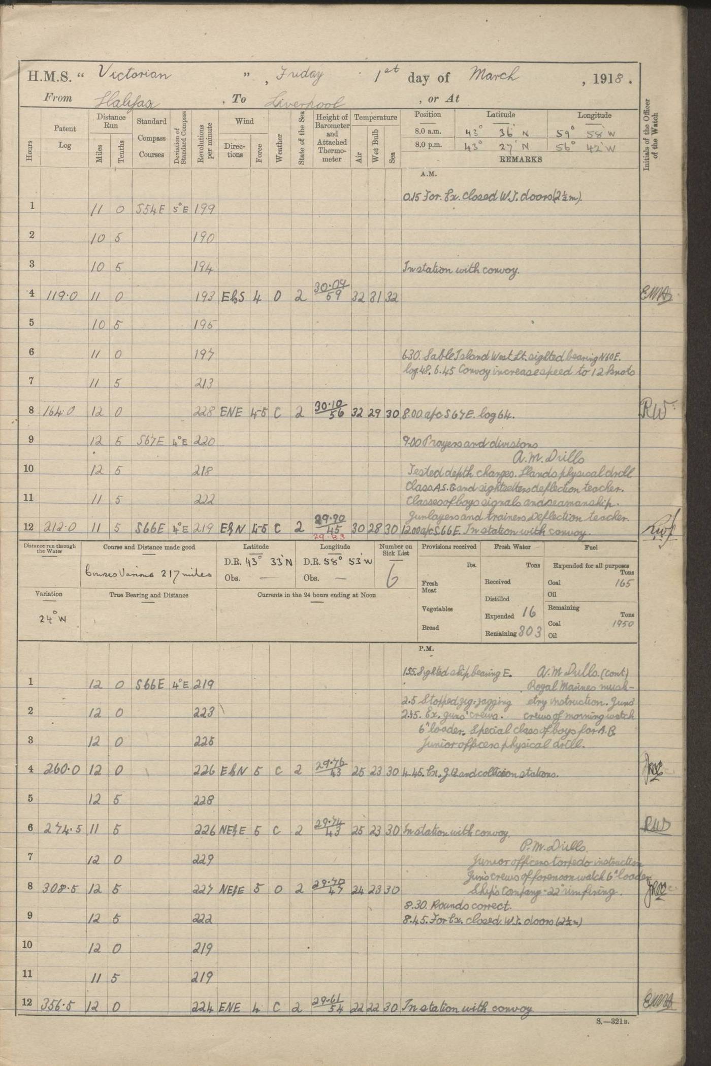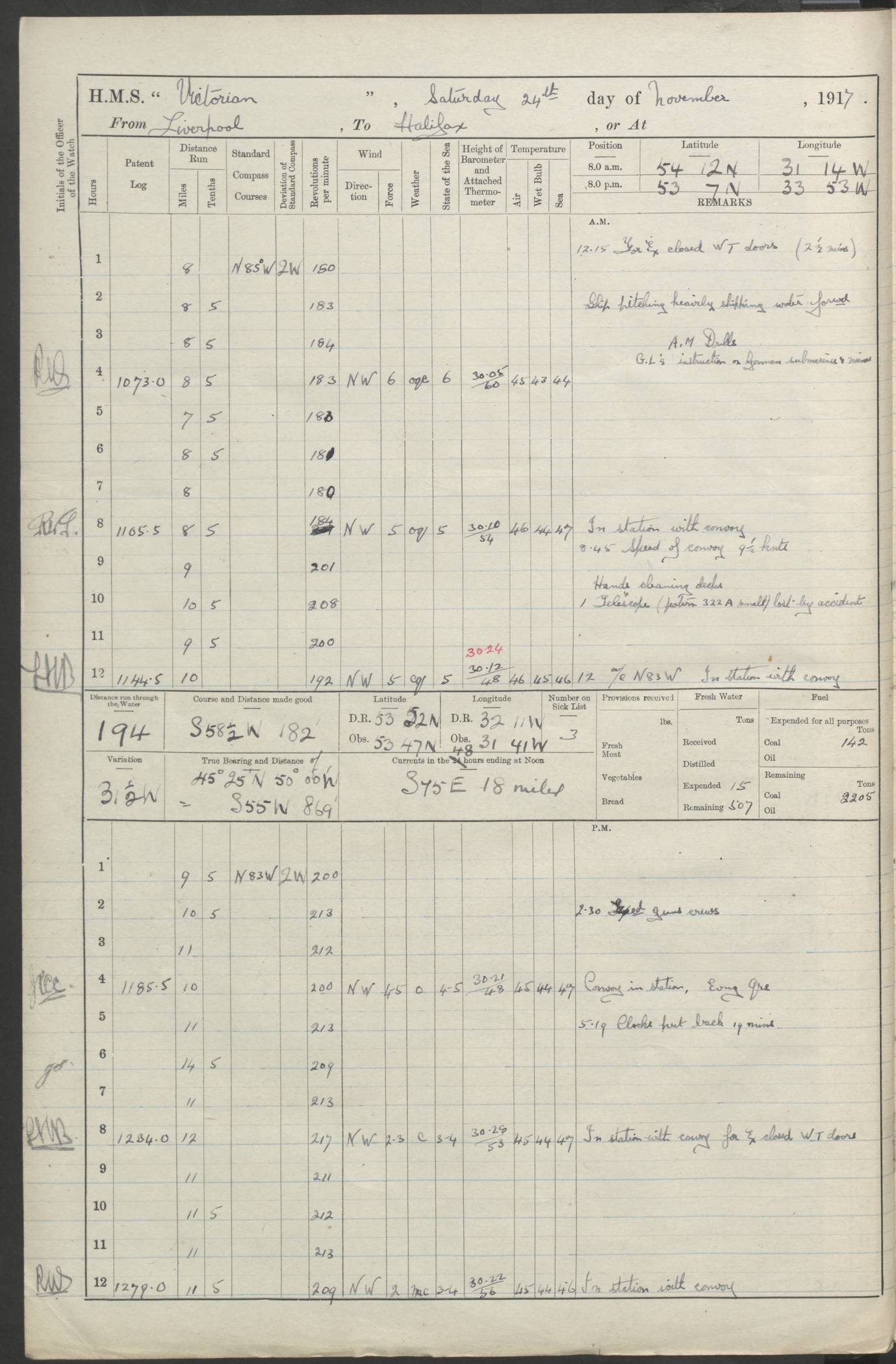 (Maps prepared using Journey Plotter, developed by Maikel. The Plots can only be approximate. They are made by joining-up positions on successive days, and sometimes positions are not given. There will therefore be occasions when the ship appears to have travelled overland) LOGS FOR AUGUST 1914 4caf8c39cadfd341970352c4: (http://oldweather.s3.amazonaws.com/ADM53-67374/ADM53-67374-001_0.jpg) 4caf8c39cadfd341970352c5: (http://oldweather.s3.amazonaws.com/ADM53-67374/ADM53-67374-001_1.jpg) 4caf8c39cadfd341970352c6: (http://oldweather.s3.amazonaws.com/ADM53-67374/ADM53-67374-002_0.jpg) 4caf8c39cadfd341970352c7: (http://oldweather.s3.amazonaws.com/ADM53-67374/ADM53-67374-002_1.jpg) 4caf8c39cadfd341970352c8: (http://oldweather.s3.amazonaws.com/ADM53-67374/ADM53-67374-003_0.jpg) 4caf8c39cadfd341970352c9: (http://oldweather.s3.amazonaws.com/ADM53-67374/ADM53-67374-003_1.jpg) 4caf8c39cadfd341970352ca: (http://oldweather.s3.amazonaws.com/ADM53-67374/ADM53-67374-004_0.jpg) 4caf8c39cadfd341970352cb: (http://oldweather.s3.amazonaws.com/ADM53-67374/ADM53-67374-004_1.jpg) 4caf8c39cadfd341970352cc: (http://oldweather.s3.amazonaws.com/ADM53-67374/ADM53-67374-005_0.jpg) 4caf8c39cadfd341970352cd: (http://oldweather.s3.amazonaws.com/ADM53-67374/ADM53-67374-005_1.jpg) Establishment of ship’s company Officers 44 Seamen 114 Boys ‒ Marines 38 Engine-room establishment 75 Other non-executive ratings 44 Total 315 BAROMETER Mercurial or aneroid: Mercurial Name of maker and number: Dobbie McInnes Height of cistern above sea: 55ft Error of mercurial barometer: .10 too low at 29.28 Thermometers for air temperature Position in ship: Fore bridge Whether in screen: Yes Maker and number: AC Cossor 3942C Date: From August 23 POSITION OF STANDARD COMPASS Top of wheel house on bridge DEVIATION OF STANDARD COMPASS Date obtained: August 23rd 1914 Position: River Mersey ARMAMENT Position: 2 guns forecastle head 2 guns forward house 2 guns after house 2 guns poop Number and nature of guns and mounting: 8 4.7” QF; P111 mountings TORPEDO ARMAMENT None BOATS Number of each carried: 8 Length and description: A lifeboats (wood) 26.2 ft Number of each carried: 4 Length and description: A lifeboats (steel) 26.0 ft MISCELLANEOUS INFORMATION Draught of water with bunkers full, and complete with provisions, stores and water: 26 ft 11 in forward; 29 ft 5 in aft Load draught: 26 ft 11 in forward; 29 ft 5 in aft Number of tons of coal carried (43 cubic feet per ton): 4541 Number of tons of oil fuel carried: None Quantity of water carried: For boilers 230; for drinking 700 THE VOYAGES OF HMS VICTORIAN 1914