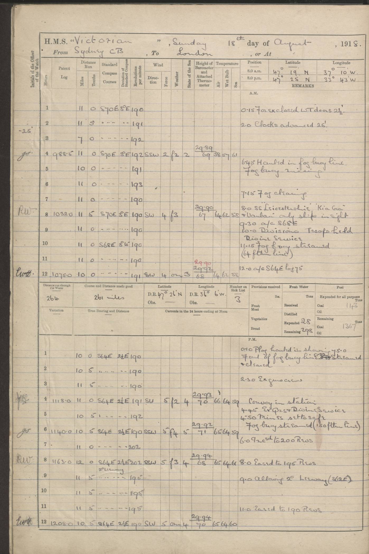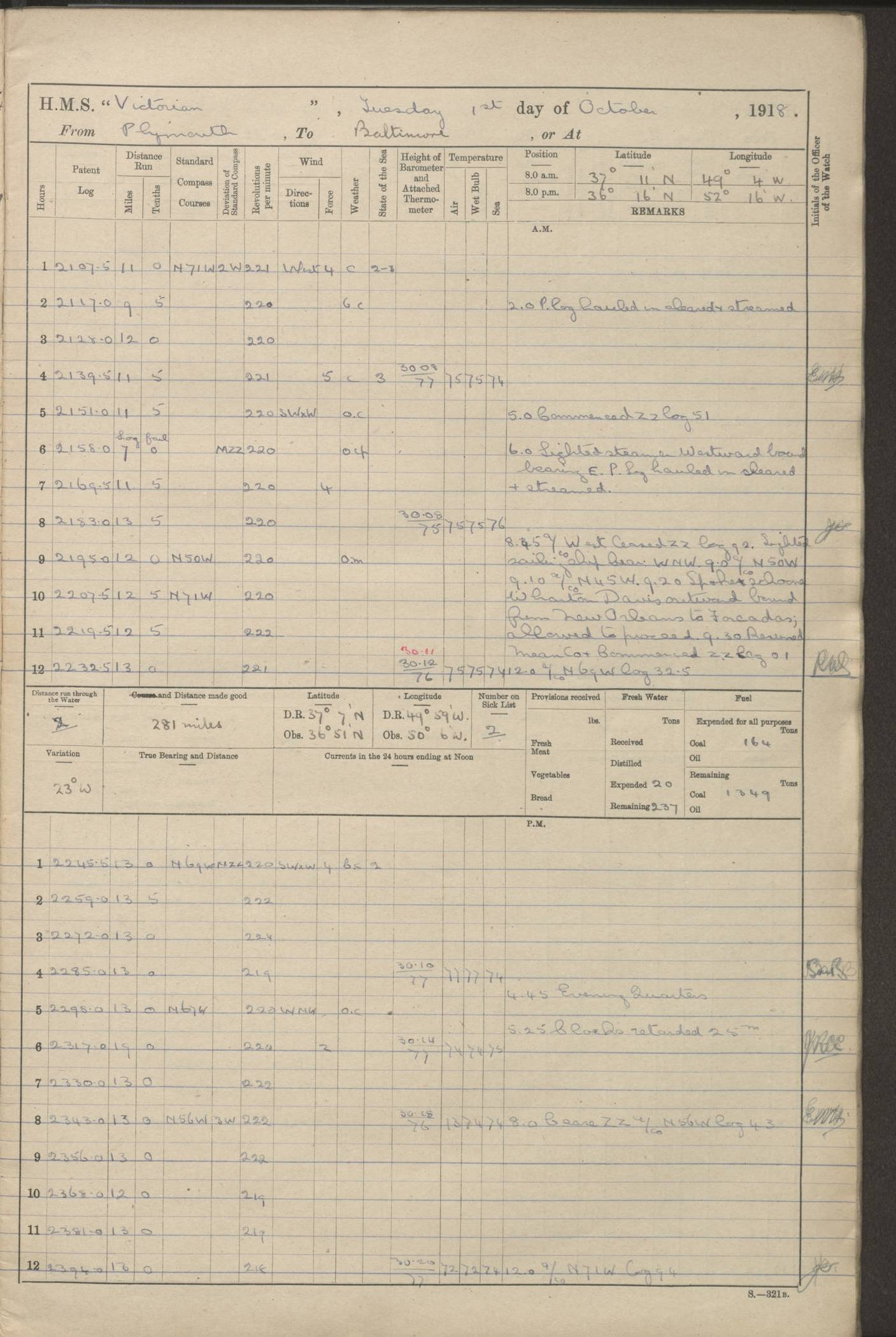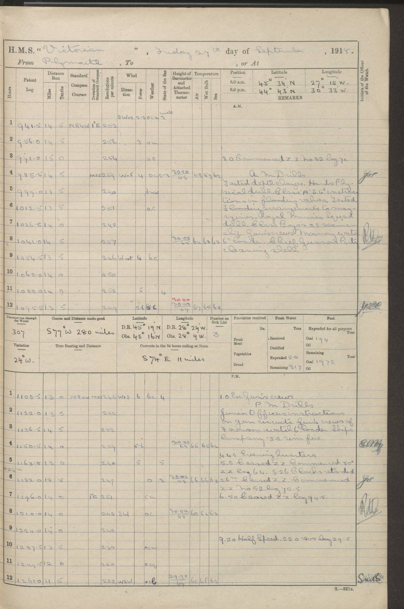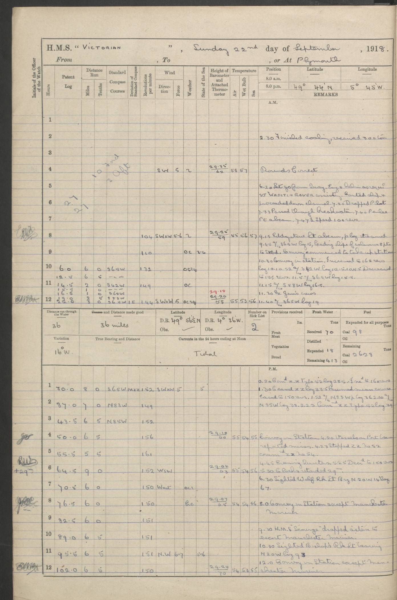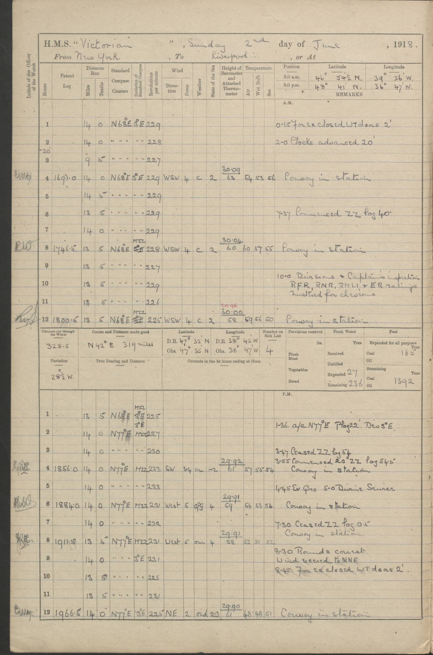 (Maps prepared using Journey Plotter, developed by Maikel. The Plots can only be approximate. They are made by joining-up positions on successive days, and sometimes positions are not given. There will therefore be occasions when the ship appears to have travelled overland) LOGS FOR AUGUST 1914 4caf8c39cadfd341970352c4: (http://oldweather.s3.amazonaws.com/ADM53-67374/ADM53-67374-001_0.jpg) 4caf8c39cadfd341970352c5: (http://oldweather.s3.amazonaws.com/ADM53-67374/ADM53-67374-001_1.jpg) 4caf8c39cadfd341970352c6: (http://oldweather.s3.amazonaws.com/ADM53-67374/ADM53-67374-002_0.jpg) 4caf8c39cadfd341970352c7: (http://oldweather.s3.amazonaws.com/ADM53-67374/ADM53-67374-002_1.jpg) 4caf8c39cadfd341970352c8: (http://oldweather.s3.amazonaws.com/ADM53-67374/ADM53-67374-003_0.jpg) 4caf8c39cadfd341970352c9: (http://oldweather.s3.amazonaws.com/ADM53-67374/ADM53-67374-003_1.jpg) 4caf8c39cadfd341970352ca: (http://oldweather.s3.amazonaws.com/ADM53-67374/ADM53-67374-004_0.jpg) 4caf8c39cadfd341970352cb: (http://oldweather.s3.amazonaws.com/ADM53-67374/ADM53-67374-004_1.jpg) 4caf8c39cadfd341970352cc: (http://oldweather.s3.amazonaws.com/ADM53-67374/ADM53-67374-005_0.jpg) 4caf8c39cadfd341970352cd: (http://oldweather.s3.amazonaws.com/ADM53-67374/ADM53-67374-005_1.jpg) Establishment of ship’s company Officers 44 Seamen 114 Boys ‒ Marines 38 Engine-room establishment 75 Other non-executive ratings 44 Total 315 BAROMETER Mercurial or aneroid: Mercurial Name of maker and number: Dobbie McInnes Height of cistern above sea: 55ft Error of mercurial barometer: .10 too low at 29.28 Thermometers for air temperature Position in ship: Fore bridge Whether in screen: Yes Maker and number: AC Cossor 3942C Date: From August 23 POSITION OF STANDARD COMPASS Top of wheel house on bridge DEVIATION OF STANDARD COMPASS Date obtained: August 23rd 1914 Position: River Mersey ARMAMENT Position: 2 guns forecastle head 2 guns forward house 2 guns after house 2 guns poop Number and nature of guns and mounting: 8 4.7” QF; P111 mountings TORPEDO ARMAMENT None BOATS Number of each carried: 8 Length and description: A lifeboats (wood) 26.2 ft Number of each carried: 4 Length and description: A lifeboats (steel) 26.0 ft MISCELLANEOUS INFORMATION Draught of water with bunkers full, and complete with provisions, stores and water: 26 ft 11 in forward; 29 ft 5 in aft Load draught: 26 ft 11 in forward; 29 ft 5 in aft Number of tons of coal carried (43 cubic feet per ton): 4541 Number of tons of oil fuel carried: None Quantity of water carried: For boilers 230; for drinking 700 THE VOYAGES OF HMS VICTORIAN 1914