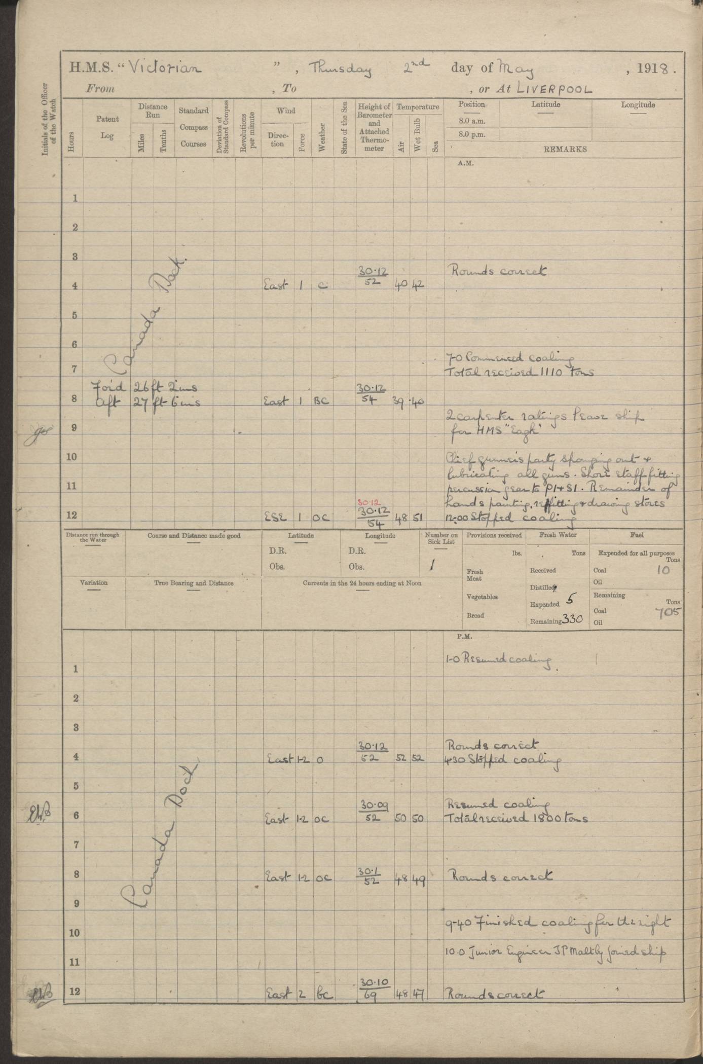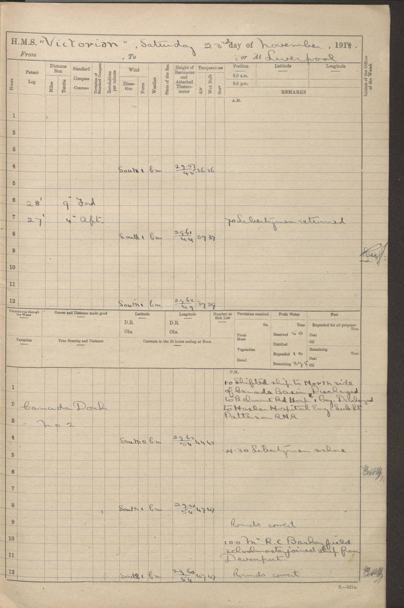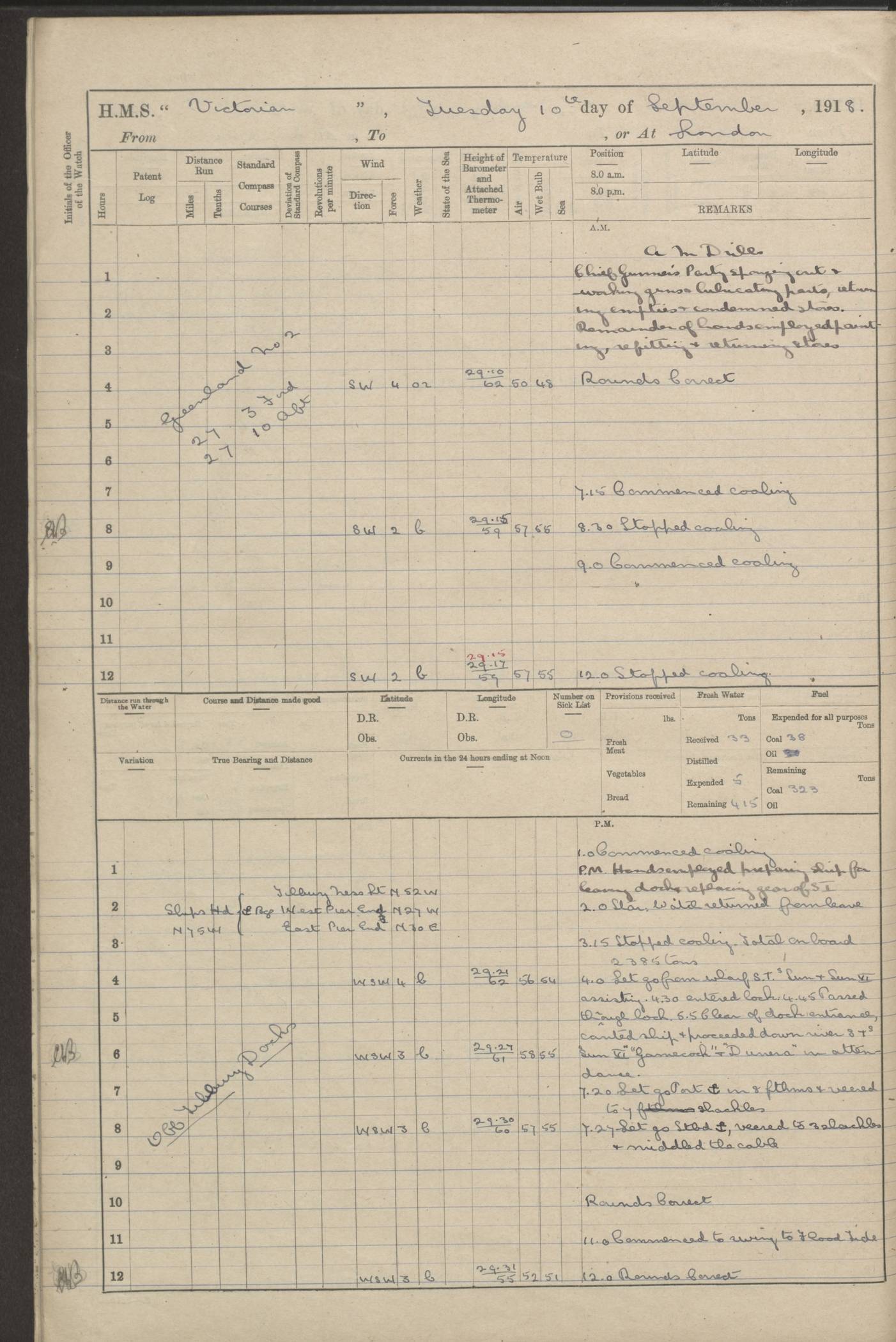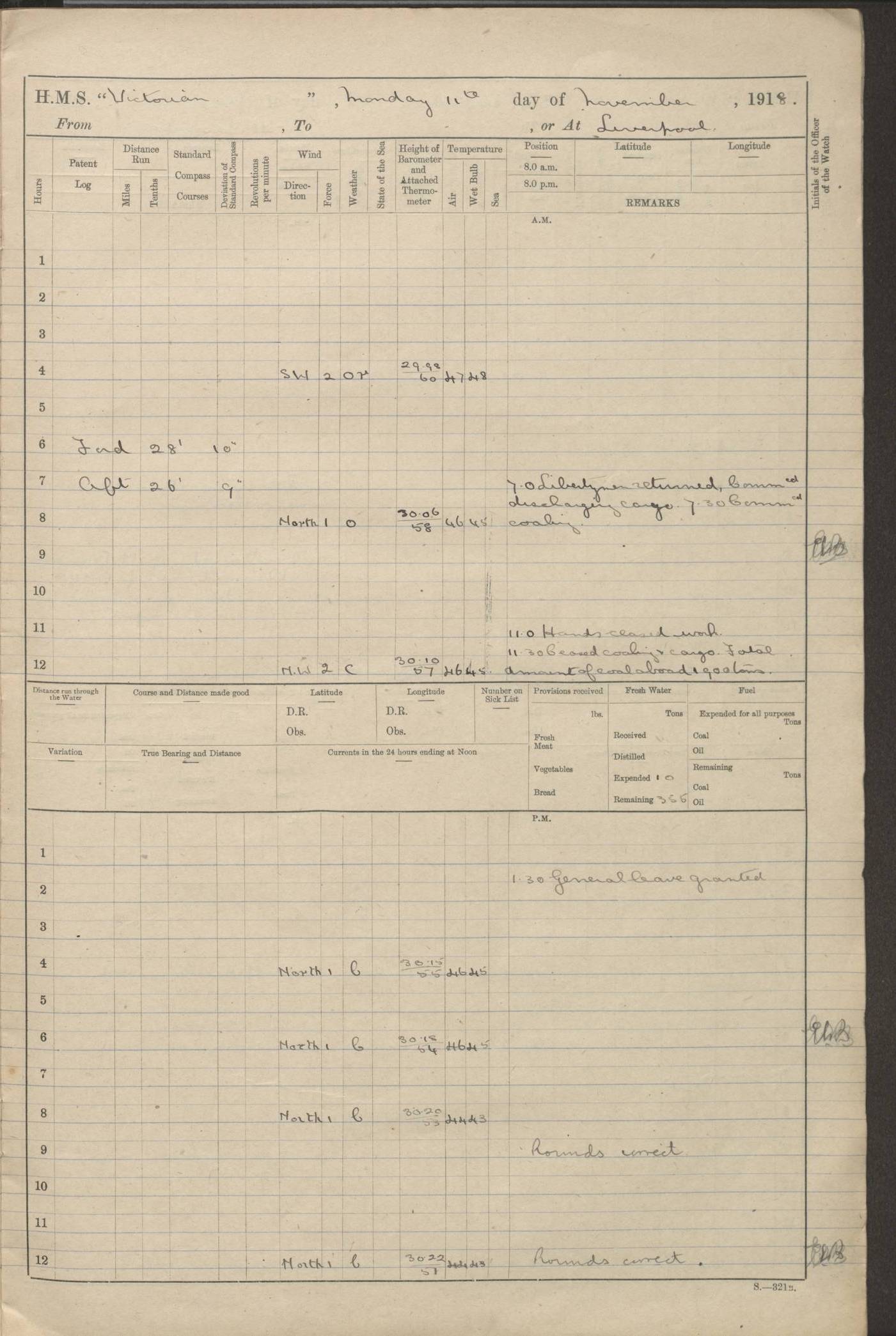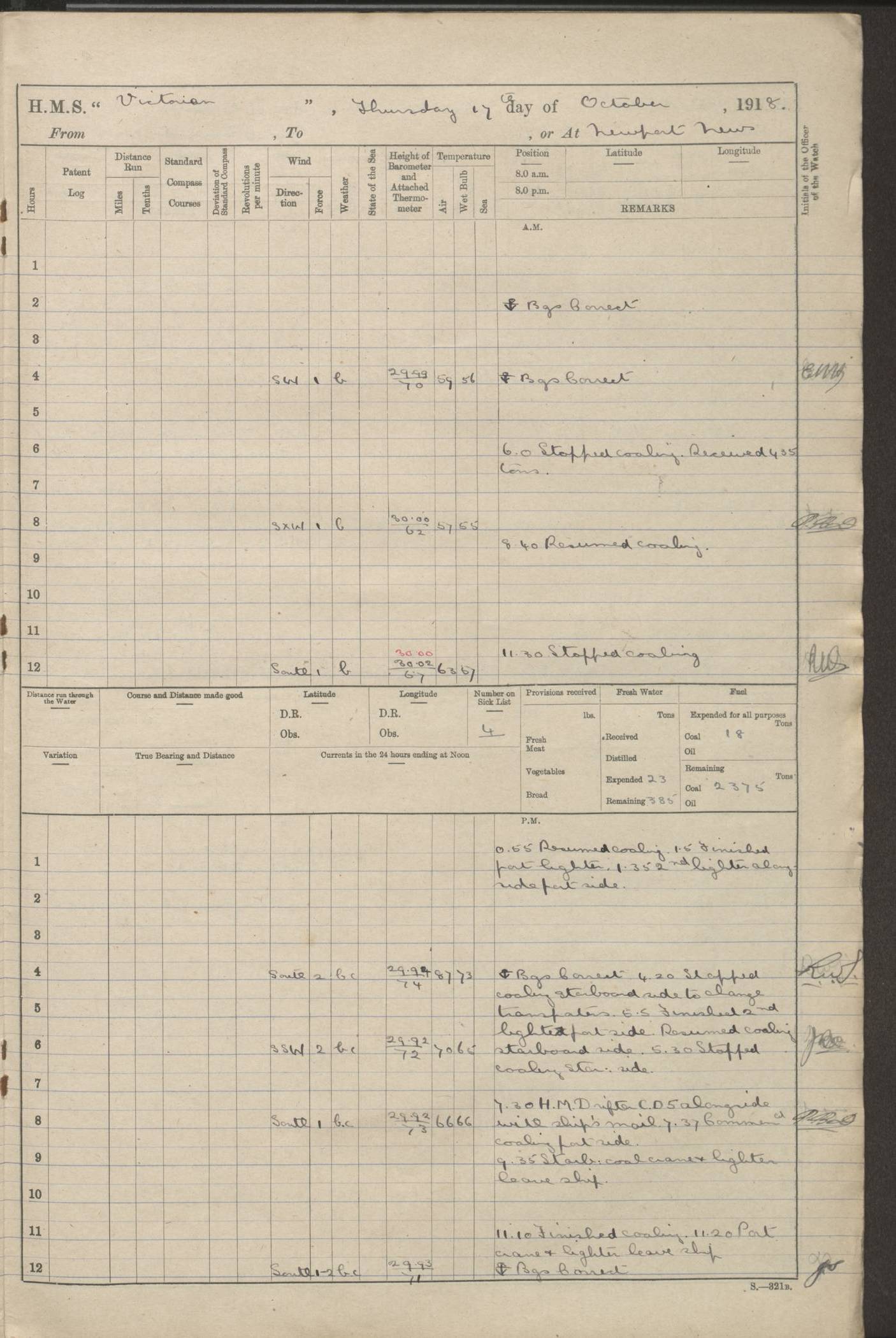 (Maps prepared using Journey Plotter, developed by Maikel. The Plots can only be approximate. They are made by joining-up positions on successive days, and sometimes positions are not given. There will therefore be occasions when the ship appears to have travelled overland) LOGS FOR AUGUST 1914 4caf8c39cadfd341970352c4: (http://oldweather.s3.amazonaws.com/ADM53-67374/ADM53-67374-001_0.jpg) 4caf8c39cadfd341970352c5: (http://oldweather.s3.amazonaws.com/ADM53-67374/ADM53-67374-001_1.jpg) 4caf8c39cadfd341970352c6: (http://oldweather.s3.amazonaws.com/ADM53-67374/ADM53-67374-002_0.jpg) 4caf8c39cadfd341970352c7: (http://oldweather.s3.amazonaws.com/ADM53-67374/ADM53-67374-002_1.jpg) 4caf8c39cadfd341970352c8: (http://oldweather.s3.amazonaws.com/ADM53-67374/ADM53-67374-003_0.jpg) 4caf8c39cadfd341970352c9: (http://oldweather.s3.amazonaws.com/ADM53-67374/ADM53-67374-003_1.jpg) 4caf8c39cadfd341970352ca: (http://oldweather.s3.amazonaws.com/ADM53-67374/ADM53-67374-004_0.jpg) 4caf8c39cadfd341970352cb: (http://oldweather.s3.amazonaws.com/ADM53-67374/ADM53-67374-004_1.jpg) 4caf8c39cadfd341970352cc: (http://oldweather.s3.amazonaws.com/ADM53-67374/ADM53-67374-005_0.jpg) 4caf8c39cadfd341970352cd: (http://oldweather.s3.amazonaws.com/ADM53-67374/ADM53-67374-005_1.jpg) Establishment of ship’s company Officers 44 Seamen 114 Boys ‒ Marines 38 Engine-room establishment 75 Other non-executive ratings 44 Total 315 BAROMETER Mercurial or aneroid: Mercurial Name of maker and number: Dobbie McInnes Height of cistern above sea: 55ft Error of mercurial barometer: .10 too low at 29.28 Thermometers for air temperature Position in ship: Fore bridge Whether in screen: Yes Maker and number: AC Cossor 3942C Date: From August 23 POSITION OF STANDARD COMPASS Top of wheel house on bridge DEVIATION OF STANDARD COMPASS Date obtained: August 23rd 1914 Position: River Mersey ARMAMENT Position: 2 guns forecastle head 2 guns forward house 2 guns after house 2 guns poop Number and nature of guns and mounting: 8 4.7” QF; P111 mountings TORPEDO ARMAMENT None BOATS Number of each carried: 8 Length and description: A lifeboats (wood) 26.2 ft Number of each carried: 4 Length and description: A lifeboats (steel) 26.0 ft MISCELLANEOUS INFORMATION Draught of water with bunkers full, and complete with provisions, stores and water: 26 ft 11 in forward; 29 ft 5 in aft Load draught: 26 ft 11 in forward; 29 ft 5 in aft Number of tons of coal carried (43 cubic feet per ton): 4541 Number of tons of oil fuel carried: None Quantity of water carried: For boilers 230; for drinking 700 THE VOYAGES OF HMS VICTORIAN 1914