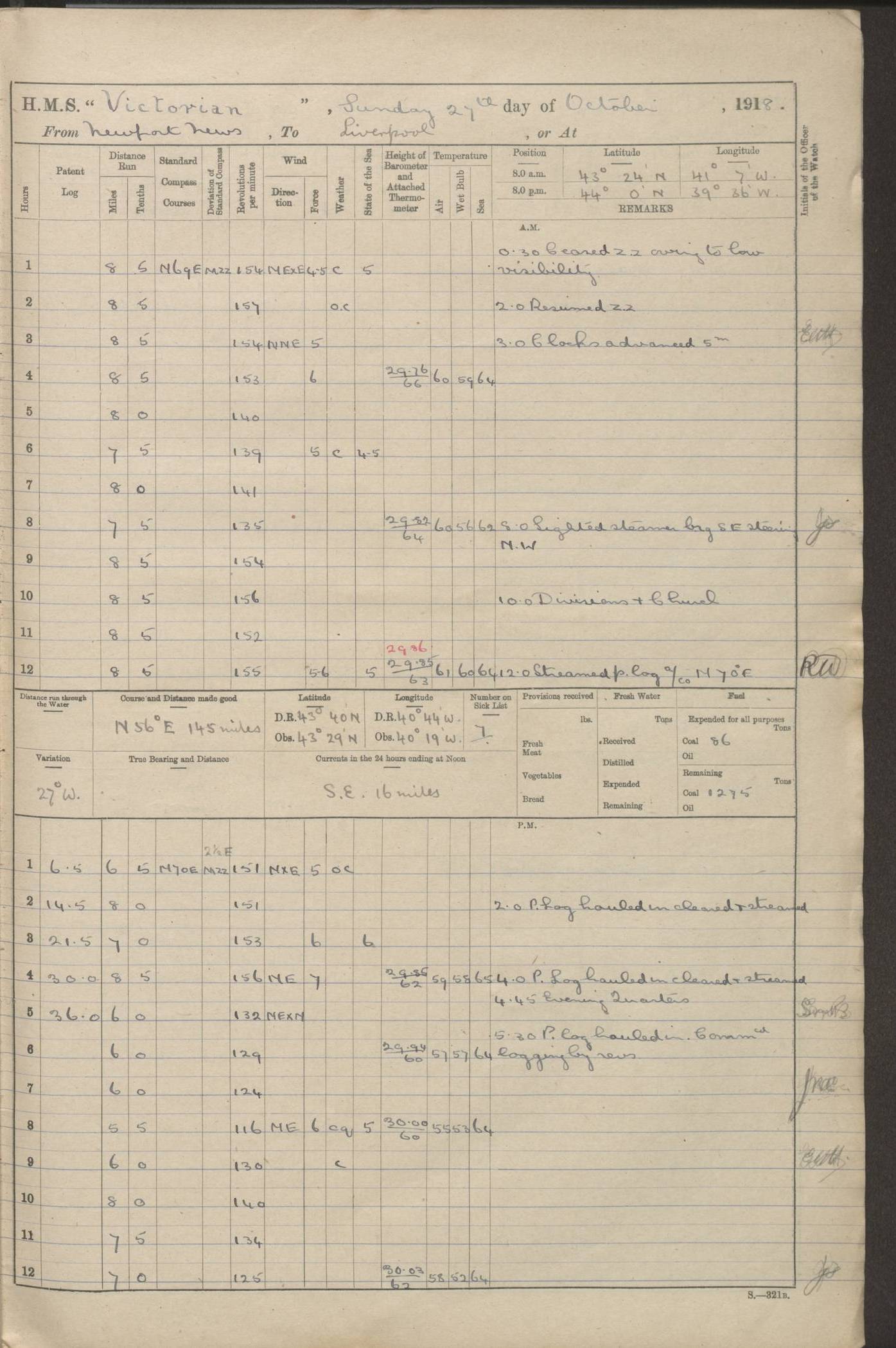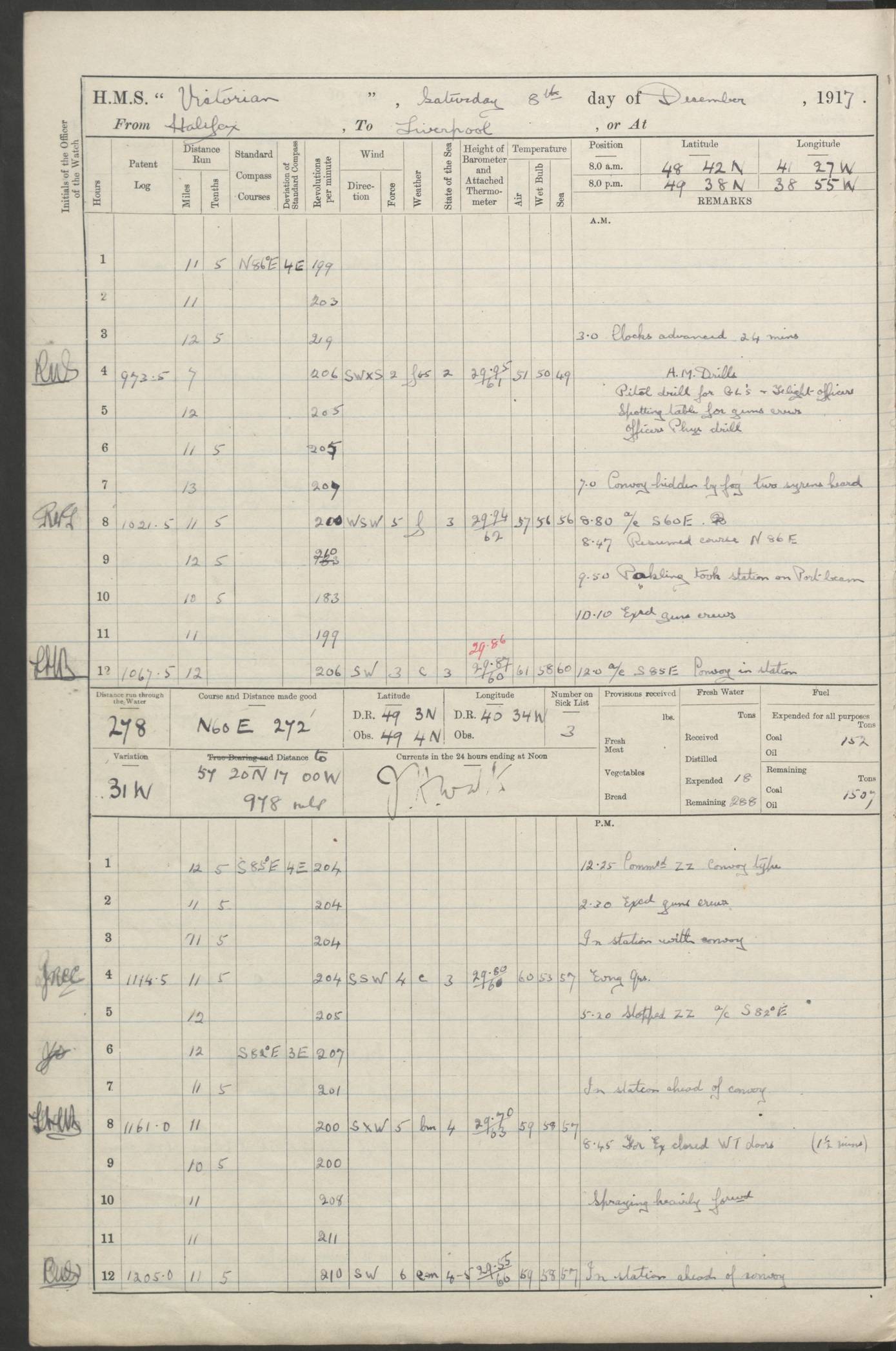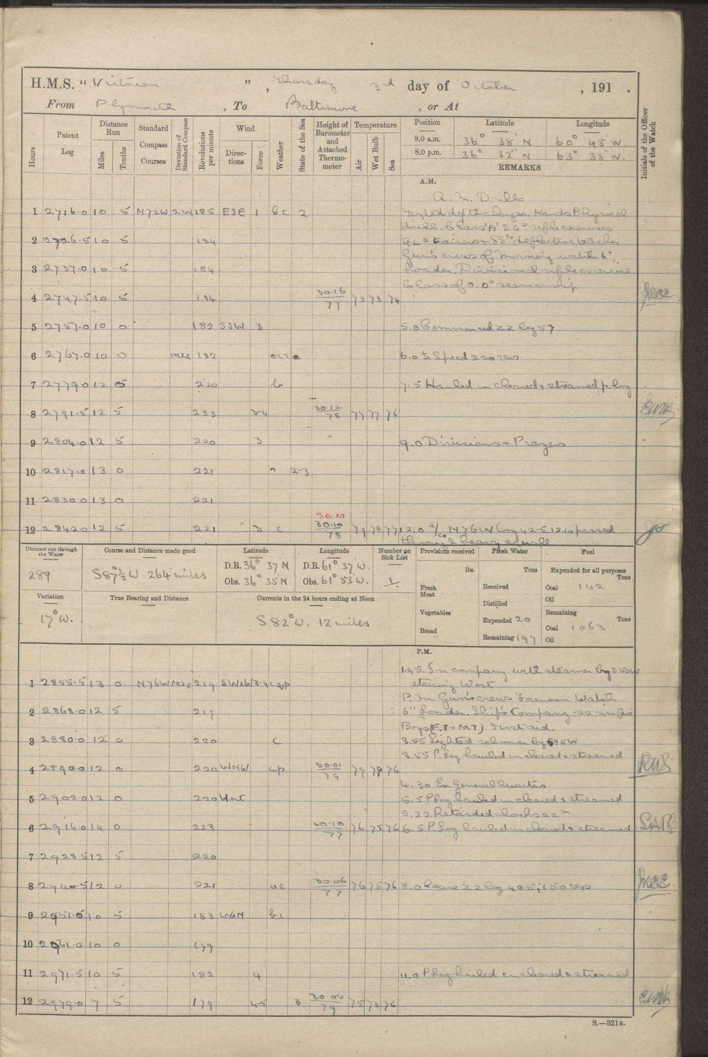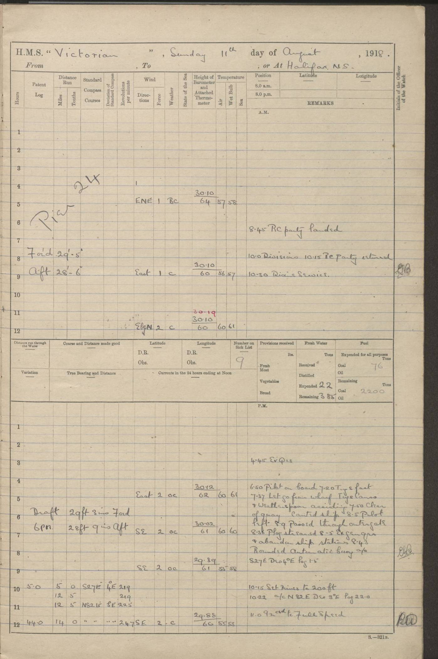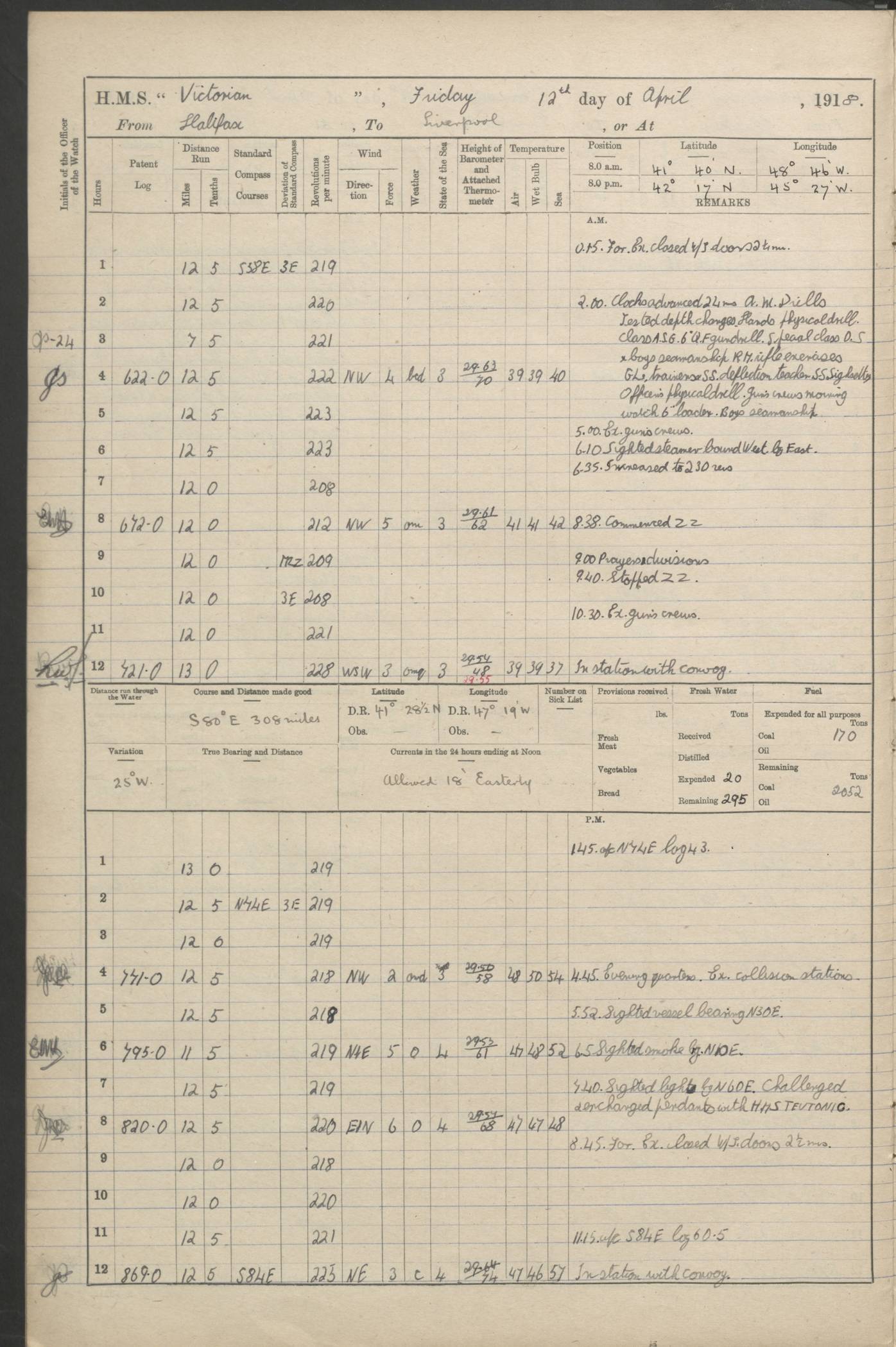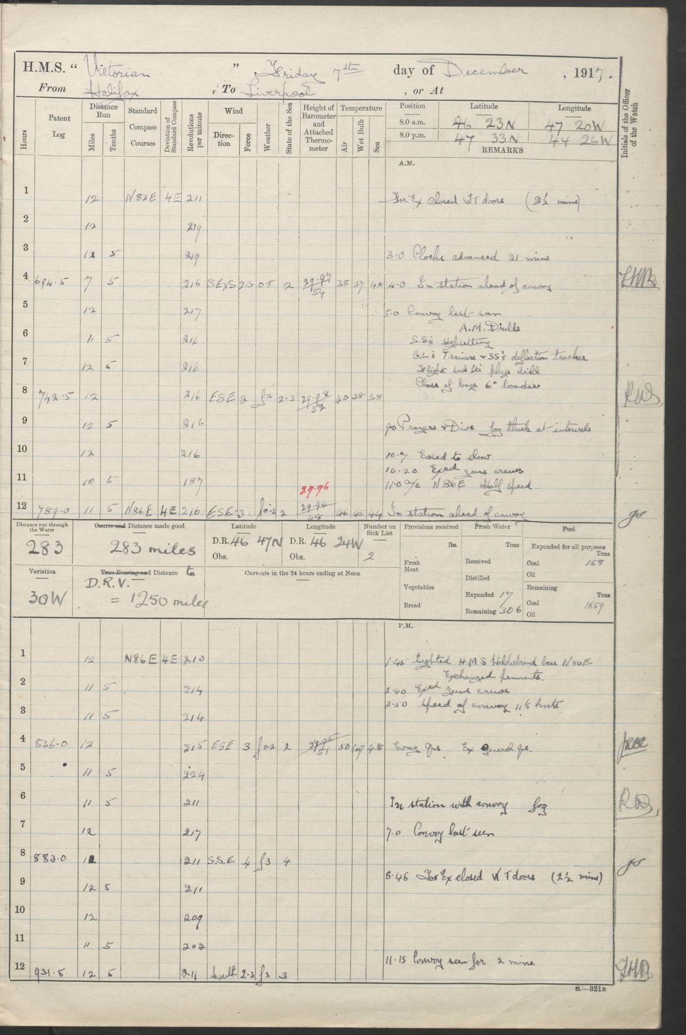 (Maps prepared using Journey Plotter, developed by Maikel. The Plots can only be approximate. They are made by joining-up positions on successive days, and sometimes positions are not given. There will therefore be occasions when the ship appears to have travelled overland) LOGS FOR AUGUST 1914 4caf8c39cadfd341970352c4: (http://oldweather.s3.amazonaws.com/ADM53-67374/ADM53-67374-001_0.jpg) 4caf8c39cadfd341970352c5: (http://oldweather.s3.amazonaws.com/ADM53-67374/ADM53-67374-001_1.jpg) 4caf8c39cadfd341970352c6: (http://oldweather.s3.amazonaws.com/ADM53-67374/ADM53-67374-002_0.jpg) 4caf8c39cadfd341970352c7: (http://oldweather.s3.amazonaws.com/ADM53-67374/ADM53-67374-002_1.jpg) 4caf8c39cadfd341970352c8: (http://oldweather.s3.amazonaws.com/ADM53-67374/ADM53-67374-003_0.jpg) 4caf8c39cadfd341970352c9: (http://oldweather.s3.amazonaws.com/ADM53-67374/ADM53-67374-003_1.jpg) 4caf8c39cadfd341970352ca: (http://oldweather.s3.amazonaws.com/ADM53-67374/ADM53-67374-004_0.jpg) 4caf8c39cadfd341970352cb: (http://oldweather.s3.amazonaws.com/ADM53-67374/ADM53-67374-004_1.jpg) 4caf8c39cadfd341970352cc: (http://oldweather.s3.amazonaws.com/ADM53-67374/ADM53-67374-005_0.jpg) 4caf8c39cadfd341970352cd: (http://oldweather.s3.amazonaws.com/ADM53-67374/ADM53-67374-005_1.jpg) Establishment of ship’s company Officers 44 Seamen 114 Boys ‒ Marines 38 Engine-room establishment 75 Other non-executive ratings 44 Total 315 BAROMETER Mercurial or aneroid: Mercurial Name of maker and number: Dobbie McInnes Height of cistern above sea: 55ft Error of mercurial barometer: .10 too low at 29.28 Thermometers for air temperature Position in ship: Fore bridge Whether in screen: Yes Maker and number: AC Cossor 3942C Date: From August 23 POSITION OF STANDARD COMPASS Top of wheel house on bridge DEVIATION OF STANDARD COMPASS Date obtained: August 23rd 1914 Position: River Mersey ARMAMENT Position: 2 guns forecastle head 2 guns forward house 2 guns after house 2 guns poop Number and nature of guns and mounting: 8 4.7” QF; P111 mountings TORPEDO ARMAMENT None BOATS Number of each carried: 8 Length and description: A lifeboats (wood) 26.2 ft Number of each carried: 4 Length and description: A lifeboats (steel) 26.0 ft MISCELLANEOUS INFORMATION Draught of water with bunkers full, and complete with provisions, stores and water: 26 ft 11 in forward; 29 ft 5 in aft Load draught: 26 ft 11 in forward; 29 ft 5 in aft Number of tons of coal carried (43 cubic feet per ton): 4541 Number of tons of oil fuel carried: None Quantity of water carried: For boilers 230; for drinking 700 THE VOYAGES OF HMS VICTORIAN 1914
