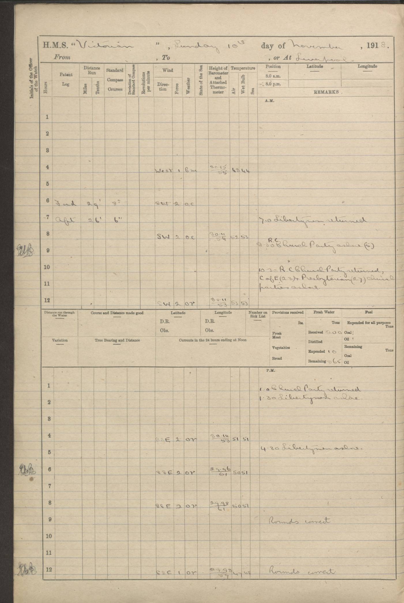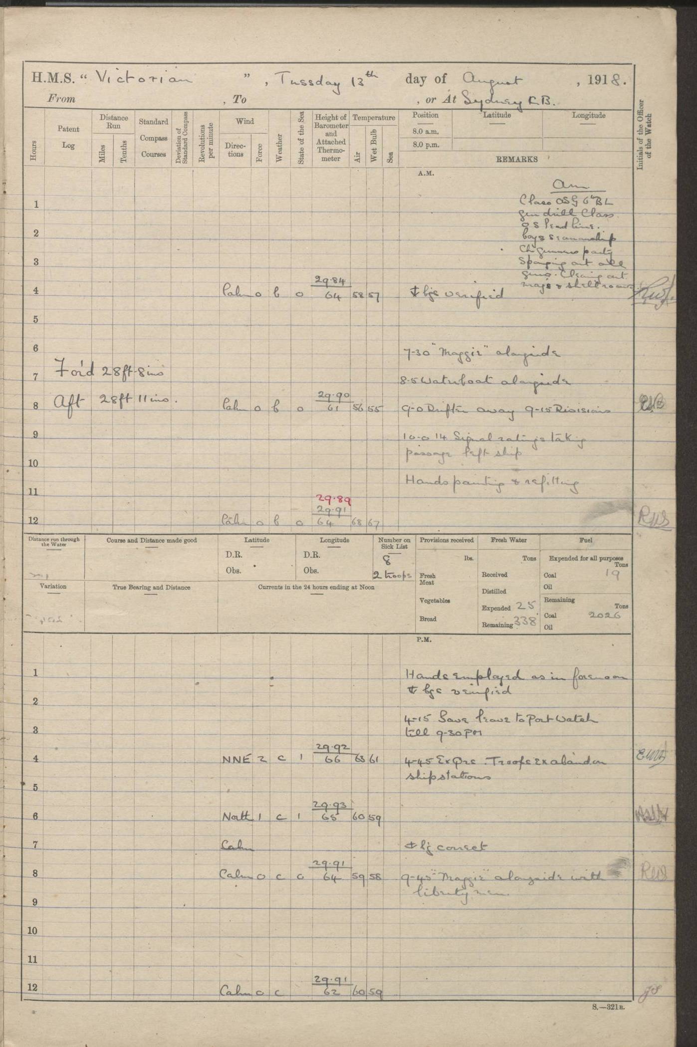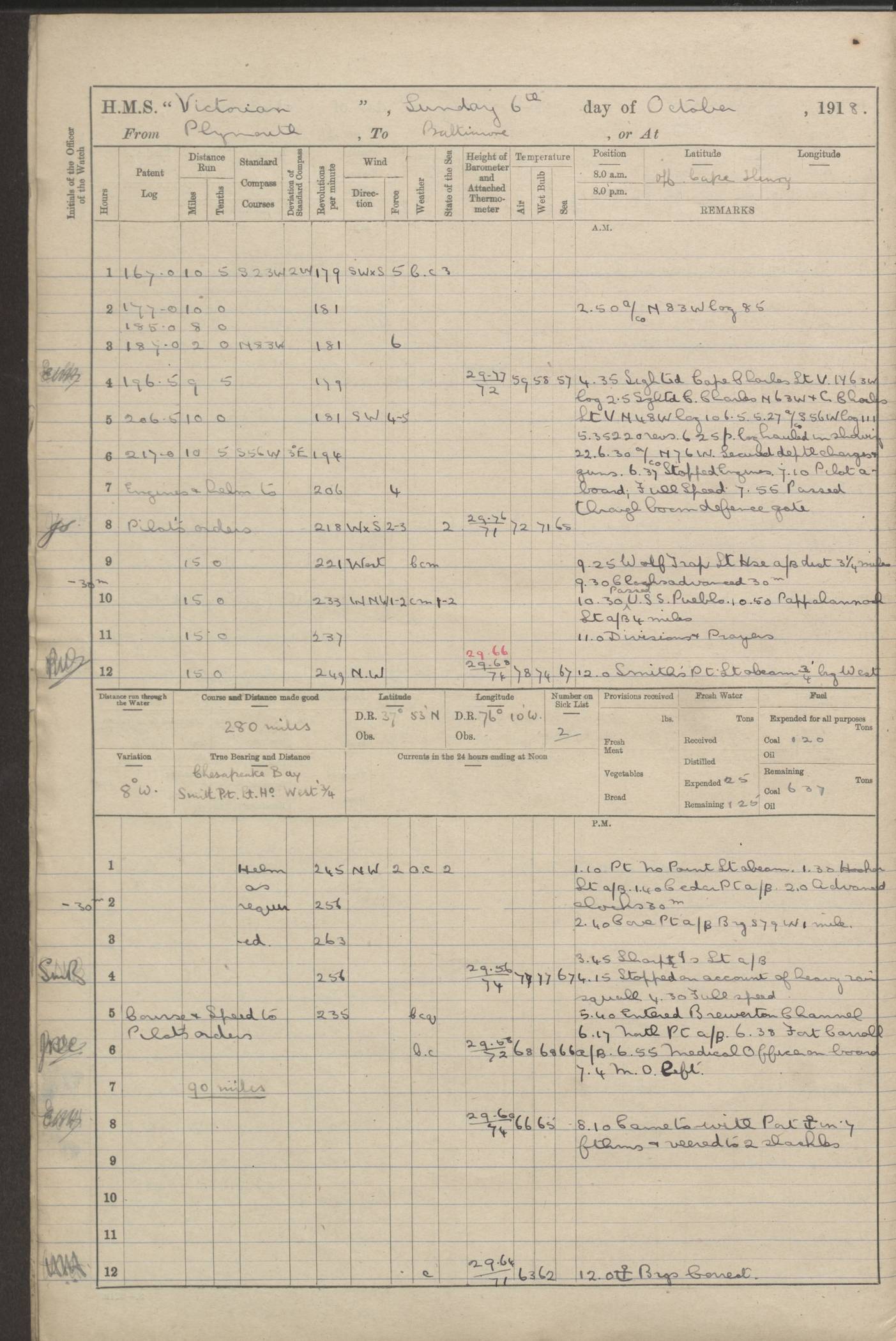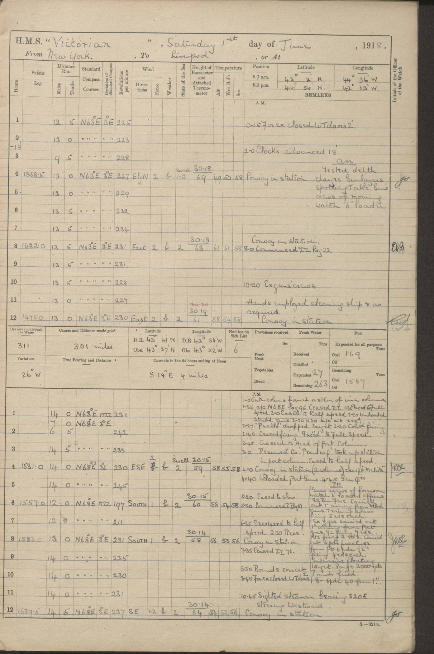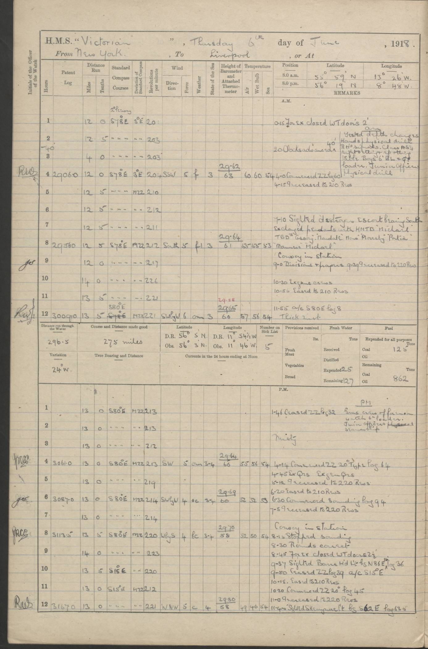 (Maps prepared using Journey Plotter, developed by Maikel. The Plots can only be approximate. They are made by joining-up positions on successive days, and sometimes positions are not given. There will therefore be occasions when the ship appears to have travelled overland) LOGS FOR AUGUST 1914 4caf8c39cadfd341970352c4: (http://oldweather.s3.amazonaws.com/ADM53-67374/ADM53-67374-001_0.jpg) 4caf8c39cadfd341970352c5: (http://oldweather.s3.amazonaws.com/ADM53-67374/ADM53-67374-001_1.jpg) 4caf8c39cadfd341970352c6: (http://oldweather.s3.amazonaws.com/ADM53-67374/ADM53-67374-002_0.jpg) 4caf8c39cadfd341970352c7: (http://oldweather.s3.amazonaws.com/ADM53-67374/ADM53-67374-002_1.jpg) 4caf8c39cadfd341970352c8: (http://oldweather.s3.amazonaws.com/ADM53-67374/ADM53-67374-003_0.jpg) 4caf8c39cadfd341970352c9: (http://oldweather.s3.amazonaws.com/ADM53-67374/ADM53-67374-003_1.jpg) 4caf8c39cadfd341970352ca: (http://oldweather.s3.amazonaws.com/ADM53-67374/ADM53-67374-004_0.jpg) 4caf8c39cadfd341970352cb: (http://oldweather.s3.amazonaws.com/ADM53-67374/ADM53-67374-004_1.jpg) 4caf8c39cadfd341970352cc: (http://oldweather.s3.amazonaws.com/ADM53-67374/ADM53-67374-005_0.jpg) 4caf8c39cadfd341970352cd: (http://oldweather.s3.amazonaws.com/ADM53-67374/ADM53-67374-005_1.jpg) Establishment of ship’s company Officers 44 Seamen 114 Boys ‒ Marines 38 Engine-room establishment 75 Other non-executive ratings 44 Total 315 BAROMETER Mercurial or aneroid: Mercurial Name of maker and number: Dobbie McInnes Height of cistern above sea: 55ft Error of mercurial barometer: .10 too low at 29.28 Thermometers for air temperature Position in ship: Fore bridge Whether in screen: Yes Maker and number: AC Cossor 3942C Date: From August 23 POSITION OF STANDARD COMPASS Top of wheel house on bridge DEVIATION OF STANDARD COMPASS Date obtained: August 23rd 1914 Position: River Mersey ARMAMENT Position: 2 guns forecastle head 2 guns forward house 2 guns after house 2 guns poop Number and nature of guns and mounting: 8 4.7” QF; P111 mountings TORPEDO ARMAMENT None BOATS Number of each carried: 8 Length and description: A lifeboats (wood) 26.2 ft Number of each carried: 4 Length and description: A lifeboats (steel) 26.0 ft MISCELLANEOUS INFORMATION Draught of water with bunkers full, and complete with provisions, stores and water: 26 ft 11 in forward; 29 ft 5 in aft Load draught: 26 ft 11 in forward; 29 ft 5 in aft Number of tons of coal carried (43 cubic feet per ton): 4541 Number of tons of oil fuel carried: None Quantity of water carried: For boilers 230; for drinking 700 THE VOYAGES OF HMS VICTORIAN 1914