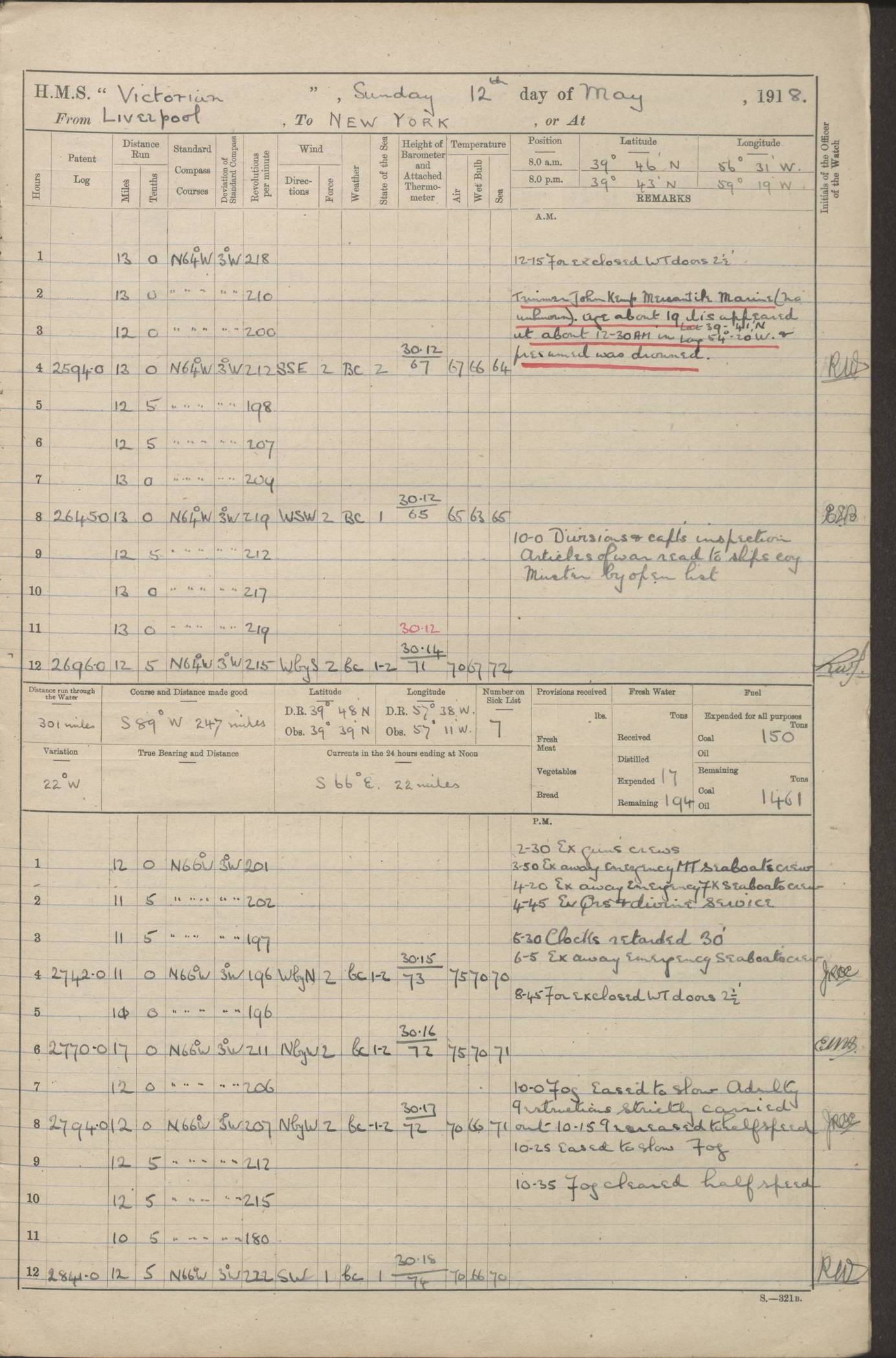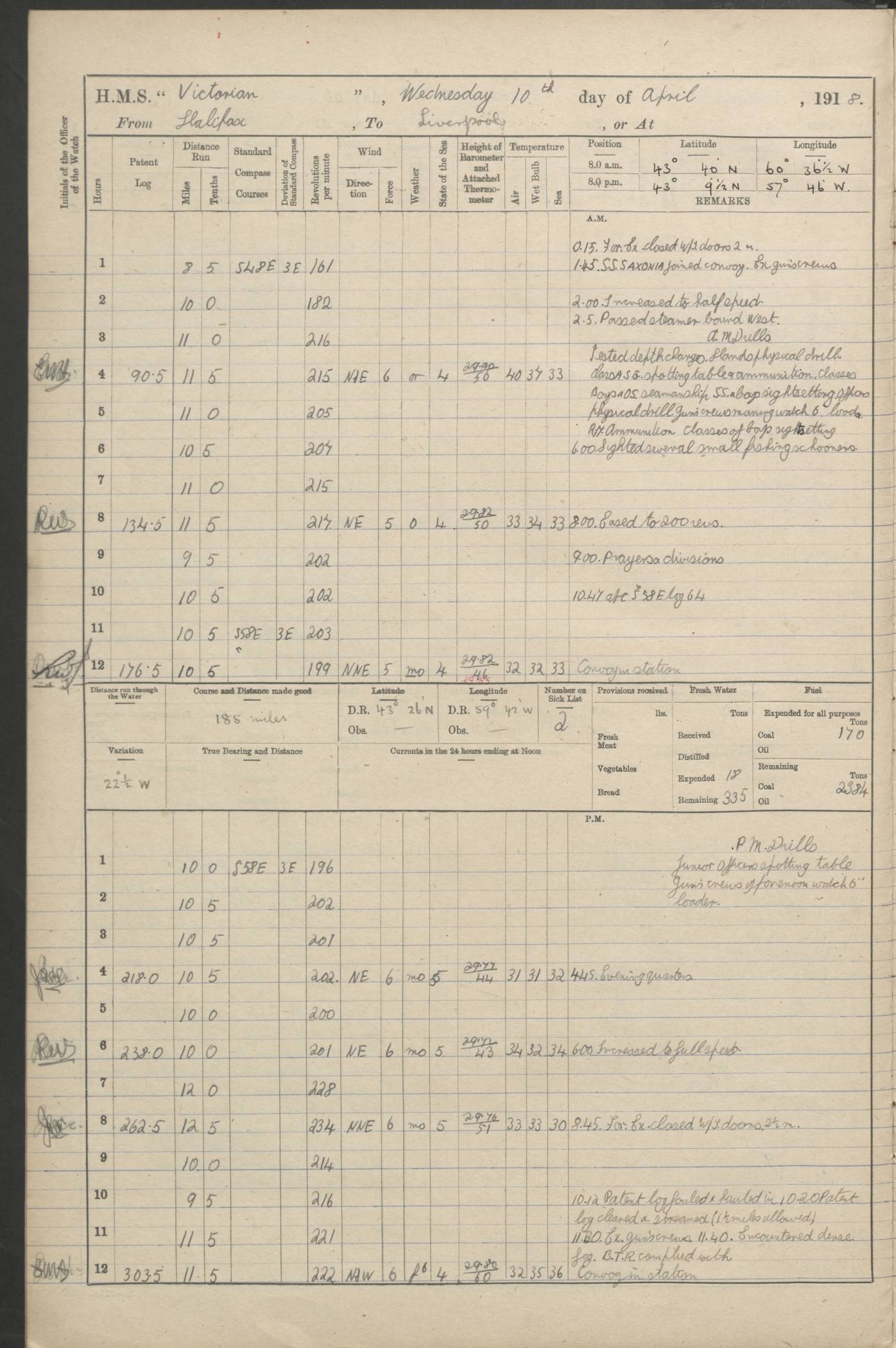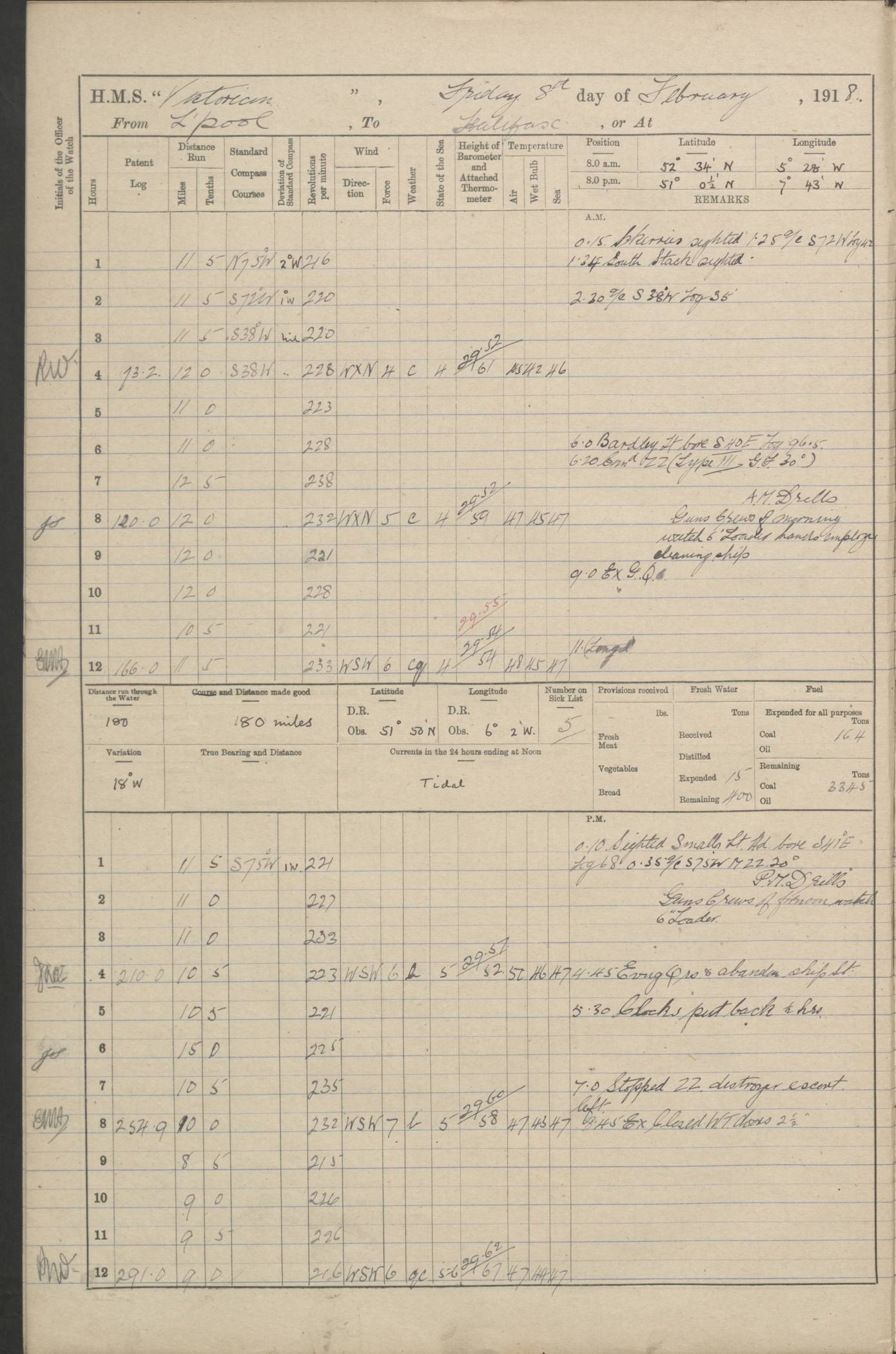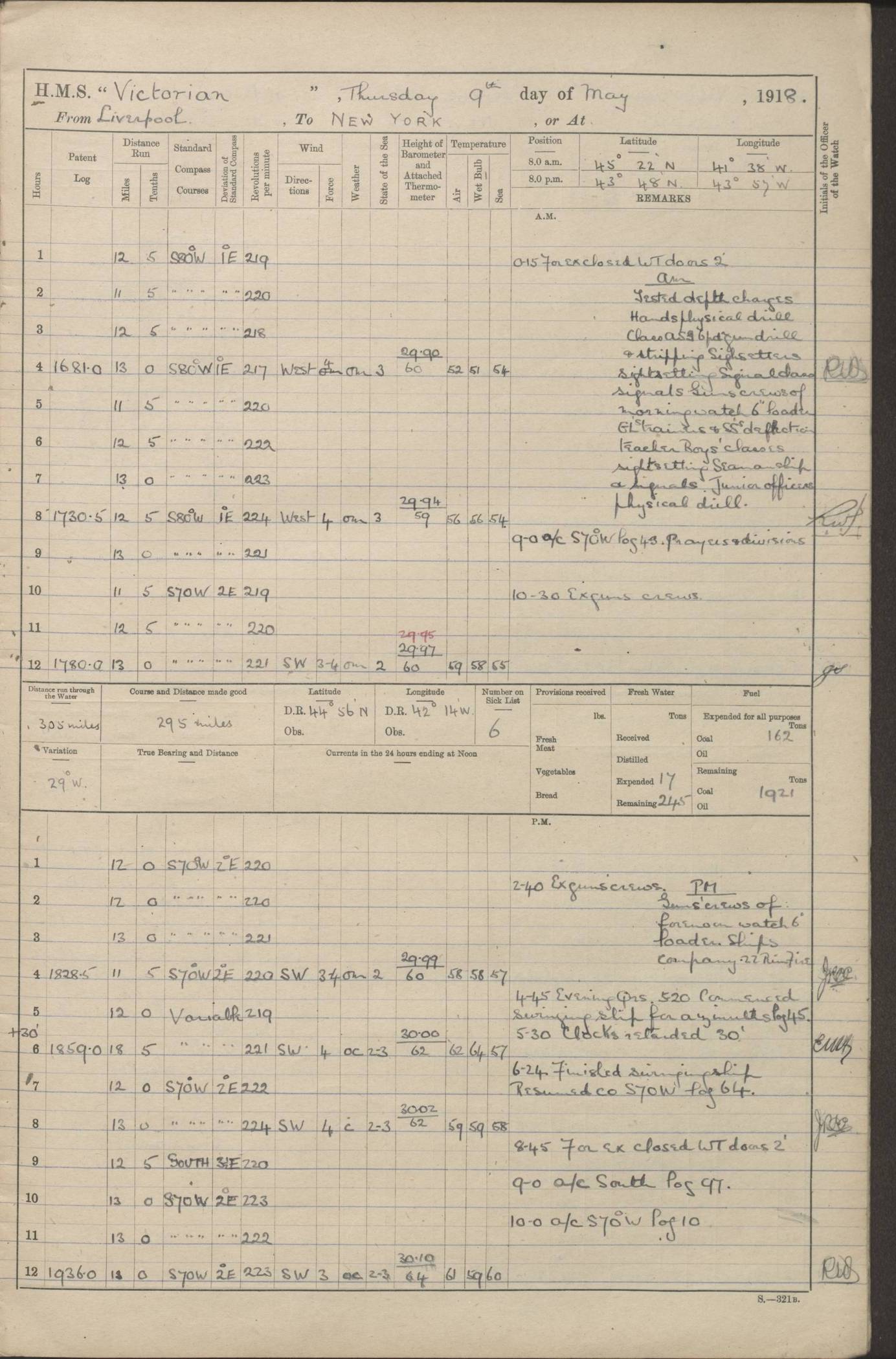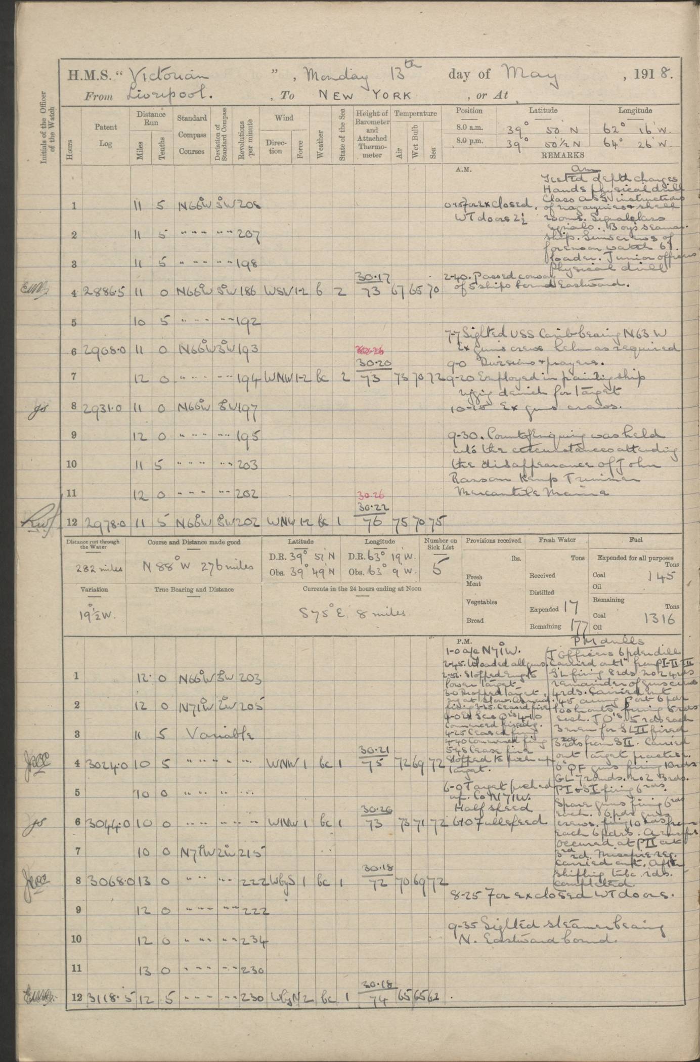 (Maps prepared using Journey Plotter, developed by Maikel. The Plots can only be approximate. They are made by joining-up positions on successive days, and sometimes positions are not given. There will therefore be occasions when the ship appears to have travelled overland) LOGS FOR AUGUST 1914 4caf8c39cadfd341970352c4: (http://oldweather.s3.amazonaws.com/ADM53-67374/ADM53-67374-001_0.jpg) 4caf8c39cadfd341970352c5: (http://oldweather.s3.amazonaws.com/ADM53-67374/ADM53-67374-001_1.jpg) 4caf8c39cadfd341970352c6: (http://oldweather.s3.amazonaws.com/ADM53-67374/ADM53-67374-002_0.jpg) 4caf8c39cadfd341970352c7: (http://oldweather.s3.amazonaws.com/ADM53-67374/ADM53-67374-002_1.jpg) 4caf8c39cadfd341970352c8: (http://oldweather.s3.amazonaws.com/ADM53-67374/ADM53-67374-003_0.jpg) 4caf8c39cadfd341970352c9: (http://oldweather.s3.amazonaws.com/ADM53-67374/ADM53-67374-003_1.jpg) 4caf8c39cadfd341970352ca: (http://oldweather.s3.amazonaws.com/ADM53-67374/ADM53-67374-004_0.jpg) 4caf8c39cadfd341970352cb: (http://oldweather.s3.amazonaws.com/ADM53-67374/ADM53-67374-004_1.jpg) 4caf8c39cadfd341970352cc: (http://oldweather.s3.amazonaws.com/ADM53-67374/ADM53-67374-005_0.jpg) 4caf8c39cadfd341970352cd: (http://oldweather.s3.amazonaws.com/ADM53-67374/ADM53-67374-005_1.jpg) Establishment of ship’s company Officers 44 Seamen 114 Boys ‒ Marines 38 Engine-room establishment 75 Other non-executive ratings 44 Total 315 BAROMETER Mercurial or aneroid: Mercurial Name of maker and number: Dobbie McInnes Height of cistern above sea: 55ft Error of mercurial barometer: .10 too low at 29.28 Thermometers for air temperature Position in ship: Fore bridge Whether in screen: Yes Maker and number: AC Cossor 3942C Date: From August 23 POSITION OF STANDARD COMPASS Top of wheel house on bridge DEVIATION OF STANDARD COMPASS Date obtained: August 23rd 1914 Position: River Mersey ARMAMENT Position: 2 guns forecastle head 2 guns forward house 2 guns after house 2 guns poop Number and nature of guns and mounting: 8 4.7” QF; P111 mountings TORPEDO ARMAMENT None BOATS Number of each carried: 8 Length and description: A lifeboats (wood) 26.2 ft Number of each carried: 4 Length and description: A lifeboats (steel) 26.0 ft MISCELLANEOUS INFORMATION Draught of water with bunkers full, and complete with provisions, stores and water: 26 ft 11 in forward; 29 ft 5 in aft Load draught: 26 ft 11 in forward; 29 ft 5 in aft Number of tons of coal carried (43 cubic feet per ton): 4541 Number of tons of oil fuel carried: None Quantity of water carried: For boilers 230; for drinking 700 THE VOYAGES OF HMS VICTORIAN 1914