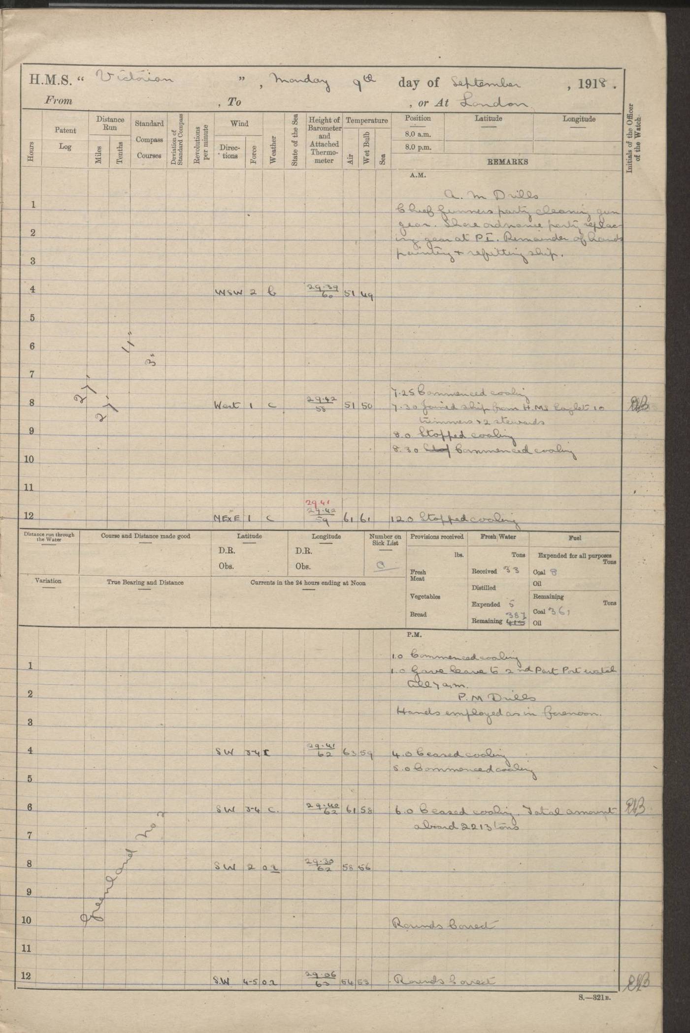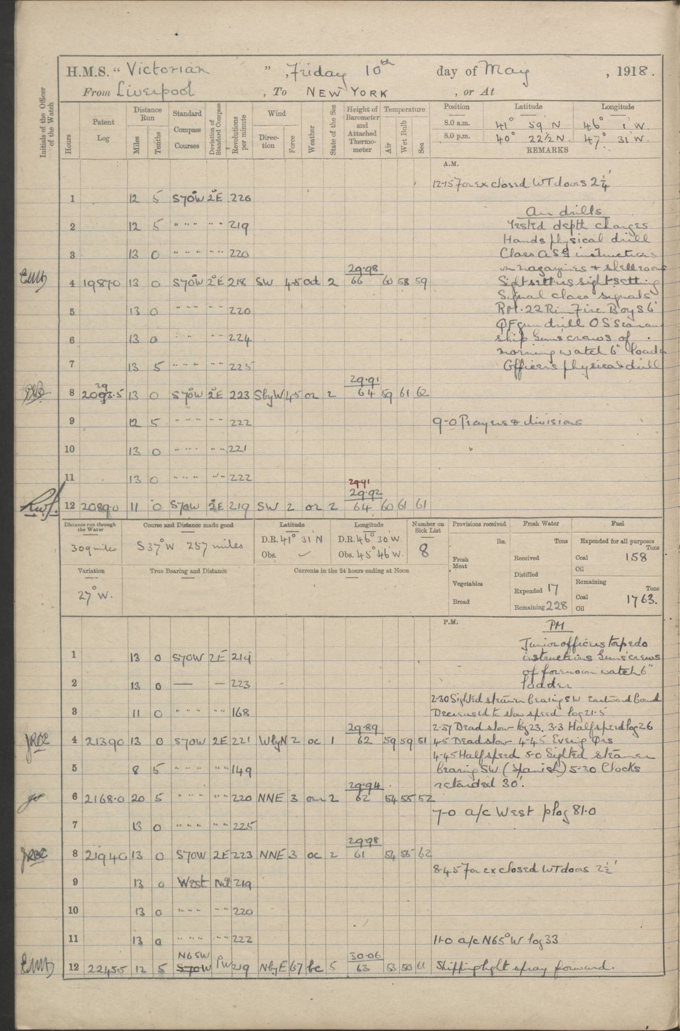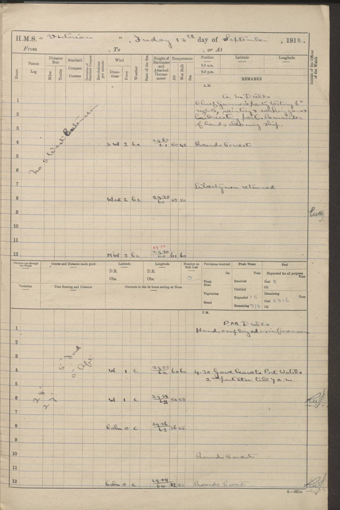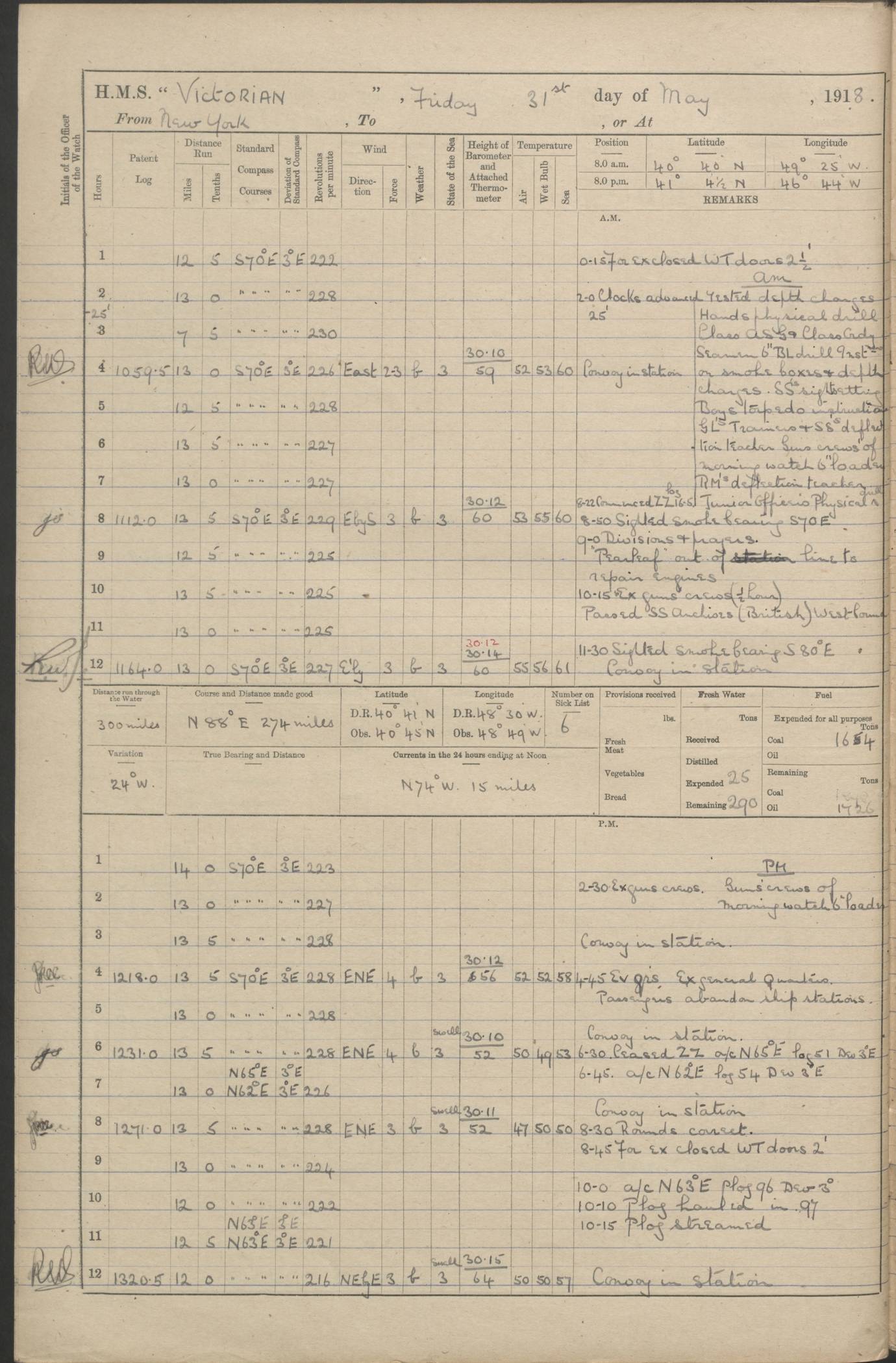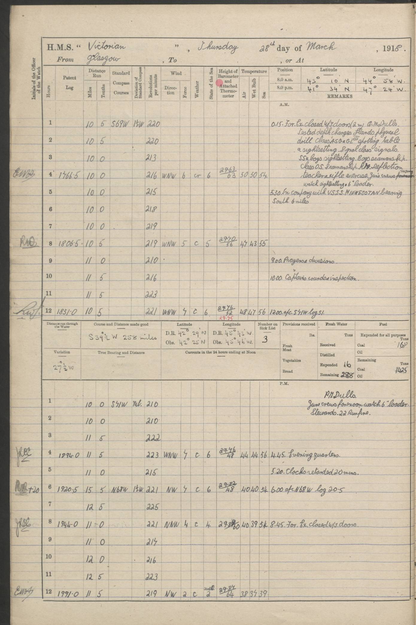 (Maps prepared using Journey Plotter, developed by Maikel. The Plots can only be approximate. They are made by joining-up positions on successive days, and sometimes positions are not given. There will therefore be occasions when the ship appears to have travelled overland) LOGS FOR AUGUST 1914 4caf8c39cadfd341970352c4: (http://oldweather.s3.amazonaws.com/ADM53-67374/ADM53-67374-001_0.jpg) 4caf8c39cadfd341970352c5: (http://oldweather.s3.amazonaws.com/ADM53-67374/ADM53-67374-001_1.jpg) 4caf8c39cadfd341970352c6: (http://oldweather.s3.amazonaws.com/ADM53-67374/ADM53-67374-002_0.jpg) 4caf8c39cadfd341970352c7: (http://oldweather.s3.amazonaws.com/ADM53-67374/ADM53-67374-002_1.jpg) 4caf8c39cadfd341970352c8: (http://oldweather.s3.amazonaws.com/ADM53-67374/ADM53-67374-003_0.jpg) 4caf8c39cadfd341970352c9: (http://oldweather.s3.amazonaws.com/ADM53-67374/ADM53-67374-003_1.jpg) 4caf8c39cadfd341970352ca: (http://oldweather.s3.amazonaws.com/ADM53-67374/ADM53-67374-004_0.jpg) 4caf8c39cadfd341970352cb: (http://oldweather.s3.amazonaws.com/ADM53-67374/ADM53-67374-004_1.jpg) 4caf8c39cadfd341970352cc: (http://oldweather.s3.amazonaws.com/ADM53-67374/ADM53-67374-005_0.jpg) 4caf8c39cadfd341970352cd: (http://oldweather.s3.amazonaws.com/ADM53-67374/ADM53-67374-005_1.jpg) Establishment of ship’s company Officers 44 Seamen 114 Boys ‒ Marines 38 Engine-room establishment 75 Other non-executive ratings 44 Total 315 BAROMETER Mercurial or aneroid: Mercurial Name of maker and number: Dobbie McInnes Height of cistern above sea: 55ft Error of mercurial barometer: .10 too low at 29.28 Thermometers for air temperature Position in ship: Fore bridge Whether in screen: Yes Maker and number: AC Cossor 3942C Date: From August 23 POSITION OF STANDARD COMPASS Top of wheel house on bridge DEVIATION OF STANDARD COMPASS Date obtained: August 23rd 1914 Position: River Mersey ARMAMENT Position: 2 guns forecastle head 2 guns forward house 2 guns after house 2 guns poop Number and nature of guns and mounting: 8 4.7” QF; P111 mountings TORPEDO ARMAMENT None BOATS Number of each carried: 8 Length and description: A lifeboats (wood) 26.2 ft Number of each carried: 4 Length and description: A lifeboats (steel) 26.0 ft MISCELLANEOUS INFORMATION Draught of water with bunkers full, and complete with provisions, stores and water: 26 ft 11 in forward; 29 ft 5 in aft Load draught: 26 ft 11 in forward; 29 ft 5 in aft Number of tons of coal carried (43 cubic feet per ton): 4541 Number of tons of oil fuel carried: None Quantity of water carried: For boilers 230; for drinking 700 THE VOYAGES OF HMS VICTORIAN 1914