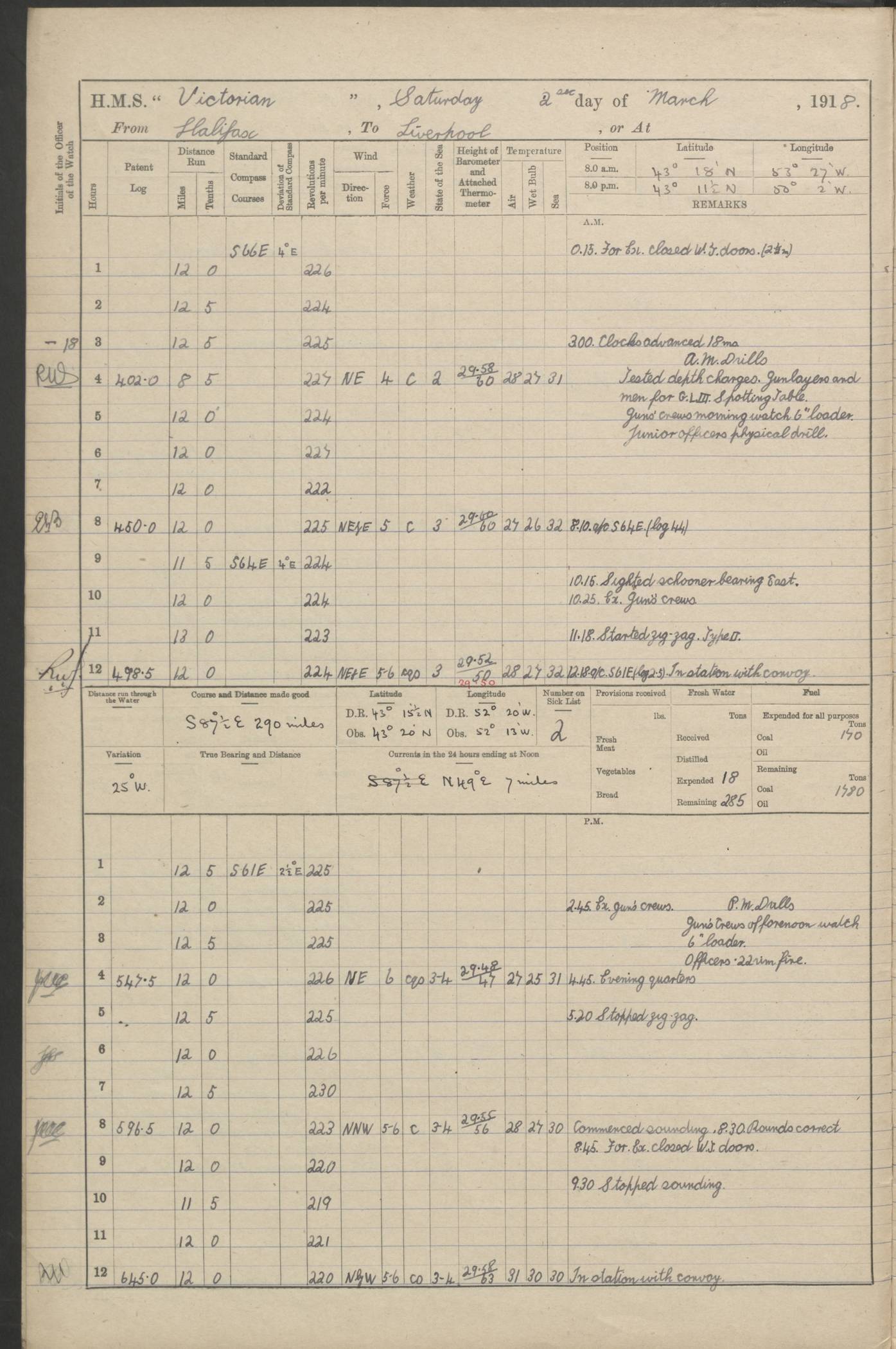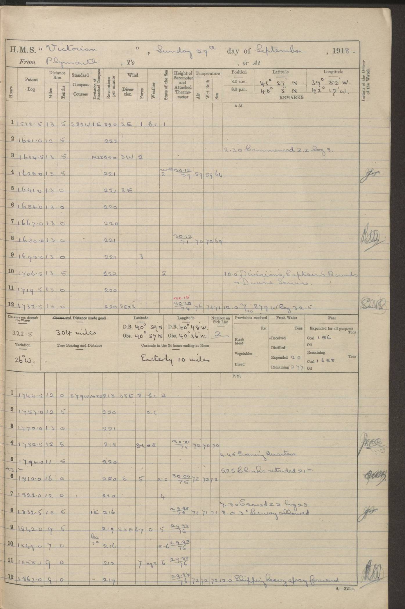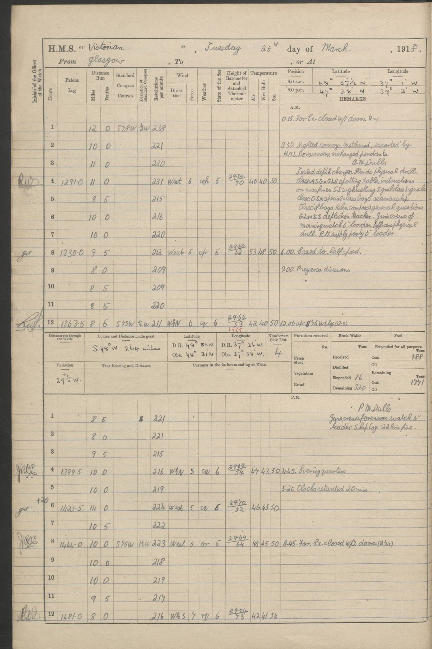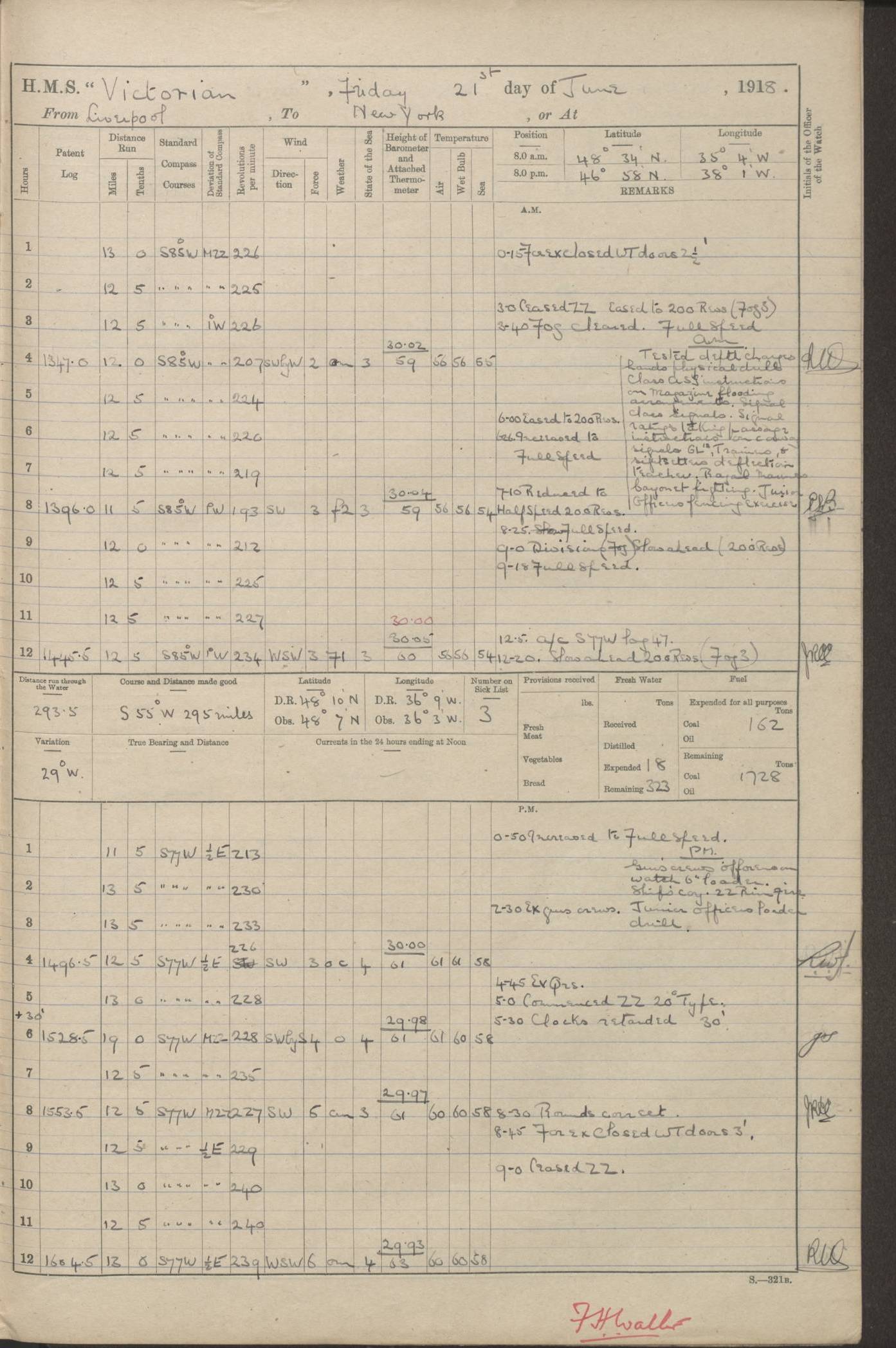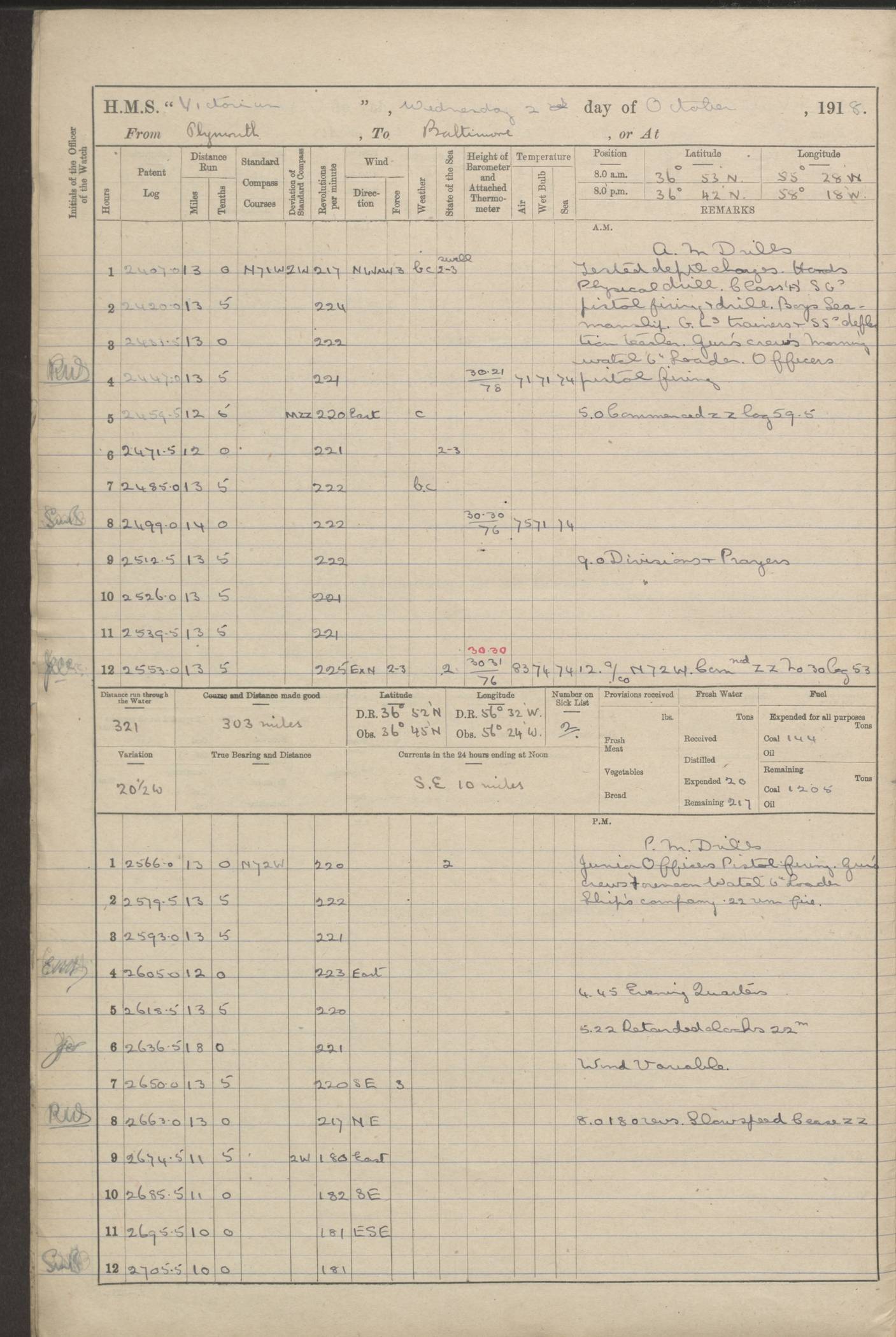 (Maps prepared using Journey Plotter, developed by Maikel. The Plots can only be approximate. They are made by joining-up positions on successive days, and sometimes positions are not given. There will therefore be occasions when the ship appears to have travelled overland) LOGS FOR AUGUST 1914 4caf8c39cadfd341970352c4: (http://oldweather.s3.amazonaws.com/ADM53-67374/ADM53-67374-001_0.jpg) 4caf8c39cadfd341970352c5: (http://oldweather.s3.amazonaws.com/ADM53-67374/ADM53-67374-001_1.jpg) 4caf8c39cadfd341970352c6: (http://oldweather.s3.amazonaws.com/ADM53-67374/ADM53-67374-002_0.jpg) 4caf8c39cadfd341970352c7: (http://oldweather.s3.amazonaws.com/ADM53-67374/ADM53-67374-002_1.jpg) 4caf8c39cadfd341970352c8: (http://oldweather.s3.amazonaws.com/ADM53-67374/ADM53-67374-003_0.jpg) 4caf8c39cadfd341970352c9: (http://oldweather.s3.amazonaws.com/ADM53-67374/ADM53-67374-003_1.jpg) 4caf8c39cadfd341970352ca: (http://oldweather.s3.amazonaws.com/ADM53-67374/ADM53-67374-004_0.jpg) 4caf8c39cadfd341970352cb: (http://oldweather.s3.amazonaws.com/ADM53-67374/ADM53-67374-004_1.jpg) 4caf8c39cadfd341970352cc: (http://oldweather.s3.amazonaws.com/ADM53-67374/ADM53-67374-005_0.jpg) 4caf8c39cadfd341970352cd: (http://oldweather.s3.amazonaws.com/ADM53-67374/ADM53-67374-005_1.jpg) Establishment of ship’s company Officers 44 Seamen 114 Boys ‒ Marines 38 Engine-room establishment 75 Other non-executive ratings 44 Total 315 BAROMETER Mercurial or aneroid: Mercurial Name of maker and number: Dobbie McInnes Height of cistern above sea: 55ft Error of mercurial barometer: .10 too low at 29.28 Thermometers for air temperature Position in ship: Fore bridge Whether in screen: Yes Maker and number: AC Cossor 3942C Date: From August 23 POSITION OF STANDARD COMPASS Top of wheel house on bridge DEVIATION OF STANDARD COMPASS Date obtained: August 23rd 1914 Position: River Mersey ARMAMENT Position: 2 guns forecastle head 2 guns forward house 2 guns after house 2 guns poop Number and nature of guns and mounting: 8 4.7” QF; P111 mountings TORPEDO ARMAMENT None BOATS Number of each carried: 8 Length and description: A lifeboats (wood) 26.2 ft Number of each carried: 4 Length and description: A lifeboats (steel) 26.0 ft MISCELLANEOUS INFORMATION Draught of water with bunkers full, and complete with provisions, stores and water: 26 ft 11 in forward; 29 ft 5 in aft Load draught: 26 ft 11 in forward; 29 ft 5 in aft Number of tons of coal carried (43 cubic feet per ton): 4541 Number of tons of oil fuel carried: None Quantity of water carried: For boilers 230; for drinking 700 THE VOYAGES OF HMS VICTORIAN 1914