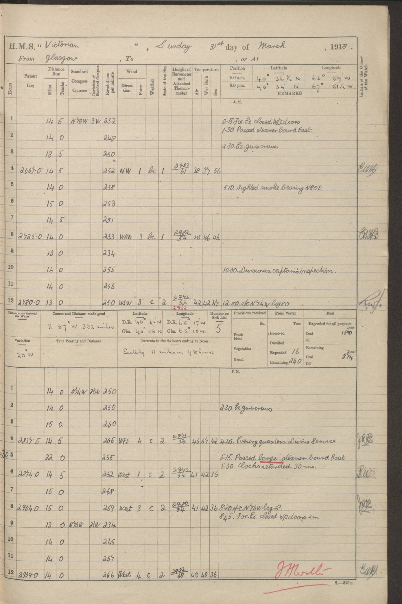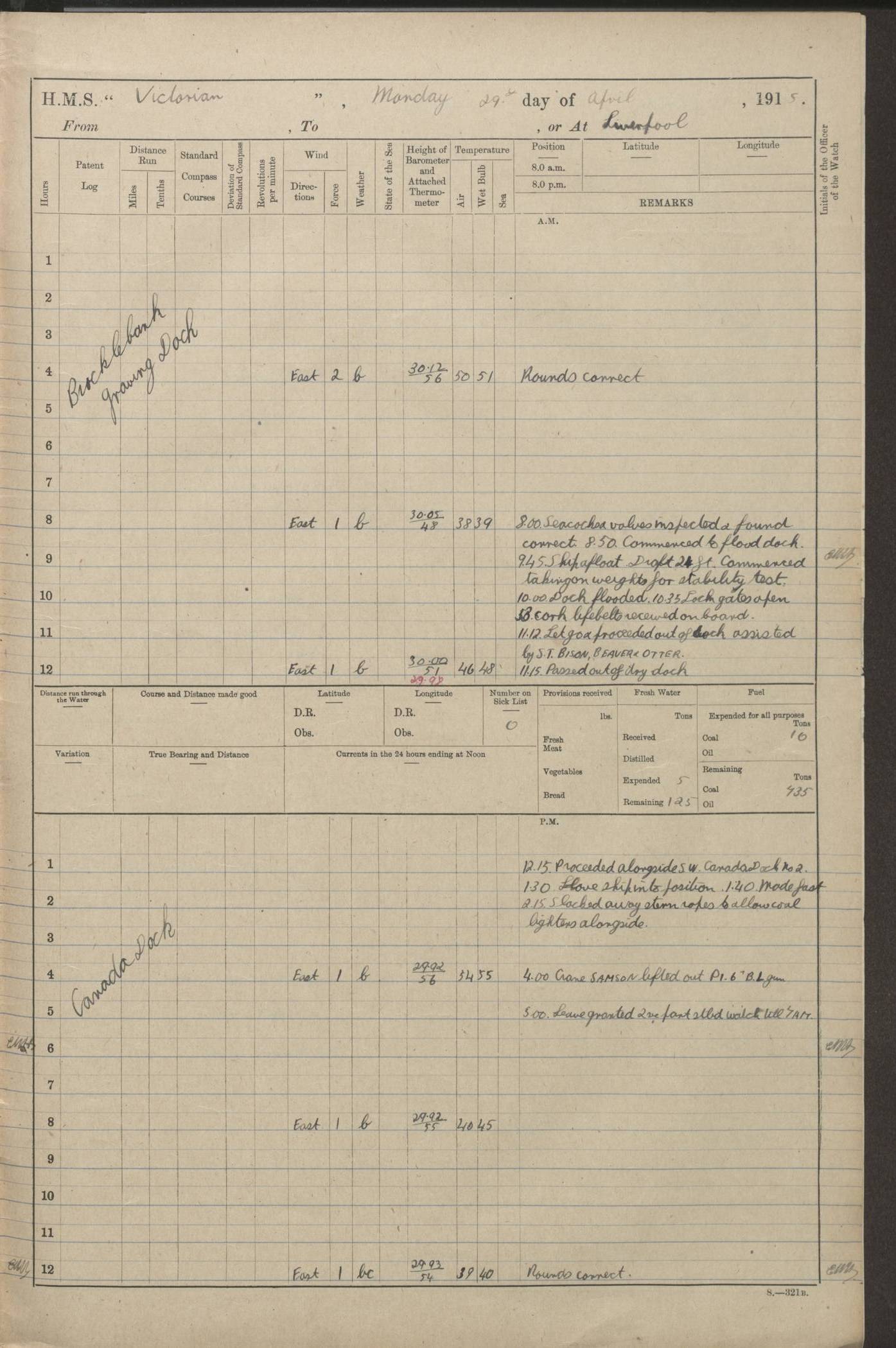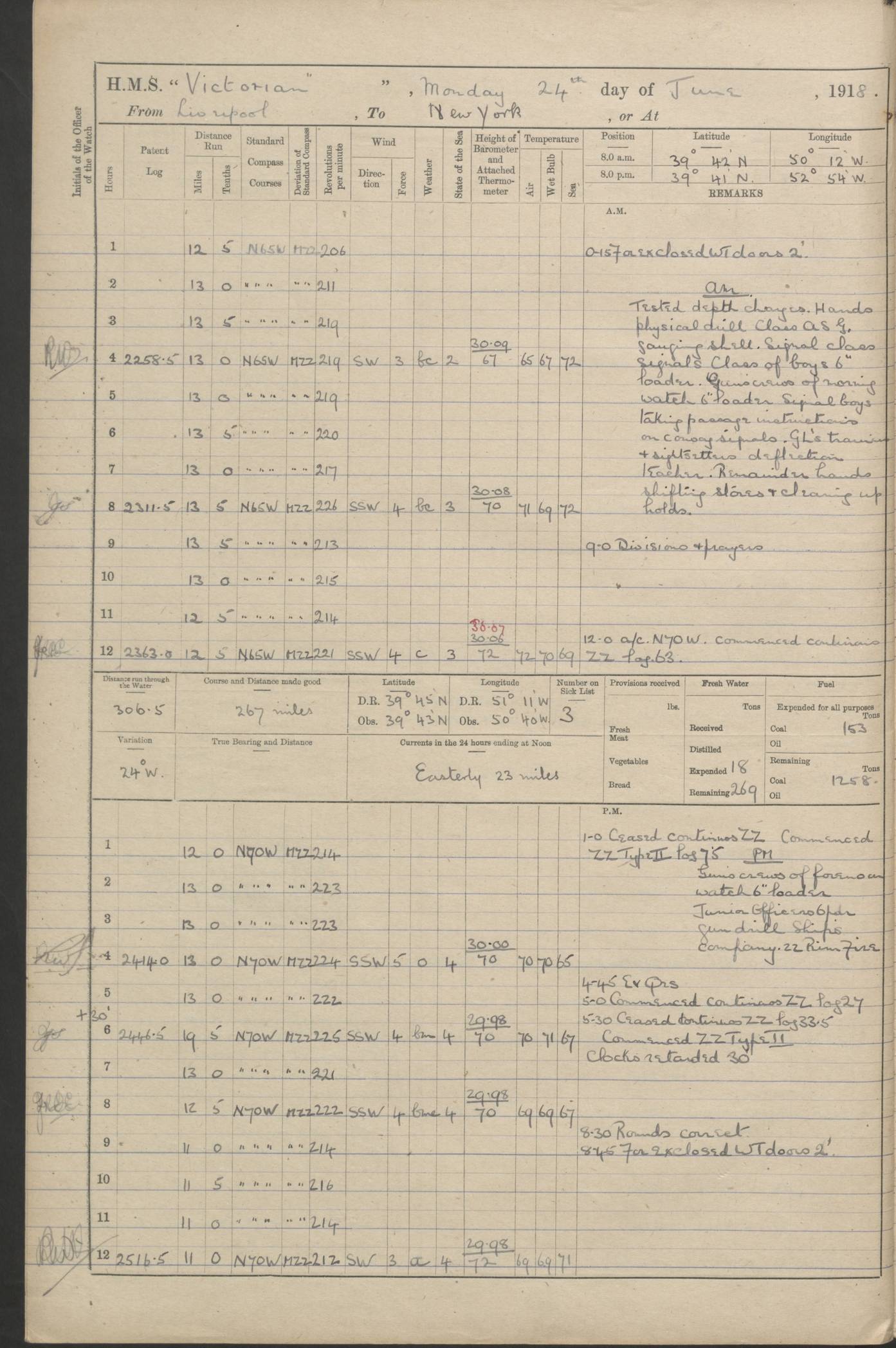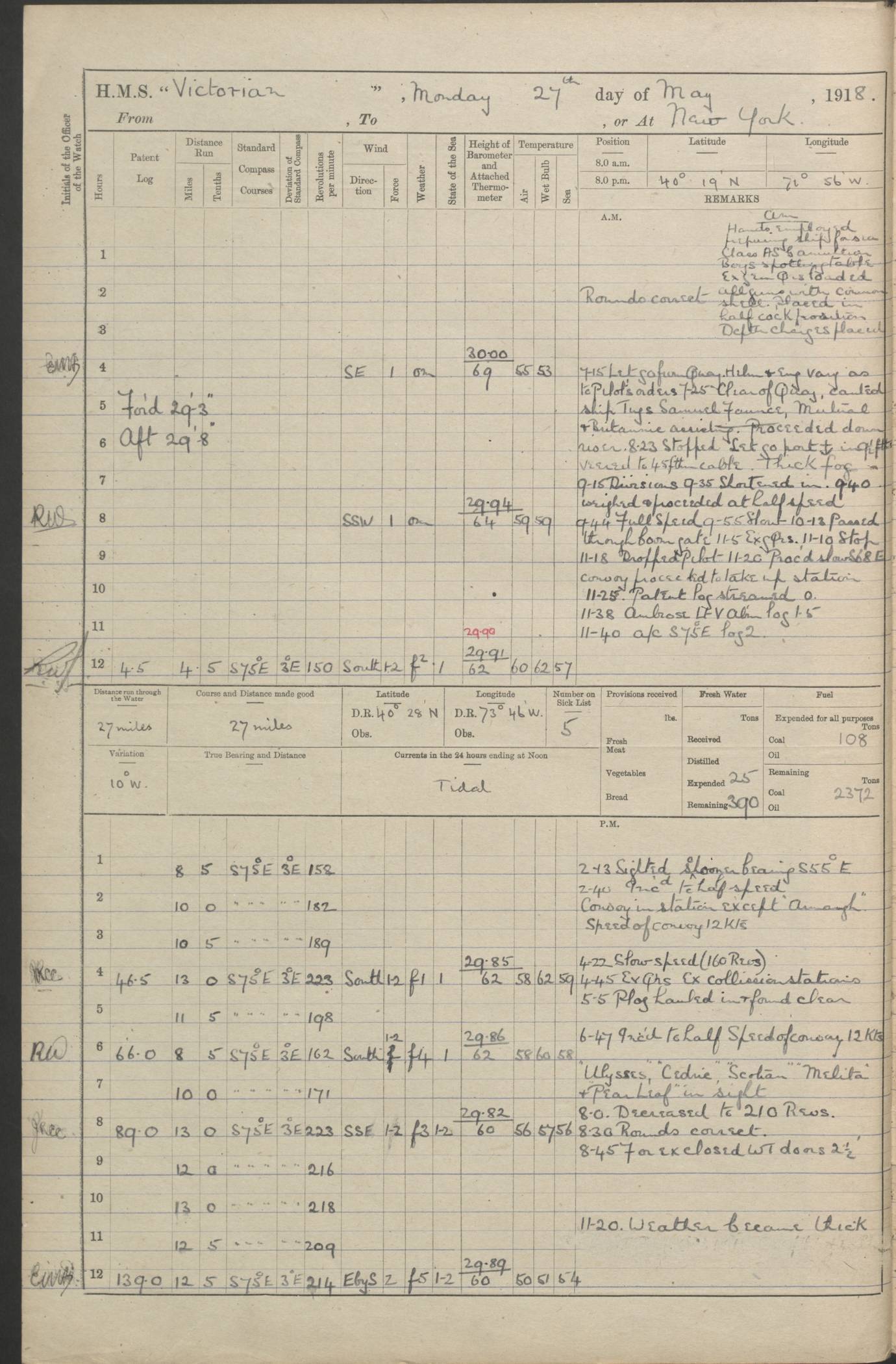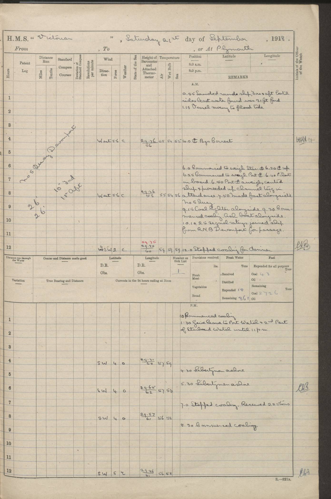 (Maps prepared using Journey Plotter, developed by Maikel. The Plots can only be approximate. They are made by joining-up positions on successive days, and sometimes positions are not given. There will therefore be occasions when the ship appears to have travelled overland) LOGS FOR AUGUST 1914 4caf8c39cadfd341970352c4: (http://oldweather.s3.amazonaws.com/ADM53-67374/ADM53-67374-001_0.jpg) 4caf8c39cadfd341970352c5: (http://oldweather.s3.amazonaws.com/ADM53-67374/ADM53-67374-001_1.jpg) 4caf8c39cadfd341970352c6: (http://oldweather.s3.amazonaws.com/ADM53-67374/ADM53-67374-002_0.jpg) 4caf8c39cadfd341970352c7: (http://oldweather.s3.amazonaws.com/ADM53-67374/ADM53-67374-002_1.jpg) 4caf8c39cadfd341970352c8: (http://oldweather.s3.amazonaws.com/ADM53-67374/ADM53-67374-003_0.jpg) 4caf8c39cadfd341970352c9: (http://oldweather.s3.amazonaws.com/ADM53-67374/ADM53-67374-003_1.jpg) 4caf8c39cadfd341970352ca: (http://oldweather.s3.amazonaws.com/ADM53-67374/ADM53-67374-004_0.jpg) 4caf8c39cadfd341970352cb: (http://oldweather.s3.amazonaws.com/ADM53-67374/ADM53-67374-004_1.jpg) 4caf8c39cadfd341970352cc: (http://oldweather.s3.amazonaws.com/ADM53-67374/ADM53-67374-005_0.jpg) 4caf8c39cadfd341970352cd: (http://oldweather.s3.amazonaws.com/ADM53-67374/ADM53-67374-005_1.jpg) Establishment of ship’s company Officers 44 Seamen 114 Boys ‒ Marines 38 Engine-room establishment 75 Other non-executive ratings 44 Total 315 BAROMETER Mercurial or aneroid: Mercurial Name of maker and number: Dobbie McInnes Height of cistern above sea: 55ft Error of mercurial barometer: .10 too low at 29.28 Thermometers for air temperature Position in ship: Fore bridge Whether in screen: Yes Maker and number: AC Cossor 3942C Date: From August 23 POSITION OF STANDARD COMPASS Top of wheel house on bridge DEVIATION OF STANDARD COMPASS Date obtained: August 23rd 1914 Position: River Mersey ARMAMENT Position: 2 guns forecastle head 2 guns forward house 2 guns after house 2 guns poop Number and nature of guns and mounting: 8 4.7” QF; P111 mountings TORPEDO ARMAMENT None BOATS Number of each carried: 8 Length and description: A lifeboats (wood) 26.2 ft Number of each carried: 4 Length and description: A lifeboats (steel) 26.0 ft MISCELLANEOUS INFORMATION Draught of water with bunkers full, and complete with provisions, stores and water: 26 ft 11 in forward; 29 ft 5 in aft Load draught: 26 ft 11 in forward; 29 ft 5 in aft Number of tons of coal carried (43 cubic feet per ton): 4541 Number of tons of oil fuel carried: None Quantity of water carried: For boilers 230; for drinking 700 THE VOYAGES OF HMS VICTORIAN 1914