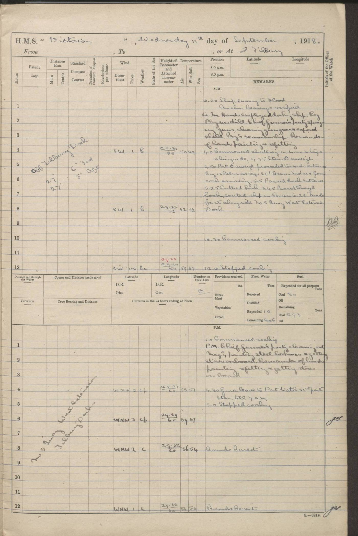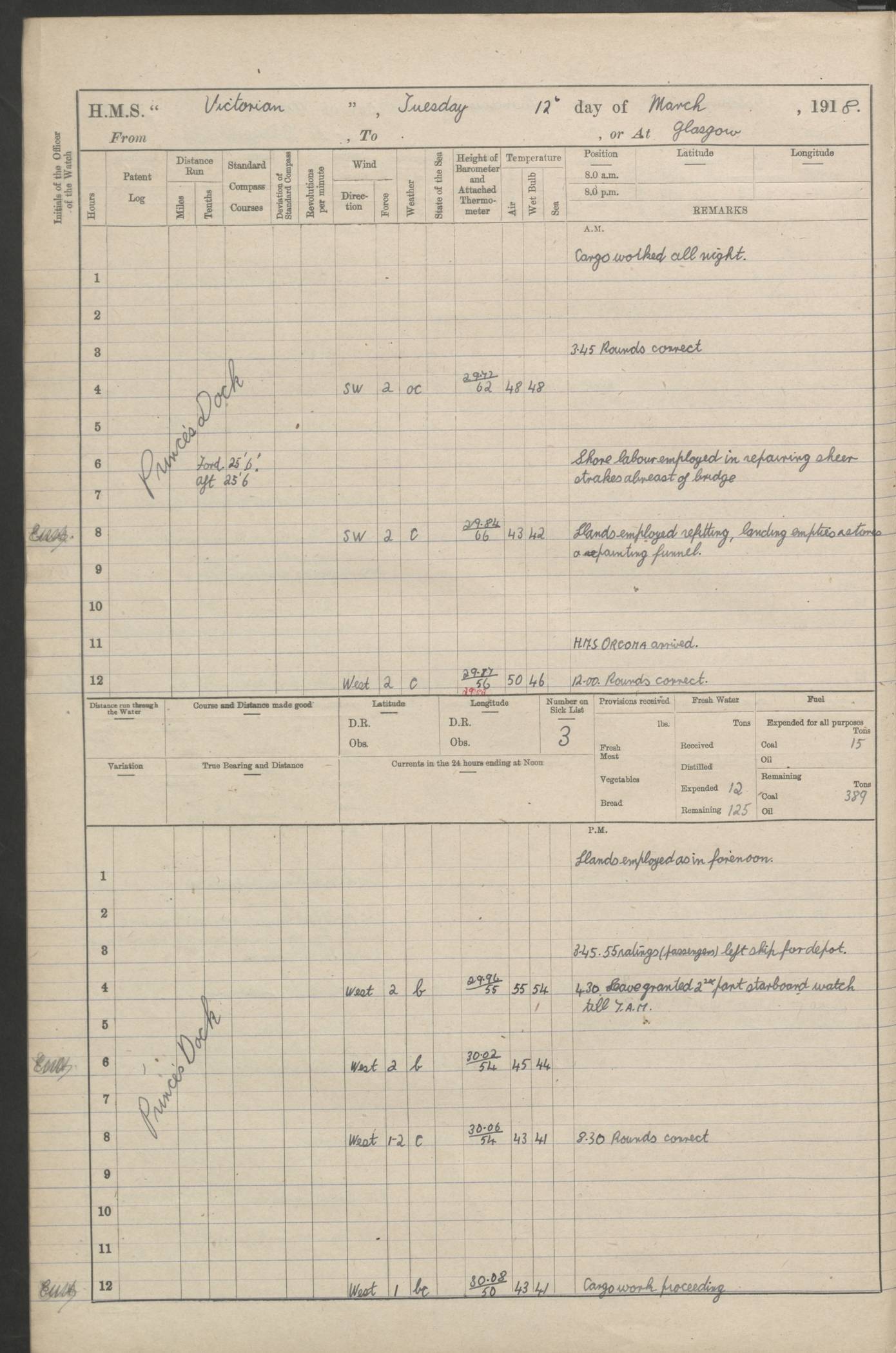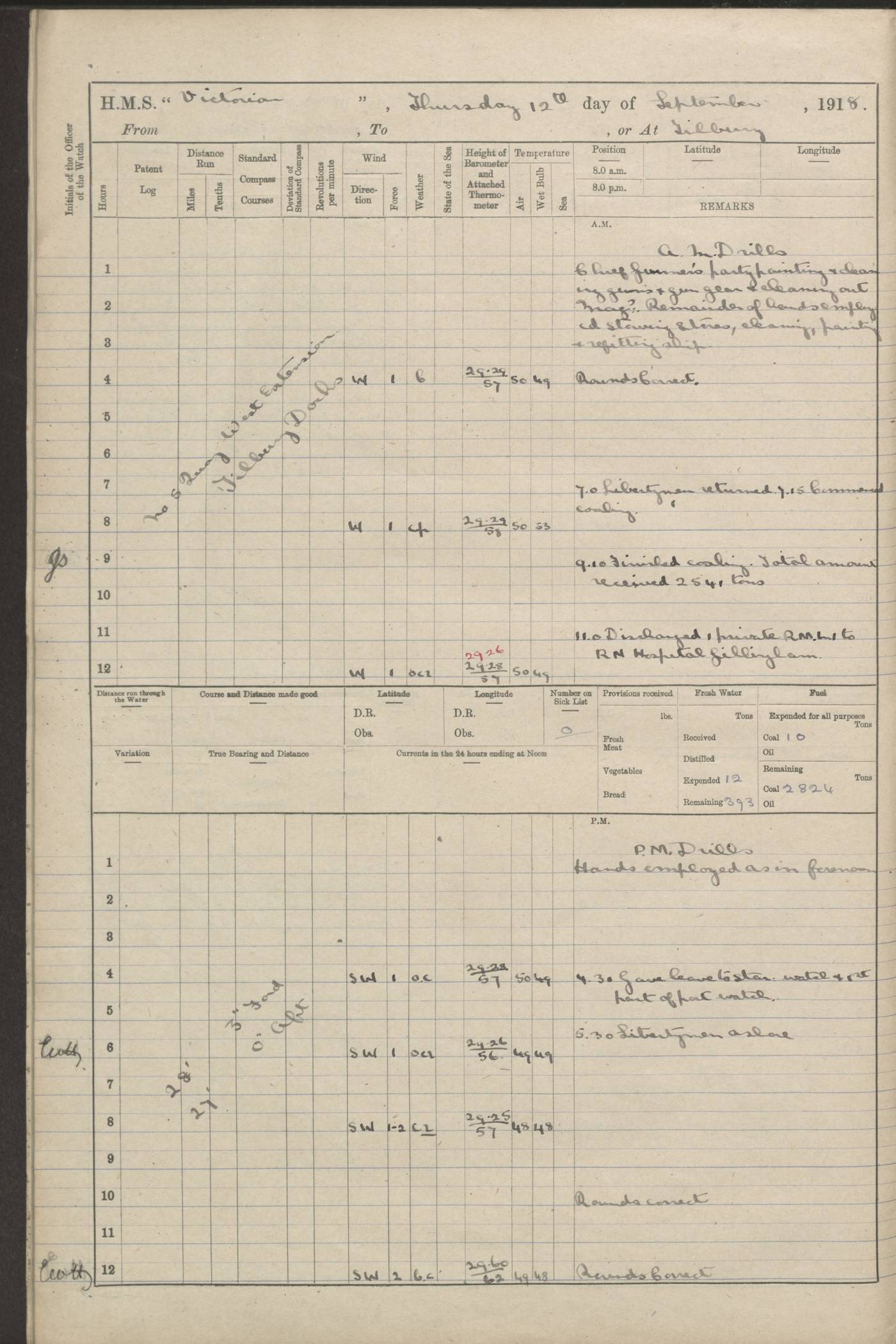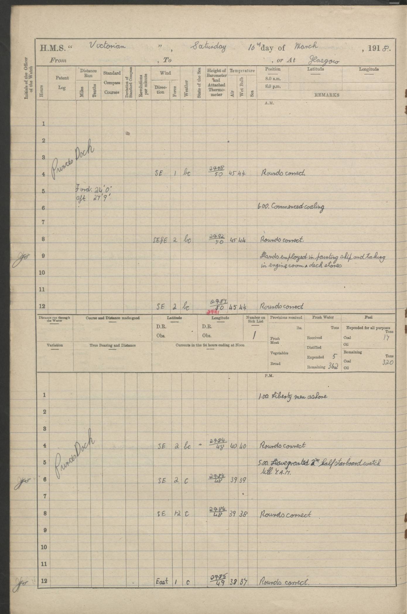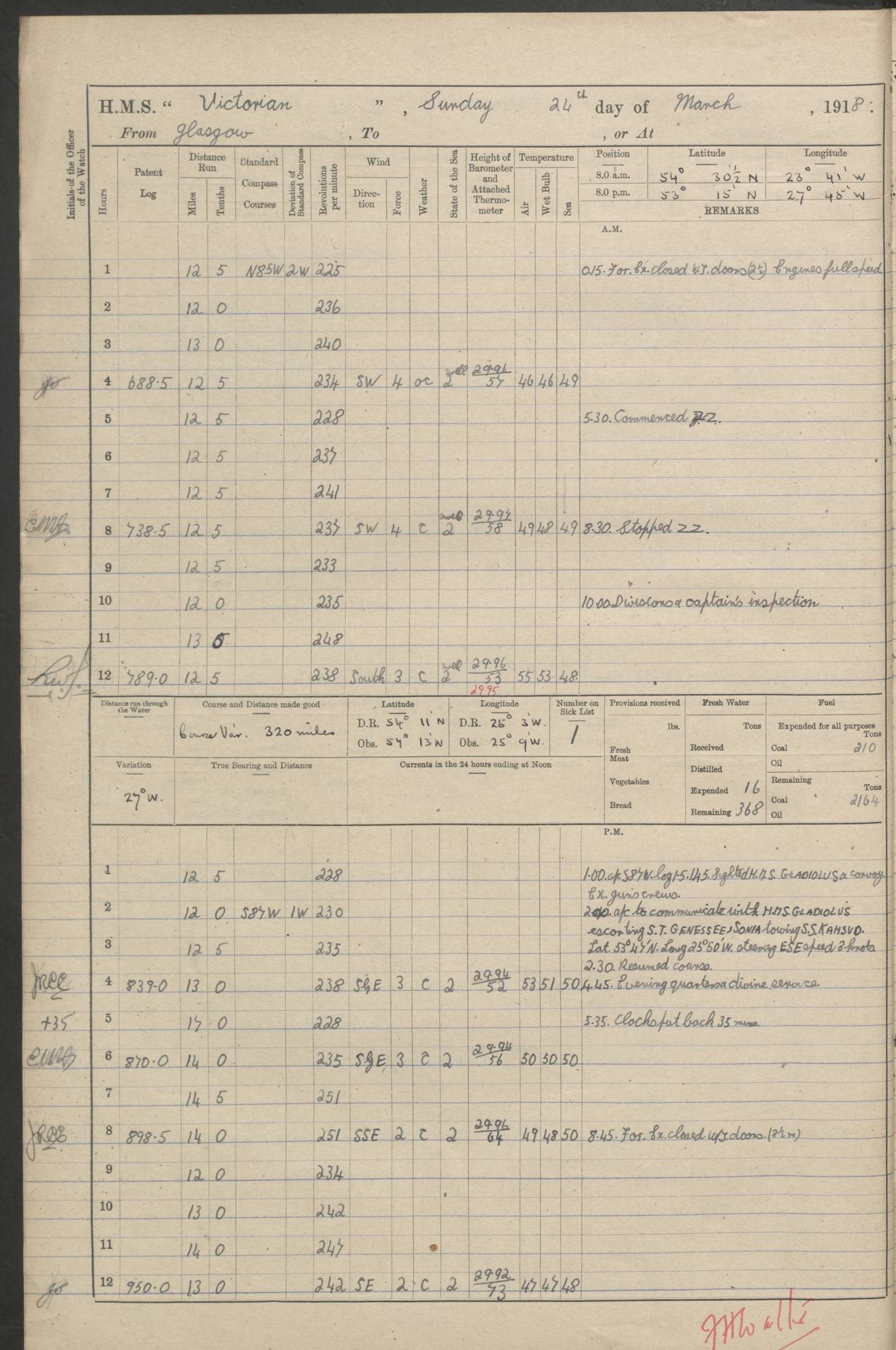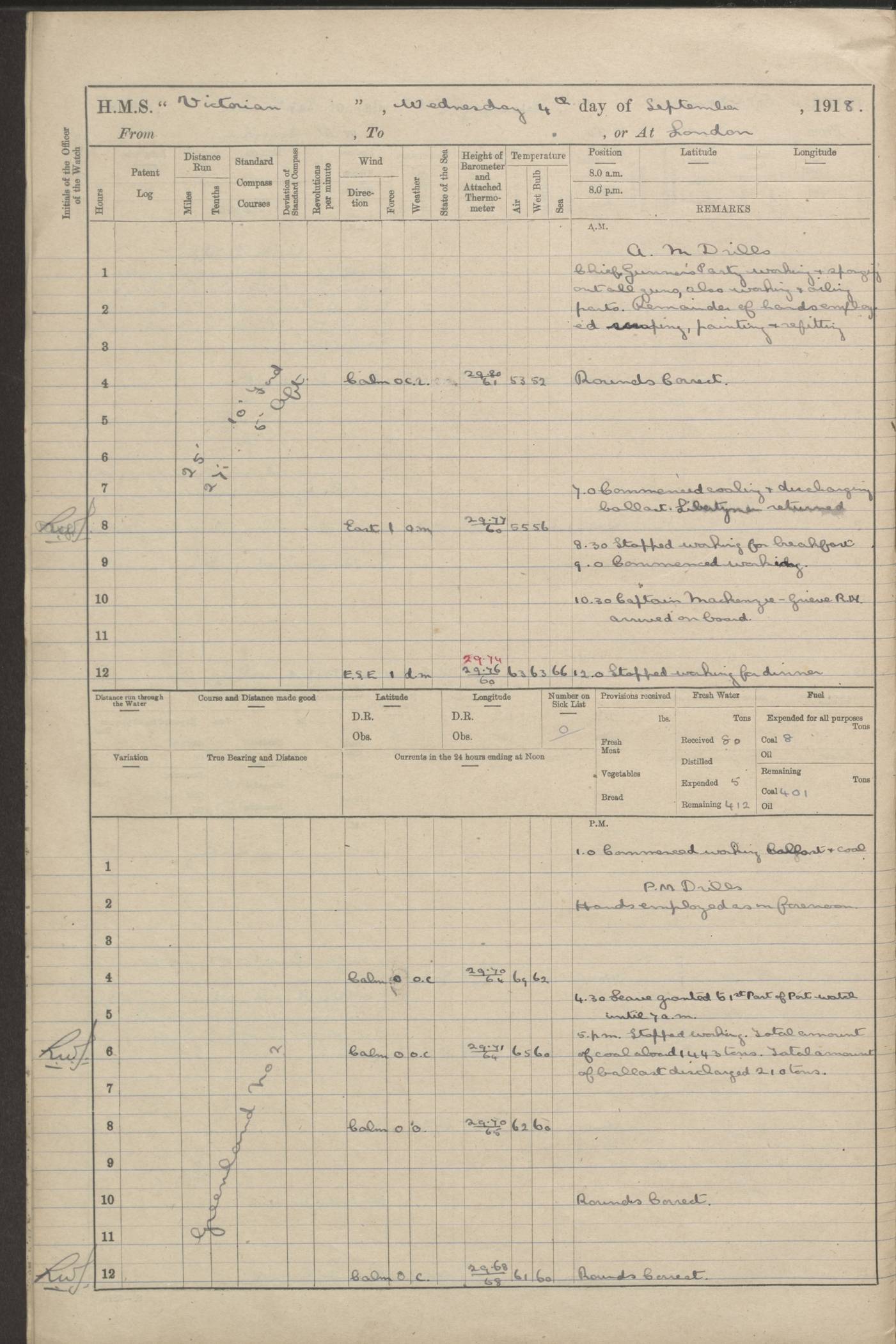 (Maps prepared using Journey Plotter, developed by Maikel. The Plots can only be approximate. They are made by joining-up positions on successive days, and sometimes positions are not given. There will therefore be occasions when the ship appears to have travelled overland) LOGS FOR AUGUST 1914 4caf8c39cadfd341970352c4: (http://oldweather.s3.amazonaws.com/ADM53-67374/ADM53-67374-001_0.jpg) 4caf8c39cadfd341970352c5: (http://oldweather.s3.amazonaws.com/ADM53-67374/ADM53-67374-001_1.jpg) 4caf8c39cadfd341970352c6: (http://oldweather.s3.amazonaws.com/ADM53-67374/ADM53-67374-002_0.jpg) 4caf8c39cadfd341970352c7: (http://oldweather.s3.amazonaws.com/ADM53-67374/ADM53-67374-002_1.jpg) 4caf8c39cadfd341970352c8: (http://oldweather.s3.amazonaws.com/ADM53-67374/ADM53-67374-003_0.jpg) 4caf8c39cadfd341970352c9: (http://oldweather.s3.amazonaws.com/ADM53-67374/ADM53-67374-003_1.jpg) 4caf8c39cadfd341970352ca: (http://oldweather.s3.amazonaws.com/ADM53-67374/ADM53-67374-004_0.jpg) 4caf8c39cadfd341970352cb: (http://oldweather.s3.amazonaws.com/ADM53-67374/ADM53-67374-004_1.jpg) 4caf8c39cadfd341970352cc: (http://oldweather.s3.amazonaws.com/ADM53-67374/ADM53-67374-005_0.jpg) 4caf8c39cadfd341970352cd: (http://oldweather.s3.amazonaws.com/ADM53-67374/ADM53-67374-005_1.jpg) Establishment of ship’s company Officers 44 Seamen 114 Boys ‒ Marines 38 Engine-room establishment 75 Other non-executive ratings 44 Total 315 BAROMETER Mercurial or aneroid: Mercurial Name of maker and number: Dobbie McInnes Height of cistern above sea: 55ft Error of mercurial barometer: .10 too low at 29.28 Thermometers for air temperature Position in ship: Fore bridge Whether in screen: Yes Maker and number: AC Cossor 3942C Date: From August 23 POSITION OF STANDARD COMPASS Top of wheel house on bridge DEVIATION OF STANDARD COMPASS Date obtained: August 23rd 1914 Position: River Mersey ARMAMENT Position: 2 guns forecastle head 2 guns forward house 2 guns after house 2 guns poop Number and nature of guns and mounting: 8 4.7” QF; P111 mountings TORPEDO ARMAMENT None BOATS Number of each carried: 8 Length and description: A lifeboats (wood) 26.2 ft Number of each carried: 4 Length and description: A lifeboats (steel) 26.0 ft MISCELLANEOUS INFORMATION Draught of water with bunkers full, and complete with provisions, stores and water: 26 ft 11 in forward; 29 ft 5 in aft Load draught: 26 ft 11 in forward; 29 ft 5 in aft Number of tons of coal carried (43 cubic feet per ton): 4541 Number of tons of oil fuel carried: None Quantity of water carried: For boilers 230; for drinking 700 THE VOYAGES OF HMS VICTORIAN 1914