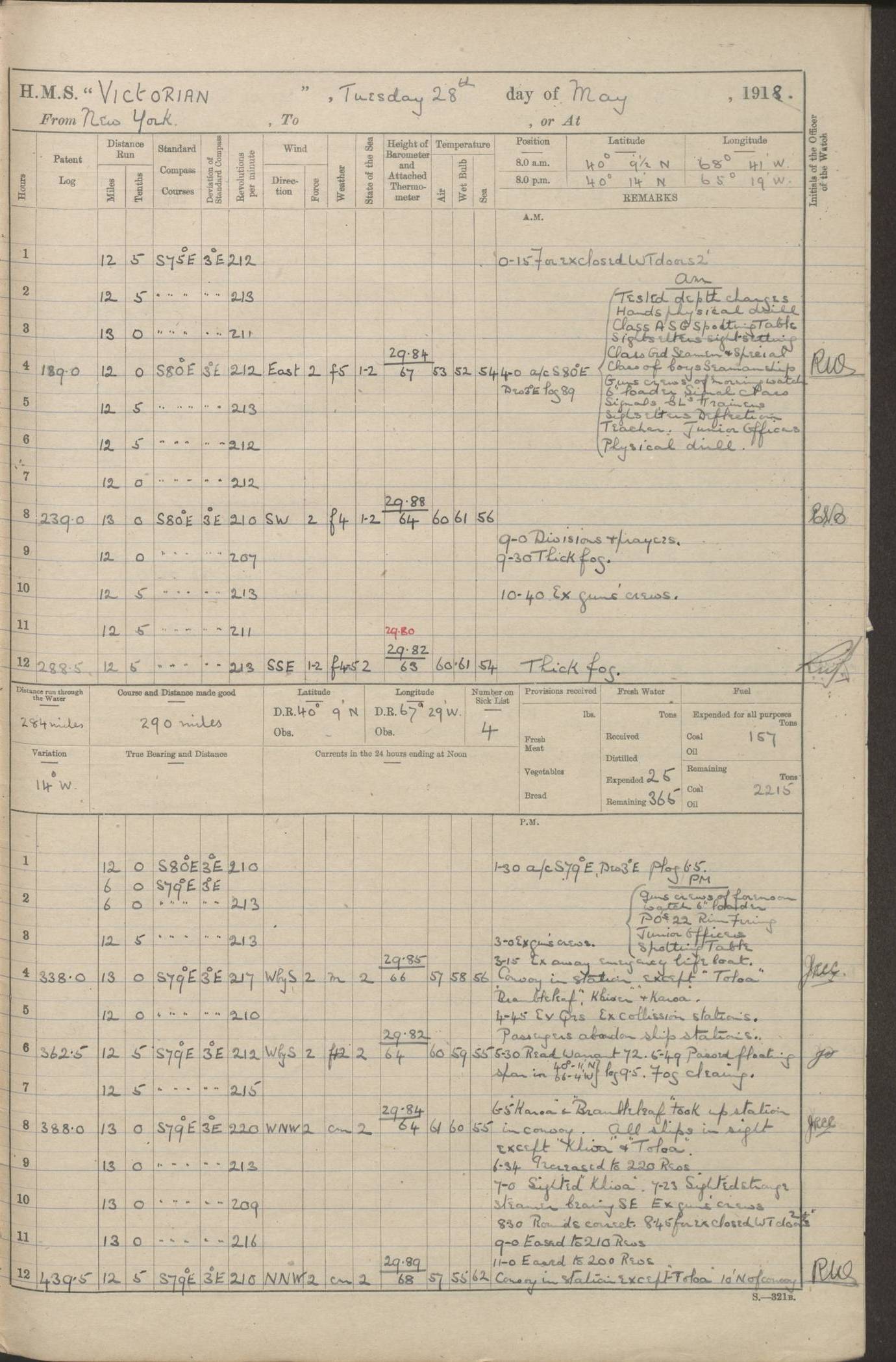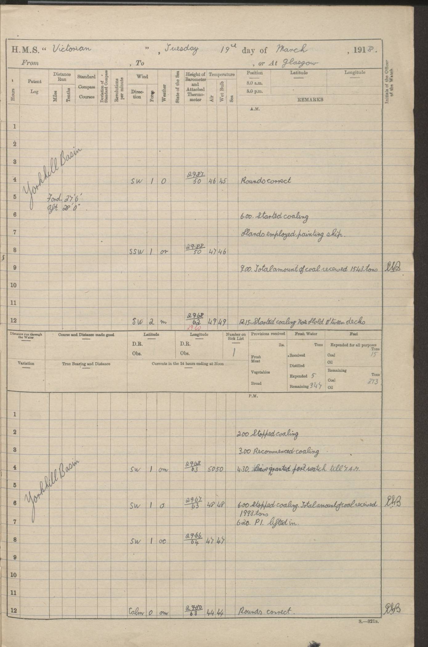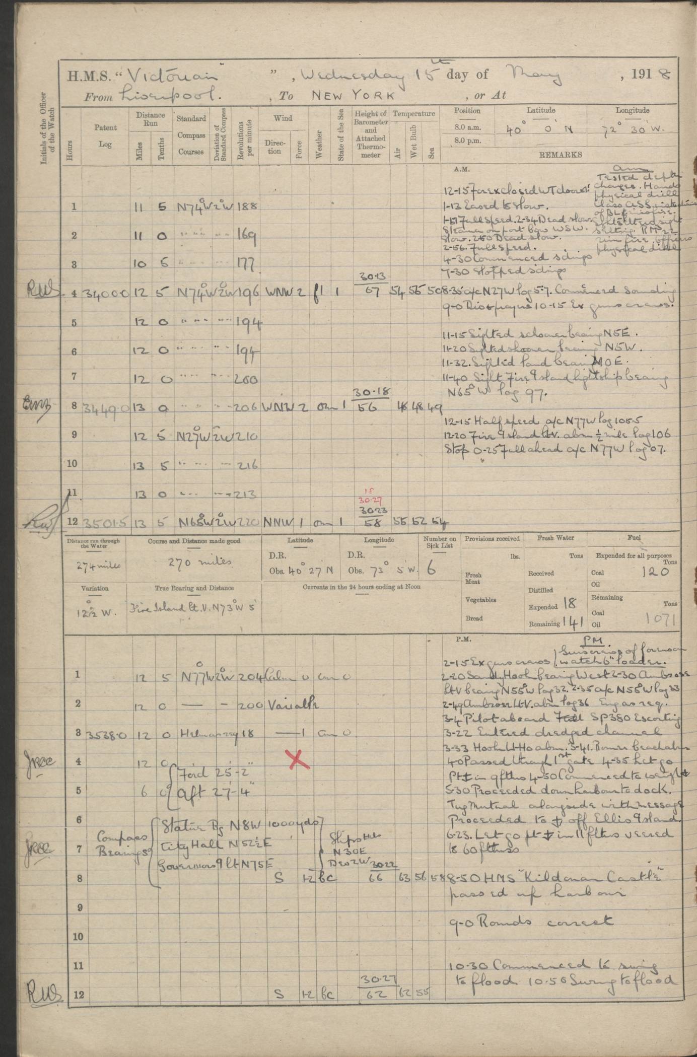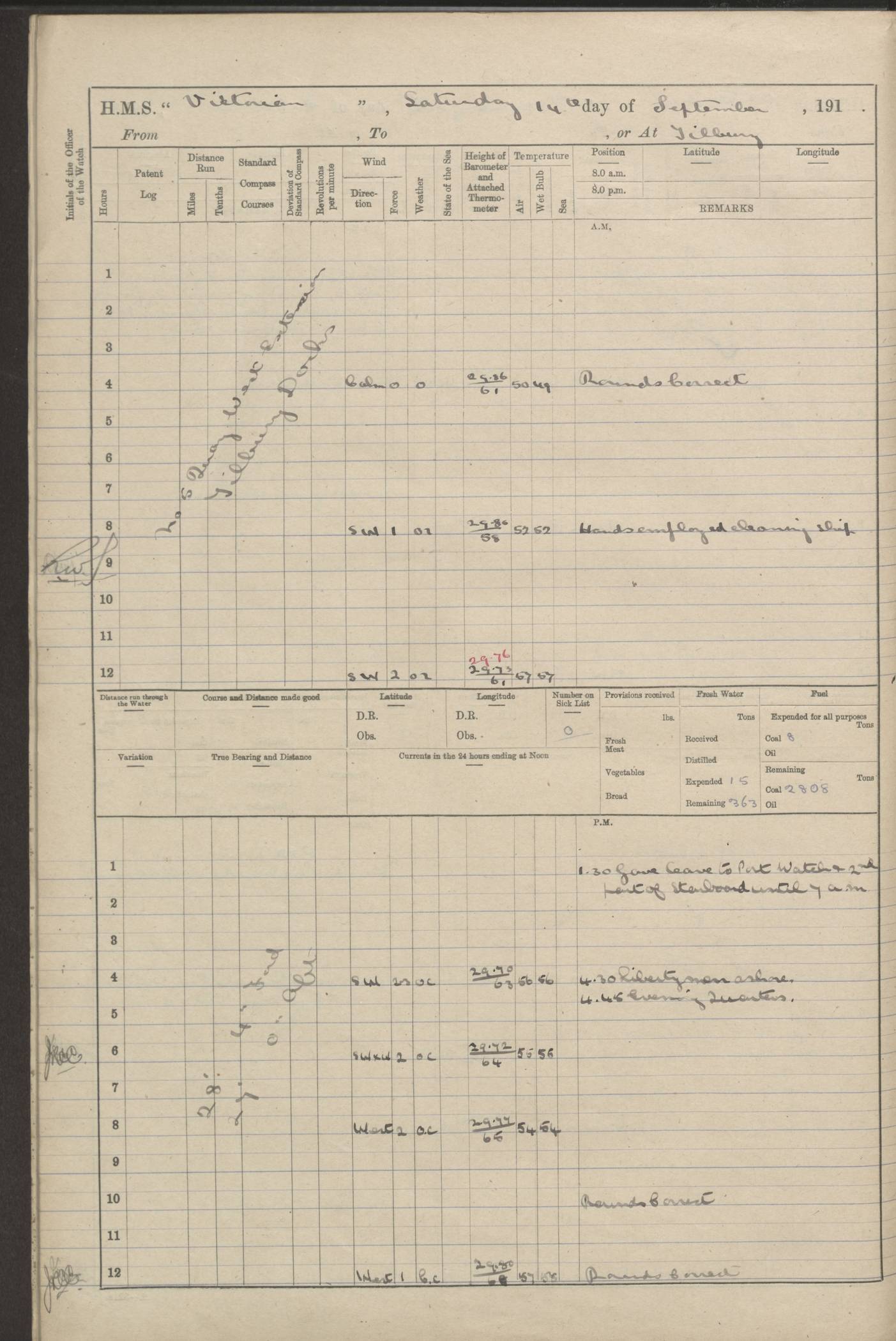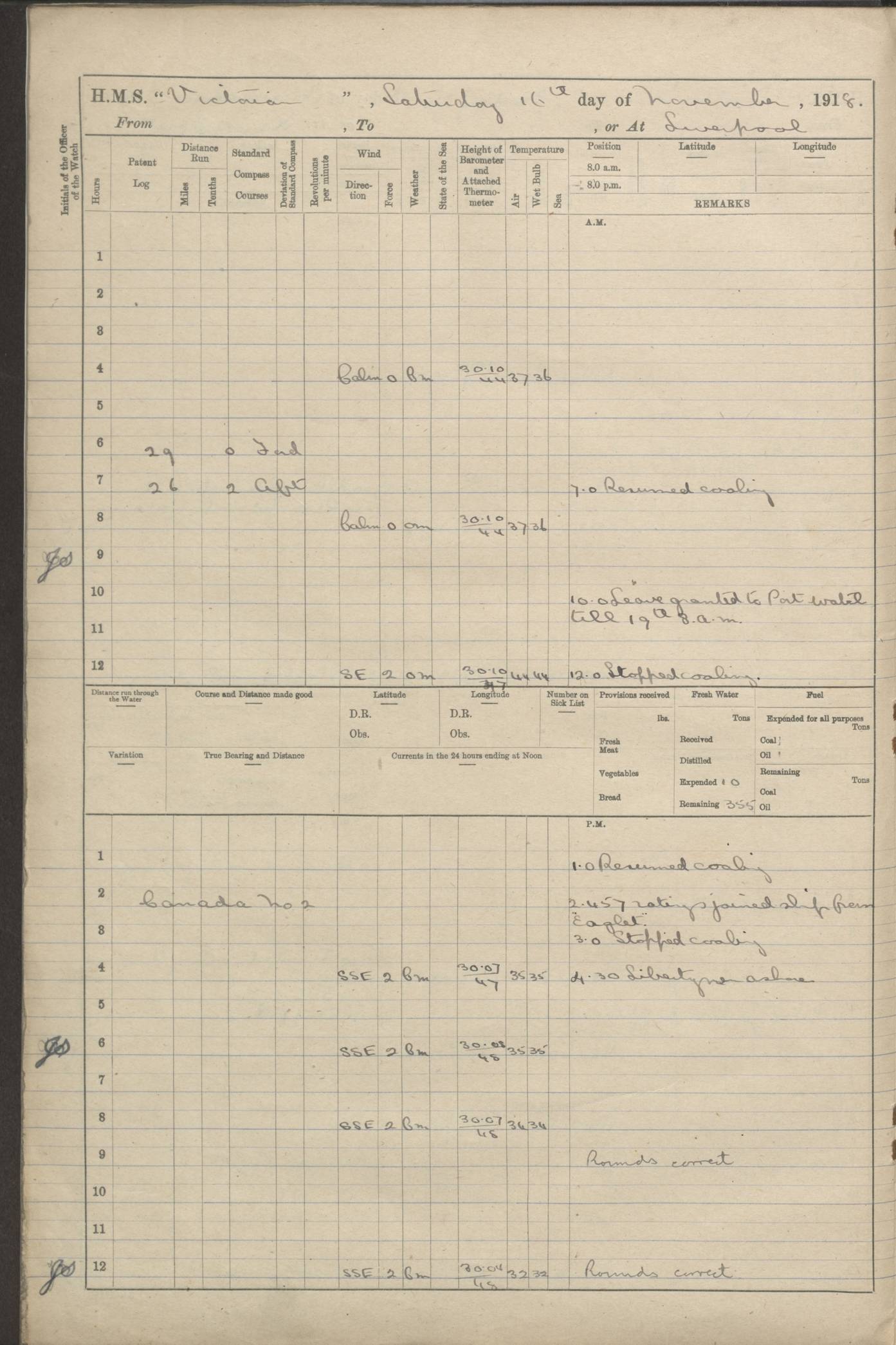 (Maps prepared using Journey Plotter, developed by Maikel. The Plots can only be approximate. They are made by joining-up positions on successive days, and sometimes positions are not given. There will therefore be occasions when the ship appears to have travelled overland) LOGS FOR AUGUST 1914 4caf8c39cadfd341970352c4: (http://oldweather.s3.amazonaws.com/ADM53-67374/ADM53-67374-001_0.jpg) 4caf8c39cadfd341970352c5: (http://oldweather.s3.amazonaws.com/ADM53-67374/ADM53-67374-001_1.jpg) 4caf8c39cadfd341970352c6: (http://oldweather.s3.amazonaws.com/ADM53-67374/ADM53-67374-002_0.jpg) 4caf8c39cadfd341970352c7: (http://oldweather.s3.amazonaws.com/ADM53-67374/ADM53-67374-002_1.jpg) 4caf8c39cadfd341970352c8: (http://oldweather.s3.amazonaws.com/ADM53-67374/ADM53-67374-003_0.jpg) 4caf8c39cadfd341970352c9: (http://oldweather.s3.amazonaws.com/ADM53-67374/ADM53-67374-003_1.jpg) 4caf8c39cadfd341970352ca: (http://oldweather.s3.amazonaws.com/ADM53-67374/ADM53-67374-004_0.jpg) 4caf8c39cadfd341970352cb: (http://oldweather.s3.amazonaws.com/ADM53-67374/ADM53-67374-004_1.jpg) 4caf8c39cadfd341970352cc: (http://oldweather.s3.amazonaws.com/ADM53-67374/ADM53-67374-005_0.jpg) 4caf8c39cadfd341970352cd: (http://oldweather.s3.amazonaws.com/ADM53-67374/ADM53-67374-005_1.jpg) Establishment of ship’s company Officers 44 Seamen 114 Boys ‒ Marines 38 Engine-room establishment 75 Other non-executive ratings 44 Total 315 BAROMETER Mercurial or aneroid: Mercurial Name of maker and number: Dobbie McInnes Height of cistern above sea: 55ft Error of mercurial barometer: .10 too low at 29.28 Thermometers for air temperature Position in ship: Fore bridge Whether in screen: Yes Maker and number: AC Cossor 3942C Date: From August 23 POSITION OF STANDARD COMPASS Top of wheel house on bridge DEVIATION OF STANDARD COMPASS Date obtained: August 23rd 1914 Position: River Mersey ARMAMENT Position: 2 guns forecastle head 2 guns forward house 2 guns after house 2 guns poop Number and nature of guns and mounting: 8 4.7” QF; P111 mountings TORPEDO ARMAMENT None BOATS Number of each carried: 8 Length and description: A lifeboats (wood) 26.2 ft Number of each carried: 4 Length and description: A lifeboats (steel) 26.0 ft MISCELLANEOUS INFORMATION Draught of water with bunkers full, and complete with provisions, stores and water: 26 ft 11 in forward; 29 ft 5 in aft Load draught: 26 ft 11 in forward; 29 ft 5 in aft Number of tons of coal carried (43 cubic feet per ton): 4541 Number of tons of oil fuel carried: None Quantity of water carried: For boilers 230; for drinking 700 THE VOYAGES OF HMS VICTORIAN 1914