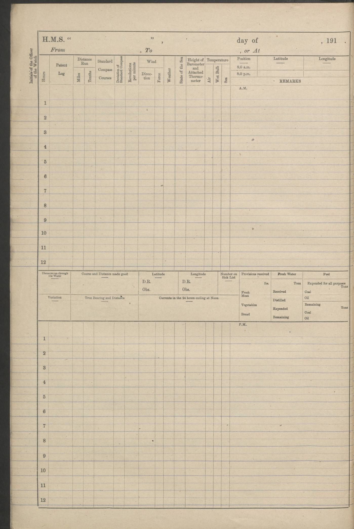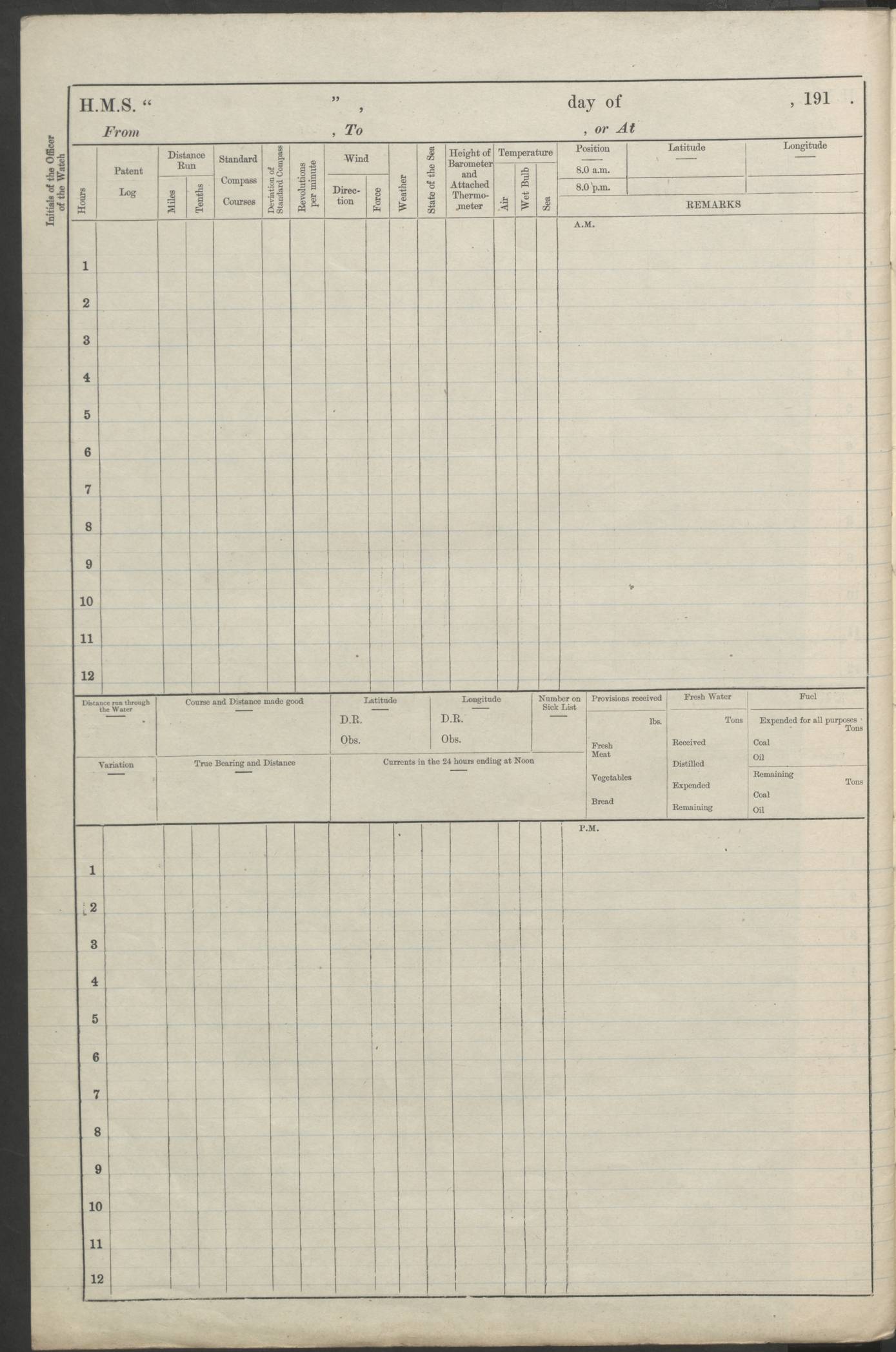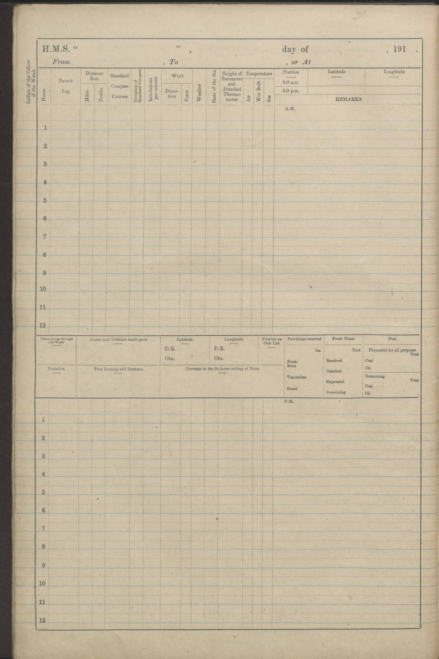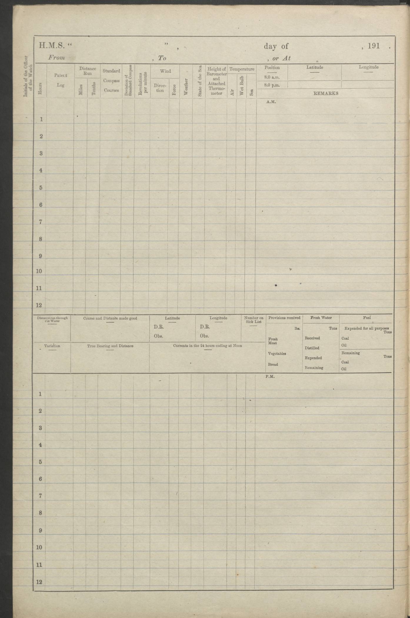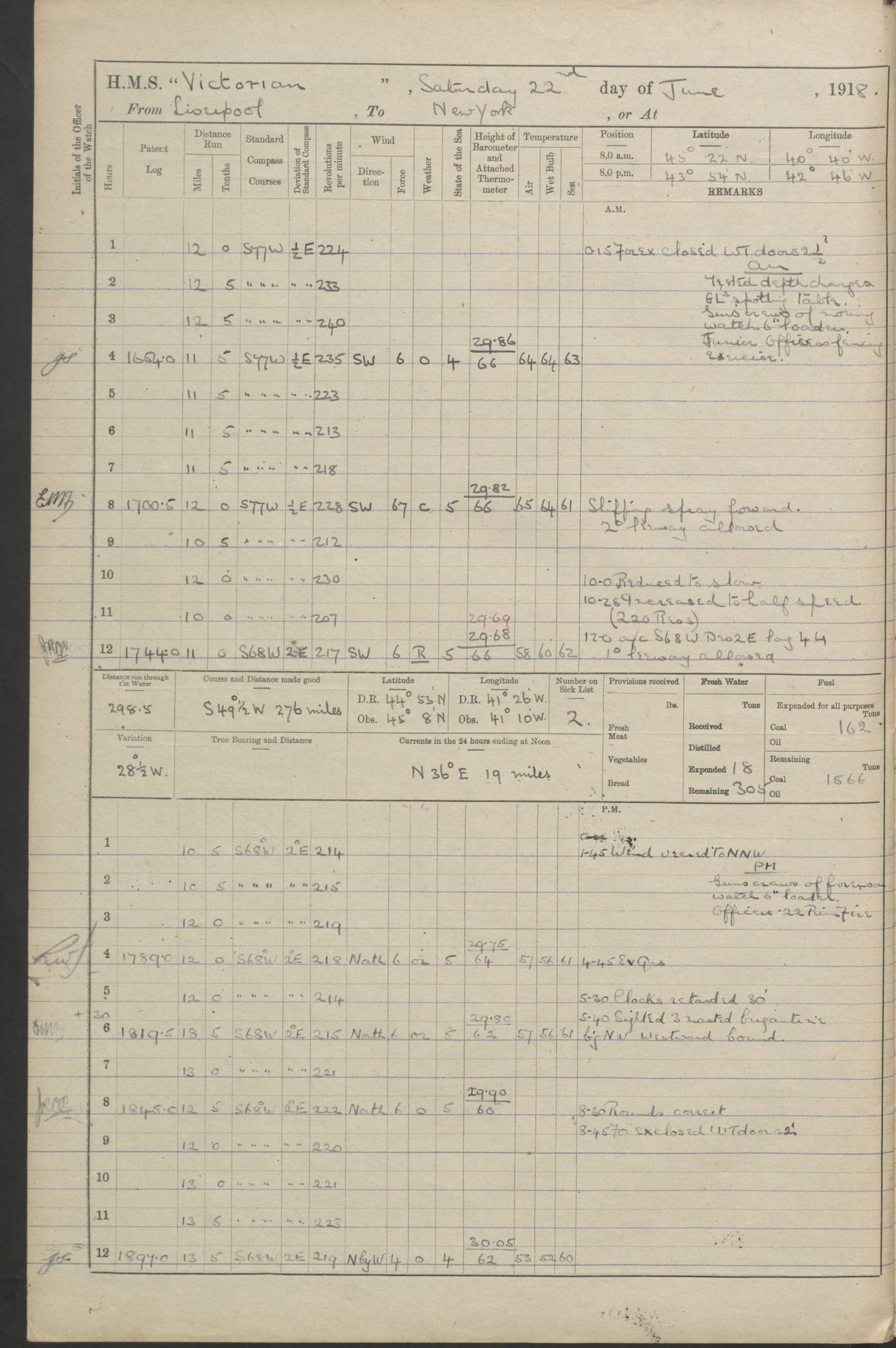 (Maps prepared using Journey Plotter, developed by Maikel. The Plots can only be approximate. They are made by joining-up positions on successive days, and sometimes positions are not given. There will therefore be occasions when the ship appears to have travelled overland) LOGS FOR AUGUST 1914 4caf8c39cadfd341970352c4: (http://oldweather.s3.amazonaws.com/ADM53-67374/ADM53-67374-001_0.jpg) 4caf8c39cadfd341970352c5: (http://oldweather.s3.amazonaws.com/ADM53-67374/ADM53-67374-001_1.jpg) 4caf8c39cadfd341970352c6: (http://oldweather.s3.amazonaws.com/ADM53-67374/ADM53-67374-002_0.jpg) 4caf8c39cadfd341970352c7: (http://oldweather.s3.amazonaws.com/ADM53-67374/ADM53-67374-002_1.jpg) 4caf8c39cadfd341970352c8: (http://oldweather.s3.amazonaws.com/ADM53-67374/ADM53-67374-003_0.jpg) 4caf8c39cadfd341970352c9: (http://oldweather.s3.amazonaws.com/ADM53-67374/ADM53-67374-003_1.jpg) 4caf8c39cadfd341970352ca: (http://oldweather.s3.amazonaws.com/ADM53-67374/ADM53-67374-004_0.jpg) 4caf8c39cadfd341970352cb: (http://oldweather.s3.amazonaws.com/ADM53-67374/ADM53-67374-004_1.jpg) 4caf8c39cadfd341970352cc: (http://oldweather.s3.amazonaws.com/ADM53-67374/ADM53-67374-005_0.jpg) 4caf8c39cadfd341970352cd: (http://oldweather.s3.amazonaws.com/ADM53-67374/ADM53-67374-005_1.jpg) Establishment of ship’s company Officers 44 Seamen 114 Boys ‒ Marines 38 Engine-room establishment 75 Other non-executive ratings 44 Total 315 BAROMETER Mercurial or aneroid: Mercurial Name of maker and number: Dobbie McInnes Height of cistern above sea: 55ft Error of mercurial barometer: .10 too low at 29.28 Thermometers for air temperature Position in ship: Fore bridge Whether in screen: Yes Maker and number: AC Cossor 3942C Date: From August 23 POSITION OF STANDARD COMPASS Top of wheel house on bridge DEVIATION OF STANDARD COMPASS Date obtained: August 23rd 1914 Position: River Mersey ARMAMENT Position: 2 guns forecastle head 2 guns forward house 2 guns after house 2 guns poop Number and nature of guns and mounting: 8 4.7” QF; P111 mountings TORPEDO ARMAMENT None BOATS Number of each carried: 8 Length and description: A lifeboats (wood) 26.2 ft Number of each carried: 4 Length and description: A lifeboats (steel) 26.0 ft MISCELLANEOUS INFORMATION Draught of water with bunkers full, and complete with provisions, stores and water: 26 ft 11 in forward; 29 ft 5 in aft Load draught: 26 ft 11 in forward; 29 ft 5 in aft Number of tons of coal carried (43 cubic feet per ton): 4541 Number of tons of oil fuel carried: None Quantity of water carried: For boilers 230; for drinking 700 THE VOYAGES OF HMS VICTORIAN 1914