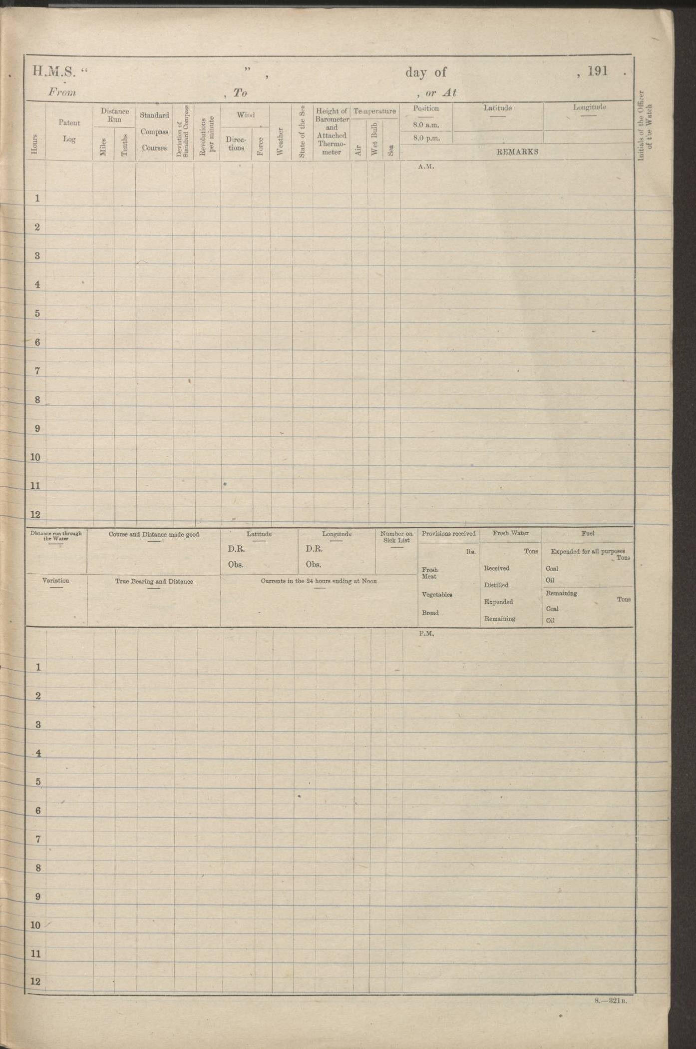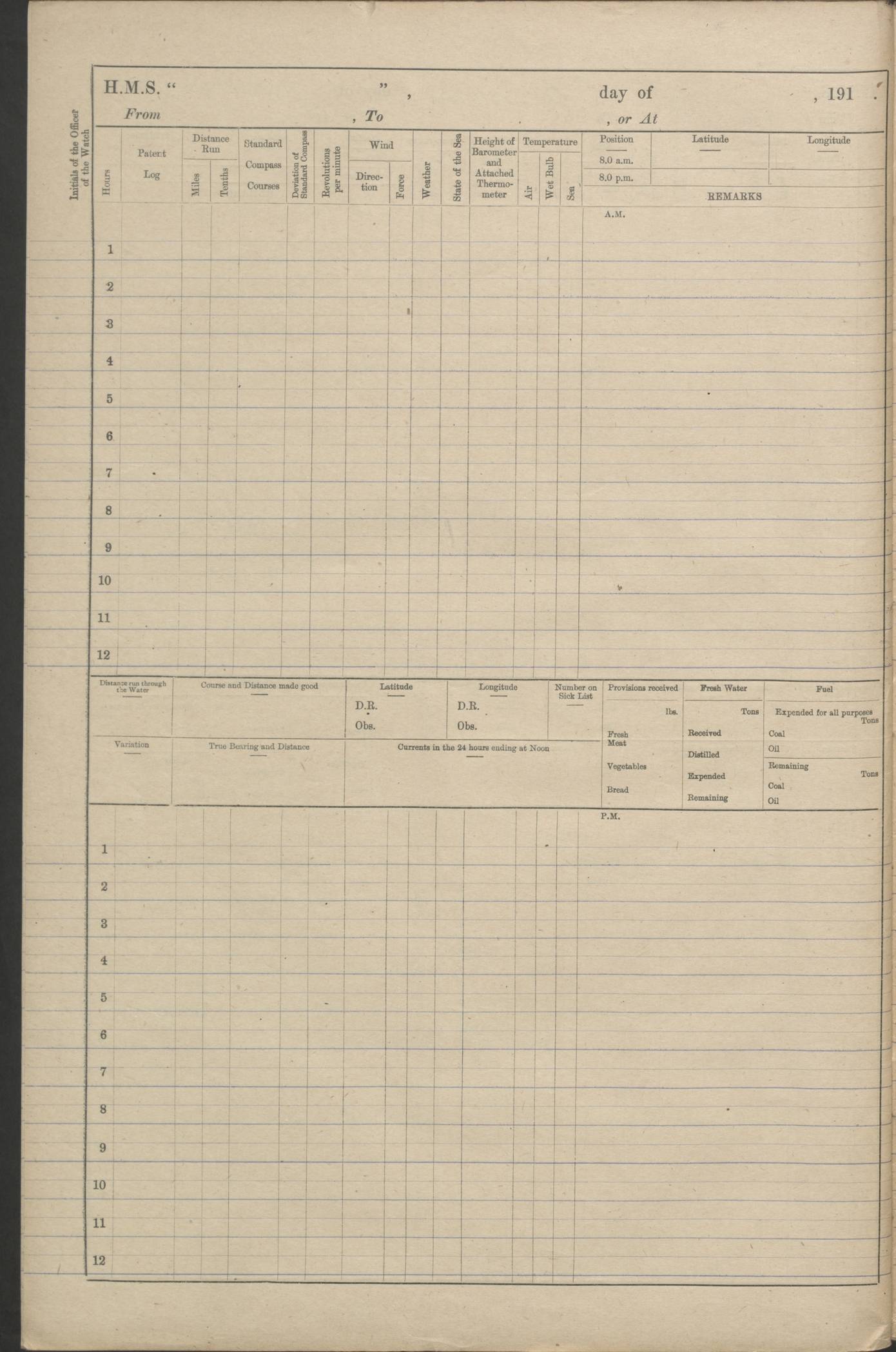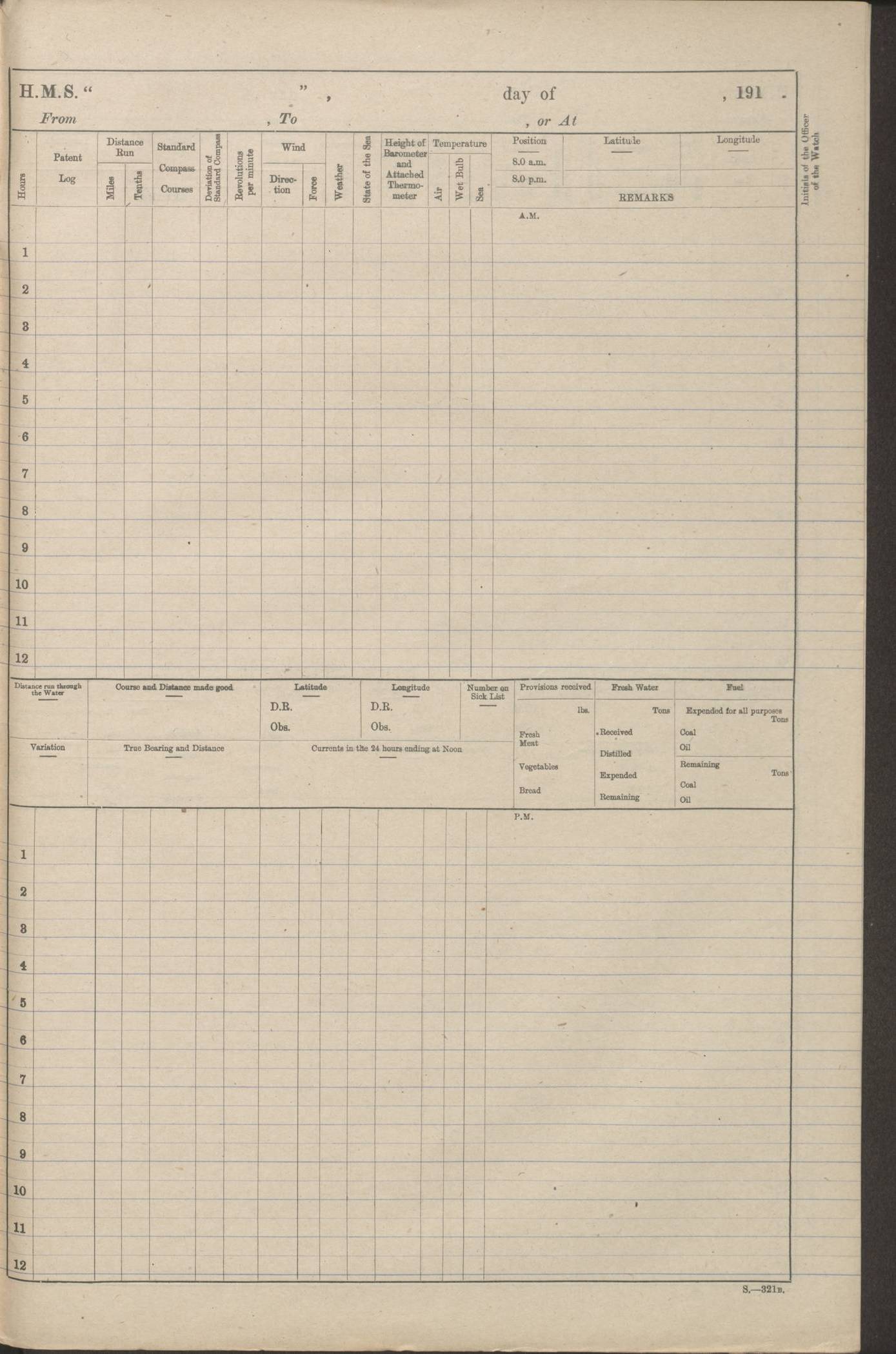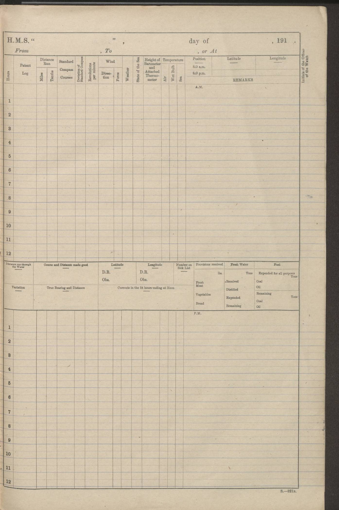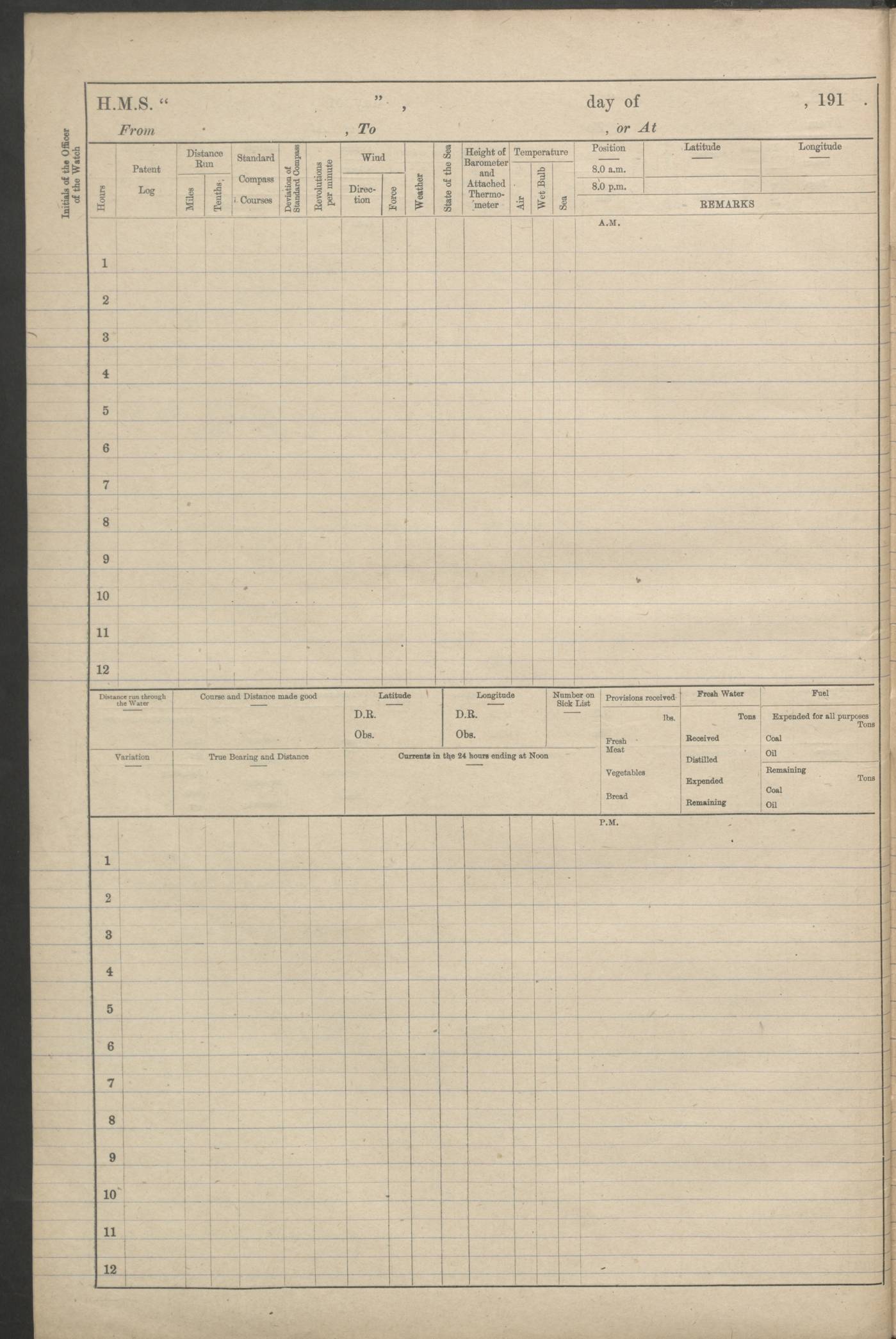 (Maps prepared using Journey Plotter, developed by Maikel. The Plots can only be approximate. They are made by joining-up positions on successive days, and sometimes positions are not given. There will therefore be occasions when the ship appears to have travelled overland) LOGS FOR AUGUST 1914 4caf8c39cadfd341970352c4: (http://oldweather.s3.amazonaws.com/ADM53-67374/ADM53-67374-001_0.jpg) 4caf8c39cadfd341970352c5: (http://oldweather.s3.amazonaws.com/ADM53-67374/ADM53-67374-001_1.jpg) 4caf8c39cadfd341970352c6: (http://oldweather.s3.amazonaws.com/ADM53-67374/ADM53-67374-002_0.jpg) 4caf8c39cadfd341970352c7: (http://oldweather.s3.amazonaws.com/ADM53-67374/ADM53-67374-002_1.jpg) 4caf8c39cadfd341970352c8: (http://oldweather.s3.amazonaws.com/ADM53-67374/ADM53-67374-003_0.jpg) 4caf8c39cadfd341970352c9: (http://oldweather.s3.amazonaws.com/ADM53-67374/ADM53-67374-003_1.jpg) 4caf8c39cadfd341970352ca: (http://oldweather.s3.amazonaws.com/ADM53-67374/ADM53-67374-004_0.jpg) 4caf8c39cadfd341970352cb: (http://oldweather.s3.amazonaws.com/ADM53-67374/ADM53-67374-004_1.jpg) 4caf8c39cadfd341970352cc: (http://oldweather.s3.amazonaws.com/ADM53-67374/ADM53-67374-005_0.jpg) 4caf8c39cadfd341970352cd: (http://oldweather.s3.amazonaws.com/ADM53-67374/ADM53-67374-005_1.jpg) Establishment of ship’s company Officers 44 Seamen 114 Boys ‒ Marines 38 Engine-room establishment 75 Other non-executive ratings 44 Total 315 BAROMETER Mercurial or aneroid: Mercurial Name of maker and number: Dobbie McInnes Height of cistern above sea: 55ft Error of mercurial barometer: .10 too low at 29.28 Thermometers for air temperature Position in ship: Fore bridge Whether in screen: Yes Maker and number: AC Cossor 3942C Date: From August 23 POSITION OF STANDARD COMPASS Top of wheel house on bridge DEVIATION OF STANDARD COMPASS Date obtained: August 23rd 1914 Position: River Mersey ARMAMENT Position: 2 guns forecastle head 2 guns forward house 2 guns after house 2 guns poop Number and nature of guns and mounting: 8 4.7” QF; P111 mountings TORPEDO ARMAMENT None BOATS Number of each carried: 8 Length and description: A lifeboats (wood) 26.2 ft Number of each carried: 4 Length and description: A lifeboats (steel) 26.0 ft MISCELLANEOUS INFORMATION Draught of water with bunkers full, and complete with provisions, stores and water: 26 ft 11 in forward; 29 ft 5 in aft Load draught: 26 ft 11 in forward; 29 ft 5 in aft Number of tons of coal carried (43 cubic feet per ton): 4541 Number of tons of oil fuel carried: None Quantity of water carried: For boilers 230; for drinking 700 THE VOYAGES OF HMS VICTORIAN 1914