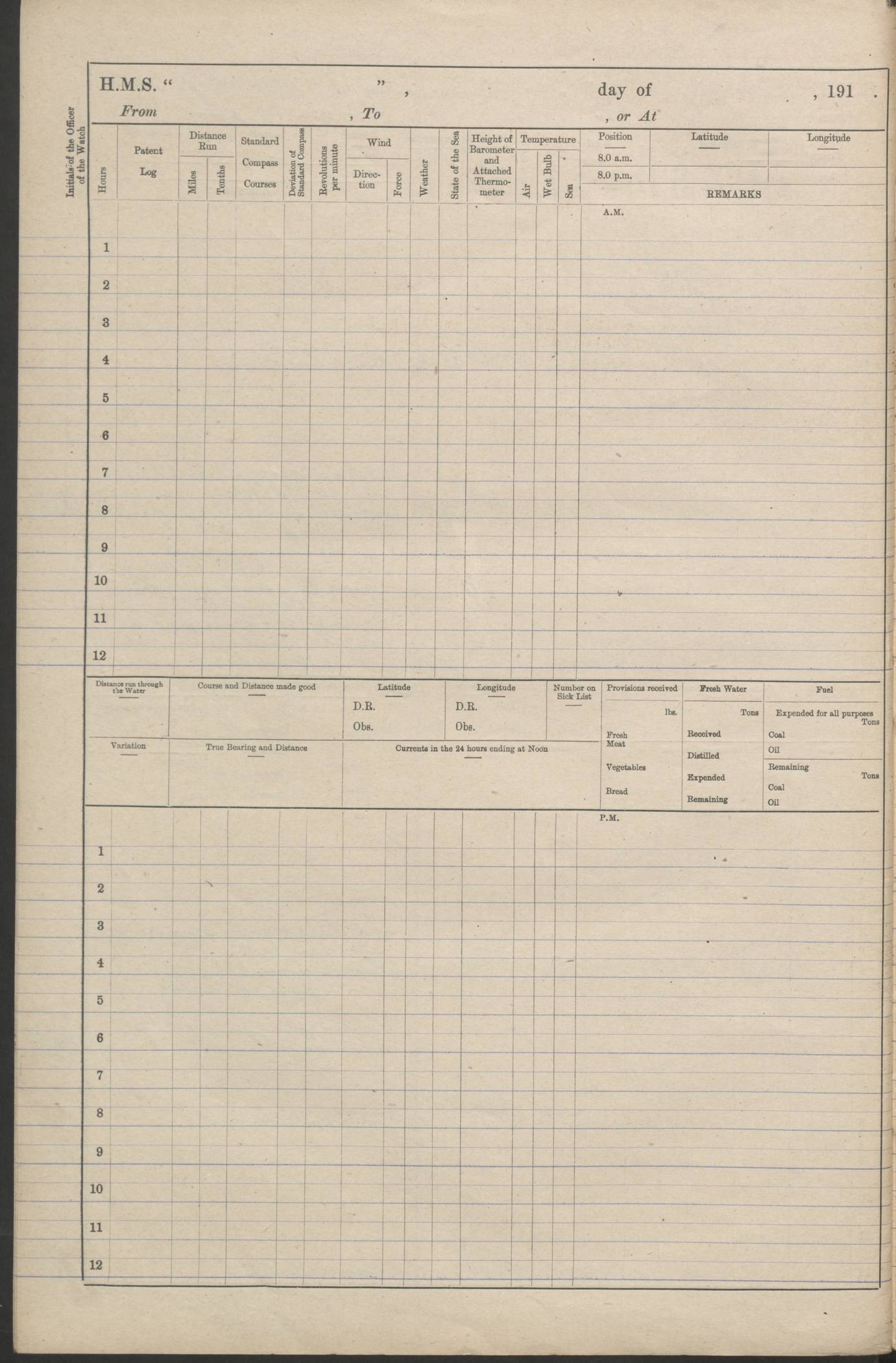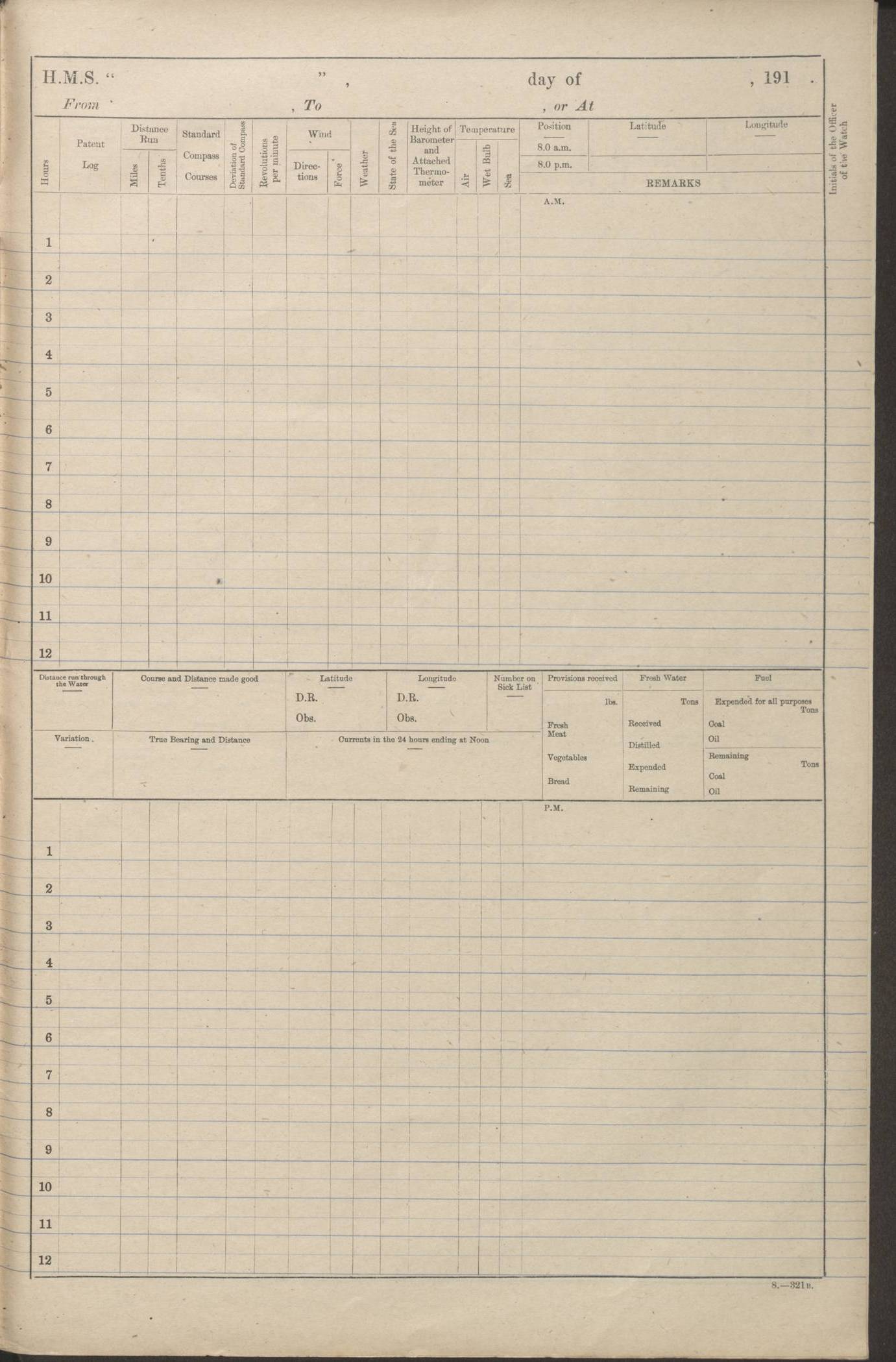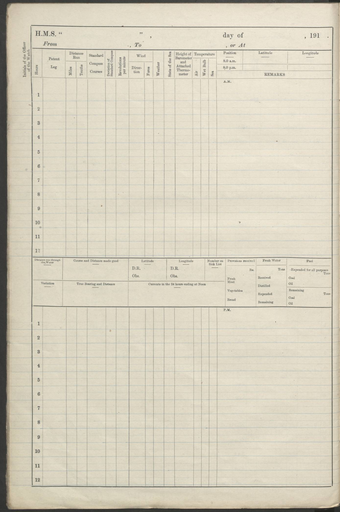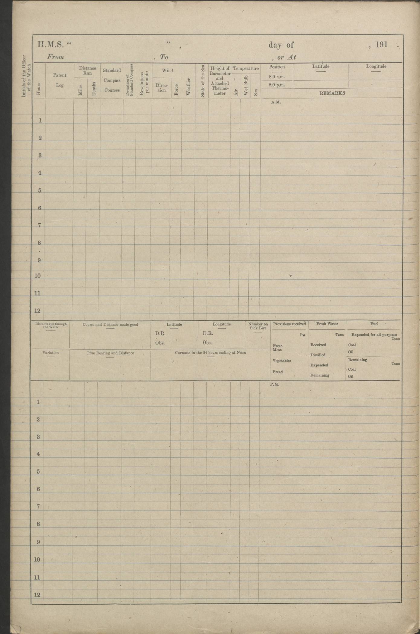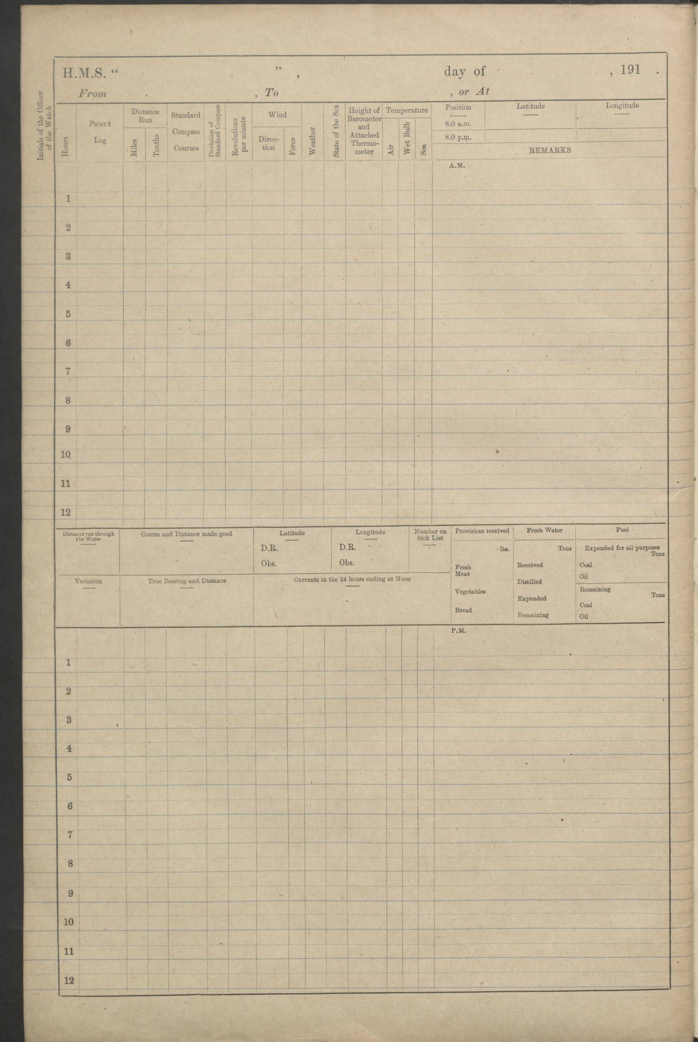(Maps prepared using Journey Plotter, developed by Maikel. The Plots can only be approximate. They are made by joining-up positions on successive days, and sometimes positions are not given. There will therefore be occasions when the ship appears to have travelled overland) LOGS FOR AUGUST 1914 4caf8c39cadfd341970352c4: (http://oldweather.s3.amazonaws.com/ADM53-67374/ADM53-67374-001_0.jpg) 4caf8c39cadfd341970352c5: (http://oldweather.s3.amazonaws.com/ADM53-67374/ADM53-67374-001_1.jpg) 4caf8c39cadfd341970352c6: (http://oldweather.s3.amazonaws.com/ADM53-67374/ADM53-67374-002_0.jpg) 4caf8c39cadfd341970352c7: (http://oldweather.s3.amazonaws.com/ADM53-67374/ADM53-67374-002_1.jpg) 4caf8c39cadfd341970352c8: (http://oldweather.s3.amazonaws.com/ADM53-67374/ADM53-67374-003_0.jpg) 4caf8c39cadfd341970352c9: (http://oldweather.s3.amazonaws.com/ADM53-67374/ADM53-67374-003_1.jpg) 4caf8c39cadfd341970352ca: (http://oldweather.s3.amazonaws.com/ADM53-67374/ADM53-67374-004_0.jpg) 4caf8c39cadfd341970352cb: (http://oldweather.s3.amazonaws.com/ADM53-67374/ADM53-67374-004_1.jpg) 4caf8c39cadfd341970352cc: (http://oldweather.s3.amazonaws.com/ADM53-67374/ADM53-67374-005_0.jpg) 4caf8c39cadfd341970352cd: (http://oldweather.s3.amazonaws.com/ADM53-67374/ADM53-67374-005_1.jpg) Establishment of ship’s company Officers 44 Seamen 114 Boys ‒ Marines 38 Engine-room establishment 75 Other non-executive ratings 44 Total 315 BAROMETER Mercurial or aneroid: Mercurial Name of maker and number: Dobbie McInnes Height of cistern above sea: 55ft Error of mercurial barometer: .10 too low at 29.28 Thermometers for air temperature Position in ship: Fore bridge Whether in screen: Yes Maker and number: AC Cossor 3942C Date: From August 23 POSITION OF STANDARD COMPASS Top of wheel house on bridge DEVIATION OF STANDARD COMPASS Date obtained: August 23rd 1914 Position: River Mersey ARMAMENT Position: 2 guns forecastle head 2 guns forward house 2 guns after house 2 guns poop Number and nature of guns and mounting: 8 4.7” QF; P111 mountings TORPEDO ARMAMENT None BOATS Number of each carried: 8 Length and description: A lifeboats (wood) 26.2 ft Number of each carried: 4 Length and description: A lifeboats (steel) 26.0 ft MISCELLANEOUS INFORMATION Draught of water with bunkers full, and complete with provisions, stores and water: 26 ft 11 in forward; 29 ft 5 in aft Load draught: 26 ft 11 in forward; 29 ft 5 in aft Number of tons of coal carried (43 cubic feet per ton): 4541 Number of tons of oil fuel carried: None Quantity of water carried: For boilers 230; for drinking 700 THE VOYAGES OF HMS VICTORIAN 1914