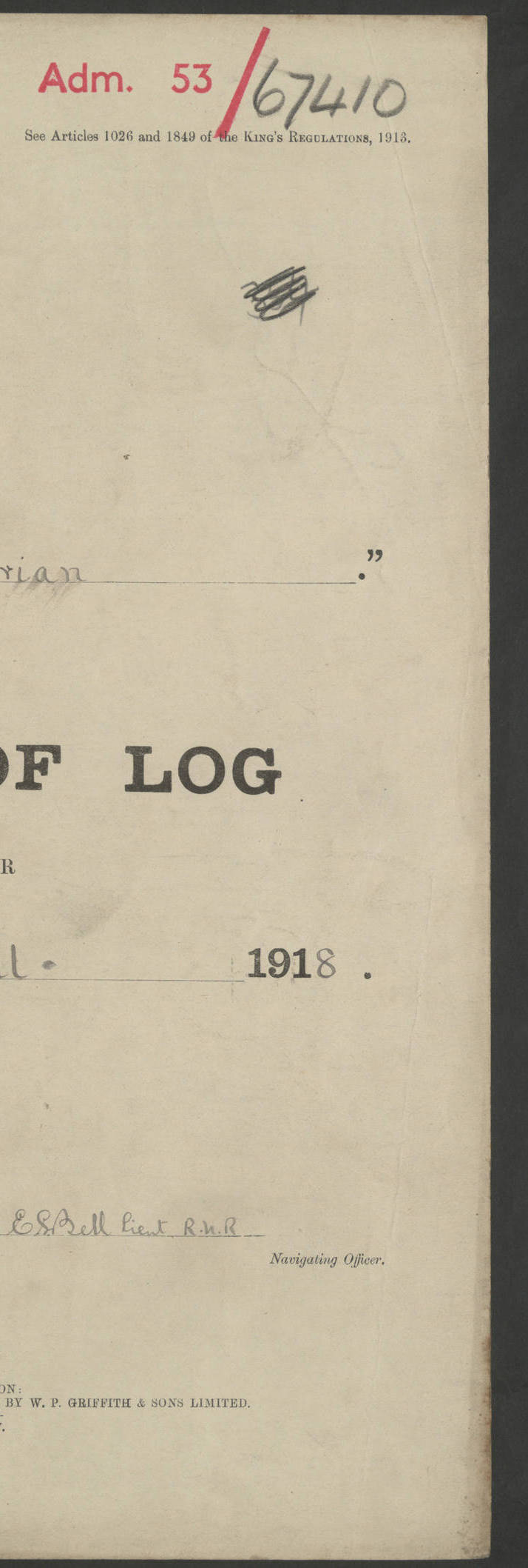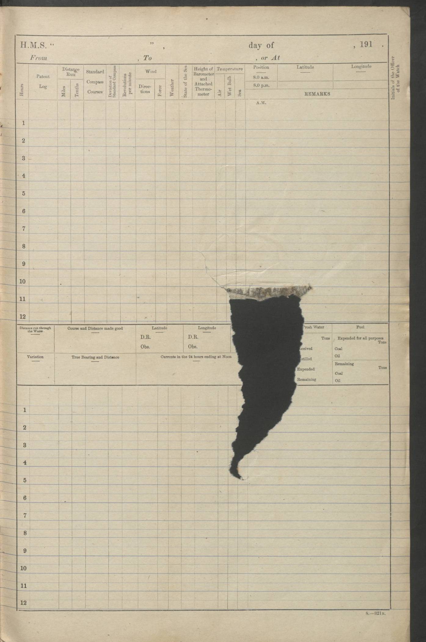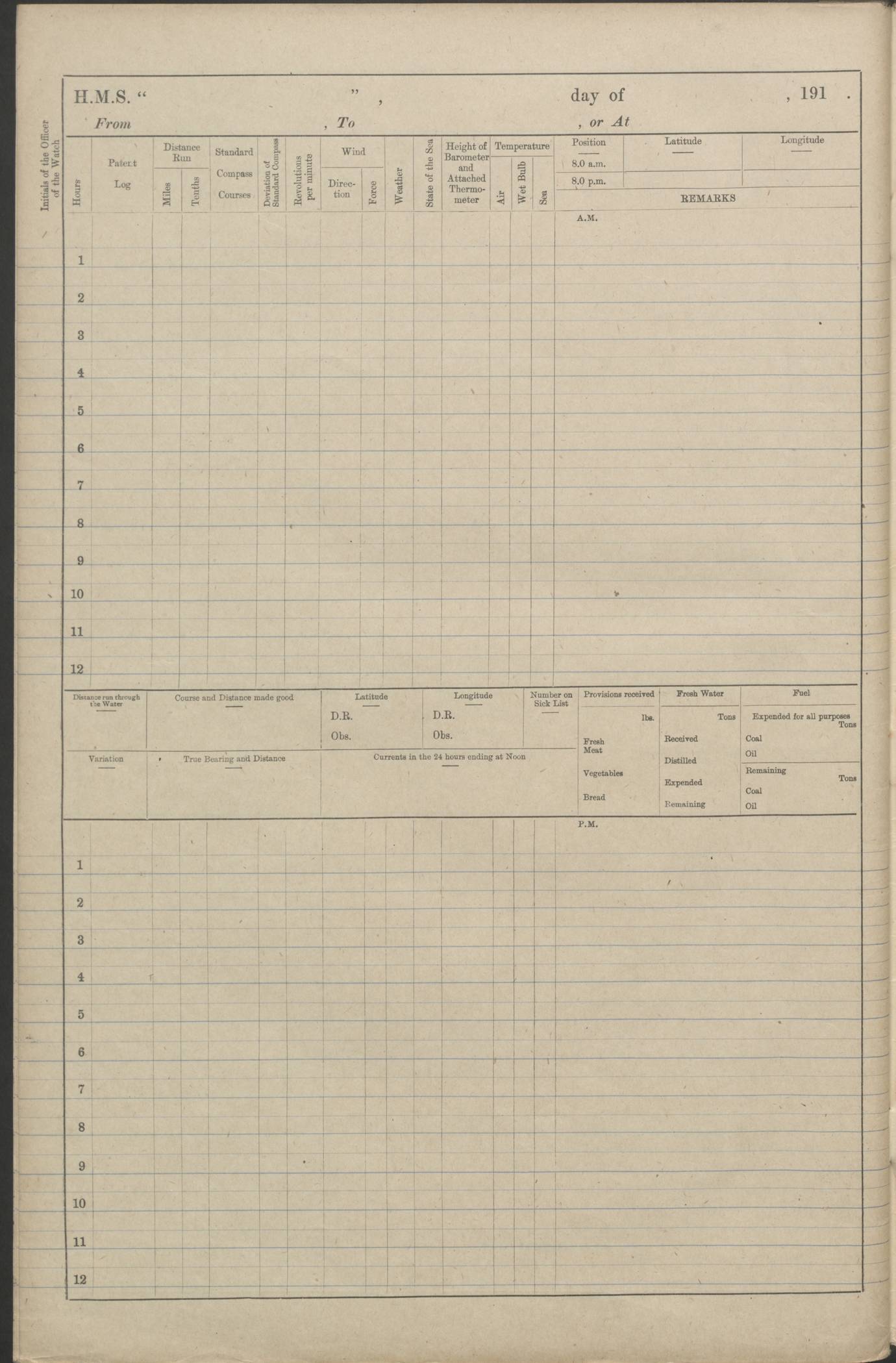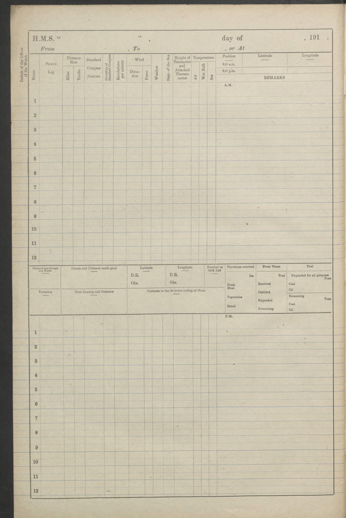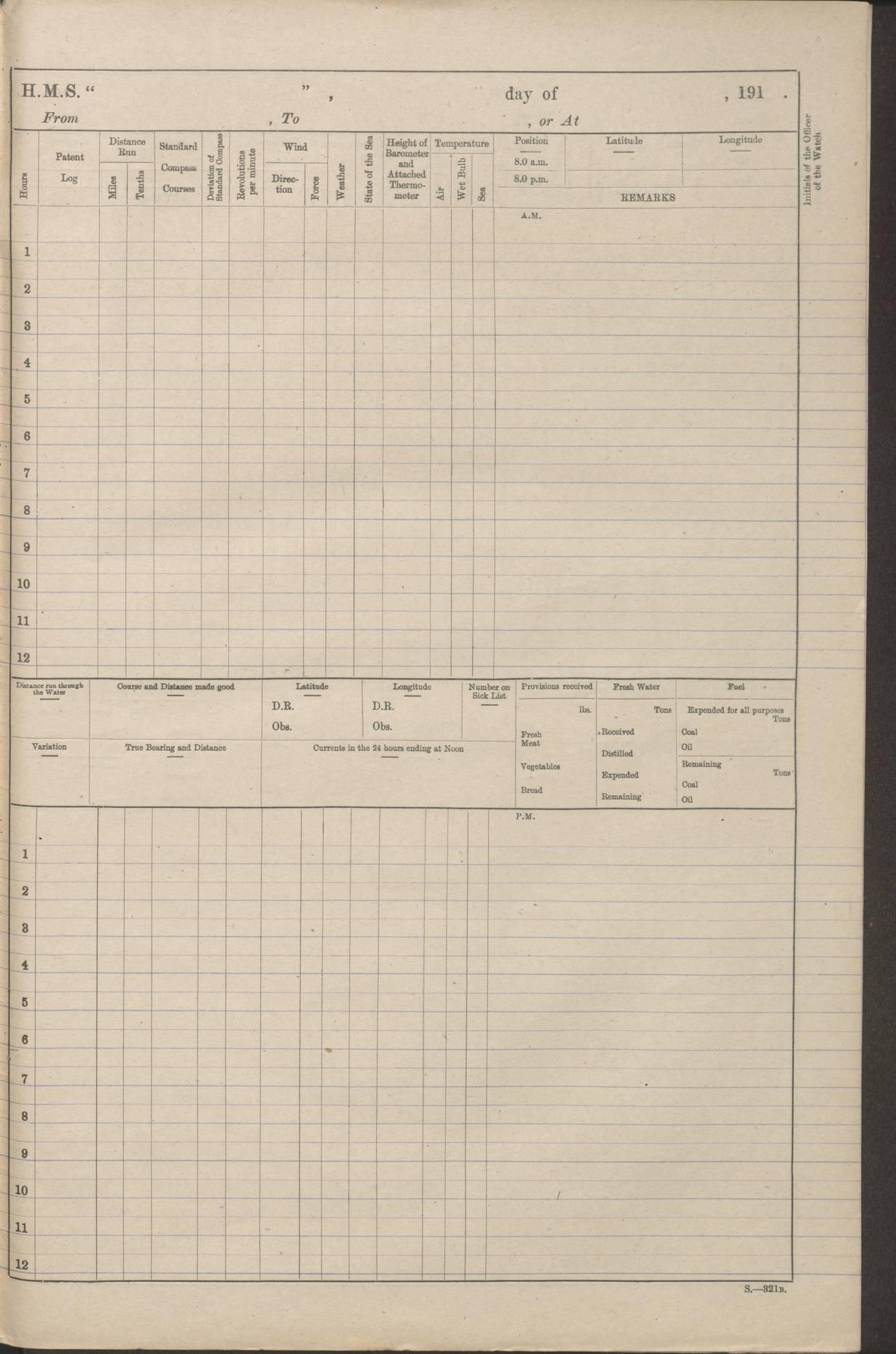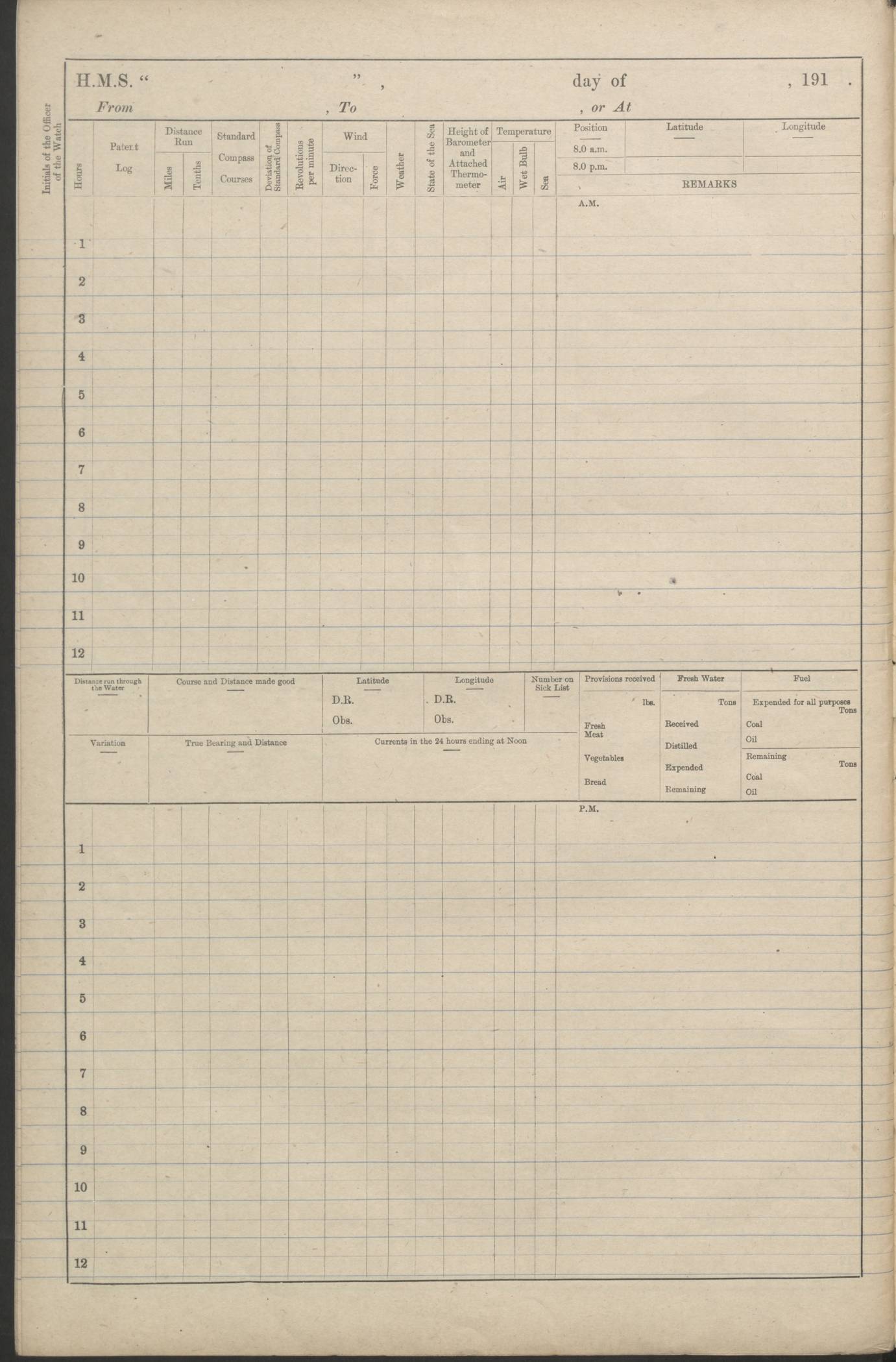 (Maps prepared using Journey Plotter, developed by Maikel. The Plots can only be approximate. They are made by joining-up positions on successive days, and sometimes positions are not given. There will therefore be occasions when the ship appears to have travelled overland) LOGS FOR AUGUST 1914 4caf8c39cadfd341970352c4: (http://oldweather.s3.amazonaws.com/ADM53-67374/ADM53-67374-001_0.jpg) 4caf8c39cadfd341970352c5: (http://oldweather.s3.amazonaws.com/ADM53-67374/ADM53-67374-001_1.jpg) 4caf8c39cadfd341970352c6: (http://oldweather.s3.amazonaws.com/ADM53-67374/ADM53-67374-002_0.jpg) 4caf8c39cadfd341970352c7: (http://oldweather.s3.amazonaws.com/ADM53-67374/ADM53-67374-002_1.jpg) 4caf8c39cadfd341970352c8: (http://oldweather.s3.amazonaws.com/ADM53-67374/ADM53-67374-003_0.jpg) 4caf8c39cadfd341970352c9: (http://oldweather.s3.amazonaws.com/ADM53-67374/ADM53-67374-003_1.jpg) 4caf8c39cadfd341970352ca: (http://oldweather.s3.amazonaws.com/ADM53-67374/ADM53-67374-004_0.jpg) 4caf8c39cadfd341970352cb: (http://oldweather.s3.amazonaws.com/ADM53-67374/ADM53-67374-004_1.jpg) 4caf8c39cadfd341970352cc: (http://oldweather.s3.amazonaws.com/ADM53-67374/ADM53-67374-005_0.jpg) 4caf8c39cadfd341970352cd: (http://oldweather.s3.amazonaws.com/ADM53-67374/ADM53-67374-005_1.jpg) Establishment of ship’s company Officers 44 Seamen 114 Boys ‒ Marines 38 Engine-room establishment 75 Other non-executive ratings 44 Total 315 BAROMETER Mercurial or aneroid: Mercurial Name of maker and number: Dobbie McInnes Height of cistern above sea: 55ft Error of mercurial barometer: .10 too low at 29.28 Thermometers for air temperature Position in ship: Fore bridge Whether in screen: Yes Maker and number: AC Cossor 3942C Date: From August 23 POSITION OF STANDARD COMPASS Top of wheel house on bridge DEVIATION OF STANDARD COMPASS Date obtained: August 23rd 1914 Position: River Mersey ARMAMENT Position: 2 guns forecastle head 2 guns forward house 2 guns after house 2 guns poop Number and nature of guns and mounting: 8 4.7” QF; P111 mountings TORPEDO ARMAMENT None BOATS Number of each carried: 8 Length and description: A lifeboats (wood) 26.2 ft Number of each carried: 4 Length and description: A lifeboats (steel) 26.0 ft MISCELLANEOUS INFORMATION Draught of water with bunkers full, and complete with provisions, stores and water: 26 ft 11 in forward; 29 ft 5 in aft Load draught: 26 ft 11 in forward; 29 ft 5 in aft Number of tons of coal carried (43 cubic feet per ton): 4541 Number of tons of oil fuel carried: None Quantity of water carried: For boilers 230; for drinking 700 THE VOYAGES OF HMS VICTORIAN 1914