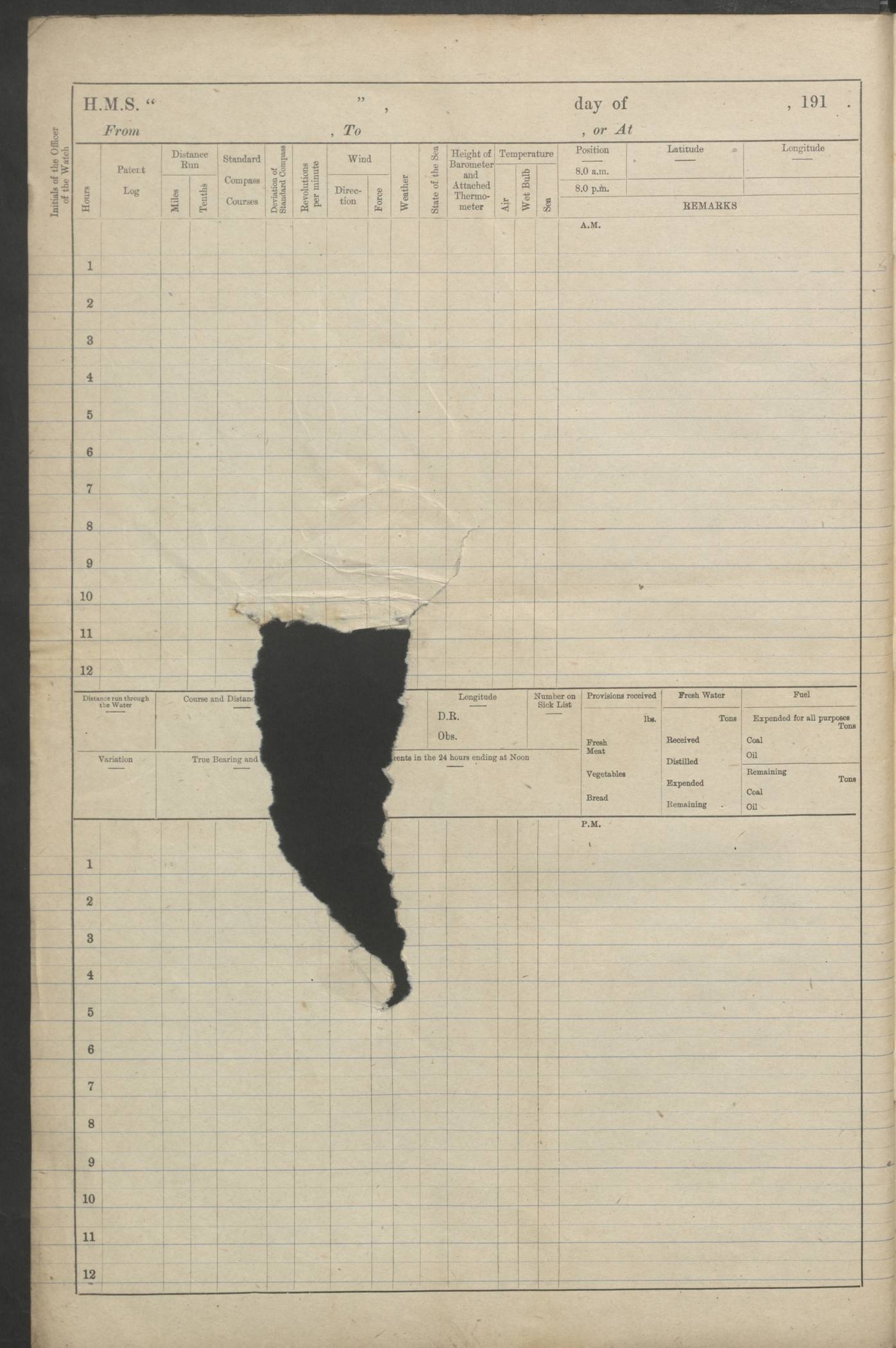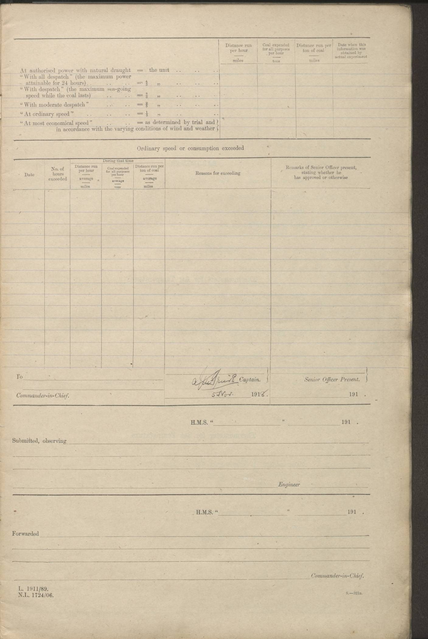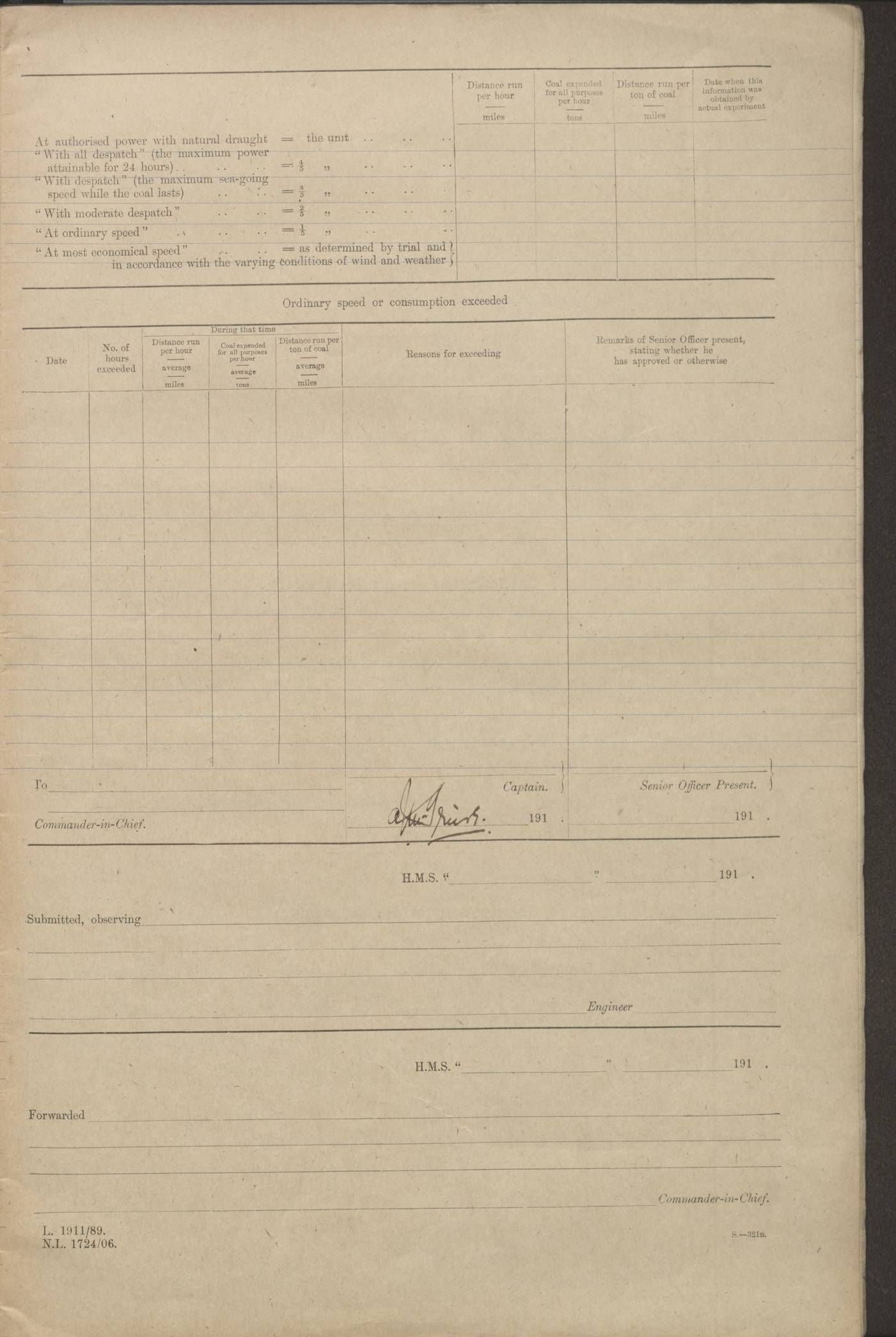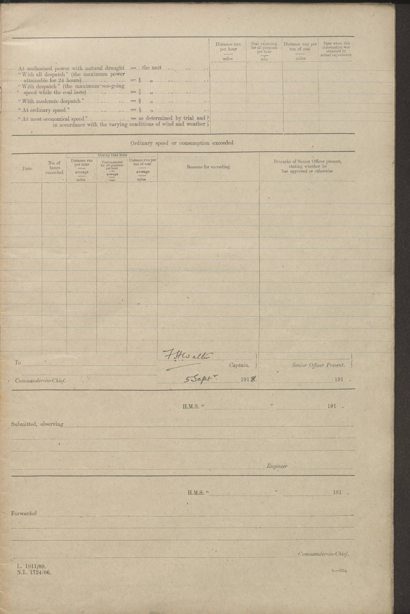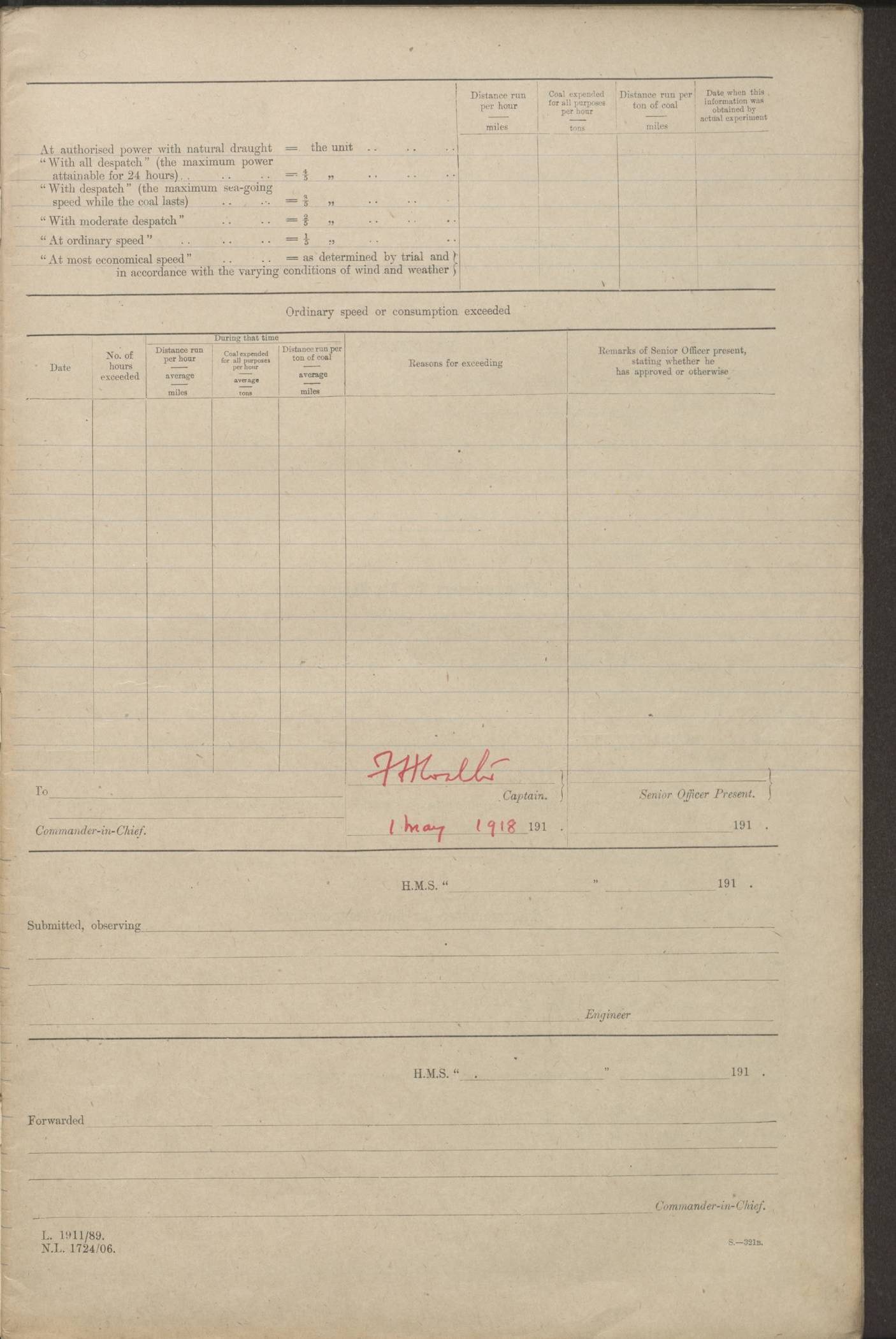(Maps prepared using Journey Plotter, developed by Maikel. The Plots can only be approximate. They are made by joining-up positions on successive days, and sometimes positions are not given. There will therefore be occasions when the ship appears to have travelled overland) LOGS FOR AUGUST 1914 4caf8c39cadfd341970352c4: (http://oldweather.s3.amazonaws.com/ADM53-67374/ADM53-67374-001_0.jpg) 4caf8c39cadfd341970352c5: (http://oldweather.s3.amazonaws.com/ADM53-67374/ADM53-67374-001_1.jpg) 4caf8c39cadfd341970352c6: (http://oldweather.s3.amazonaws.com/ADM53-67374/ADM53-67374-002_0.jpg) 4caf8c39cadfd341970352c7: (http://oldweather.s3.amazonaws.com/ADM53-67374/ADM53-67374-002_1.jpg) 4caf8c39cadfd341970352c8: (http://oldweather.s3.amazonaws.com/ADM53-67374/ADM53-67374-003_0.jpg) 4caf8c39cadfd341970352c9: (http://oldweather.s3.amazonaws.com/ADM53-67374/ADM53-67374-003_1.jpg) 4caf8c39cadfd341970352ca: (http://oldweather.s3.amazonaws.com/ADM53-67374/ADM53-67374-004_0.jpg) 4caf8c39cadfd341970352cb: (http://oldweather.s3.amazonaws.com/ADM53-67374/ADM53-67374-004_1.jpg) 4caf8c39cadfd341970352cc: (http://oldweather.s3.amazonaws.com/ADM53-67374/ADM53-67374-005_0.jpg) 4caf8c39cadfd341970352cd: (http://oldweather.s3.amazonaws.com/ADM53-67374/ADM53-67374-005_1.jpg) Establishment of ship’s company Officers 44 Seamen 114 Boys ‒ Marines 38 Engine-room establishment 75 Other non-executive ratings 44 Total 315 BAROMETER Mercurial or aneroid: Mercurial Name of maker and number: Dobbie McInnes Height of cistern above sea: 55ft Error of mercurial barometer: .10 too low at 29.28 Thermometers for air temperature Position in ship: Fore bridge Whether in screen: Yes Maker and number: AC Cossor 3942C Date: From August 23 POSITION OF STANDARD COMPASS Top of wheel house on bridge DEVIATION OF STANDARD COMPASS Date obtained: August 23rd 1914 Position: River Mersey ARMAMENT Position: 2 guns forecastle head 2 guns forward house 2 guns after house 2 guns poop Number and nature of guns and mounting: 8 4.7” QF; P111 mountings TORPEDO ARMAMENT None BOATS Number of each carried: 8 Length and description: A lifeboats (wood) 26.2 ft Number of each carried: 4 Length and description: A lifeboats (steel) 26.0 ft MISCELLANEOUS INFORMATION Draught of water with bunkers full, and complete with provisions, stores and water: 26 ft 11 in forward; 29 ft 5 in aft Load draught: 26 ft 11 in forward; 29 ft 5 in aft Number of tons of coal carried (43 cubic feet per ton): 4541 Number of tons of oil fuel carried: None Quantity of water carried: For boilers 230; for drinking 700 THE VOYAGES OF HMS VICTORIAN 1914