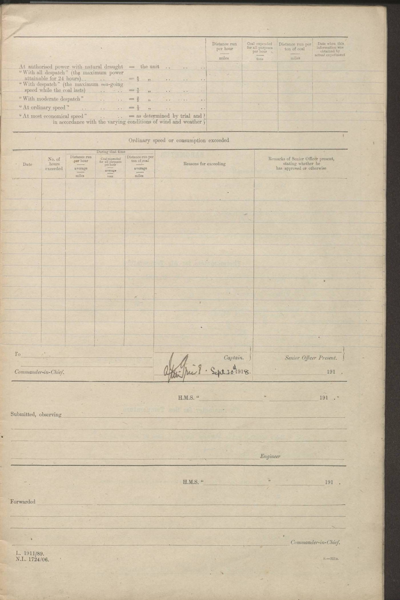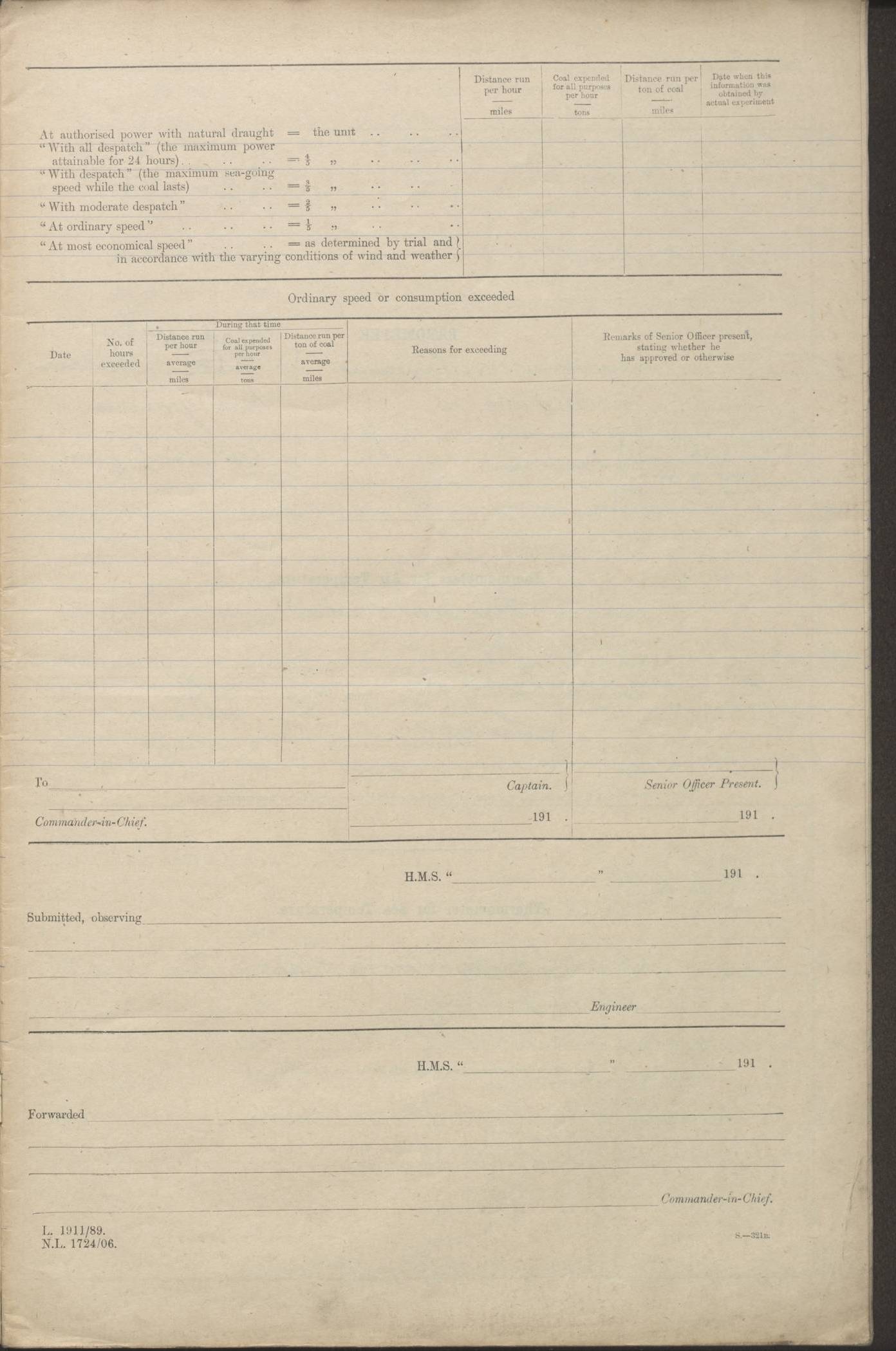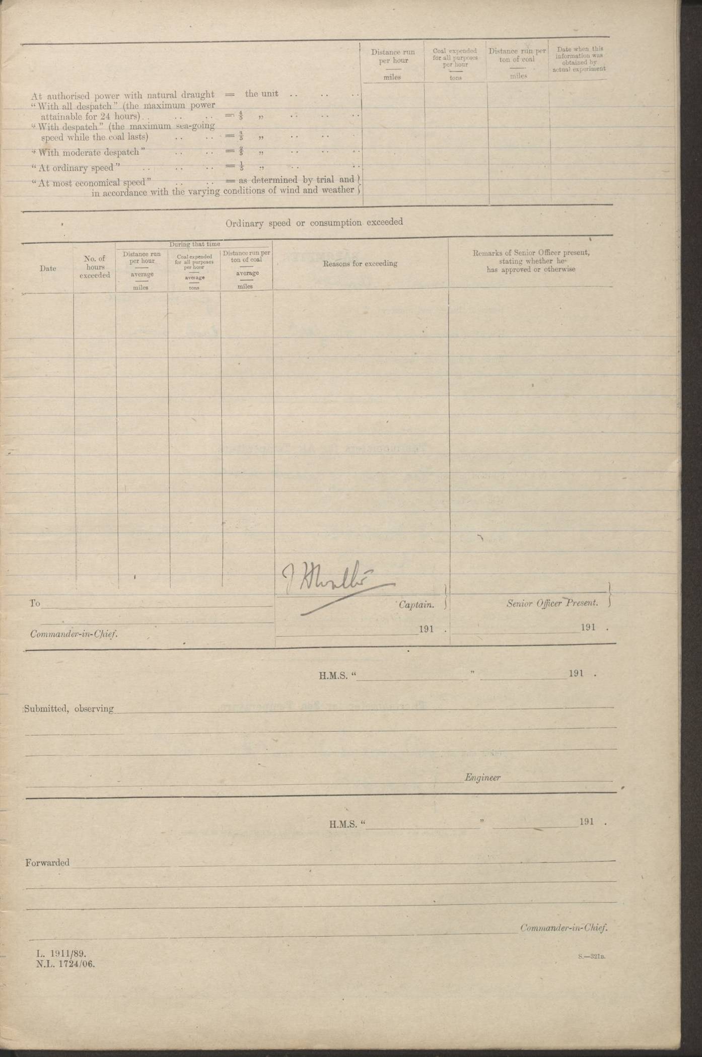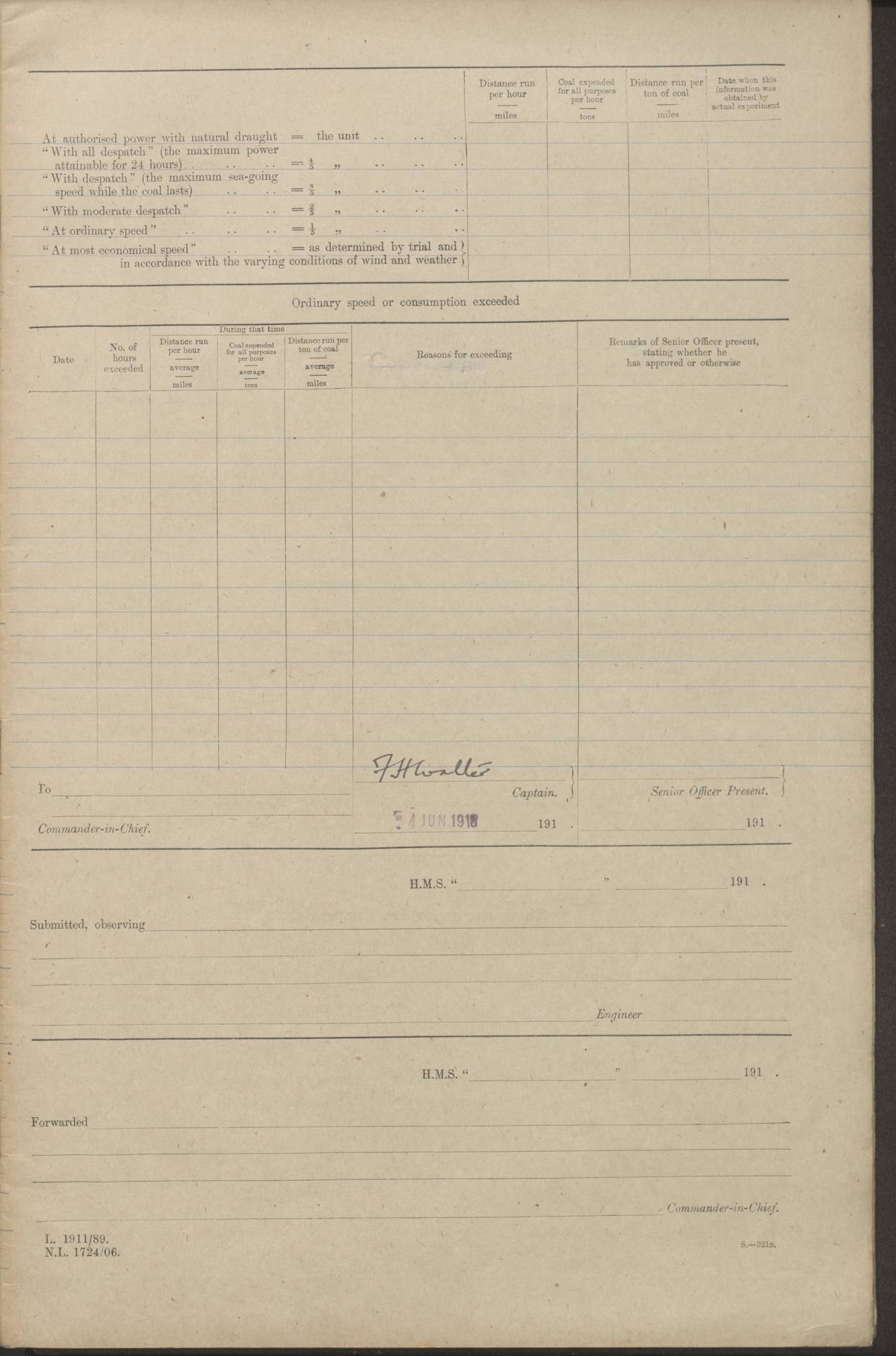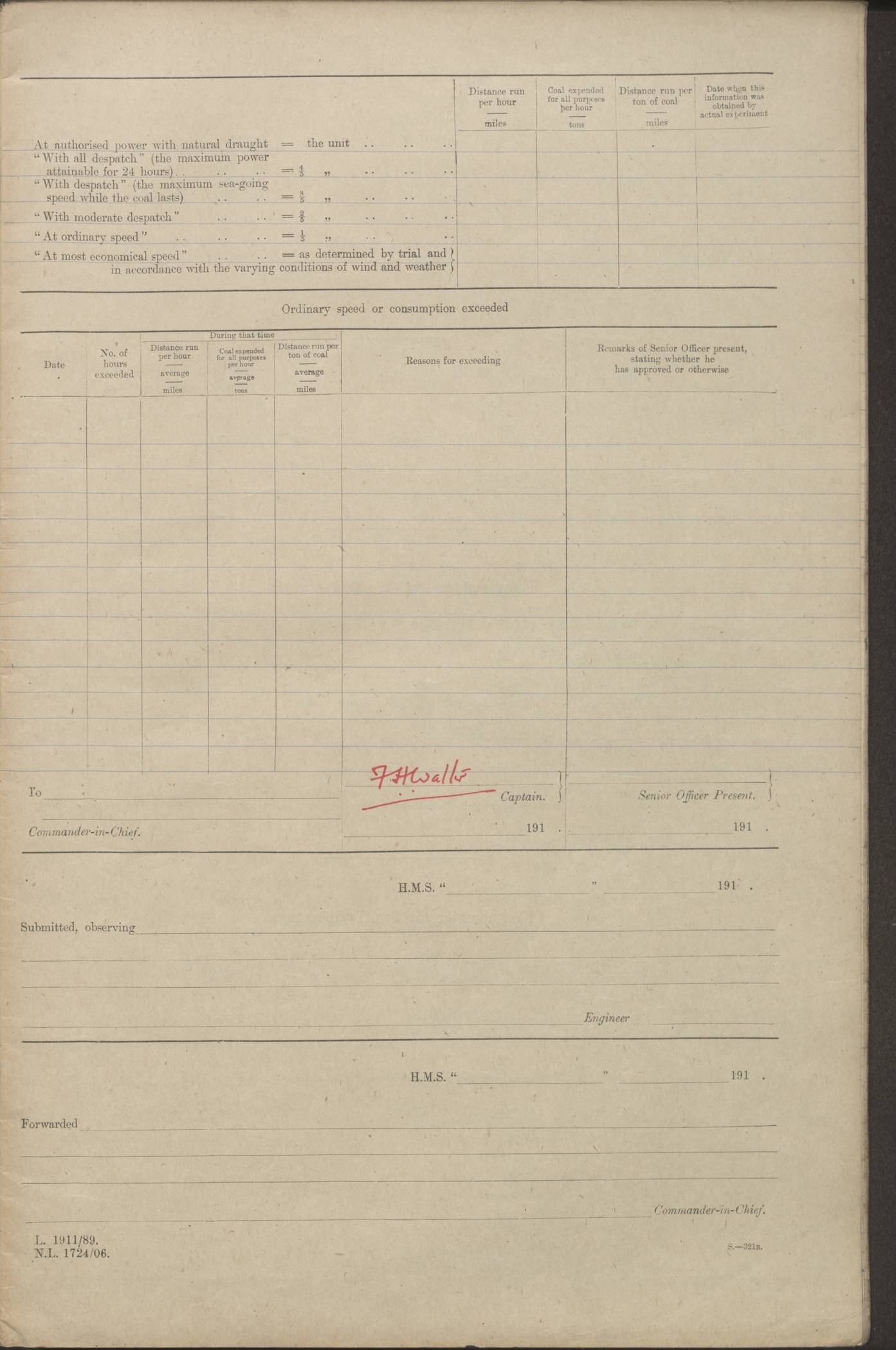 (Maps prepared using Journey Plotter, developed by Maikel. The Plots can only be approximate. They are made by joining-up positions on successive days, and sometimes positions are not given. There will therefore be occasions when the ship appears to have travelled overland) LOGS FOR AUGUST 1914 4caf8c39cadfd341970352c4: (http://oldweather.s3.amazonaws.com/ADM53-67374/ADM53-67374-001_0.jpg) 4caf8c39cadfd341970352c5: (http://oldweather.s3.amazonaws.com/ADM53-67374/ADM53-67374-001_1.jpg) 4caf8c39cadfd341970352c6: (http://oldweather.s3.amazonaws.com/ADM53-67374/ADM53-67374-002_0.jpg) 4caf8c39cadfd341970352c7: (http://oldweather.s3.amazonaws.com/ADM53-67374/ADM53-67374-002_1.jpg) 4caf8c39cadfd341970352c8: (http://oldweather.s3.amazonaws.com/ADM53-67374/ADM53-67374-003_0.jpg) 4caf8c39cadfd341970352c9: (http://oldweather.s3.amazonaws.com/ADM53-67374/ADM53-67374-003_1.jpg) 4caf8c39cadfd341970352ca: (http://oldweather.s3.amazonaws.com/ADM53-67374/ADM53-67374-004_0.jpg) 4caf8c39cadfd341970352cb: (http://oldweather.s3.amazonaws.com/ADM53-67374/ADM53-67374-004_1.jpg) 4caf8c39cadfd341970352cc: (http://oldweather.s3.amazonaws.com/ADM53-67374/ADM53-67374-005_0.jpg) 4caf8c39cadfd341970352cd: (http://oldweather.s3.amazonaws.com/ADM53-67374/ADM53-67374-005_1.jpg) Establishment of ship’s company Officers 44 Seamen 114 Boys ‒ Marines 38 Engine-room establishment 75 Other non-executive ratings 44 Total 315 BAROMETER Mercurial or aneroid: Mercurial Name of maker and number: Dobbie McInnes Height of cistern above sea: 55ft Error of mercurial barometer: .10 too low at 29.28 Thermometers for air temperature Position in ship: Fore bridge Whether in screen: Yes Maker and number: AC Cossor 3942C Date: From August 23 POSITION OF STANDARD COMPASS Top of wheel house on bridge DEVIATION OF STANDARD COMPASS Date obtained: August 23rd 1914 Position: River Mersey ARMAMENT Position: 2 guns forecastle head 2 guns forward house 2 guns after house 2 guns poop Number and nature of guns and mounting: 8 4.7” QF; P111 mountings TORPEDO ARMAMENT None BOATS Number of each carried: 8 Length and description: A lifeboats (wood) 26.2 ft Number of each carried: 4 Length and description: A lifeboats (steel) 26.0 ft MISCELLANEOUS INFORMATION Draught of water with bunkers full, and complete with provisions, stores and water: 26 ft 11 in forward; 29 ft 5 in aft Load draught: 26 ft 11 in forward; 29 ft 5 in aft Number of tons of coal carried (43 cubic feet per ton): 4541 Number of tons of oil fuel carried: None Quantity of water carried: For boilers 230; for drinking 700 THE VOYAGES OF HMS VICTORIAN 1914