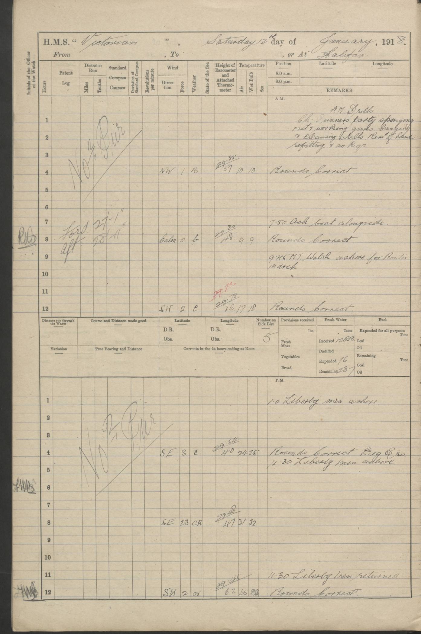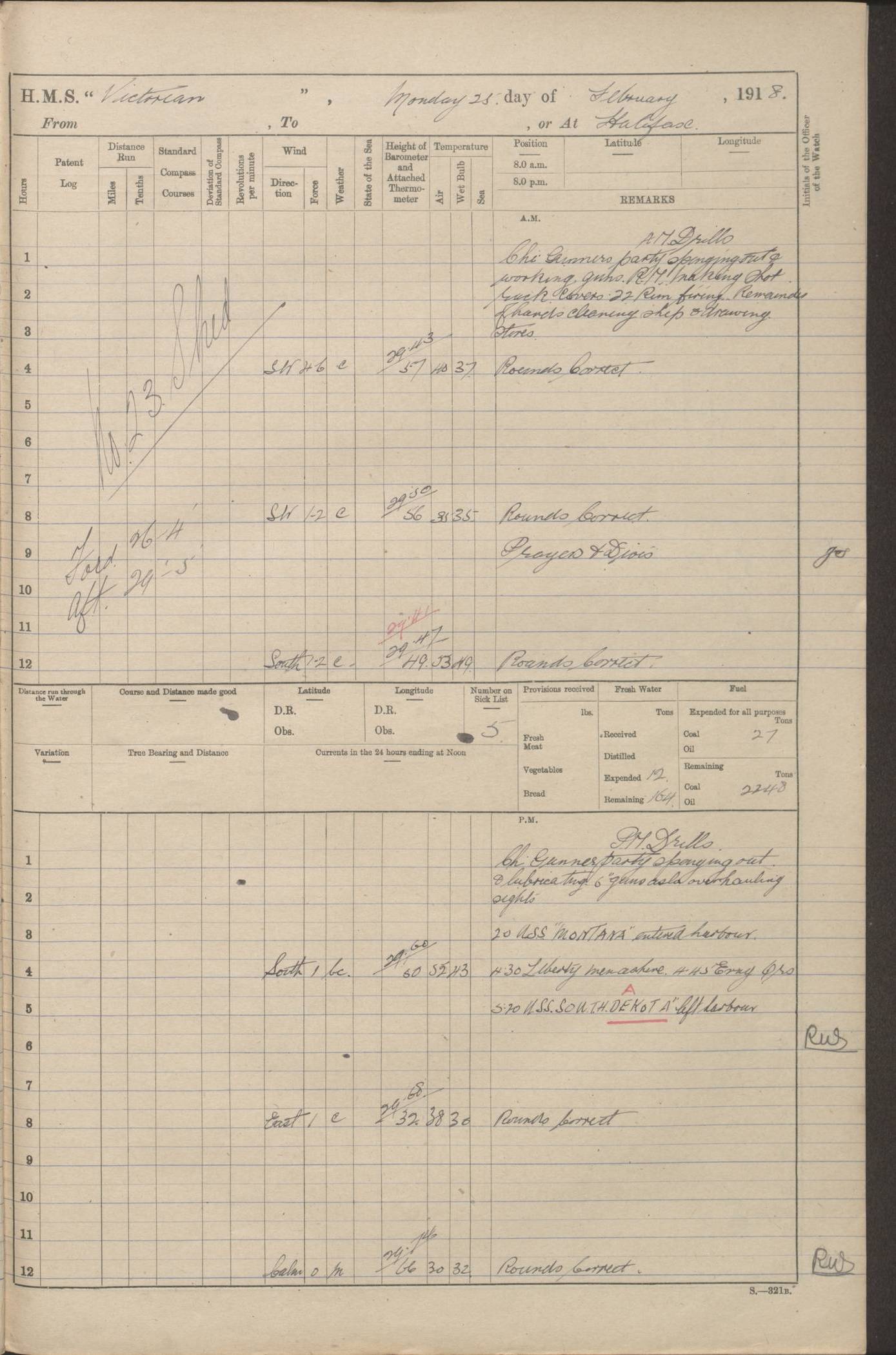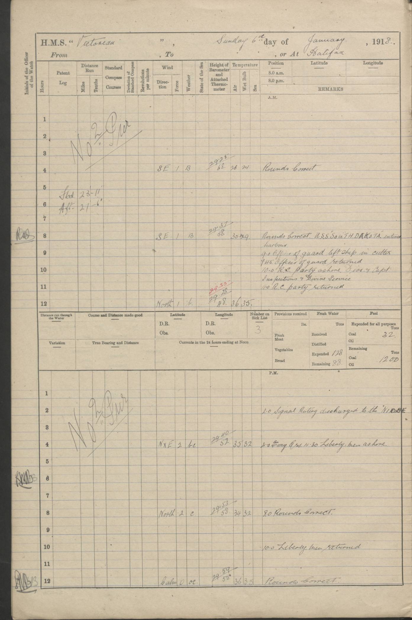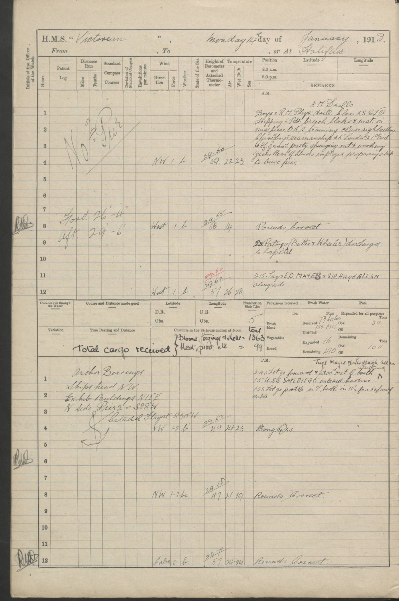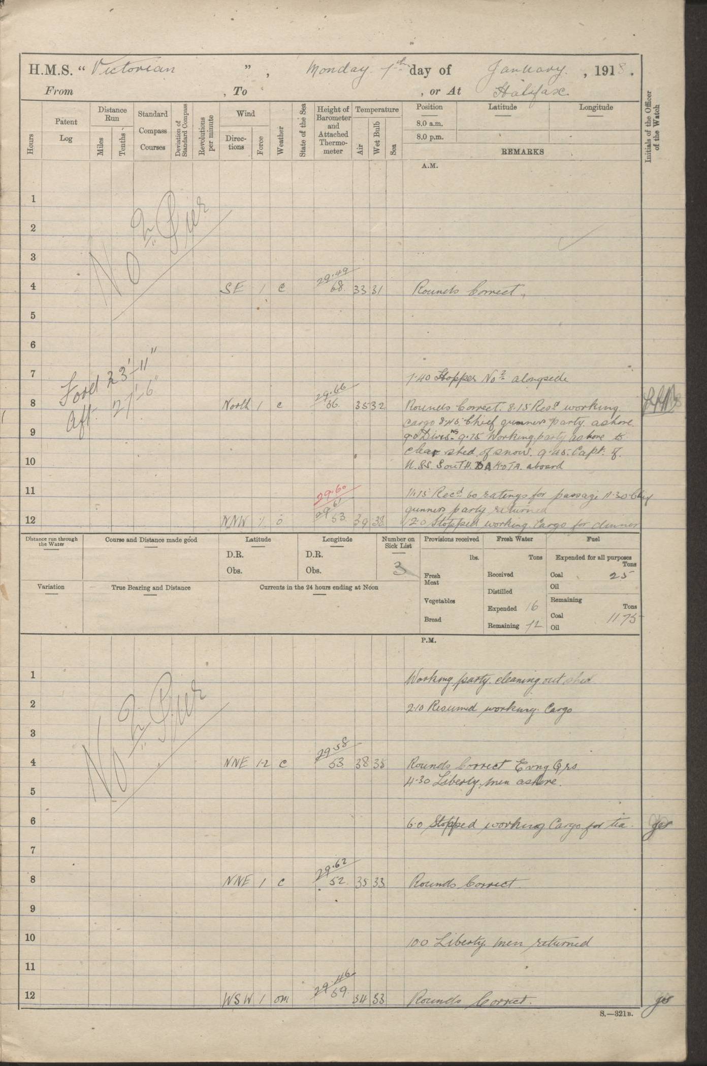 LOGS FOR JANUARY 1918 4caf8c4dcadfd341970358e2: (http://oldweather.s3.amazonaws.com/ADM 53-67407/ADM 53-67407-00001_0.jpg) [Left hand side of cover of Copy of Log for January 1918] 4caf8c4dcadfd341970358e3: (http://oldweather.s3.amazonaws.com/ADM 53-67407/ADM 53-67407-00001_1.jpg) [Right hand side of cover, signed by Navigating Officer, as before] 4caf8c4dcadfd341970358e4: (http://oldweather.s3.amazonaws.com/ADM 53-67407/ADM 53-67407-00002_0.jpg) [Blank page] 4caf8c4dcadfd341970358e5: (http://oldweather.s3.amazonaws.com/ADM 53-67407/ADM 53-67407-00002_1.jpg) [Page not filled in] 4caf8c4dcadfd341970358e6: (http://oldweather.s3.amazonaws.com/ADM 53-67407/ADM 53-67407-00003_0.jpg) [Details of Barometer and Thermometers, as previous month (though no numbers for Thermometers for Air Temperature)] 4caf8c4dcadfd341970358e7: (http://oldweather.s3.amazonaws.com/ADM 53-67407/ADM 53-67407-00003_1.jpg) 1 January 1918 From Liverpool to Halifax Lat 48.23, Long -45.67 [Position: 335 miles E of Newfoundland] 4.00am and 8.0am: In Station with convoy. am Drills: Tested Depth Charges. Class of boys Seamanship and ammunition. Sightsetters sight setting. Ordinary Seamen Seamanship. Royal Marines Signals. Deflection Teacher. Guns Crew of Morning watch to Loader. Noon: Altered course S77W, Log 87. In station with Convoy. pm: PM Drills. Guns Crews of Forenoon watch to Loader. Ship Company .22 Rim firing. 4.00pm: In station with Convoy. Evening Quarters. 4.12pm: Hauled in Log, foul and cleared. 5.00pm: Clocks put back 25 minutes. 6.00pm and Midnight: In station with Convoy. [Course and Distance made good: S54W, 335 miles] [Wind mostly southerly force 5 to 6 until 8pm, with rough sea for part of pm] 4caf8c4dcadfd341970358e8: (http://oldweather.s3.amazonaws.com/ADM 53-67407/ADM 53-67407-00004_0.jpg) 2 January 1918 From Liverpool to Halifax Lat 45.20, Long -51.15 [Position: 135 miles SE of Newfoundland] am: AM Drill. Tested Depth Charges. Hands Physical drill. Class Ordinary Seaman Gunners III 6 inch QF gun drill. Ordinary Seamen training Class ammunition. Class of Boys Torpedo Instructions. Gun layers and Trainers and Sight Setters Deflection Teacher. Guns crews of Morning watch to 6 inch Loader. 8.00am: In station with Convoy, altered course N65W, Log 36. Noon: Altered course N64W. SS METAGAMA proceeded to St John’s New Brunswick pm Drills: Junior Officers sightsetting. Guns Crews of Fornoon [Forenoon] watch 6 inch Loader. Foretopmen .22 Rim firing. 5.30pm: Clocks put back 30 minutes. [Distance made good: 299 miles] [Distance: to Halifax outer buoy = 521 miles] 4caf8c4dcadfd341970358e9: (http://oldweather.s3.amazonaws.com/ADM 53-67407/ADM 53-67407-00004_1.jpg) 3 January 1918 From Liverpool to Halifax Lat 44.83, Long -58.17 [Position 140 miles E of Nova Scotia] 8.30am: Commenced Sounding. [Course and Distance made good: S86W, 299 miles] [True Bearing and Distance: to Halifax outer buoy = S83.5W, 223 miles] 4caf8c4dcadfd341970358ea: (http://oldweather.s3.amazonaws.com/ADM 53-67407/ADM 53-67407-00005_0.jpg) 4 January 1918 From Liverpool to Halifax [and at Halifax NS] Lat 44.66, Long -63.58 [estimated] [Position: No 2 Pier, Halifax, Nova Scotia] 4.00am: Commenced Sounding. Increased to half Speed. 6.20am: Whistle buoy bearing N20W, altered course N22W, Log 85.5. 6.30am: Buoy abeam. 7.15am: Stopped and hauled in Log 96.5. 7.35am: Chebucto Light N49W. Proceeded North. 7.47am: Chebucto Light abeam. Dead Slow. 7.50am: Course and Speed as Requisite. 8.50am: First gate. 9.00am: Second gate. 9.10am: Pilot on board. Proceeded alongside No 2 Pier. Tugs Canso, Gladiator and Weatherspoon [probably WM Weatherspoon] assisting. 9.30am: Entered dock. 9.40am: Made fast. 10.00am: HE [His Excellency] Sir WE Davidson left ship. Cargo party Stevedores on board. [Wharf No 2] pm Drills: Chief Gunner parties sponging and cleaning out all guns. Remainder of hands employed cleaning holds for Cargo. 5.00pm: Liberty men ashore. [Distance made good: 240 miles] [Noon Position] [Halifax No 2 Wharf] [Fuel Remaining: Coal 1262 tons] [Rain for most of day, noon temperature 37F] [Note: Tug “Canso” (listed here as 126803) was built and registered in Yarmouth, Nova Scotia, in 1910 and owned by The Minister of Public Works for the Dominion of Canada, Ottawa. Tug “WM Weatherspoon” (listed here as 94697) was built in Digby, Nova Scotia, in 1890, registered in Sydney, Nova Scotia, in 1908 and owned by Hugh McDonald, Sydney.] 4caf8c4dcadfd341970358eb: (http://oldweather.s3.amazonaws.com/ADM 53-67407/ADM 53-67407-00005_1.jpg) 5 January 1918 At Halifax Lat 44.66, Long -63.58 [Position: No 2 Pier, Halifax, Nova Scotia] [Wharf No 2 Halifax] am Drills: Chief gunners parties examining exposed ammunition. Cleaning guns and Shells. am: Commenced loading Steel bars No 2 and No 4 Hatch. Hands employed taking stores on board and Saturday Routine. Party of Men ashore at dockyard for stores. 1.15pm: Liberty men ashore. 2.15pm: Resumed working Cargo No 4. 3.45pm and 4.45pm: Liberty men ashore. 4caf8c4dcadfd341970358ec: (http://oldweather.s3.amazonaws.com/ADM 53-67407/ADM 53-67407-00006_0.jpg) 6 January 1918 At Halifax Lat 44.66, Long -63.58 [Position: No 2 Pier, Halifax, Nova Scotia] [No 2 Pier] 8.00am: Rounds Correct. USS “SOUTH DAKOTA” entered harbour. 9.00am: Officer of guard left ship in cutter. 9.45am: Officer of guard returned. 10.00am: RC party ashore. Divisions and Captain’s Inspections and Divine Service. 11.00am: RC party returned. 2.00pm: Signal Rating discharged to the NIOBE. 4.30pm: Liberty men ashore. 10.00pm: Liberty men returned. [Note: USS “South Dakota” (Armored Cruiser No 9, later ACR-9) was built in California and launched in 1904; she was in commission from 1907 and in 1920 was reclassified as CA-9 and renamed “Huron”; she was sold for scrap in 1930; she was towed to Powell River, British Colombia, in 1931 and used as a breakwater (more details here).] 4caf8c4dcadfd341970358ed: (http://oldweather.s3.amazonaws.com/ADM 53-67407/