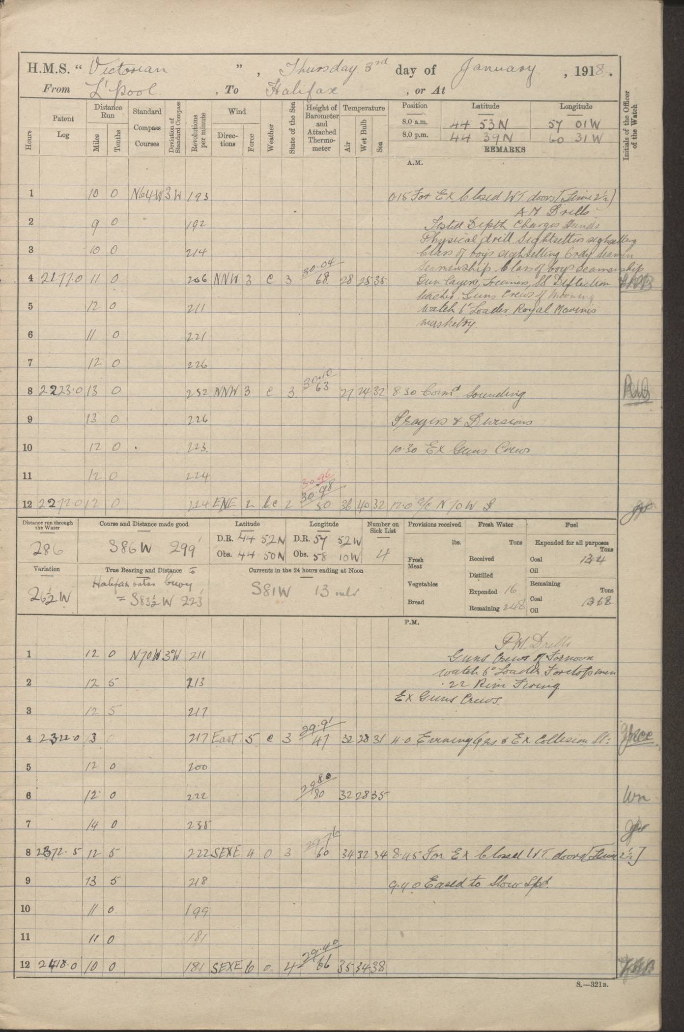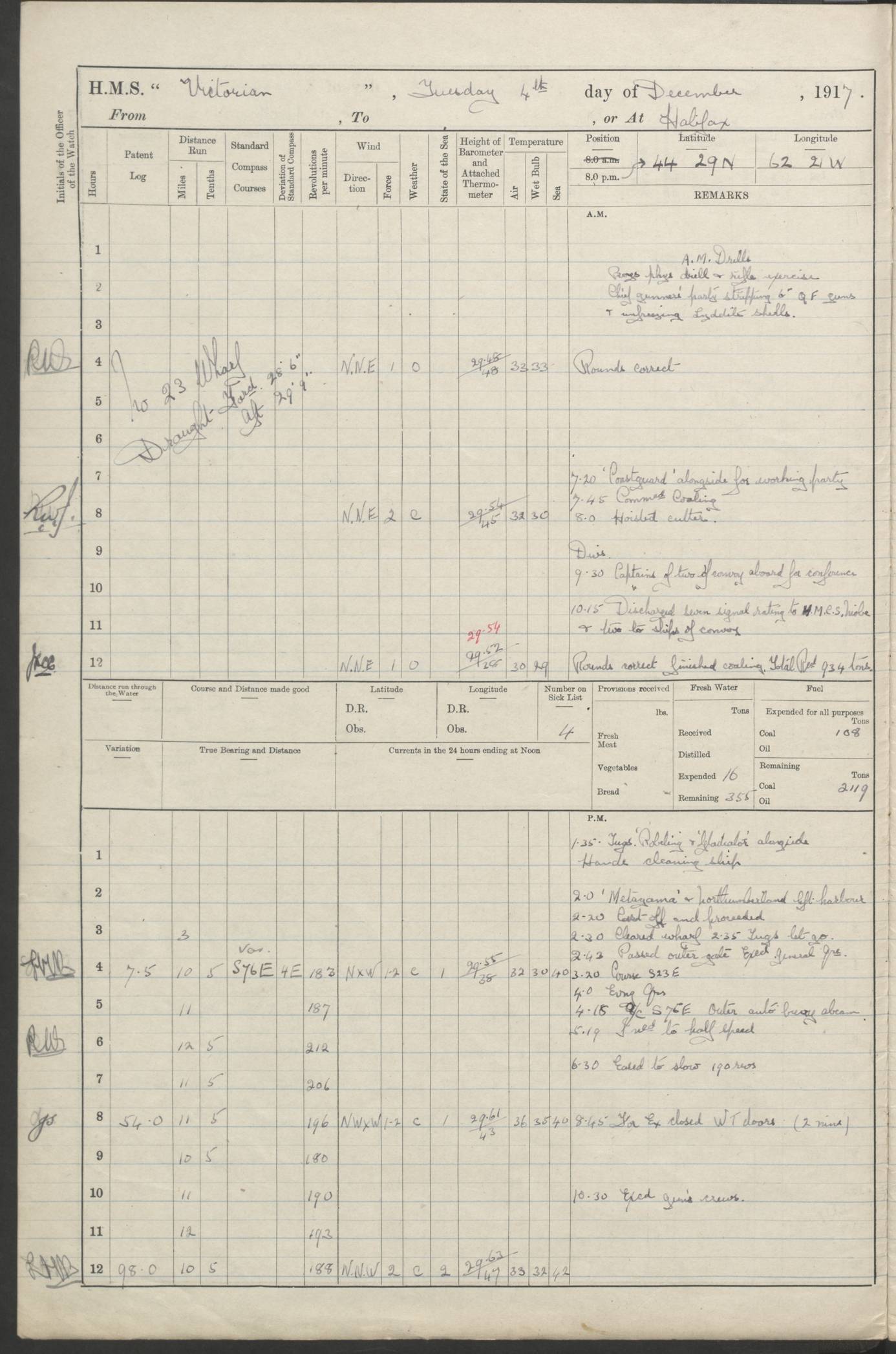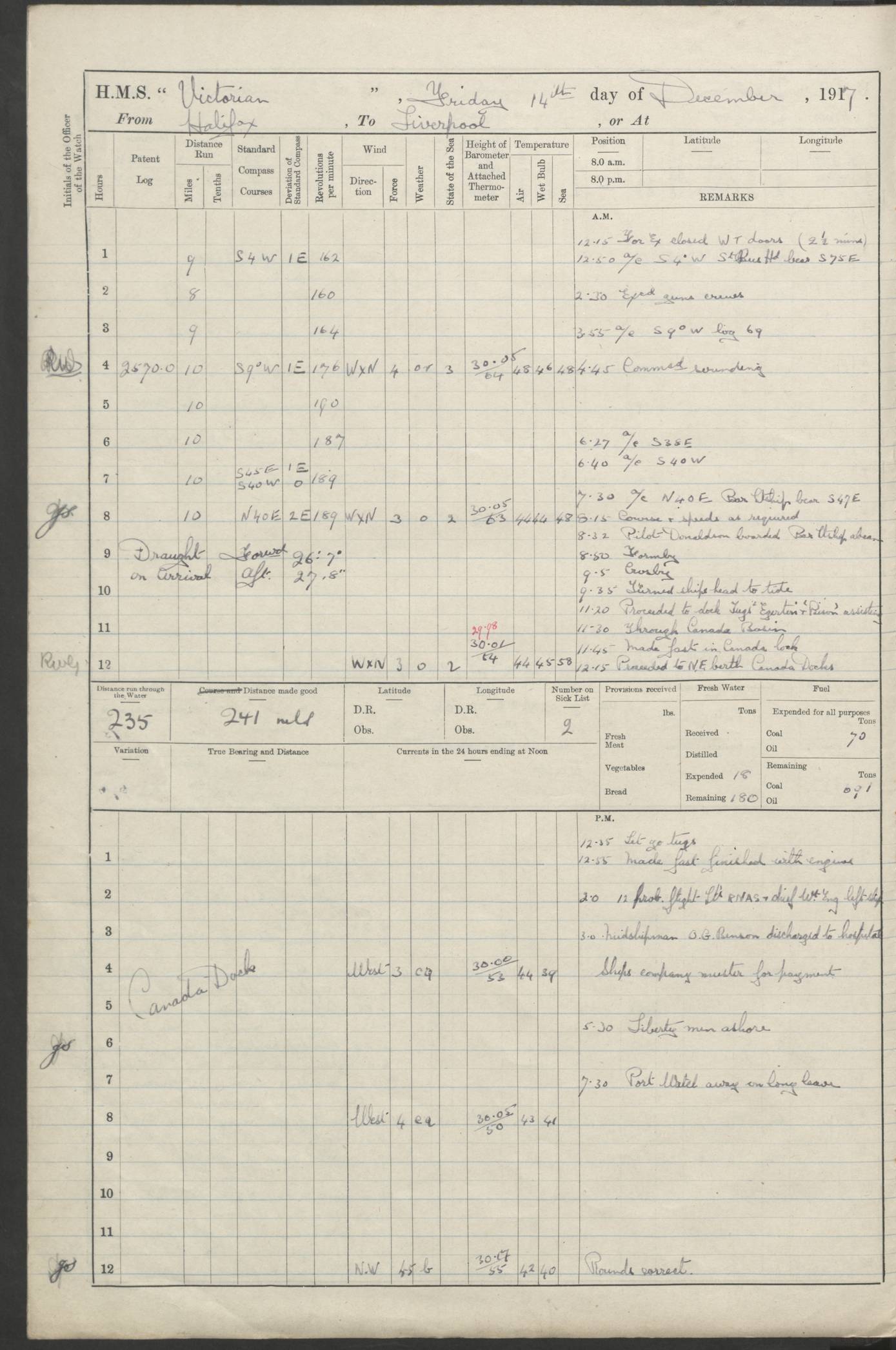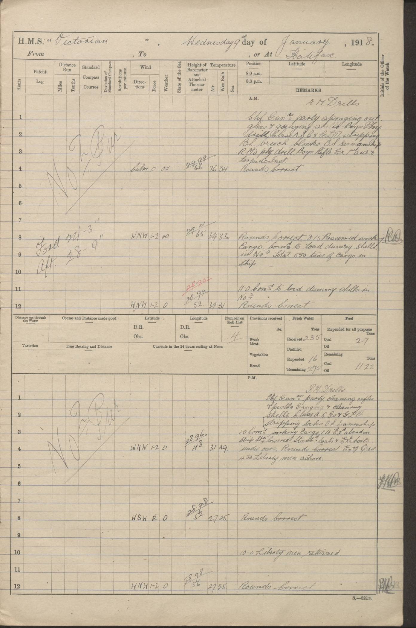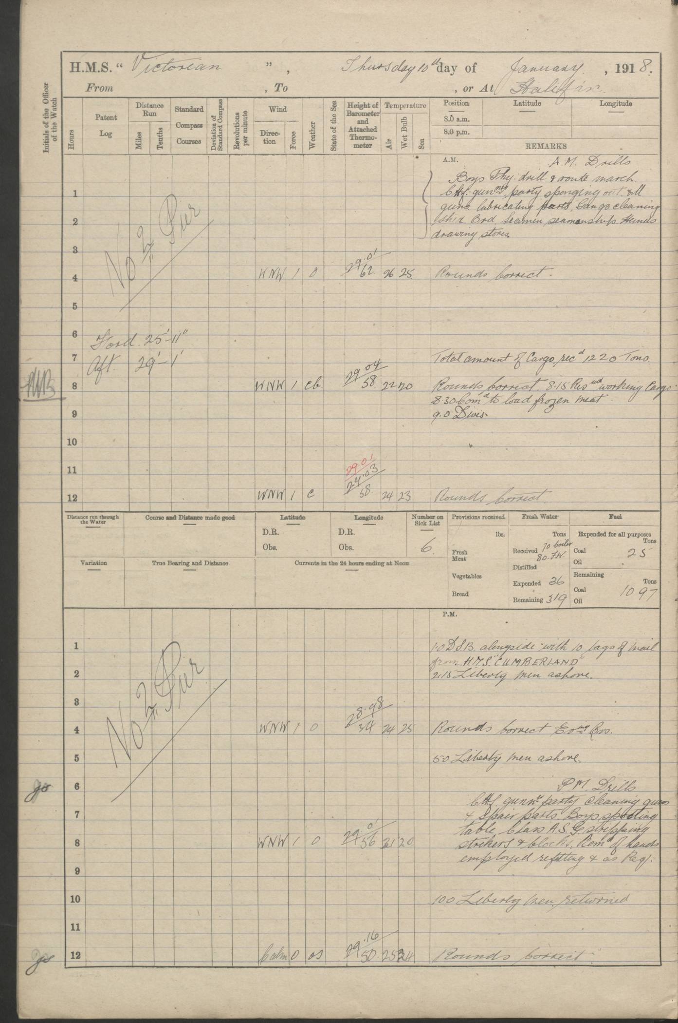 LOGS FOR JANUARY 1918 4caf8c4dcadfd341970358e2: (http://oldweather.s3.amazonaws.com/ADM 53-67407/ADM 53-67407-00001_0.jpg) [Left hand side of cover of Copy of Log for January 1918] 4caf8c4dcadfd341970358e3: (http://oldweather.s3.amazonaws.com/ADM 53-67407/ADM 53-67407-00001_1.jpg) [Right hand side of cover, signed by Navigating Officer, as before] 4caf8c4dcadfd341970358e4: (http://oldweather.s3.amazonaws.com/ADM 53-67407/ADM 53-67407-00002_0.jpg) [Blank page] 4caf8c4dcadfd341970358e5: (http://oldweather.s3.amazonaws.com/ADM 53-67407/ADM 53-67407-00002_1.jpg) [Page not filled in] 4caf8c4dcadfd341970358e6: (http://oldweather.s3.amazonaws.com/ADM 53-67407/ADM 53-67407-00003_0.jpg) [Details of Barometer and Thermometers, as previous month (though no numbers for Thermometers for Air Temperature)] 4caf8c4dcadfd341970358e7: (http://oldweather.s3.amazonaws.com/ADM 53-67407/ADM 53-67407-00003_1.jpg) 1 January 1918 From Liverpool to Halifax Lat 48.23, Long -45.67 [Position: 335 miles E of Newfoundland] 4.00am and 8.0am: In Station with convoy. am Drills: Tested Depth Charges. Class of boys Seamanship and ammunition. Sightsetters sight setting. Ordinary Seamen Seamanship. Royal Marines Signals. Deflection Teacher. Guns Crew of Morning watch to Loader. Noon: Altered course S77W, Log 87. In station with Convoy. pm: PM Drills. Guns Crews of Forenoon watch to Loader. Ship Company .22 Rim firing. 4.00pm: In station with Convoy. Evening Quarters. 4.12pm: Hauled in Log, foul and cleared. 5.00pm: Clocks put back 25 minutes. 6.00pm and Midnight: In station with Convoy. [Course and Distance made good: S54W, 335 miles] [Wind mostly southerly force 5 to 6 until 8pm, with rough sea for part of pm] 4caf8c4dcadfd341970358e8: (http://oldweather.s3.amazonaws.com/ADM 53-67407/ADM 53-67407-00004_0.jpg) 2 January 1918 From Liverpool to Halifax Lat 45.20, Long -51.15 [Position: 135 miles SE of Newfoundland] am: AM Drill. Tested Depth Charges. Hands Physical drill. Class Ordinary Seaman Gunners III 6 inch QF gun drill. Ordinary Seamen training Class ammunition. Class of Boys Torpedo Instructions. Gun layers and Trainers and Sight Setters Deflection Teacher. Guns crews of Morning watch to 6 inch Loader. 8.00am: In station with Convoy, altered course N65W, Log 36. Noon: Altered course N64W. SS METAGAMA proceeded to St John’s New Brunswick pm Drills: Junior Officers sightsetting. Guns Crews of Fornoon [Forenoon] watch 6 inch Loader. Foretopmen .22 Rim firing. 5.30pm: Clocks put back 30 minutes. [Distance made good: 299 miles] [Distance: to Halifax outer buoy = 521 miles] 4caf8c4dcadfd341970358e9: (http://oldweather.s3.amazonaws.com/ADM 53-67407/ADM 53-67407-00004_1.jpg) 3 January 1918 From Liverpool to Halifax Lat 44.83, Long -58.17 [Position 140 miles E of Nova Scotia] 8.30am: Commenced Sounding. [Course and Distance made good: S86W, 299 miles] [True Bearing and Distance: to Halifax outer buoy = S83.5W, 223 miles] 4caf8c4dcadfd341970358ea: (http://oldweather.s3.amazonaws.com/ADM 53-67407/ADM 53-67407-00005_0.jpg) 4 January 1918 From Liverpool to Halifax [and at Halifax NS] Lat 44.66, Long -63.58 [estimated] [Position: No 2 Pier, Halifax, Nova Scotia] 4.00am: Commenced Sounding. Increased to half Speed. 6.20am: Whistle buoy bearing N20W, altered course N22W, Log 85.5. 6.30am: Buoy abeam. 7.15am: Stopped and hauled in Log 96.5. 7.35am: Chebucto Light N49W. Proceeded North. 7.47am: Chebucto Light abeam. Dead Slow. 7.50am: Course and Speed as Requisite. 8.50am: First gate. 9.00am: Second gate. 9.10am: Pilot on board. Proceeded alongside No 2 Pier. Tugs Canso, Gladiator and Weatherspoon [probably WM Weatherspoon] assisting. 9.30am: Entered dock. 9.40am: Made fast. 10.00am: HE [His Excellency] Sir WE Davidson left ship. Cargo party Stevedores on board. [Wharf No 2] pm Drills: Chief Gunner parties sponging and cleaning out all guns. Remainder of hands employed cleaning holds for Cargo. 5.00pm: Liberty men ashore. [Distance made good: 240 miles] [Noon Position] [Halifax No 2 Wharf] [Fuel Remaining: Coal 1262 tons] [Rain for most of day, noon temperature 37F] [Note: Tug “Canso” (listed here as 126803) was built and registered in Yarmouth, Nova Scotia, in 1910 and owned by The Minister of Public Works for the Dominion of Canada, Ottawa. Tug “WM Weatherspoon” (listed here as 94697) was built in Digby, Nova Scotia, in 1890, registered in Sydney, Nova Scotia, in 1908 and owned by Hugh McDonald, Sydney.] 4caf8c4dcadfd341970358eb: (http://oldweather.s3.amazonaws.com/ADM 53-67407/ADM 53-67407-00005_1.jpg) 5 January 1918 At Halifax Lat 44.66, Long -63.58 [Position: No 2 Pier, Halifax, Nova Scotia] [Wharf No 2 Halifax] am Drills: Chief gunners parties examining exposed ammunition. Cleaning guns and Shells. am: Commenced loading Steel bars No 2 and No 4 Hatch. Hands employed taking stores on board and Saturday Routine. Party of Men ashore at dockyard for stores. 1.15pm: Liberty men ashore. 2.15pm: Resumed working Cargo No 4. 3.45pm and 4.45pm: Liberty men ashore. 4caf8c4dcadfd341970358ec: (http://oldweather.s3.amazonaws.com/ADM 53-67407/ADM 53-67407-00006_0.jpg) 6 January 1918 At Halifax Lat 44.66, Long -63.58 [Position: No 2 Pier, Halifax, Nova Scotia] [No 2 Pier] 8.00am: Rounds Correct. USS “SOUTH DAKOTA” entered harbour. 9.00am: Officer of guard left ship in cutter. 9.45am: Officer of guard returned. 10.00am: RC party ashore. Divisions and Captain’s Inspections and Divine Service. 11.00am: RC party returned. 2.00pm: Signal Rating discharged to the NIOBE. 4.30pm: Liberty men ashore. 10.00pm: Liberty men returned. [Note: USS “South Dakota” (Armored Cruiser No 9, later ACR-9) was built in California and launched in 1904; she was in commission from 1907 and in 1920 was reclassified as CA-9 and renamed “Huron”; she was sold for scrap in 1930; she was towed to Powell River, British Colombia, in 1931 and used as a breakwater (more details here).] 4caf8c4dcadfd341970358ed: (http://oldweather.s3.amazonaws.com/ADM 53-67407/