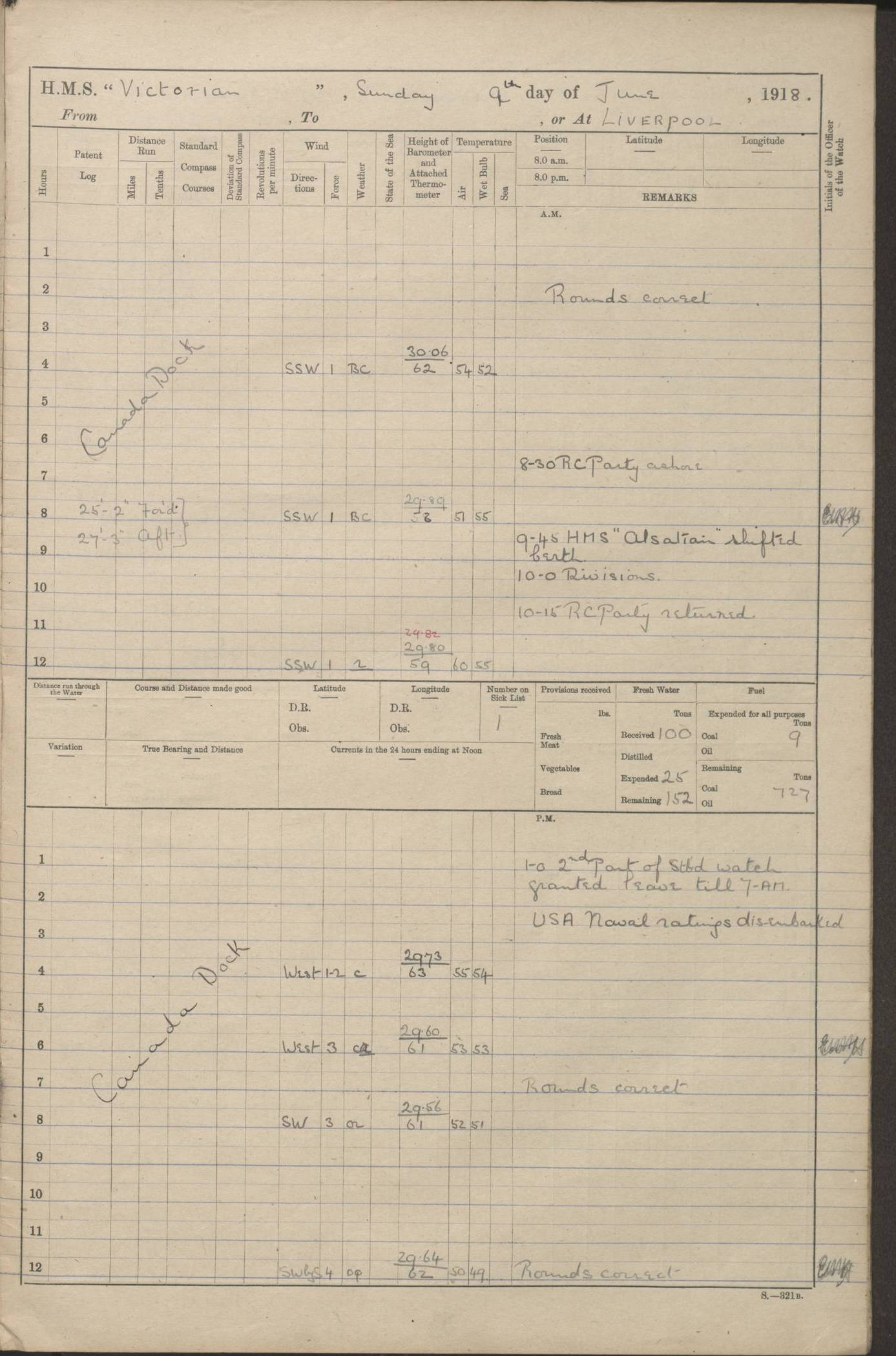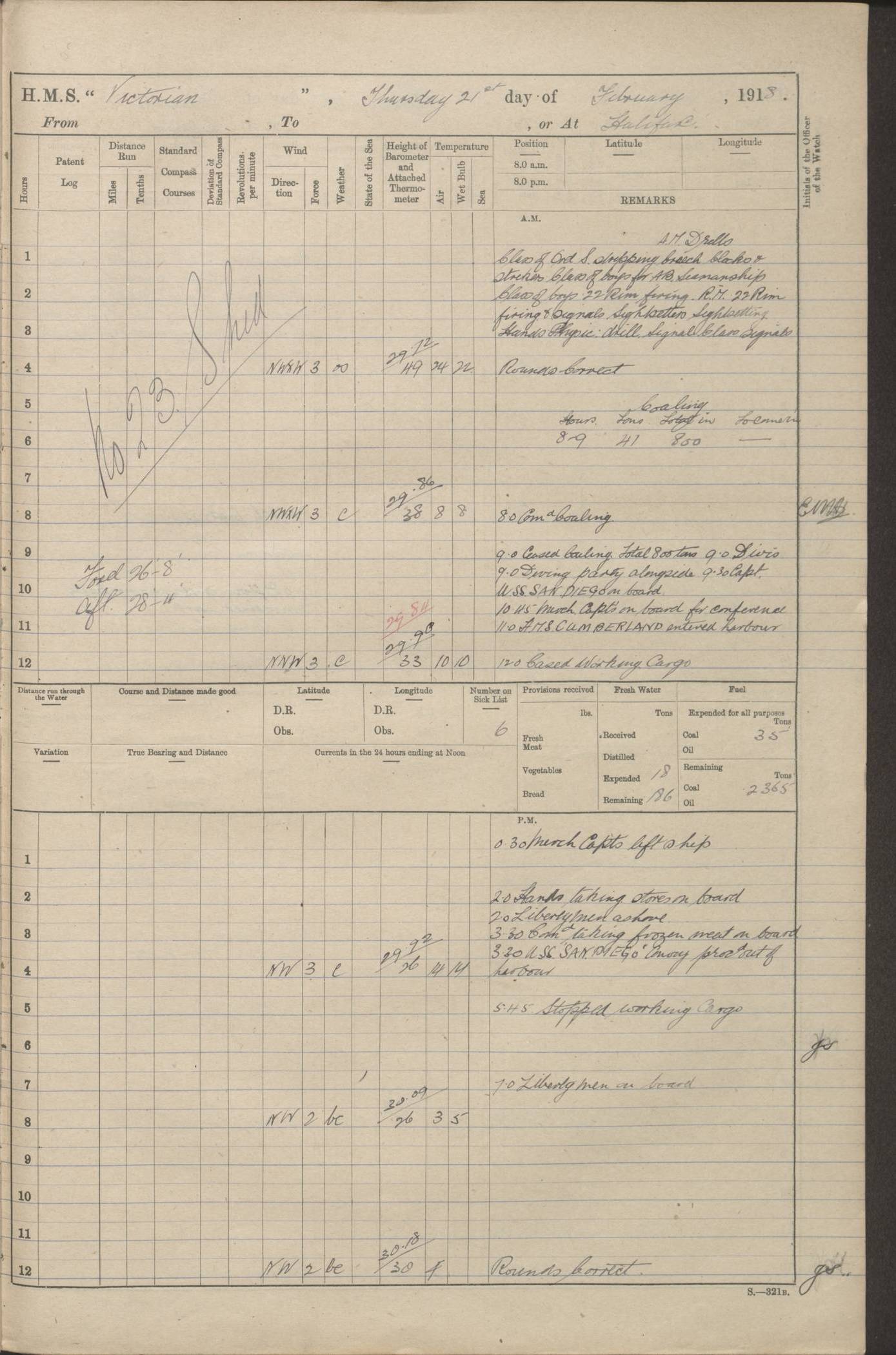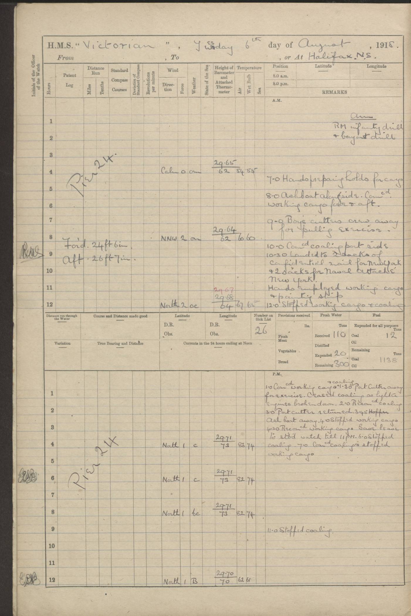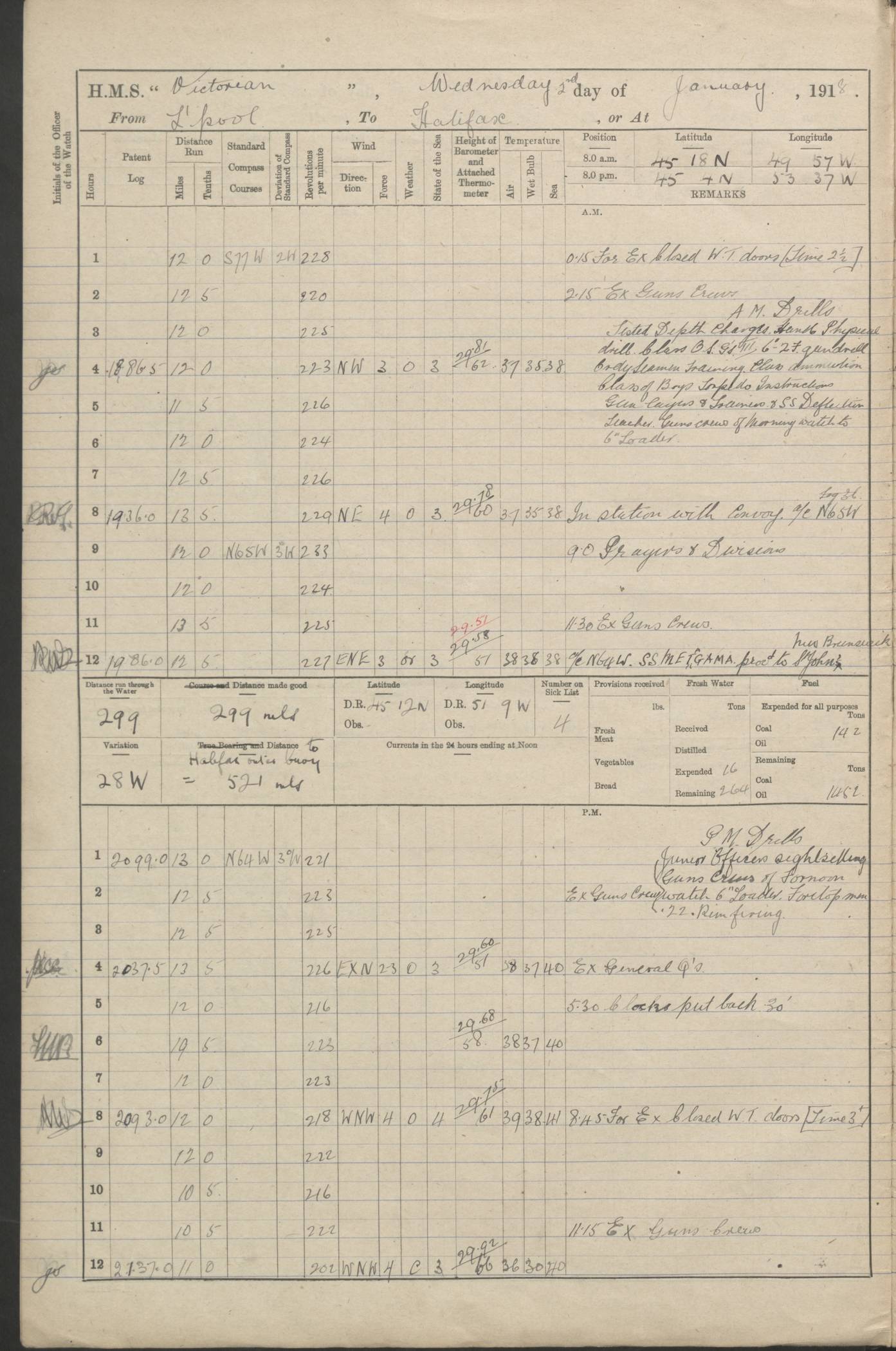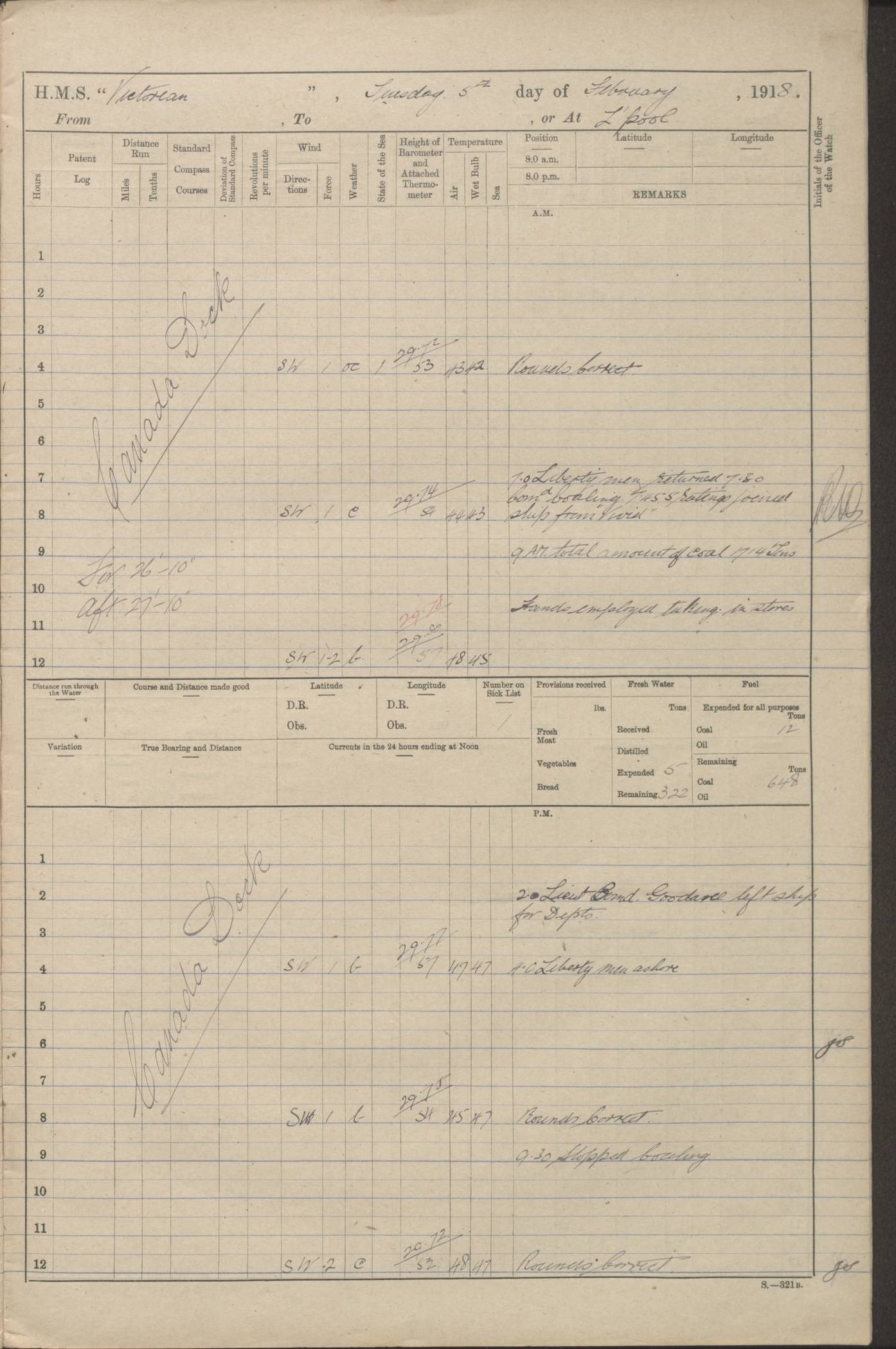 LOGS FOR JANUARY 1918 4caf8c4dcadfd341970358e2: (http://oldweather.s3.amazonaws.com/ADM 53-67407/ADM 53-67407-00001_0.jpg) [Left hand side of cover of Copy of Log for January 1918] 4caf8c4dcadfd341970358e3: (http://oldweather.s3.amazonaws.com/ADM 53-67407/ADM 53-67407-00001_1.jpg) [Right hand side of cover, signed by Navigating Officer, as before] 4caf8c4dcadfd341970358e4: (http://oldweather.s3.amazonaws.com/ADM 53-67407/ADM 53-67407-00002_0.jpg) [Blank page] 4caf8c4dcadfd341970358e5: (http://oldweather.s3.amazonaws.com/ADM 53-67407/ADM 53-67407-00002_1.jpg) [Page not filled in] 4caf8c4dcadfd341970358e6: (http://oldweather.s3.amazonaws.com/ADM 53-67407/ADM 53-67407-00003_0.jpg) [Details of Barometer and Thermometers, as previous month (though no numbers for Thermometers for Air Temperature)] 4caf8c4dcadfd341970358e7: (http://oldweather.s3.amazonaws.com/ADM 53-67407/ADM 53-67407-00003_1.jpg) 1 January 1918 From Liverpool to Halifax Lat 48.23, Long -45.67 [Position: 335 miles E of Newfoundland] 4.00am and 8.0am: In Station with convoy. am Drills: Tested Depth Charges. Class of boys Seamanship and ammunition. Sightsetters sight setting. Ordinary Seamen Seamanship. Royal Marines Signals. Deflection Teacher. Guns Crew of Morning watch to Loader. Noon: Altered course S77W, Log 87. In station with Convoy. pm: PM Drills. Guns Crews of Forenoon watch to Loader. Ship Company .22 Rim firing. 4.00pm: In station with Convoy. Evening Quarters. 4.12pm: Hauled in Log, foul and cleared. 5.00pm: Clocks put back 25 minutes. 6.00pm and Midnight: In station with Convoy. [Course and Distance made good: S54W, 335 miles] [Wind mostly southerly force 5 to 6 until 8pm, with rough sea for part of pm] 4caf8c4dcadfd341970358e8: (http://oldweather.s3.amazonaws.com/ADM 53-67407/ADM 53-67407-00004_0.jpg) 2 January 1918 From Liverpool to Halifax Lat 45.20, Long -51.15 [Position: 135 miles SE of Newfoundland] am: AM Drill. Tested Depth Charges. Hands Physical drill. Class Ordinary Seaman Gunners III 6 inch QF gun drill. Ordinary Seamen training Class ammunition. Class of Boys Torpedo Instructions. Gun layers and Trainers and Sight Setters Deflection Teacher. Guns crews of Morning watch to 6 inch Loader. 8.00am: In station with Convoy, altered course N65W, Log 36. Noon: Altered course N64W. SS METAGAMA proceeded to St John’s New Brunswick pm Drills: Junior Officers sightsetting. Guns Crews of Fornoon [Forenoon] watch 6 inch Loader. Foretopmen .22 Rim firing. 5.30pm: Clocks put back 30 minutes. [Distance made good: 299 miles] [Distance: to Halifax outer buoy = 521 miles] 4caf8c4dcadfd341970358e9: (http://oldweather.s3.amazonaws.com/ADM 53-67407/ADM 53-67407-00004_1.jpg) 3 January 1918 From Liverpool to Halifax Lat 44.83, Long -58.17 [Position 140 miles E of Nova Scotia] 8.30am: Commenced Sounding. [Course and Distance made good: S86W, 299 miles] [True Bearing and Distance: to Halifax outer buoy = S83.5W, 223 miles] 4caf8c4dcadfd341970358ea: (http://oldweather.s3.amazonaws.com/ADM 53-67407/ADM 53-67407-00005_0.jpg) 4 January 1918 From Liverpool to Halifax [and at Halifax NS] Lat 44.66, Long -63.58 [estimated] [Position: No 2 Pier, Halifax, Nova Scotia] 4.00am: Commenced Sounding. Increased to half Speed. 6.20am: Whistle buoy bearing N20W, altered course N22W, Log 85.5. 6.30am: Buoy abeam. 7.15am: Stopped and hauled in Log 96.5. 7.35am: Chebucto Light N49W. Proceeded North. 7.47am: Chebucto Light abeam. Dead Slow. 7.50am: Course and Speed as Requisite. 8.50am: First gate. 9.00am: Second gate. 9.10am: Pilot on board. Proceeded alongside No 2 Pier. Tugs Canso, Gladiator and Weatherspoon [probably WM Weatherspoon] assisting. 9.30am: Entered dock. 9.40am: Made fast. 10.00am: HE [His Excellency] Sir WE Davidson left ship. Cargo party Stevedores on board. [Wharf No 2] pm Drills: Chief Gunner parties sponging and cleaning out all guns. Remainder of hands employed cleaning holds for Cargo. 5.00pm: Liberty men ashore. [Distance made good: 240 miles] [Noon Position] [Halifax No 2 Wharf] [Fuel Remaining: Coal 1262 tons] [Rain for most of day, noon temperature 37F] [Note: Tug “Canso” (listed here as 126803) was built and registered in Yarmouth, Nova Scotia, in 1910 and owned by The Minister of Public Works for the Dominion of Canada, Ottawa. Tug “WM Weatherspoon” (listed here as 94697) was built in Digby, Nova Scotia, in 1890, registered in Sydney, Nova Scotia, in 1908 and owned by Hugh McDonald, Sydney.] 4caf8c4dcadfd341970358eb: (http://oldweather.s3.amazonaws.com/ADM 53-67407/ADM 53-67407-00005_1.jpg) 5 January 1918 At Halifax Lat 44.66, Long -63.58 [Position: No 2 Pier, Halifax, Nova Scotia] [Wharf No 2 Halifax] am Drills: Chief gunners parties examining exposed ammunition. Cleaning guns and Shells. am: Commenced loading Steel bars No 2 and No 4 Hatch. Hands employed taking stores on board and Saturday Routine. Party of Men ashore at dockyard for stores. 1.15pm: Liberty men ashore. 2.15pm: Resumed working Cargo No 4. 3.45pm and 4.45pm: Liberty men ashore. 4caf8c4dcadfd341970358ec: (http://oldweather.s3.amazonaws.com/ADM 53-67407/ADM 53-67407-00006_0.jpg) 6 January 1918 At Halifax Lat 44.66, Long -63.58 [Position: No 2 Pier, Halifax, Nova Scotia] [No 2 Pier] 8.00am: Rounds Correct. USS “SOUTH DAKOTA” entered harbour. 9.00am: Officer of guard left ship in cutter. 9.45am: Officer of guard returned. 10.00am: RC party ashore. Divisions and Captain’s Inspections and Divine Service. 11.00am: RC party returned. 2.00pm: Signal Rating discharged to the NIOBE. 4.30pm: Liberty men ashore. 10.00pm: Liberty men returned. [Note: USS “South Dakota” (Armored Cruiser No 9, later ACR-9) was built in California and launched in 1904; she was in commission from 1907 and in 1920 was reclassified as CA-9 and renamed “Huron”; she was sold for scrap in 1930; she was towed to Powell River, British Colombia, in 1931 and used as a breakwater (more details here).] 4caf8c4dcadfd341970358ed: (http://oldweather.s3.amazonaws.com/ADM 53-67407/
