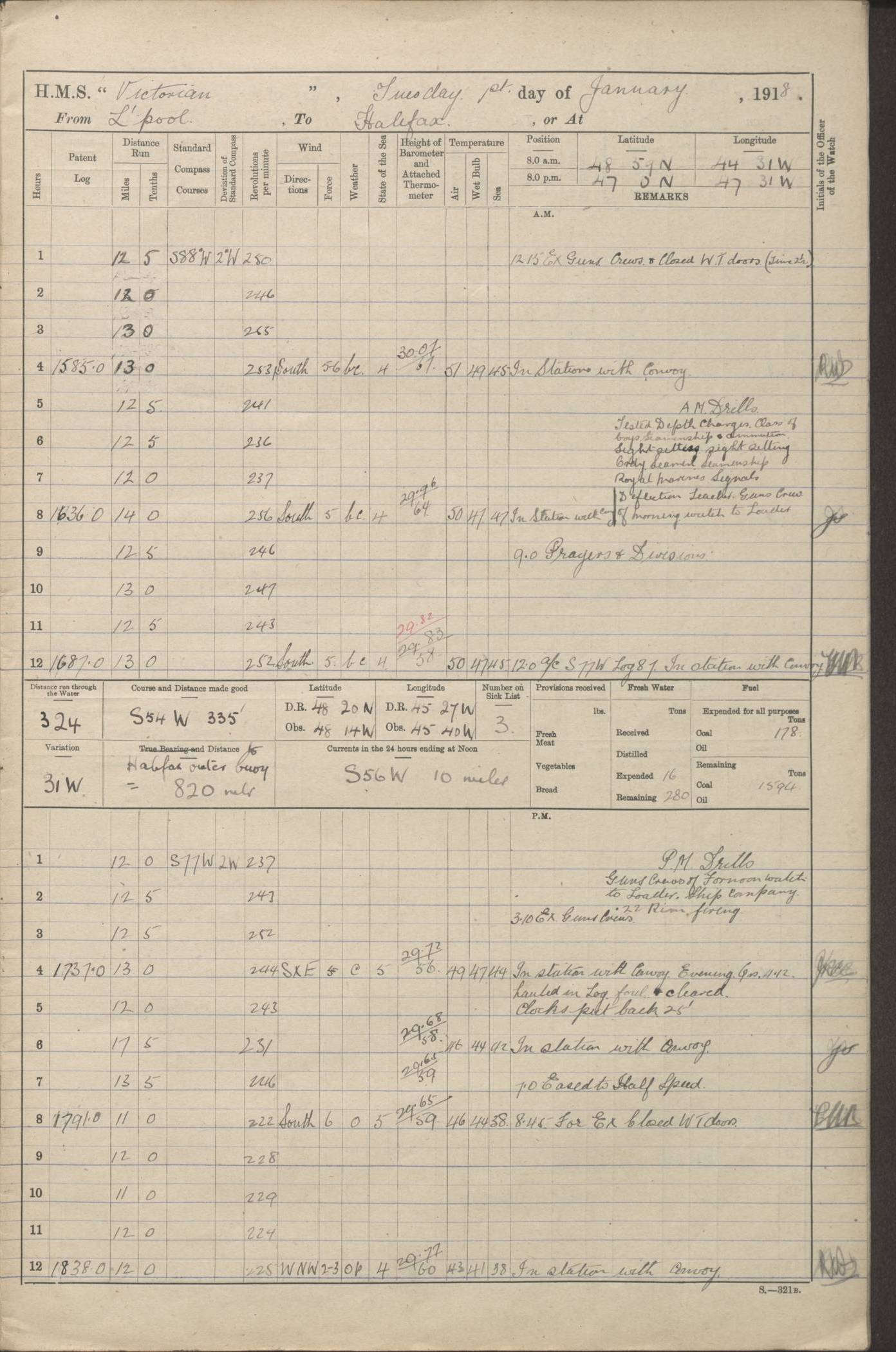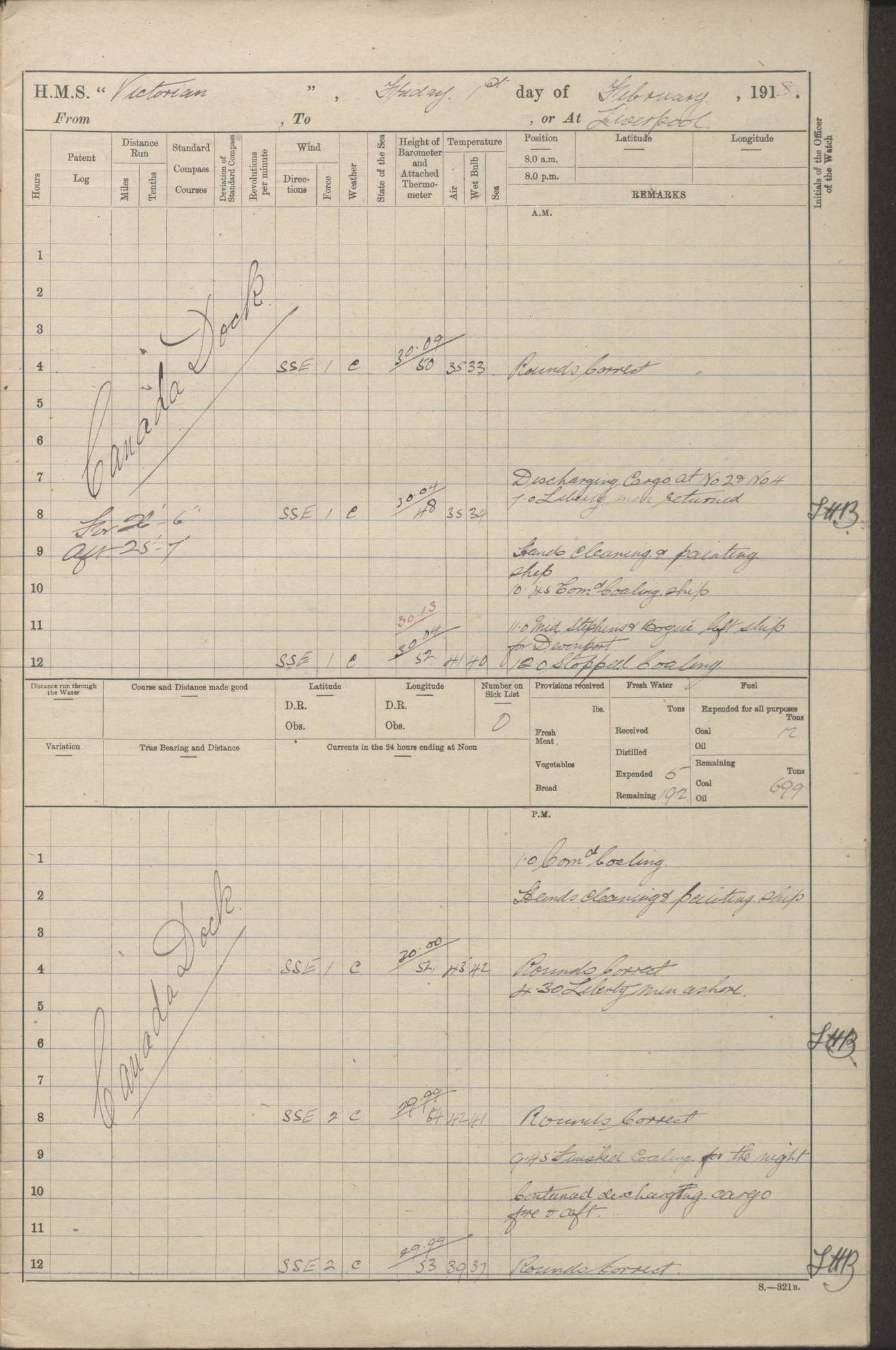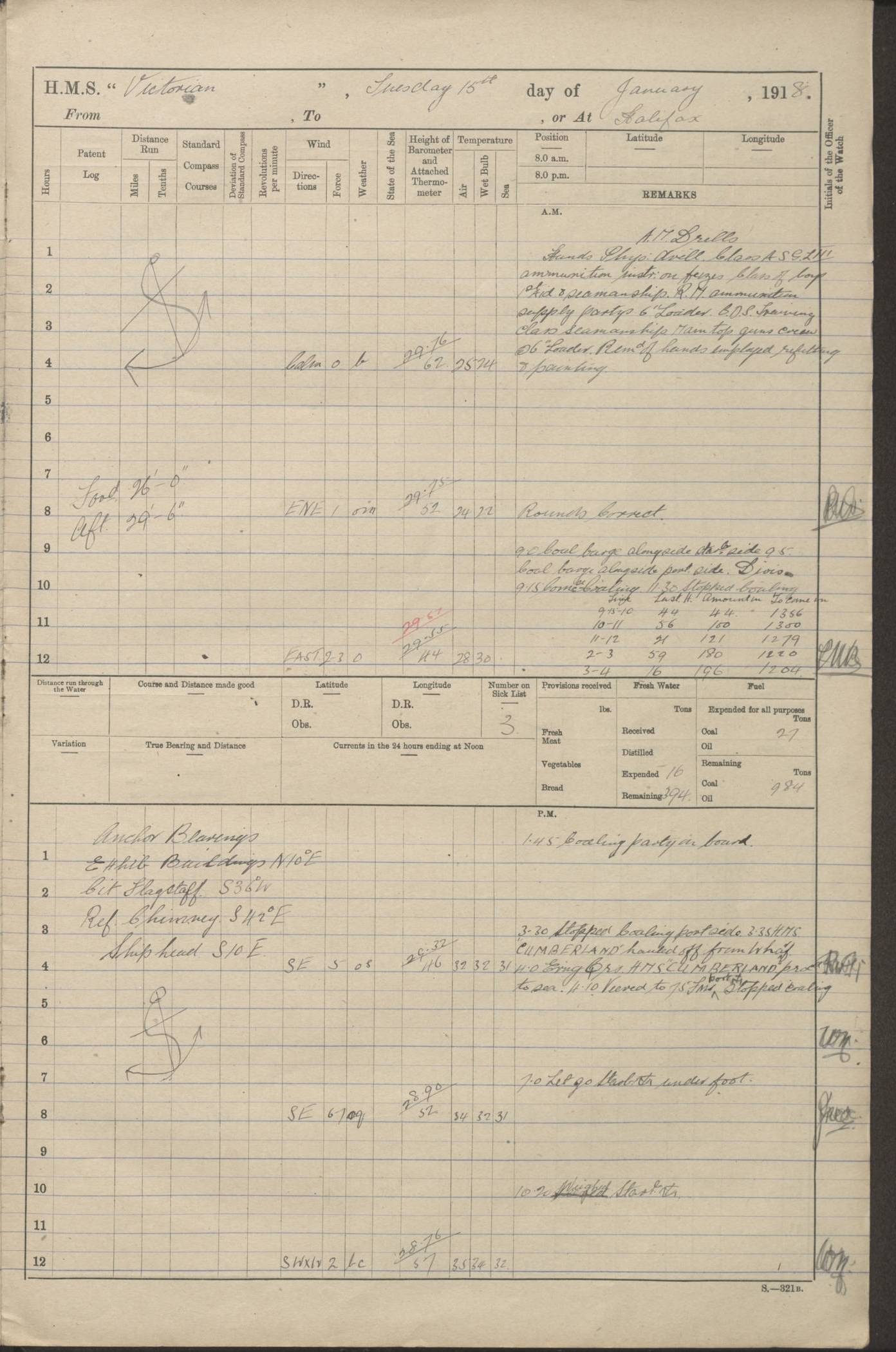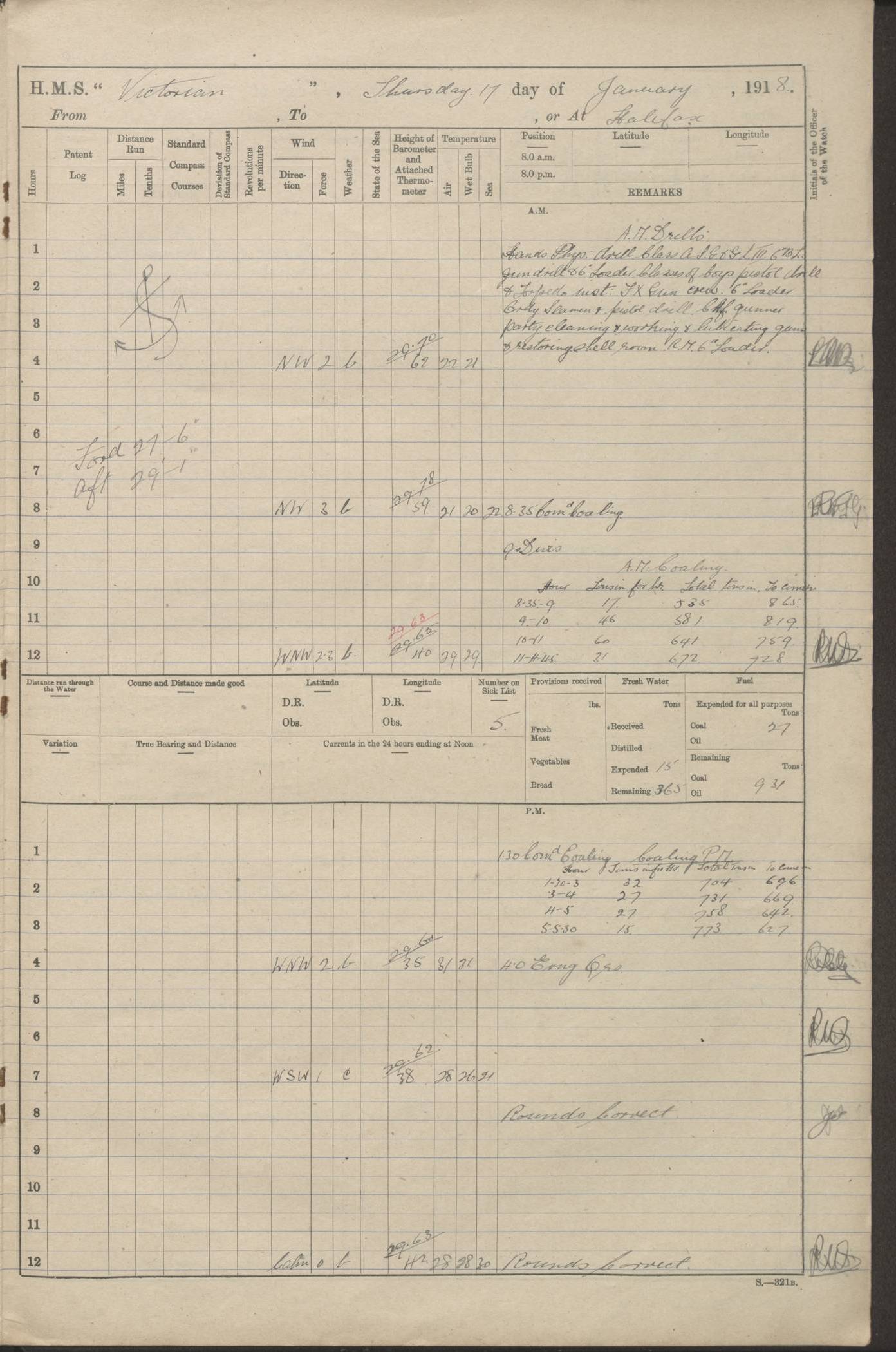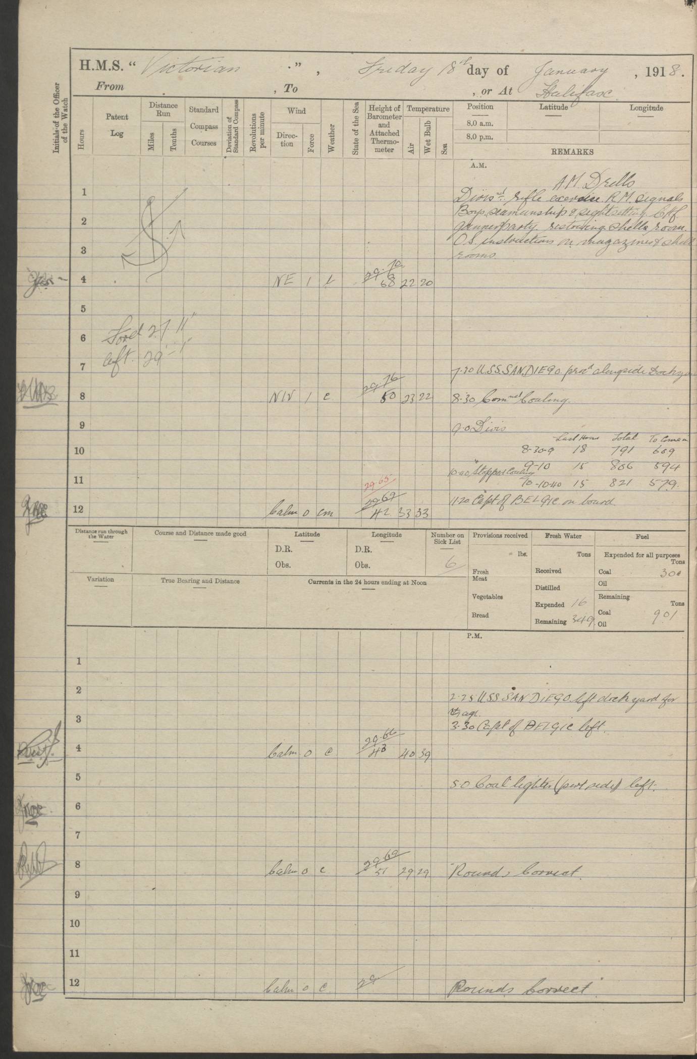 LOGS FOR JANUARY 1918 4caf8c4dcadfd341970358e2: (http://oldweather.s3.amazonaws.com/ADM 53-67407/ADM 53-67407-00001_0.jpg) [Left hand side of cover of Copy of Log for January 1918] 4caf8c4dcadfd341970358e3: (http://oldweather.s3.amazonaws.com/ADM 53-67407/ADM 53-67407-00001_1.jpg) [Right hand side of cover, signed by Navigating Officer, as before] 4caf8c4dcadfd341970358e4: (http://oldweather.s3.amazonaws.com/ADM 53-67407/ADM 53-67407-00002_0.jpg) [Blank page] 4caf8c4dcadfd341970358e5: (http://oldweather.s3.amazonaws.com/ADM 53-67407/ADM 53-67407-00002_1.jpg) [Page not filled in] 4caf8c4dcadfd341970358e6: (http://oldweather.s3.amazonaws.com/ADM 53-67407/ADM 53-67407-00003_0.jpg) [Details of Barometer and Thermometers, as previous month (though no numbers for Thermometers for Air Temperature)] 4caf8c4dcadfd341970358e7: (http://oldweather.s3.amazonaws.com/ADM 53-67407/ADM 53-67407-00003_1.jpg) 1 January 1918 From Liverpool to Halifax Lat 48.23, Long -45.67 [Position: 335 miles E of Newfoundland] 4.00am and 8.0am: In Station with convoy. am Drills: Tested Depth Charges. Class of boys Seamanship and ammunition. Sightsetters sight setting. Ordinary Seamen Seamanship. Royal Marines Signals. Deflection Teacher. Guns Crew of Morning watch to Loader. Noon: Altered course S77W, Log 87. In station with Convoy. pm: PM Drills. Guns Crews of Forenoon watch to Loader. Ship Company .22 Rim firing. 4.00pm: In station with Convoy. Evening Quarters. 4.12pm: Hauled in Log, foul and cleared. 5.00pm: Clocks put back 25 minutes. 6.00pm and Midnight: In station with Convoy. [Course and Distance made good: S54W, 335 miles] [Wind mostly southerly force 5 to 6 until 8pm, with rough sea for part of pm] 4caf8c4dcadfd341970358e8: (http://oldweather.s3.amazonaws.com/ADM 53-67407/ADM 53-67407-00004_0.jpg) 2 January 1918 From Liverpool to Halifax Lat 45.20, Long -51.15 [Position: 135 miles SE of Newfoundland] am: AM Drill. Tested Depth Charges. Hands Physical drill. Class Ordinary Seaman Gunners III 6 inch QF gun drill. Ordinary Seamen training Class ammunition. Class of Boys Torpedo Instructions. Gun layers and Trainers and Sight Setters Deflection Teacher. Guns crews of Morning watch to 6 inch Loader. 8.00am: In station with Convoy, altered course N65W, Log 36. Noon: Altered course N64W. SS METAGAMA proceeded to St John’s New Brunswick pm Drills: Junior Officers sightsetting. Guns Crews of Fornoon [Forenoon] watch 6 inch Loader. Foretopmen .22 Rim firing. 5.30pm: Clocks put back 30 minutes. [Distance made good: 299 miles] [Distance: to Halifax outer buoy = 521 miles] 4caf8c4dcadfd341970358e9: (http://oldweather.s3.amazonaws.com/ADM 53-67407/ADM 53-67407-00004_1.jpg) 3 January 1918 From Liverpool to Halifax Lat 44.83, Long -58.17 [Position 140 miles E of Nova Scotia] 8.30am: Commenced Sounding. [Course and Distance made good: S86W, 299 miles] [True Bearing and Distance: to Halifax outer buoy = S83.5W, 223 miles] 4caf8c4dcadfd341970358ea: (http://oldweather.s3.amazonaws.com/ADM 53-67407/ADM 53-67407-00005_0.jpg) 4 January 1918 From Liverpool to Halifax [and at Halifax NS] Lat 44.66, Long -63.58 [estimated] [Position: No 2 Pier, Halifax, Nova Scotia] 4.00am: Commenced Sounding. Increased to half Speed. 6.20am: Whistle buoy bearing N20W, altered course N22W, Log 85.5. 6.30am: Buoy abeam. 7.15am: Stopped and hauled in Log 96.5. 7.35am: Chebucto Light N49W. Proceeded North. 7.47am: Chebucto Light abeam. Dead Slow. 7.50am: Course and Speed as Requisite. 8.50am: First gate. 9.00am: Second gate. 9.10am: Pilot on board. Proceeded alongside No 2 Pier. Tugs Canso, Gladiator and Weatherspoon [probably WM Weatherspoon] assisting. 9.30am: Entered dock. 9.40am: Made fast. 10.00am: HE [His Excellency] Sir WE Davidson left ship. Cargo party Stevedores on board. [Wharf No 2] pm Drills: Chief Gunner parties sponging and cleaning out all guns. Remainder of hands employed cleaning holds for Cargo. 5.00pm: Liberty men ashore. [Distance made good: 240 miles] [Noon Position] [Halifax No 2 Wharf] [Fuel Remaining: Coal 1262 tons] [Rain for most of day, noon temperature 37F] [Note: Tug “Canso” (listed here as 126803) was built and registered in Yarmouth, Nova Scotia, in 1910 and owned by The Minister of Public Works for the Dominion of Canada, Ottawa. Tug “WM Weatherspoon” (listed here as 94697) was built in Digby, Nova Scotia, in 1890, registered in Sydney, Nova Scotia, in 1908 and owned by Hugh McDonald, Sydney.] 4caf8c4dcadfd341970358eb: (http://oldweather.s3.amazonaws.com/ADM 53-67407/ADM 53-67407-00005_1.jpg) 5 January 1918 At Halifax Lat 44.66, Long -63.58 [Position: No 2 Pier, Halifax, Nova Scotia] [Wharf No 2 Halifax] am Drills: Chief gunners parties examining exposed ammunition. Cleaning guns and Shells. am: Commenced loading Steel bars No 2 and No 4 Hatch. Hands employed taking stores on board and Saturday Routine. Party of Men ashore at dockyard for stores. 1.15pm: Liberty men ashore. 2.15pm: Resumed working Cargo No 4. 3.45pm and 4.45pm: Liberty men ashore. 4caf8c4dcadfd341970358ec: (http://oldweather.s3.amazonaws.com/ADM 53-67407/ADM 53-67407-00006_0.jpg) 6 January 1918 At Halifax Lat 44.66, Long -63.58 [Position: No 2 Pier, Halifax, Nova Scotia] [No 2 Pier] 8.00am: Rounds Correct. USS “SOUTH DAKOTA” entered harbour. 9.00am: Officer of guard left ship in cutter. 9.45am: Officer of guard returned. 10.00am: RC party ashore. Divisions and Captain’s Inspections and Divine Service. 11.00am: RC party returned. 2.00pm: Signal Rating discharged to the NIOBE. 4.30pm: Liberty men ashore. 10.00pm: Liberty men returned. [Note: USS “South Dakota” (Armored Cruiser No 9, later ACR-9) was built in California and launched in 1904; she was in commission from 1907 and in 1920 was reclassified as CA-9 and renamed “Huron”; she was sold for scrap in 1930; she was towed to Powell River, British Colombia, in 1931 and used as a breakwater (more details here).] 4caf8c4dcadfd341970358ed: (http://oldweather.s3.amazonaws.com/ADM 53-67407/
