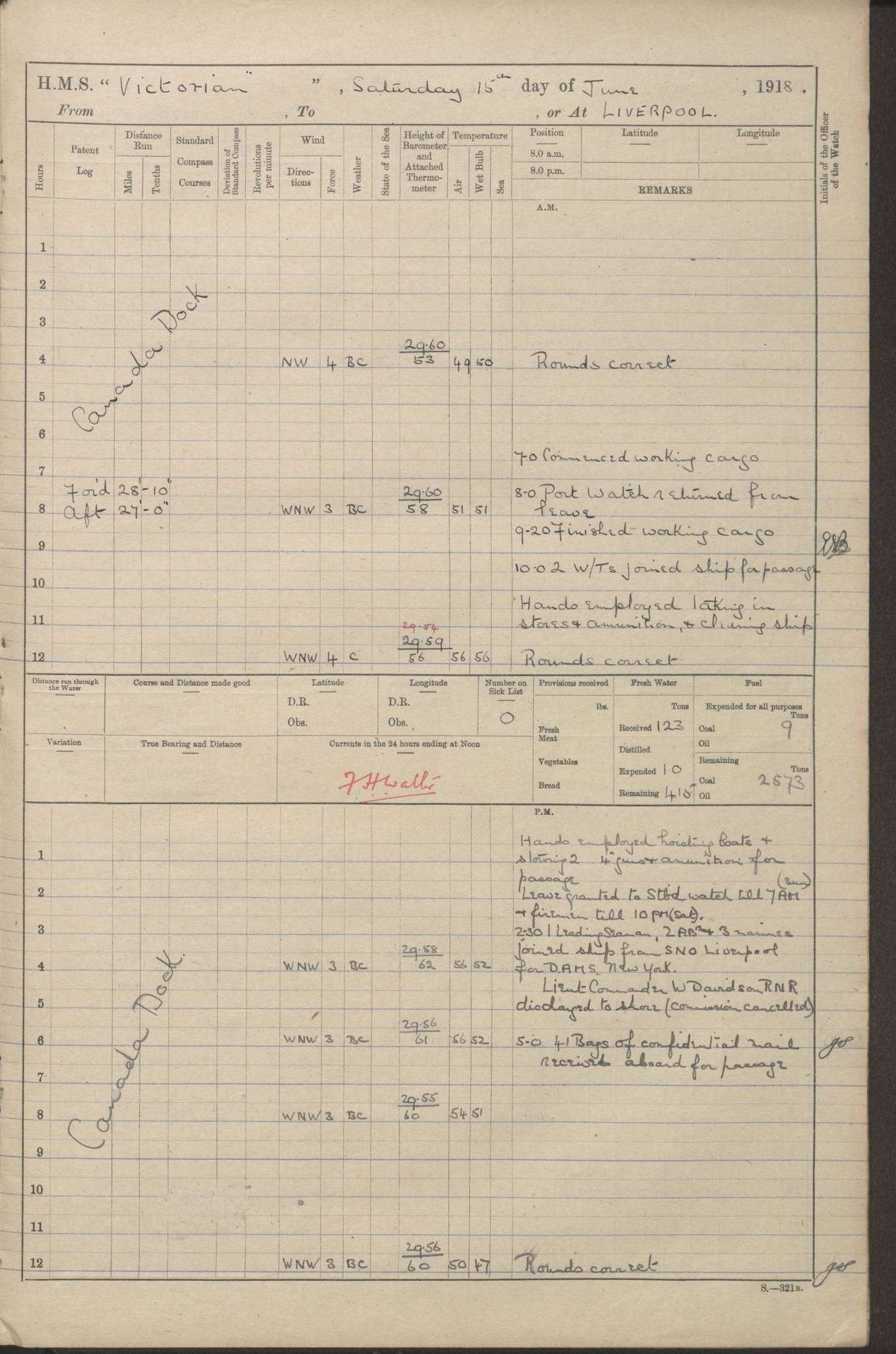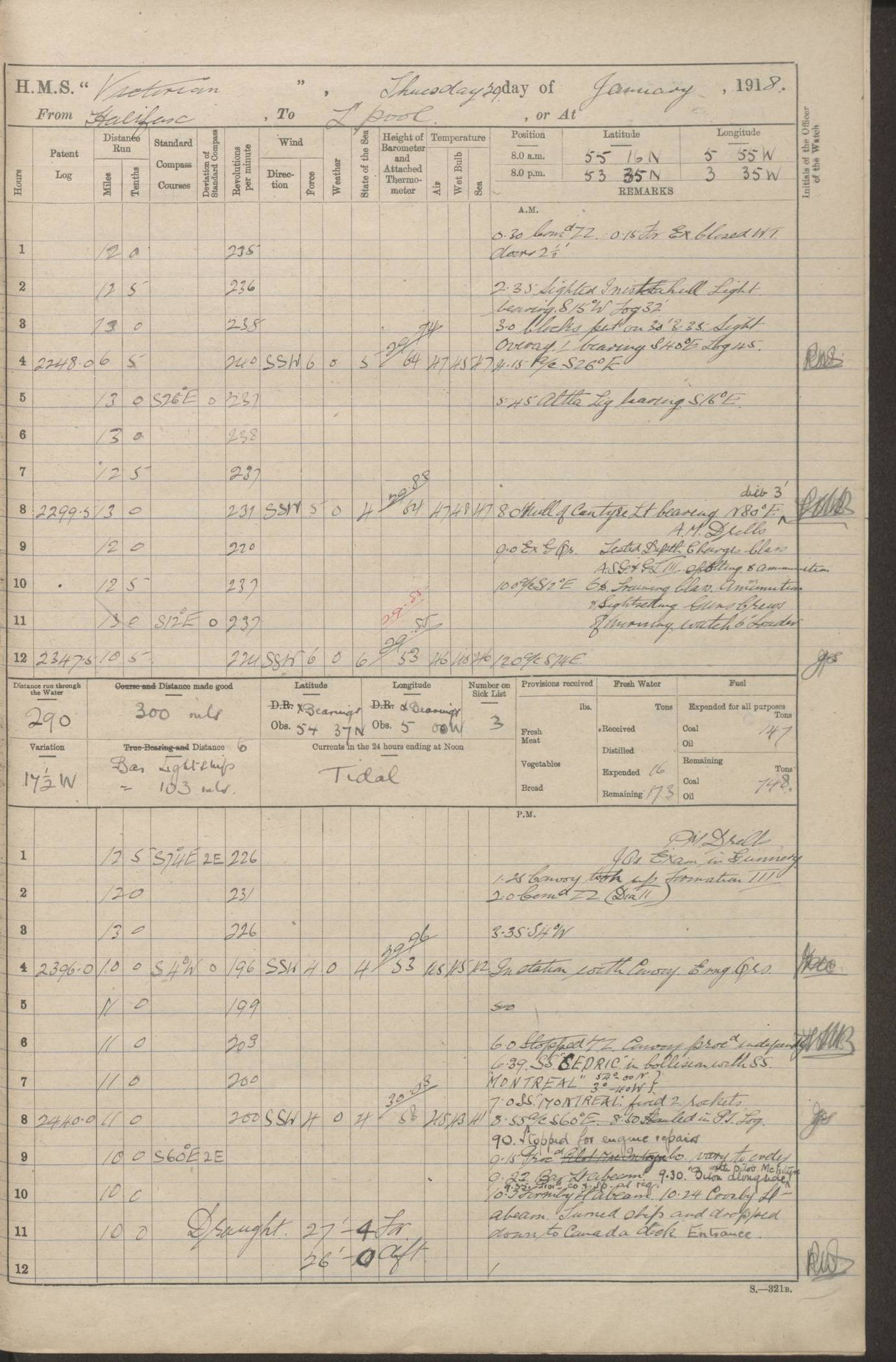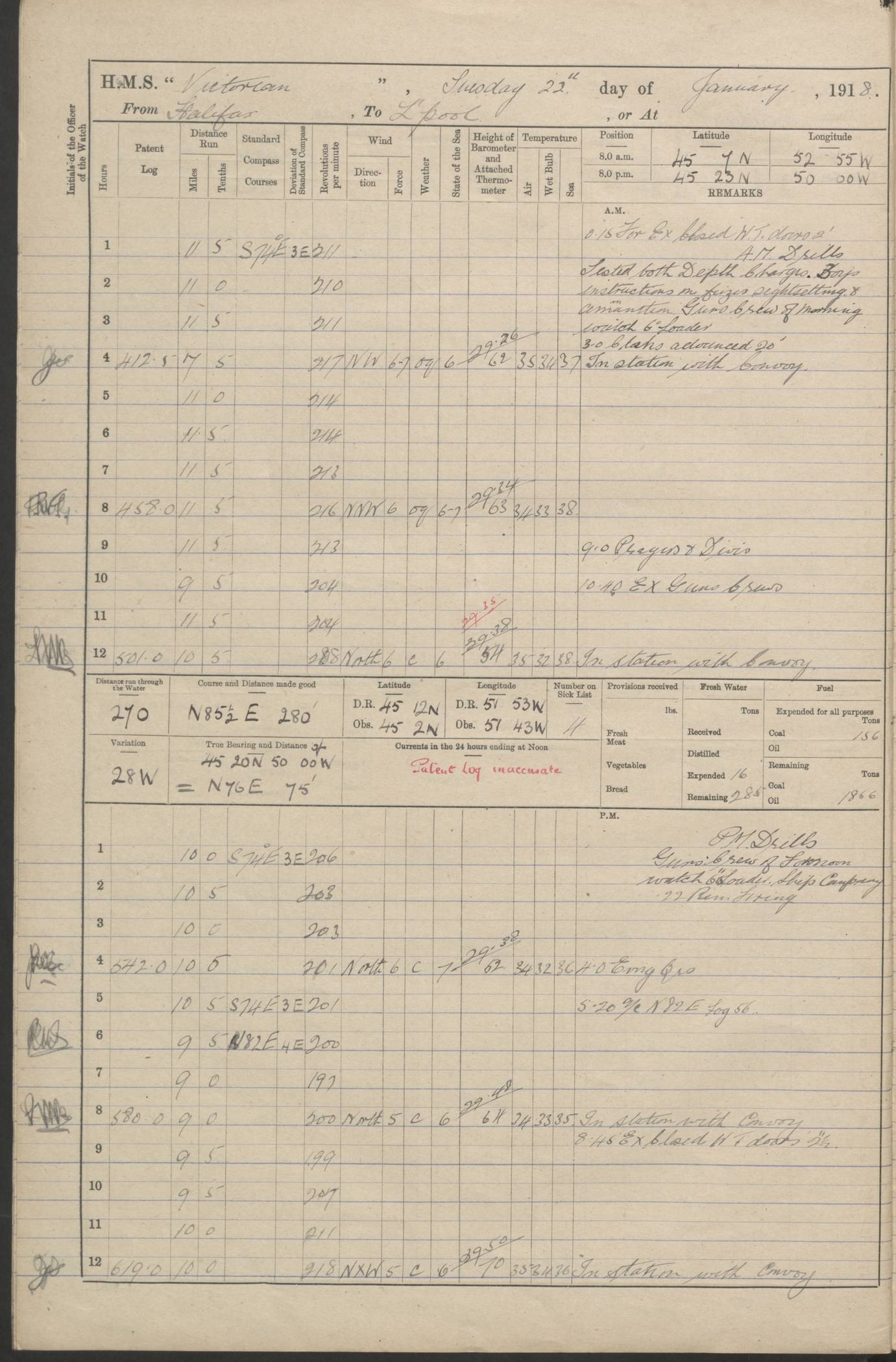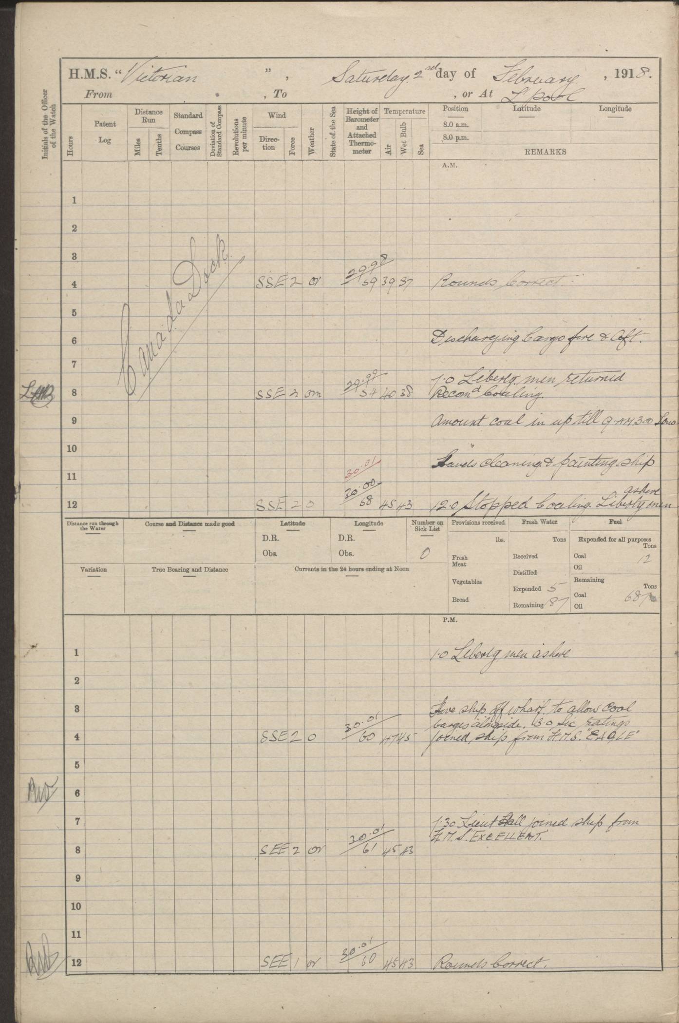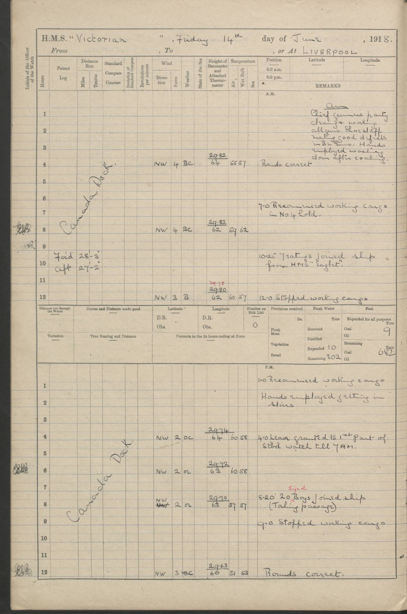 LOGS FOR JANUARY 1918 4caf8c4dcadfd341970358e2: (http://oldweather.s3.amazonaws.com/ADM 53-67407/ADM 53-67407-00001_0.jpg) [Left hand side of cover of Copy of Log for January 1918] 4caf8c4dcadfd341970358e3: (http://oldweather.s3.amazonaws.com/ADM 53-67407/ADM 53-67407-00001_1.jpg) [Right hand side of cover, signed by Navigating Officer, as before] 4caf8c4dcadfd341970358e4: (http://oldweather.s3.amazonaws.com/ADM 53-67407/ADM 53-67407-00002_0.jpg) [Blank page] 4caf8c4dcadfd341970358e5: (http://oldweather.s3.amazonaws.com/ADM 53-67407/ADM 53-67407-00002_1.jpg) [Page not filled in] 4caf8c4dcadfd341970358e6: (http://oldweather.s3.amazonaws.com/ADM 53-67407/ADM 53-67407-00003_0.jpg) [Details of Barometer and Thermometers, as previous month (though no numbers for Thermometers for Air Temperature)] 4caf8c4dcadfd341970358e7: (http://oldweather.s3.amazonaws.com/ADM 53-67407/ADM 53-67407-00003_1.jpg) 1 January 1918 From Liverpool to Halifax Lat 48.23, Long -45.67 [Position: 335 miles E of Newfoundland] 4.00am and 8.0am: In Station with convoy. am Drills: Tested Depth Charges. Class of boys Seamanship and ammunition. Sightsetters sight setting. Ordinary Seamen Seamanship. Royal Marines Signals. Deflection Teacher. Guns Crew of Morning watch to Loader. Noon: Altered course S77W, Log 87. In station with Convoy. pm: PM Drills. Guns Crews of Forenoon watch to Loader. Ship Company .22 Rim firing. 4.00pm: In station with Convoy. Evening Quarters. 4.12pm: Hauled in Log, foul and cleared. 5.00pm: Clocks put back 25 minutes. 6.00pm and Midnight: In station with Convoy. [Course and Distance made good: S54W, 335 miles] [Wind mostly southerly force 5 to 6 until 8pm, with rough sea for part of pm] 4caf8c4dcadfd341970358e8: (http://oldweather.s3.amazonaws.com/ADM 53-67407/ADM 53-67407-00004_0.jpg) 2 January 1918 From Liverpool to Halifax Lat 45.20, Long -51.15 [Position: 135 miles SE of Newfoundland] am: AM Drill. Tested Depth Charges. Hands Physical drill. Class Ordinary Seaman Gunners III 6 inch QF gun drill. Ordinary Seamen training Class ammunition. Class of Boys Torpedo Instructions. Gun layers and Trainers and Sight Setters Deflection Teacher. Guns crews of Morning watch to 6 inch Loader. 8.00am: In station with Convoy, altered course N65W, Log 36. Noon: Altered course N64W. SS METAGAMA proceeded to St John’s New Brunswick pm Drills: Junior Officers sightsetting. Guns Crews of Fornoon [Forenoon] watch 6 inch Loader. Foretopmen .22 Rim firing. 5.30pm: Clocks put back 30 minutes. [Distance made good: 299 miles] [Distance: to Halifax outer buoy = 521 miles] 4caf8c4dcadfd341970358e9: (http://oldweather.s3.amazonaws.com/ADM 53-67407/ADM 53-67407-00004_1.jpg) 3 January 1918 From Liverpool to Halifax Lat 44.83, Long -58.17 [Position 140 miles E of Nova Scotia] 8.30am: Commenced Sounding. [Course and Distance made good: S86W, 299 miles] [True Bearing and Distance: to Halifax outer buoy = S83.5W, 223 miles] 4caf8c4dcadfd341970358ea: (http://oldweather.s3.amazonaws.com/ADM 53-67407/ADM 53-67407-00005_0.jpg) 4 January 1918 From Liverpool to Halifax [and at Halifax NS] Lat 44.66, Long -63.58 [estimated] [Position: No 2 Pier, Halifax, Nova Scotia] 4.00am: Commenced Sounding. Increased to half Speed. 6.20am: Whistle buoy bearing N20W, altered course N22W, Log 85.5. 6.30am: Buoy abeam. 7.15am: Stopped and hauled in Log 96.5. 7.35am: Chebucto Light N49W. Proceeded North. 7.47am: Chebucto Light abeam. Dead Slow. 7.50am: Course and Speed as Requisite. 8.50am: First gate. 9.00am: Second gate. 9.10am: Pilot on board. Proceeded alongside No 2 Pier. Tugs Canso, Gladiator and Weatherspoon [probably WM Weatherspoon] assisting. 9.30am: Entered dock. 9.40am: Made fast. 10.00am: HE [His Excellency] Sir WE Davidson left ship. Cargo party Stevedores on board. [Wharf No 2] pm Drills: Chief Gunner parties sponging and cleaning out all guns. Remainder of hands employed cleaning holds for Cargo. 5.00pm: Liberty men ashore. [Distance made good: 240 miles] [Noon Position] [Halifax No 2 Wharf] [Fuel Remaining: Coal 1262 tons] [Rain for most of day, noon temperature 37F] [Note: Tug “Canso” (listed here as 126803) was built and registered in Yarmouth, Nova Scotia, in 1910 and owned by The Minister of Public Works for the Dominion of Canada, Ottawa. Tug “WM Weatherspoon” (listed here as 94697) was built in Digby, Nova Scotia, in 1890, registered in Sydney, Nova Scotia, in 1908 and owned by Hugh McDonald, Sydney.] 4caf8c4dcadfd341970358eb: (http://oldweather.s3.amazonaws.com/ADM 53-67407/ADM 53-67407-00005_1.jpg) 5 January 1918 At Halifax Lat 44.66, Long -63.58 [Position: No 2 Pier, Halifax, Nova Scotia] [Wharf No 2 Halifax] am Drills: Chief gunners parties examining exposed ammunition. Cleaning guns and Shells. am: Commenced loading Steel bars No 2 and No 4 Hatch. Hands employed taking stores on board and Saturday Routine. Party of Men ashore at dockyard for stores. 1.15pm: Liberty men ashore. 2.15pm: Resumed working Cargo No 4. 3.45pm and 4.45pm: Liberty men ashore. 4caf8c4dcadfd341970358ec: (http://oldweather.s3.amazonaws.com/ADM 53-67407/ADM 53-67407-00006_0.jpg) 6 January 1918 At Halifax Lat 44.66, Long -63.58 [Position: No 2 Pier, Halifax, Nova Scotia] [No 2 Pier] 8.00am: Rounds Correct. USS “SOUTH DAKOTA” entered harbour. 9.00am: Officer of guard left ship in cutter. 9.45am: Officer of guard returned. 10.00am: RC party ashore. Divisions and Captain’s Inspections and Divine Service. 11.00am: RC party returned. 2.00pm: Signal Rating discharged to the NIOBE. 4.30pm: Liberty men ashore. 10.00pm: Liberty men returned. [Note: USS “South Dakota” (Armored Cruiser No 9, later ACR-9) was built in California and launched in 1904; she was in commission from 1907 and in 1920 was reclassified as CA-9 and renamed “Huron”; she was sold for scrap in 1930; she was towed to Powell River, British Colombia, in 1931 and used as a breakwater (more details here).] 4caf8c4dcadfd341970358ed: (http://oldweather.s3.amazonaws.com/ADM 53-67407/