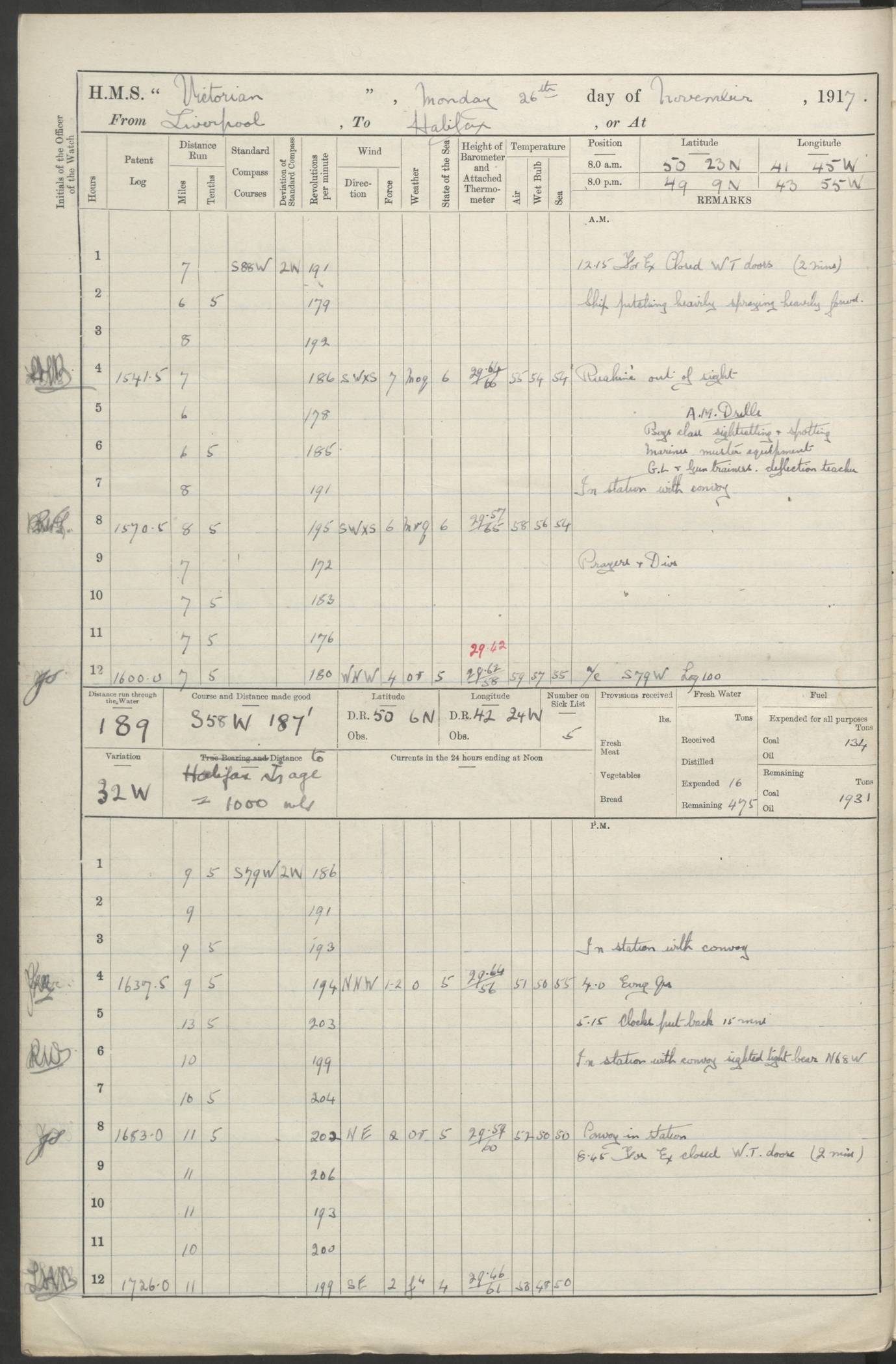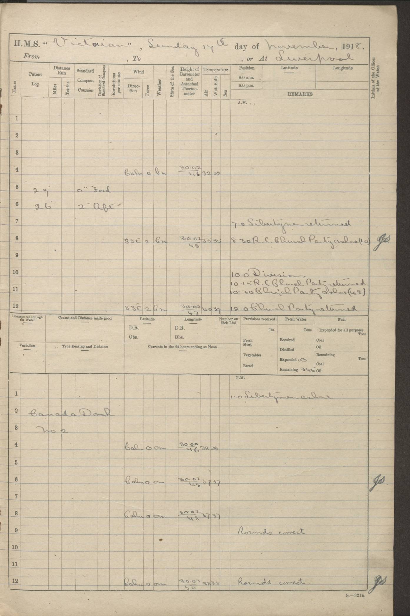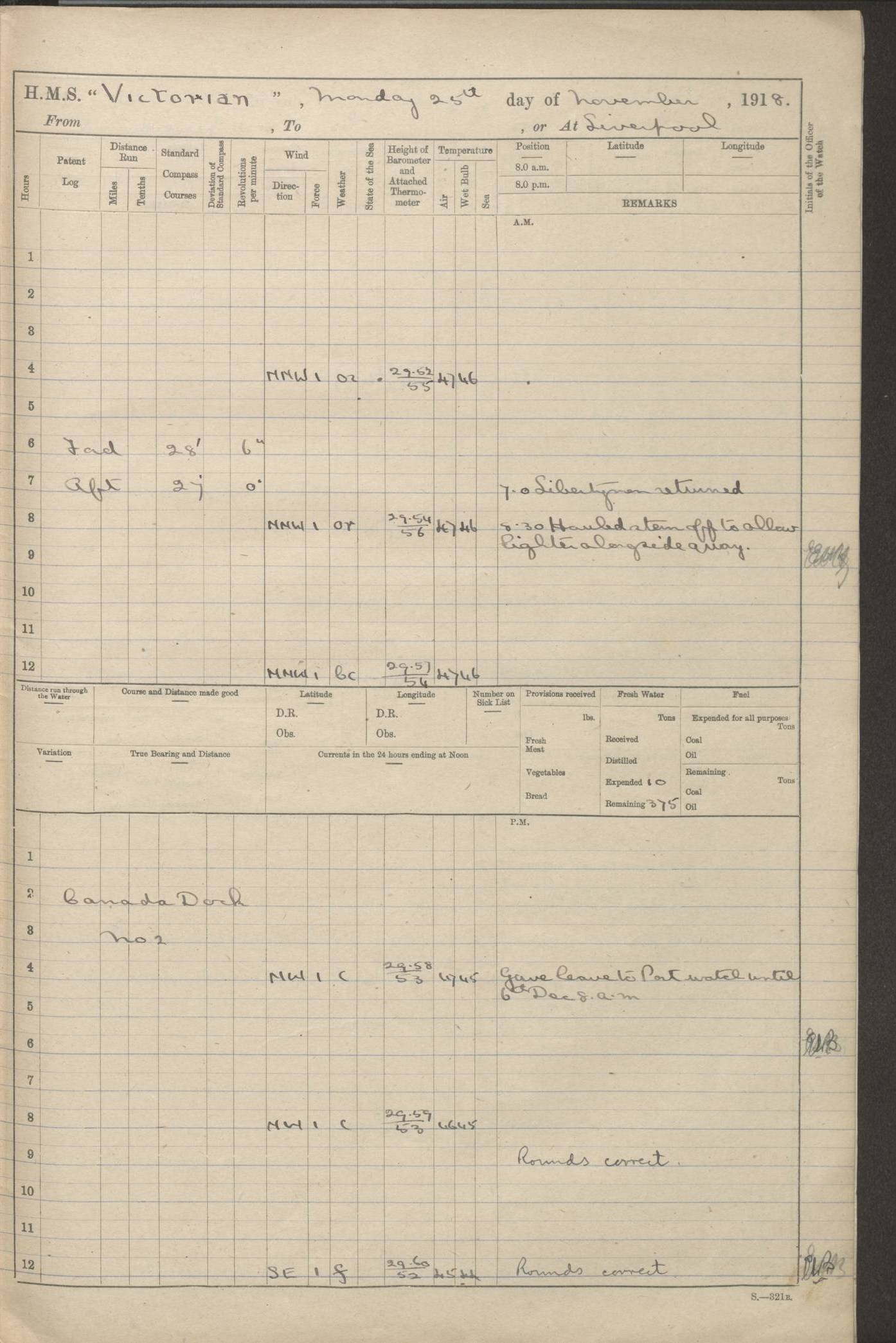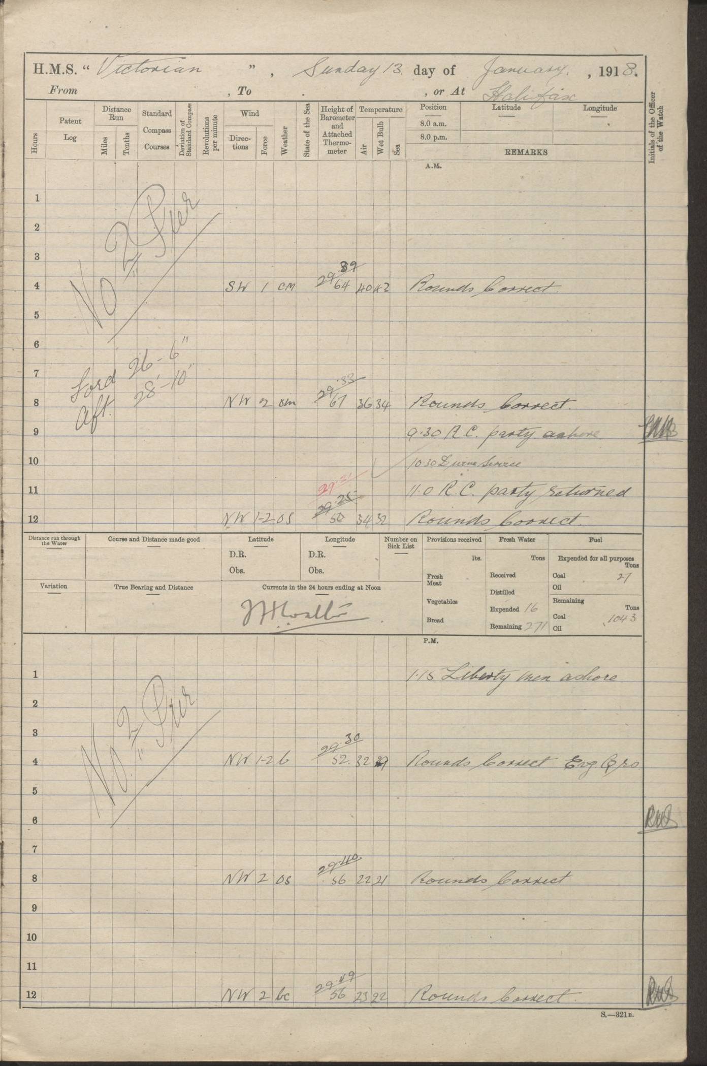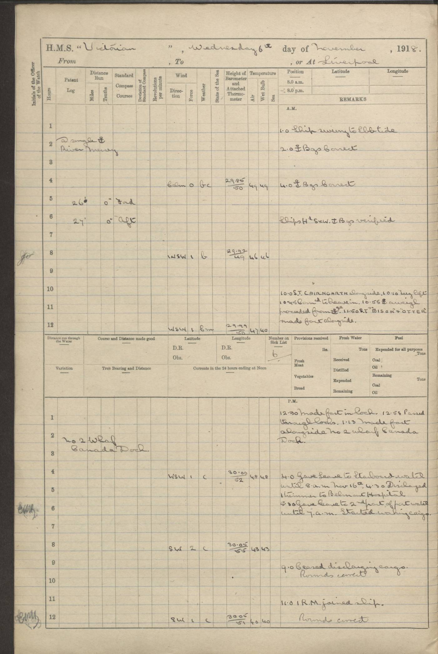 LOGS FOR JANUARY 1918 4caf8c4dcadfd341970358e2: (http://oldweather.s3.amazonaws.com/ADM 53-67407/ADM 53-67407-00001_0.jpg) [Left hand side of cover of Copy of Log for January 1918] 4caf8c4dcadfd341970358e3: (http://oldweather.s3.amazonaws.com/ADM 53-67407/ADM 53-67407-00001_1.jpg) [Right hand side of cover, signed by Navigating Officer, as before] 4caf8c4dcadfd341970358e4: (http://oldweather.s3.amazonaws.com/ADM 53-67407/ADM 53-67407-00002_0.jpg) [Blank page] 4caf8c4dcadfd341970358e5: (http://oldweather.s3.amazonaws.com/ADM 53-67407/ADM 53-67407-00002_1.jpg) [Page not filled in] 4caf8c4dcadfd341970358e6: (http://oldweather.s3.amazonaws.com/ADM 53-67407/ADM 53-67407-00003_0.jpg) [Details of Barometer and Thermometers, as previous month (though no numbers for Thermometers for Air Temperature)] 4caf8c4dcadfd341970358e7: (http://oldweather.s3.amazonaws.com/ADM 53-67407/ADM 53-67407-00003_1.jpg) 1 January 1918 From Liverpool to Halifax Lat 48.23, Long -45.67 [Position: 335 miles E of Newfoundland] 4.00am and 8.0am: In Station with convoy. am Drills: Tested Depth Charges. Class of boys Seamanship and ammunition. Sightsetters sight setting. Ordinary Seamen Seamanship. Royal Marines Signals. Deflection Teacher. Guns Crew of Morning watch to Loader. Noon: Altered course S77W, Log 87. In station with Convoy. pm: PM Drills. Guns Crews of Forenoon watch to Loader. Ship Company .22 Rim firing. 4.00pm: In station with Convoy. Evening Quarters. 4.12pm: Hauled in Log, foul and cleared. 5.00pm: Clocks put back 25 minutes. 6.00pm and Midnight: In station with Convoy. [Course and Distance made good: S54W, 335 miles] [Wind mostly southerly force 5 to 6 until 8pm, with rough sea for part of pm] 4caf8c4dcadfd341970358e8: (http://oldweather.s3.amazonaws.com/ADM 53-67407/ADM 53-67407-00004_0.jpg) 2 January 1918 From Liverpool to Halifax Lat 45.20, Long -51.15 [Position: 135 miles SE of Newfoundland] am: AM Drill. Tested Depth Charges. Hands Physical drill. Class Ordinary Seaman Gunners III 6 inch QF gun drill. Ordinary Seamen training Class ammunition. Class of Boys Torpedo Instructions. Gun layers and Trainers and Sight Setters Deflection Teacher. Guns crews of Morning watch to 6 inch Loader. 8.00am: In station with Convoy, altered course N65W, Log 36. Noon: Altered course N64W. SS METAGAMA proceeded to St John’s New Brunswick pm Drills: Junior Officers sightsetting. Guns Crews of Fornoon [Forenoon] watch 6 inch Loader. Foretopmen .22 Rim firing. 5.30pm: Clocks put back 30 minutes. [Distance made good: 299 miles] [Distance: to Halifax outer buoy = 521 miles] 4caf8c4dcadfd341970358e9: (http://oldweather.s3.amazonaws.com/ADM 53-67407/ADM 53-67407-00004_1.jpg) 3 January 1918 From Liverpool to Halifax Lat 44.83, Long -58.17 [Position 140 miles E of Nova Scotia] 8.30am: Commenced Sounding. [Course and Distance made good: S86W, 299 miles] [True Bearing and Distance: to Halifax outer buoy = S83.5W, 223 miles] 4caf8c4dcadfd341970358ea: (http://oldweather.s3.amazonaws.com/ADM 53-67407/ADM 53-67407-00005_0.jpg) 4 January 1918 From Liverpool to Halifax [and at Halifax NS] Lat 44.66, Long -63.58 [estimated] [Position: No 2 Pier, Halifax, Nova Scotia] 4.00am: Commenced Sounding. Increased to half Speed. 6.20am: Whistle buoy bearing N20W, altered course N22W, Log 85.5. 6.30am: Buoy abeam. 7.15am: Stopped and hauled in Log 96.5. 7.35am: Chebucto Light N49W. Proceeded North. 7.47am: Chebucto Light abeam. Dead Slow. 7.50am: Course and Speed as Requisite. 8.50am: First gate. 9.00am: Second gate. 9.10am: Pilot on board. Proceeded alongside No 2 Pier. Tugs Canso, Gladiator and Weatherspoon [probably WM Weatherspoon] assisting. 9.30am: Entered dock. 9.40am: Made fast. 10.00am: HE [His Excellency] Sir WE Davidson left ship. Cargo party Stevedores on board. [Wharf No 2] pm Drills: Chief Gunner parties sponging and cleaning out all guns. Remainder of hands employed cleaning holds for Cargo. 5.00pm: Liberty men ashore. [Distance made good: 240 miles] [Noon Position] [Halifax No 2 Wharf] [Fuel Remaining: Coal 1262 tons] [Rain for most of day, noon temperature 37F] [Note: Tug “Canso” (listed here as 126803) was built and registered in Yarmouth, Nova Scotia, in 1910 and owned by The Minister of Public Works for the Dominion of Canada, Ottawa. Tug “WM Weatherspoon” (listed here as 94697) was built in Digby, Nova Scotia, in 1890, registered in Sydney, Nova Scotia, in 1908 and owned by Hugh McDonald, Sydney.] 4caf8c4dcadfd341970358eb: (http://oldweather.s3.amazonaws.com/ADM 53-67407/ADM 53-67407-00005_1.jpg) 5 January 1918 At Halifax Lat 44.66, Long -63.58 [Position: No 2 Pier, Halifax, Nova Scotia] [Wharf No 2 Halifax] am Drills: Chief gunners parties examining exposed ammunition. Cleaning guns and Shells. am: Commenced loading Steel bars No 2 and No 4 Hatch. Hands employed taking stores on board and Saturday Routine. Party of Men ashore at dockyard for stores. 1.15pm: Liberty men ashore. 2.15pm: Resumed working Cargo No 4. 3.45pm and 4.45pm: Liberty men ashore. 4caf8c4dcadfd341970358ec: (http://oldweather.s3.amazonaws.com/ADM 53-67407/ADM 53-67407-00006_0.jpg) 6 January 1918 At Halifax Lat 44.66, Long -63.58 [Position: No 2 Pier, Halifax, Nova Scotia] [No 2 Pier] 8.00am: Rounds Correct. USS “SOUTH DAKOTA” entered harbour. 9.00am: Officer of guard left ship in cutter. 9.45am: Officer of guard returned. 10.00am: RC party ashore. Divisions and Captain’s Inspections and Divine Service. 11.00am: RC party returned. 2.00pm: Signal Rating discharged to the NIOBE. 4.30pm: Liberty men ashore. 10.00pm: Liberty men returned. [Note: USS “South Dakota” (Armored Cruiser No 9, later ACR-9) was built in California and launched in 1904; she was in commission from 1907 and in 1920 was reclassified as CA-9 and renamed “Huron”; she was sold for scrap in 1930; she was towed to Powell River, British Colombia, in 1931 and used as a breakwater (more details here).] 4caf8c4dcadfd341970358ed: (http://oldweather.s3.amazonaws.com/ADM 53-67407/