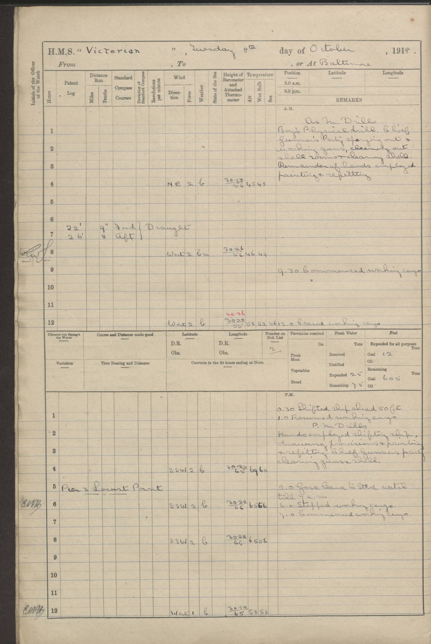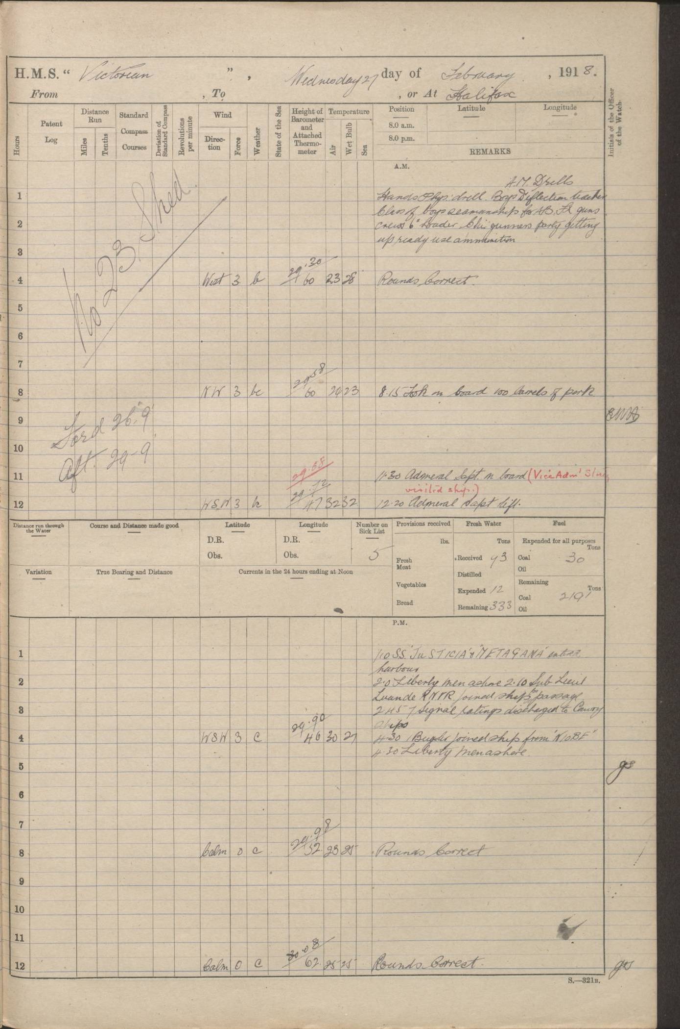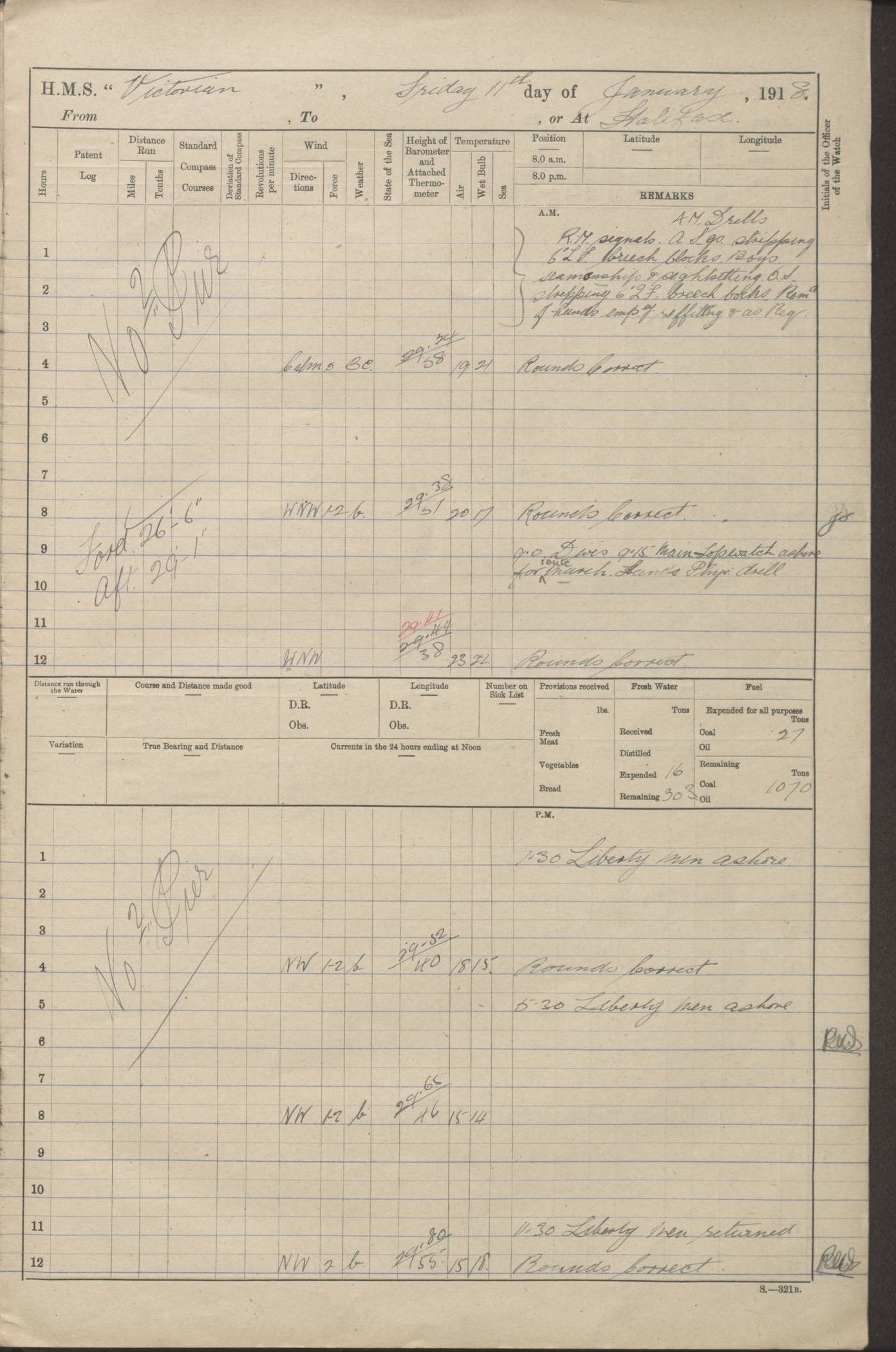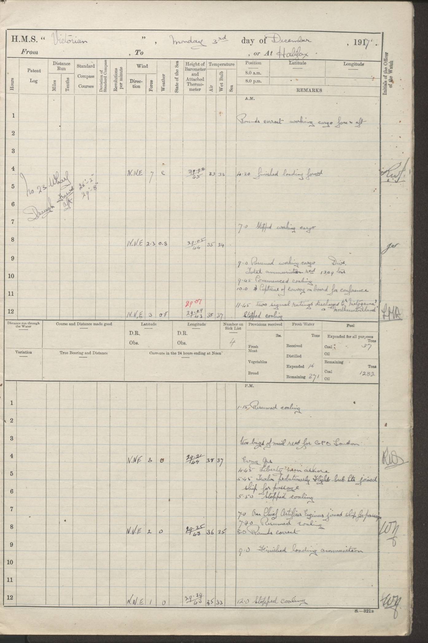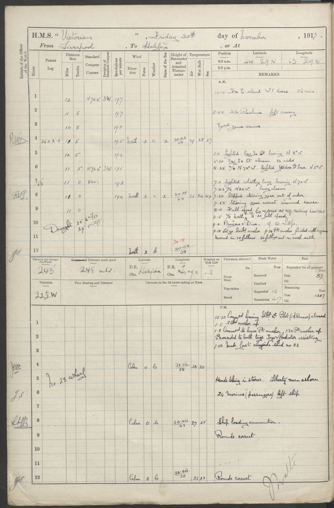 LOGS FOR JANUARY 1918 4caf8c4dcadfd341970358e2: (http://oldweather.s3.amazonaws.com/ADM 53-67407/ADM 53-67407-00001_0.jpg) [Left hand side of cover of Copy of Log for January 1918] 4caf8c4dcadfd341970358e3: (http://oldweather.s3.amazonaws.com/ADM 53-67407/ADM 53-67407-00001_1.jpg) [Right hand side of cover, signed by Navigating Officer, as before] 4caf8c4dcadfd341970358e4: (http://oldweather.s3.amazonaws.com/ADM 53-67407/ADM 53-67407-00002_0.jpg) [Blank page] 4caf8c4dcadfd341970358e5: (http://oldweather.s3.amazonaws.com/ADM 53-67407/ADM 53-67407-00002_1.jpg) [Page not filled in] 4caf8c4dcadfd341970358e6: (http://oldweather.s3.amazonaws.com/ADM 53-67407/ADM 53-67407-00003_0.jpg) [Details of Barometer and Thermometers, as previous month (though no numbers for Thermometers for Air Temperature)] 4caf8c4dcadfd341970358e7: (http://oldweather.s3.amazonaws.com/ADM 53-67407/ADM 53-67407-00003_1.jpg) 1 January 1918 From Liverpool to Halifax Lat 48.23, Long -45.67 [Position: 335 miles E of Newfoundland] 4.00am and 8.0am: In Station with convoy. am Drills: Tested Depth Charges. Class of boys Seamanship and ammunition. Sightsetters sight setting. Ordinary Seamen Seamanship. Royal Marines Signals. Deflection Teacher. Guns Crew of Morning watch to Loader. Noon: Altered course S77W, Log 87. In station with Convoy. pm: PM Drills. Guns Crews of Forenoon watch to Loader. Ship Company .22 Rim firing. 4.00pm: In station with Convoy. Evening Quarters. 4.12pm: Hauled in Log, foul and cleared. 5.00pm: Clocks put back 25 minutes. 6.00pm and Midnight: In station with Convoy. [Course and Distance made good: S54W, 335 miles] [Wind mostly southerly force 5 to 6 until 8pm, with rough sea for part of pm] 4caf8c4dcadfd341970358e8: (http://oldweather.s3.amazonaws.com/ADM 53-67407/ADM 53-67407-00004_0.jpg) 2 January 1918 From Liverpool to Halifax Lat 45.20, Long -51.15 [Position: 135 miles SE of Newfoundland] am: AM Drill. Tested Depth Charges. Hands Physical drill. Class Ordinary Seaman Gunners III 6 inch QF gun drill. Ordinary Seamen training Class ammunition. Class of Boys Torpedo Instructions. Gun layers and Trainers and Sight Setters Deflection Teacher. Guns crews of Morning watch to 6 inch Loader. 8.00am: In station with Convoy, altered course N65W, Log 36. Noon: Altered course N64W. SS METAGAMA proceeded to St John’s New Brunswick pm Drills: Junior Officers sightsetting. Guns Crews of Fornoon [Forenoon] watch 6 inch Loader. Foretopmen .22 Rim firing. 5.30pm: Clocks put back 30 minutes. [Distance made good: 299 miles] [Distance: to Halifax outer buoy = 521 miles] 4caf8c4dcadfd341970358e9: (http://oldweather.s3.amazonaws.com/ADM 53-67407/ADM 53-67407-00004_1.jpg) 3 January 1918 From Liverpool to Halifax Lat 44.83, Long -58.17 [Position 140 miles E of Nova Scotia] 8.30am: Commenced Sounding. [Course and Distance made good: S86W, 299 miles] [True Bearing and Distance: to Halifax outer buoy = S83.5W, 223 miles] 4caf8c4dcadfd341970358ea: (http://oldweather.s3.amazonaws.com/ADM 53-67407/ADM 53-67407-00005_0.jpg) 4 January 1918 From Liverpool to Halifax [and at Halifax NS] Lat 44.66, Long -63.58 [estimated] [Position: No 2 Pier, Halifax, Nova Scotia] 4.00am: Commenced Sounding. Increased to half Speed. 6.20am: Whistle buoy bearing N20W, altered course N22W, Log 85.5. 6.30am: Buoy abeam. 7.15am: Stopped and hauled in Log 96.5. 7.35am: Chebucto Light N49W. Proceeded North. 7.47am: Chebucto Light abeam. Dead Slow. 7.50am: Course and Speed as Requisite. 8.50am: First gate. 9.00am: Second gate. 9.10am: Pilot on board. Proceeded alongside No 2 Pier. Tugs Canso, Gladiator and Weatherspoon [probably WM Weatherspoon] assisting. 9.30am: Entered dock. 9.40am: Made fast. 10.00am: HE [His Excellency] Sir WE Davidson left ship. Cargo party Stevedores on board. [Wharf No 2] pm Drills: Chief Gunner parties sponging and cleaning out all guns. Remainder of hands employed cleaning holds for Cargo. 5.00pm: Liberty men ashore. [Distance made good: 240 miles] [Noon Position] [Halifax No 2 Wharf] [Fuel Remaining: Coal 1262 tons] [Rain for most of day, noon temperature 37F] [Note: Tug “Canso” (listed here as 126803) was built and registered in Yarmouth, Nova Scotia, in 1910 and owned by The Minister of Public Works for the Dominion of Canada, Ottawa. Tug “WM Weatherspoon” (listed here as 94697) was built in Digby, Nova Scotia, in 1890, registered in Sydney, Nova Scotia, in 1908 and owned by Hugh McDonald, Sydney.] 4caf8c4dcadfd341970358eb: (http://oldweather.s3.amazonaws.com/ADM 53-67407/ADM 53-67407-00005_1.jpg) 5 January 1918 At Halifax Lat 44.66, Long -63.58 [Position: No 2 Pier, Halifax, Nova Scotia] [Wharf No 2 Halifax] am Drills: Chief gunners parties examining exposed ammunition. Cleaning guns and Shells. am: Commenced loading Steel bars No 2 and No 4 Hatch. Hands employed taking stores on board and Saturday Routine. Party of Men ashore at dockyard for stores. 1.15pm: Liberty men ashore. 2.15pm: Resumed working Cargo No 4. 3.45pm and 4.45pm: Liberty men ashore. 4caf8c4dcadfd341970358ec: (http://oldweather.s3.amazonaws.com/ADM 53-67407/ADM 53-67407-00006_0.jpg) 6 January 1918 At Halifax Lat 44.66, Long -63.58 [Position: No 2 Pier, Halifax, Nova Scotia] [No 2 Pier] 8.00am: Rounds Correct. USS “SOUTH DAKOTA” entered harbour. 9.00am: Officer of guard left ship in cutter. 9.45am: Officer of guard returned. 10.00am: RC party ashore. Divisions and Captain’s Inspections and Divine Service. 11.00am: RC party returned. 2.00pm: Signal Rating discharged to the NIOBE. 4.30pm: Liberty men ashore. 10.00pm: Liberty men returned. [Note: USS “South Dakota” (Armored Cruiser No 9, later ACR-9) was built in California and launched in 1904; she was in commission from 1907 and in 1920 was reclassified as CA-9 and renamed “Huron”; she was sold for scrap in 1930; she was towed to Powell River, British Colombia, in 1931 and used as a breakwater (more details here).] 4caf8c4dcadfd341970358ed: (http://oldweather.s3.amazonaws.com/ADM 53-67407/