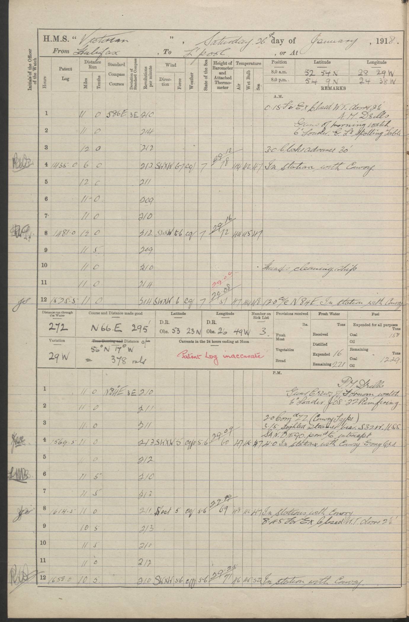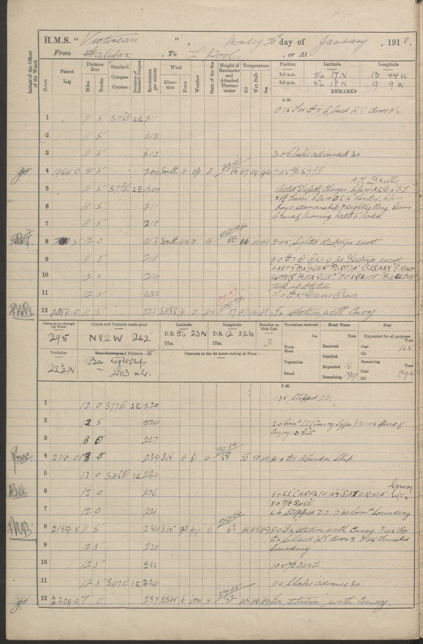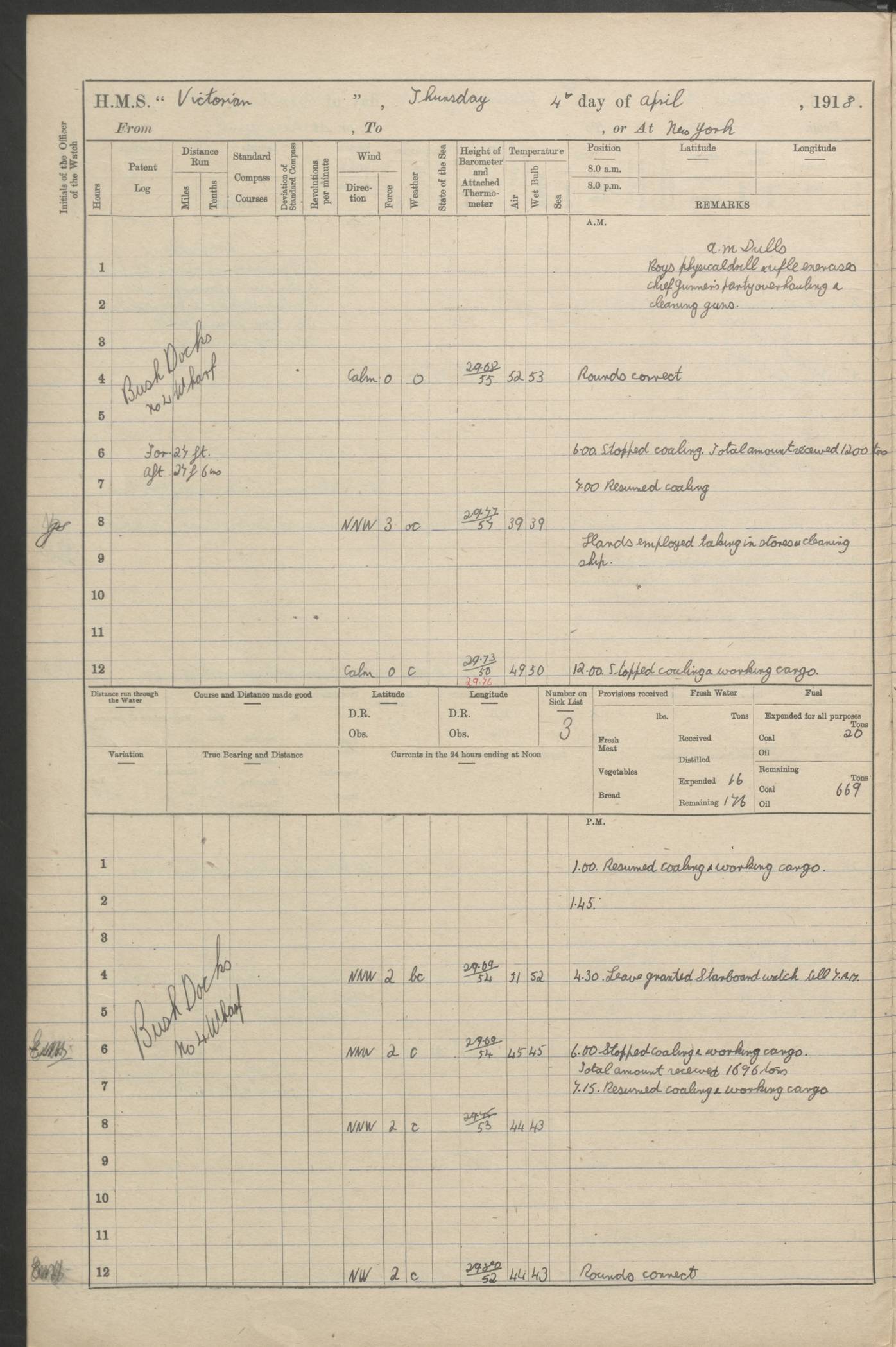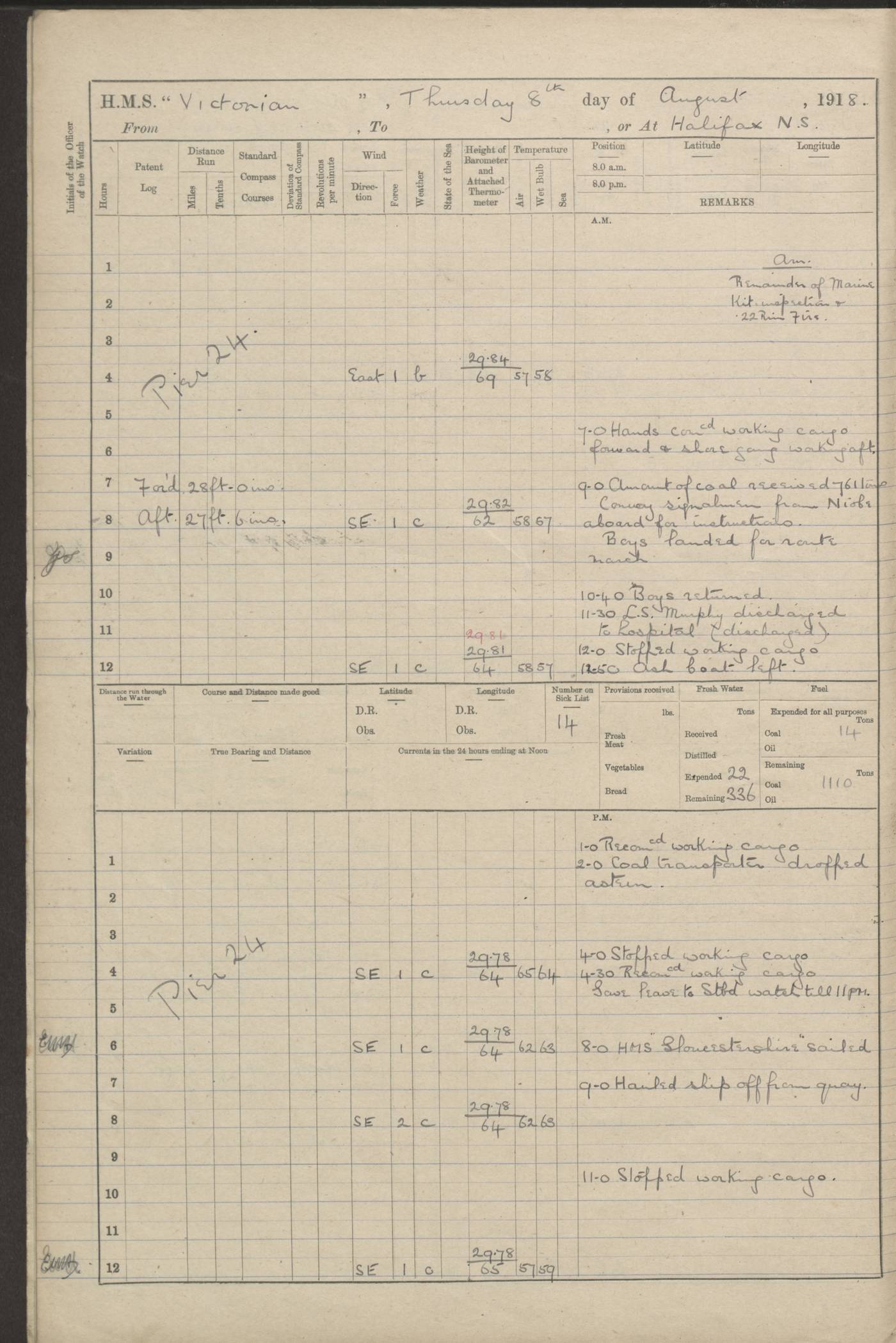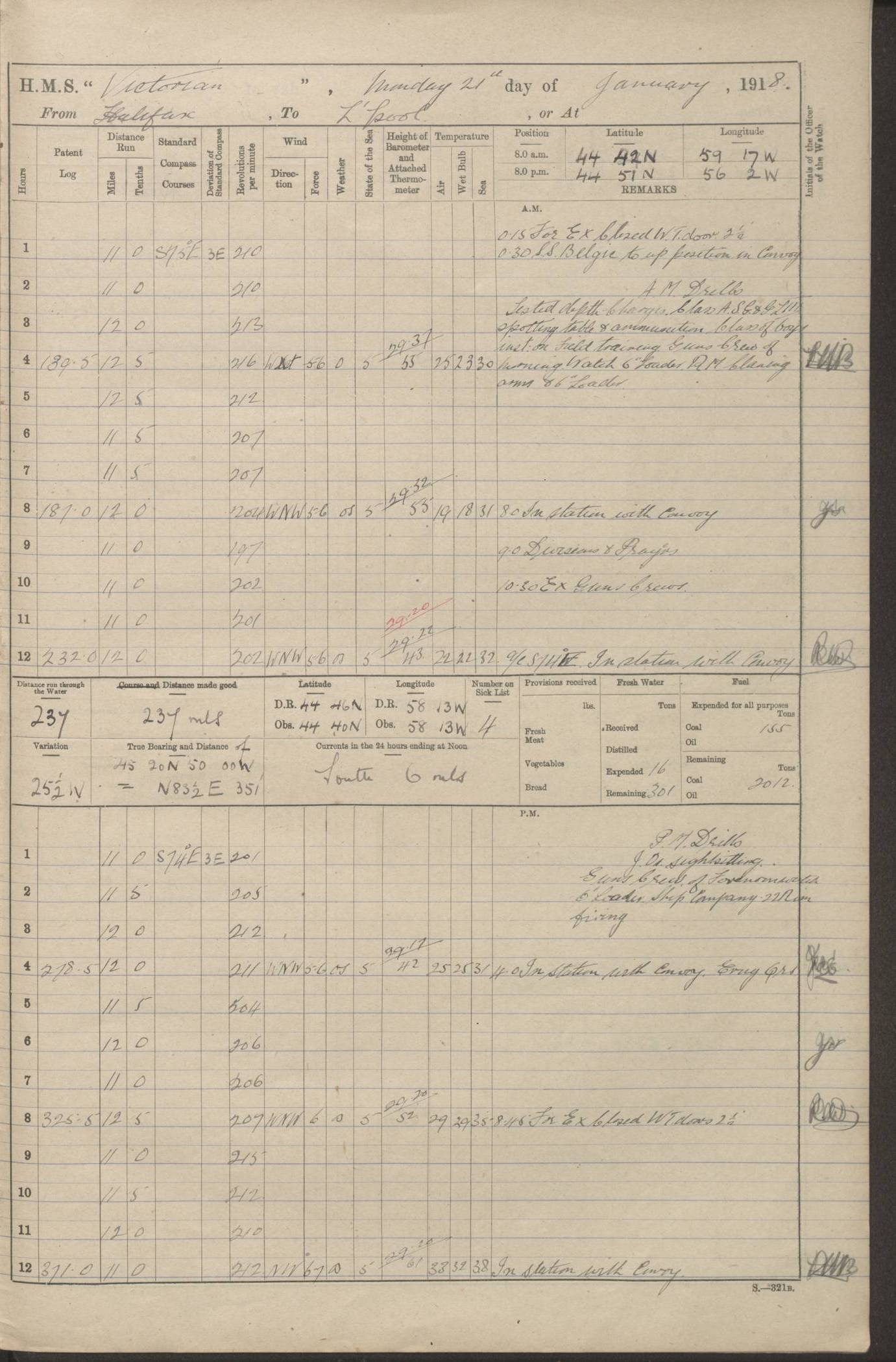 LOGS FOR JANUARY 1918 4caf8c4dcadfd341970358e2: (http://oldweather.s3.amazonaws.com/ADM 53-67407/ADM 53-67407-00001_0.jpg) [Left hand side of cover of Copy of Log for January 1918] 4caf8c4dcadfd341970358e3: (http://oldweather.s3.amazonaws.com/ADM 53-67407/ADM 53-67407-00001_1.jpg) [Right hand side of cover, signed by Navigating Officer, as before] 4caf8c4dcadfd341970358e4: (http://oldweather.s3.amazonaws.com/ADM 53-67407/ADM 53-67407-00002_0.jpg) [Blank page] 4caf8c4dcadfd341970358e5: (http://oldweather.s3.amazonaws.com/ADM 53-67407/ADM 53-67407-00002_1.jpg) [Page not filled in] 4caf8c4dcadfd341970358e6: (http://oldweather.s3.amazonaws.com/ADM 53-67407/ADM 53-67407-00003_0.jpg) [Details of Barometer and Thermometers, as previous month (though no numbers for Thermometers for Air Temperature)] 4caf8c4dcadfd341970358e7: (http://oldweather.s3.amazonaws.com/ADM 53-67407/ADM 53-67407-00003_1.jpg) 1 January 1918 From Liverpool to Halifax Lat 48.23, Long -45.67 [Position: 335 miles E of Newfoundland] 4.00am and 8.0am: In Station with convoy. am Drills: Tested Depth Charges. Class of boys Seamanship and ammunition. Sightsetters sight setting. Ordinary Seamen Seamanship. Royal Marines Signals. Deflection Teacher. Guns Crew of Morning watch to Loader. Noon: Altered course S77W, Log 87. In station with Convoy. pm: PM Drills. Guns Crews of Forenoon watch to Loader. Ship Company .22 Rim firing. 4.00pm: In station with Convoy. Evening Quarters. 4.12pm: Hauled in Log, foul and cleared. 5.00pm: Clocks put back 25 minutes. 6.00pm and Midnight: In station with Convoy. [Course and Distance made good: S54W, 335 miles] [Wind mostly southerly force 5 to 6 until 8pm, with rough sea for part of pm] 4caf8c4dcadfd341970358e8: (http://oldweather.s3.amazonaws.com/ADM 53-67407/ADM 53-67407-00004_0.jpg) 2 January 1918 From Liverpool to Halifax Lat 45.20, Long -51.15 [Position: 135 miles SE of Newfoundland] am: AM Drill. Tested Depth Charges. Hands Physical drill. Class Ordinary Seaman Gunners III 6 inch QF gun drill. Ordinary Seamen training Class ammunition. Class of Boys Torpedo Instructions. Gun layers and Trainers and Sight Setters Deflection Teacher. Guns crews of Morning watch to 6 inch Loader. 8.00am: In station with Convoy, altered course N65W, Log 36. Noon: Altered course N64W. SS METAGAMA proceeded to St John’s New Brunswick pm Drills: Junior Officers sightsetting. Guns Crews of Fornoon [Forenoon] watch 6 inch Loader. Foretopmen .22 Rim firing. 5.30pm: Clocks put back 30 minutes. [Distance made good: 299 miles] [Distance: to Halifax outer buoy = 521 miles] 4caf8c4dcadfd341970358e9: (http://oldweather.s3.amazonaws.com/ADM 53-67407/ADM 53-67407-00004_1.jpg) 3 January 1918 From Liverpool to Halifax Lat 44.83, Long -58.17 [Position 140 miles E of Nova Scotia] 8.30am: Commenced Sounding. [Course and Distance made good: S86W, 299 miles] [True Bearing and Distance: to Halifax outer buoy = S83.5W, 223 miles] 4caf8c4dcadfd341970358ea: (http://oldweather.s3.amazonaws.com/ADM 53-67407/ADM 53-67407-00005_0.jpg) 4 January 1918 From Liverpool to Halifax [and at Halifax NS] Lat 44.66, Long -63.58 [estimated] [Position: No 2 Pier, Halifax, Nova Scotia] 4.00am: Commenced Sounding. Increased to half Speed. 6.20am: Whistle buoy bearing N20W, altered course N22W, Log 85.5. 6.30am: Buoy abeam. 7.15am: Stopped and hauled in Log 96.5. 7.35am: Chebucto Light N49W. Proceeded North. 7.47am: Chebucto Light abeam. Dead Slow. 7.50am: Course and Speed as Requisite. 8.50am: First gate. 9.00am: Second gate. 9.10am: Pilot on board. Proceeded alongside No 2 Pier. Tugs Canso, Gladiator and Weatherspoon [probably WM Weatherspoon] assisting. 9.30am: Entered dock. 9.40am: Made fast. 10.00am: HE [His Excellency] Sir WE Davidson left ship. Cargo party Stevedores on board. [Wharf No 2] pm Drills: Chief Gunner parties sponging and cleaning out all guns. Remainder of hands employed cleaning holds for Cargo. 5.00pm: Liberty men ashore. [Distance made good: 240 miles] [Noon Position] [Halifax No 2 Wharf] [Fuel Remaining: Coal 1262 tons] [Rain for most of day, noon temperature 37F] [Note: Tug “Canso” (listed here as 126803) was built and registered in Yarmouth, Nova Scotia, in 1910 and owned by The Minister of Public Works for the Dominion of Canada, Ottawa. Tug “WM Weatherspoon” (listed here as 94697) was built in Digby, Nova Scotia, in 1890, registered in Sydney, Nova Scotia, in 1908 and owned by Hugh McDonald, Sydney.] 4caf8c4dcadfd341970358eb: (http://oldweather.s3.amazonaws.com/ADM 53-67407/ADM 53-67407-00005_1.jpg) 5 January 1918 At Halifax Lat 44.66, Long -63.58 [Position: No 2 Pier, Halifax, Nova Scotia] [Wharf No 2 Halifax] am Drills: Chief gunners parties examining exposed ammunition. Cleaning guns and Shells. am: Commenced loading Steel bars No 2 and No 4 Hatch. Hands employed taking stores on board and Saturday Routine. Party of Men ashore at dockyard for stores. 1.15pm: Liberty men ashore. 2.15pm: Resumed working Cargo No 4. 3.45pm and 4.45pm: Liberty men ashore. 4caf8c4dcadfd341970358ec: (http://oldweather.s3.amazonaws.com/ADM 53-67407/ADM 53-67407-00006_0.jpg) 6 January 1918 At Halifax Lat 44.66, Long -63.58 [Position: No 2 Pier, Halifax, Nova Scotia] [No 2 Pier] 8.00am: Rounds Correct. USS “SOUTH DAKOTA” entered harbour. 9.00am: Officer of guard left ship in cutter. 9.45am: Officer of guard returned. 10.00am: RC party ashore. Divisions and Captain’s Inspections and Divine Service. 11.00am: RC party returned. 2.00pm: Signal Rating discharged to the NIOBE. 4.30pm: Liberty men ashore. 10.00pm: Liberty men returned. [Note: USS “South Dakota” (Armored Cruiser No 9, later ACR-9) was built in California and launched in 1904; she was in commission from 1907 and in 1920 was reclassified as CA-9 and renamed “Huron”; she was sold for scrap in 1930; she was towed to Powell River, British Colombia, in 1931 and used as a breakwater (more details here).] 4caf8c4dcadfd341970358ed: (http://oldweather.s3.amazonaws.com/ADM 53-67407/
