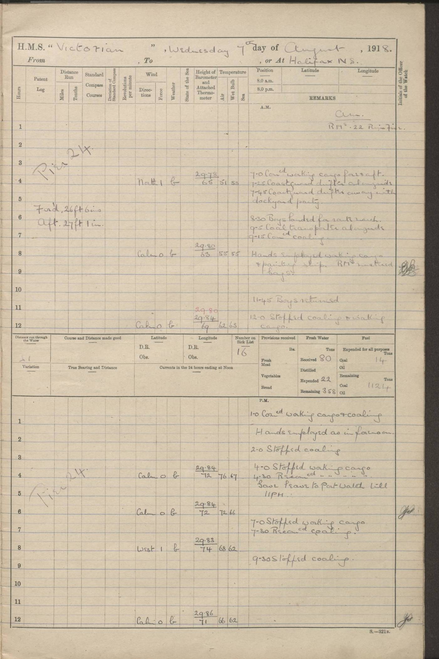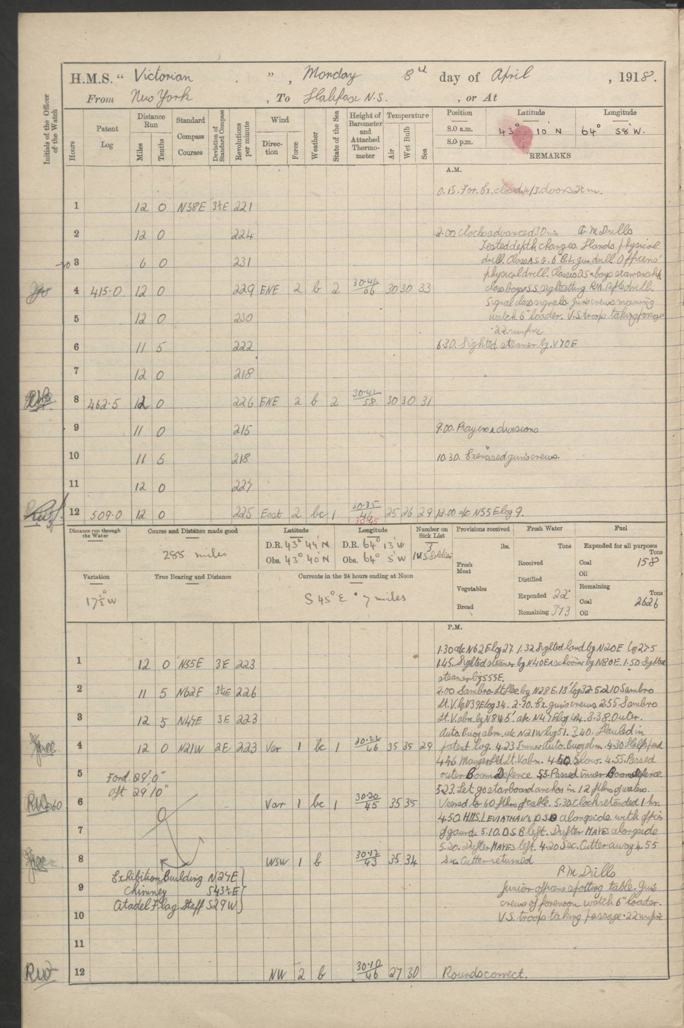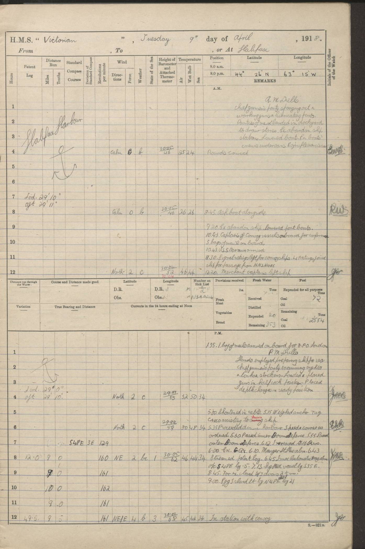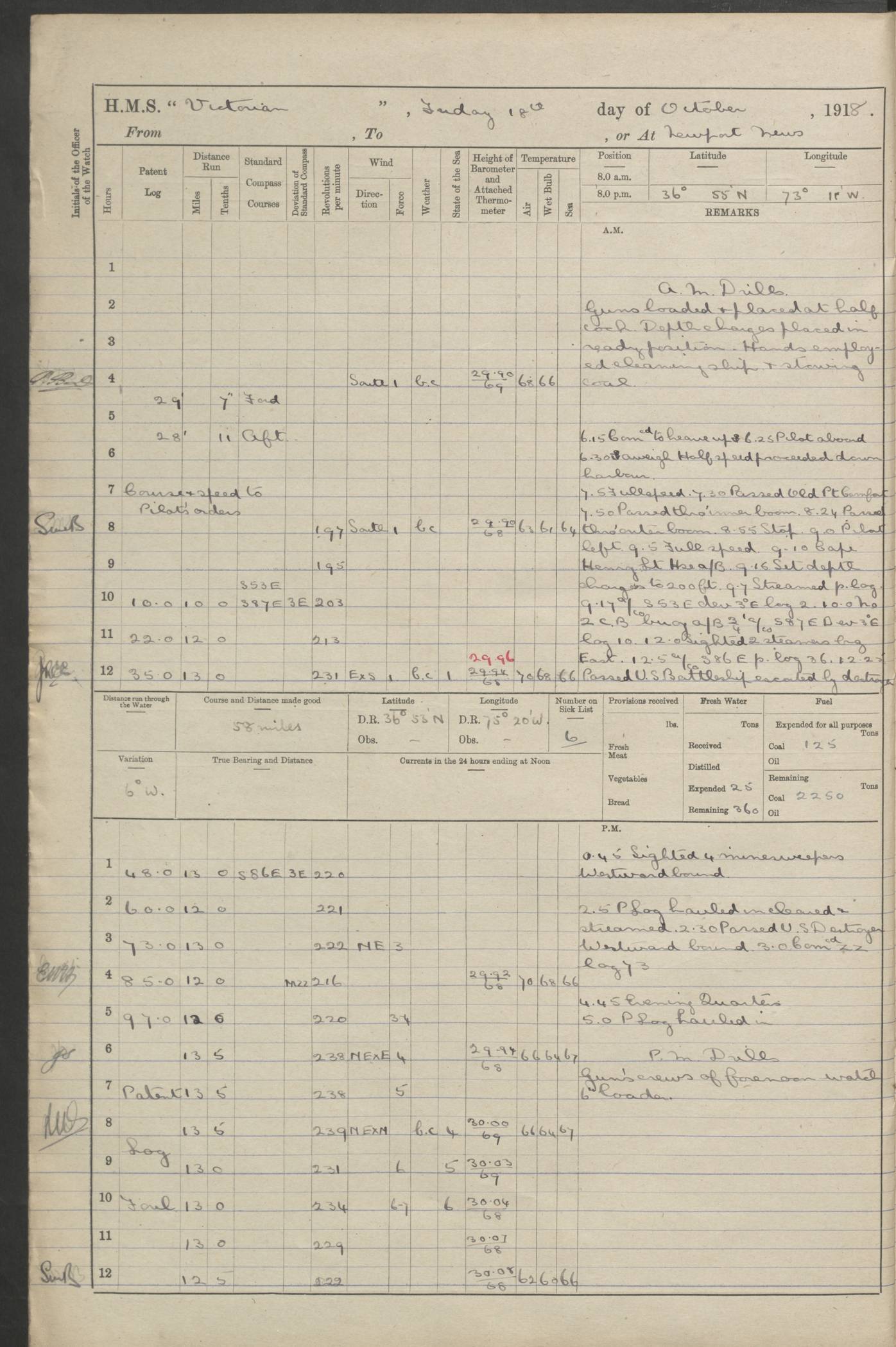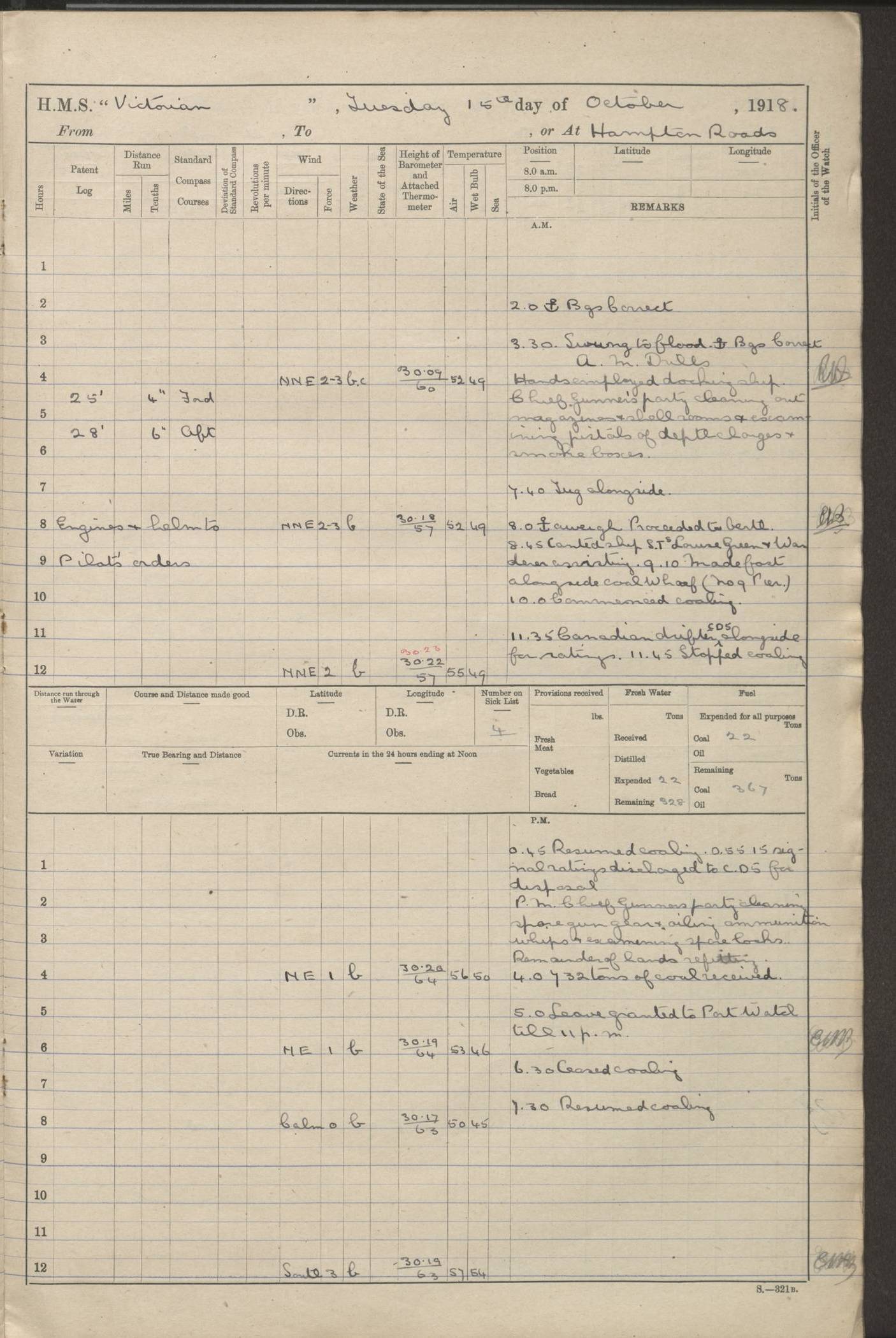 LOGS FOR JANUARY 1918 4caf8c4dcadfd341970358e2: (http://oldweather.s3.amazonaws.com/ADM 53-67407/ADM 53-67407-00001_0.jpg) [Left hand side of cover of Copy of Log for January 1918] 4caf8c4dcadfd341970358e3: (http://oldweather.s3.amazonaws.com/ADM 53-67407/ADM 53-67407-00001_1.jpg) [Right hand side of cover, signed by Navigating Officer, as before] 4caf8c4dcadfd341970358e4: (http://oldweather.s3.amazonaws.com/ADM 53-67407/ADM 53-67407-00002_0.jpg) [Blank page] 4caf8c4dcadfd341970358e5: (http://oldweather.s3.amazonaws.com/ADM 53-67407/ADM 53-67407-00002_1.jpg) [Page not filled in] 4caf8c4dcadfd341970358e6: (http://oldweather.s3.amazonaws.com/ADM 53-67407/ADM 53-67407-00003_0.jpg) [Details of Barometer and Thermometers, as previous month (though no numbers for Thermometers for Air Temperature)] 4caf8c4dcadfd341970358e7: (http://oldweather.s3.amazonaws.com/ADM 53-67407/ADM 53-67407-00003_1.jpg) 1 January 1918 From Liverpool to Halifax Lat 48.23, Long -45.67 [Position: 335 miles E of Newfoundland] 4.00am and 8.0am: In Station with convoy. am Drills: Tested Depth Charges. Class of boys Seamanship and ammunition. Sightsetters sight setting. Ordinary Seamen Seamanship. Royal Marines Signals. Deflection Teacher. Guns Crew of Morning watch to Loader. Noon: Altered course S77W, Log 87. In station with Convoy. pm: PM Drills. Guns Crews of Forenoon watch to Loader. Ship Company .22 Rim firing. 4.00pm: In station with Convoy. Evening Quarters. 4.12pm: Hauled in Log, foul and cleared. 5.00pm: Clocks put back 25 minutes. 6.00pm and Midnight: In station with Convoy. [Course and Distance made good: S54W, 335 miles] [Wind mostly southerly force 5 to 6 until 8pm, with rough sea for part of pm] 4caf8c4dcadfd341970358e8: (http://oldweather.s3.amazonaws.com/ADM 53-67407/ADM 53-67407-00004_0.jpg) 2 January 1918 From Liverpool to Halifax Lat 45.20, Long -51.15 [Position: 135 miles SE of Newfoundland] am: AM Drill. Tested Depth Charges. Hands Physical drill. Class Ordinary Seaman Gunners III 6 inch QF gun drill. Ordinary Seamen training Class ammunition. Class of Boys Torpedo Instructions. Gun layers and Trainers and Sight Setters Deflection Teacher. Guns crews of Morning watch to 6 inch Loader. 8.00am: In station with Convoy, altered course N65W, Log 36. Noon: Altered course N64W. SS METAGAMA proceeded to St John’s New Brunswick pm Drills: Junior Officers sightsetting. Guns Crews of Fornoon [Forenoon] watch 6 inch Loader. Foretopmen .22 Rim firing. 5.30pm: Clocks put back 30 minutes. [Distance made good: 299 miles] [Distance: to Halifax outer buoy = 521 miles] 4caf8c4dcadfd341970358e9: (http://oldweather.s3.amazonaws.com/ADM 53-67407/ADM 53-67407-00004_1.jpg) 3 January 1918 From Liverpool to Halifax Lat 44.83, Long -58.17 [Position 140 miles E of Nova Scotia] 8.30am: Commenced Sounding. [Course and Distance made good: S86W, 299 miles] [True Bearing and Distance: to Halifax outer buoy = S83.5W, 223 miles] 4caf8c4dcadfd341970358ea: (http://oldweather.s3.amazonaws.com/ADM 53-67407/ADM 53-67407-00005_0.jpg) 4 January 1918 From Liverpool to Halifax [and at Halifax NS] Lat 44.66, Long -63.58 [estimated] [Position: No 2 Pier, Halifax, Nova Scotia] 4.00am: Commenced Sounding. Increased to half Speed. 6.20am: Whistle buoy bearing N20W, altered course N22W, Log 85.5. 6.30am: Buoy abeam. 7.15am: Stopped and hauled in Log 96.5. 7.35am: Chebucto Light N49W. Proceeded North. 7.47am: Chebucto Light abeam. Dead Slow. 7.50am: Course and Speed as Requisite. 8.50am: First gate. 9.00am: Second gate. 9.10am: Pilot on board. Proceeded alongside No 2 Pier. Tugs Canso, Gladiator and Weatherspoon [probably WM Weatherspoon] assisting. 9.30am: Entered dock. 9.40am: Made fast. 10.00am: HE [His Excellency] Sir WE Davidson left ship. Cargo party Stevedores on board. [Wharf No 2] pm Drills: Chief Gunner parties sponging and cleaning out all guns. Remainder of hands employed cleaning holds for Cargo. 5.00pm: Liberty men ashore. [Distance made good: 240 miles] [Noon Position] [Halifax No 2 Wharf] [Fuel Remaining: Coal 1262 tons] [Rain for most of day, noon temperature 37F] [Note: Tug “Canso” (listed here as 126803) was built and registered in Yarmouth, Nova Scotia, in 1910 and owned by The Minister of Public Works for the Dominion of Canada, Ottawa. Tug “WM Weatherspoon” (listed here as 94697) was built in Digby, Nova Scotia, in 1890, registered in Sydney, Nova Scotia, in 1908 and owned by Hugh McDonald, Sydney.] 4caf8c4dcadfd341970358eb: (http://oldweather.s3.amazonaws.com/ADM 53-67407/ADM 53-67407-00005_1.jpg) 5 January 1918 At Halifax Lat 44.66, Long -63.58 [Position: No 2 Pier, Halifax, Nova Scotia] [Wharf No 2 Halifax] am Drills: Chief gunners parties examining exposed ammunition. Cleaning guns and Shells. am: Commenced loading Steel bars No 2 and No 4 Hatch. Hands employed taking stores on board and Saturday Routine. Party of Men ashore at dockyard for stores. 1.15pm: Liberty men ashore. 2.15pm: Resumed working Cargo No 4. 3.45pm and 4.45pm: Liberty men ashore. 4caf8c4dcadfd341970358ec: (http://oldweather.s3.amazonaws.com/ADM 53-67407/ADM 53-67407-00006_0.jpg) 6 January 1918 At Halifax Lat 44.66, Long -63.58 [Position: No 2 Pier, Halifax, Nova Scotia] [No 2 Pier] 8.00am: Rounds Correct. USS “SOUTH DAKOTA” entered harbour. 9.00am: Officer of guard left ship in cutter. 9.45am: Officer of guard returned. 10.00am: RC party ashore. Divisions and Captain’s Inspections and Divine Service. 11.00am: RC party returned. 2.00pm: Signal Rating discharged to the NIOBE. 4.30pm: Liberty men ashore. 10.00pm: Liberty men returned. [Note: USS “South Dakota” (Armored Cruiser No 9, later ACR-9) was built in California and launched in 1904; she was in commission from 1907 and in 1920 was reclassified as CA-9 and renamed “Huron”; she was sold for scrap in 1930; she was towed to Powell River, British Colombia, in 1931 and used as a breakwater (more details here).] 4caf8c4dcadfd341970358ed: (http://oldweather.s3.amazonaws.com/ADM 53-67407/