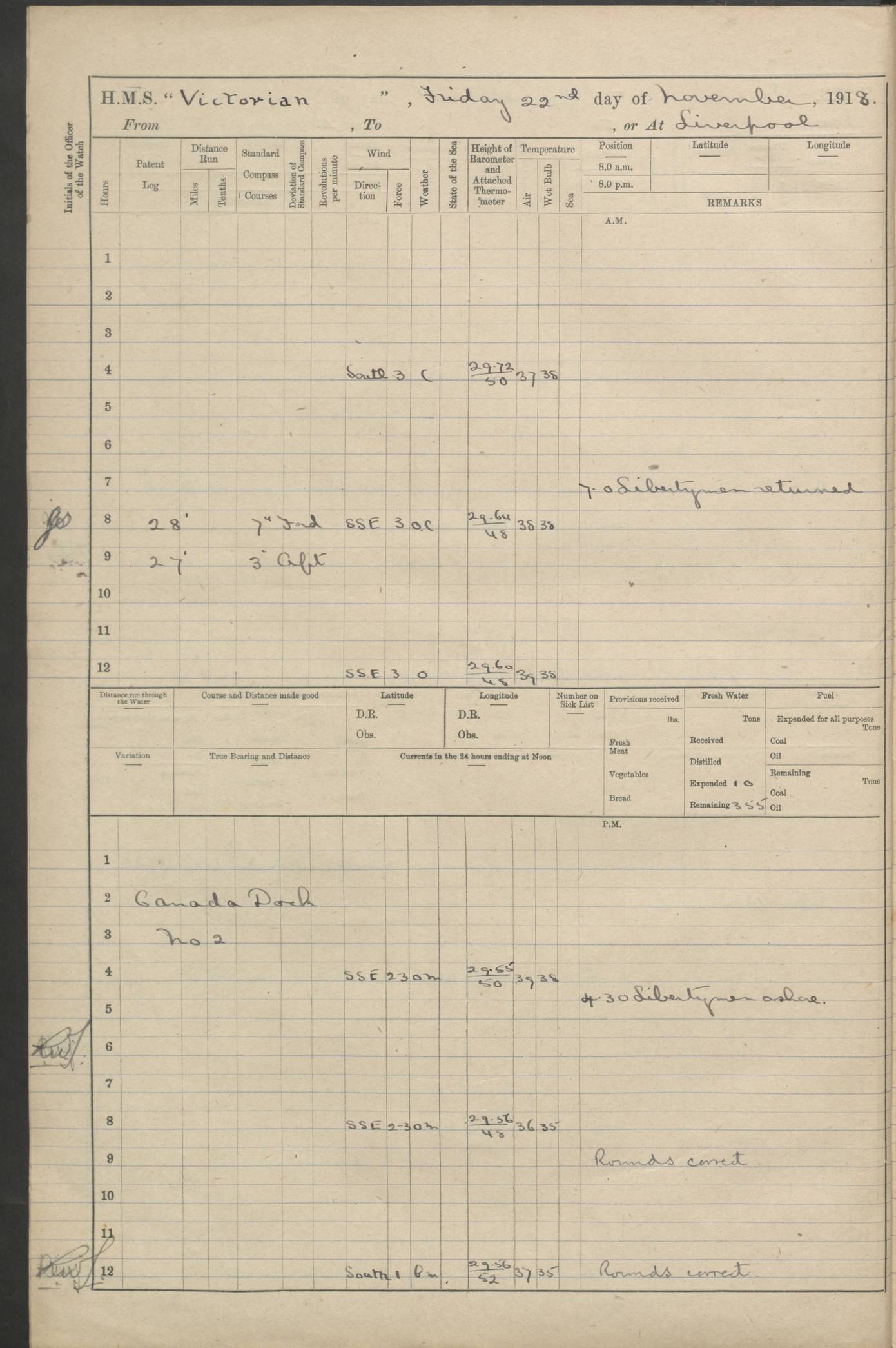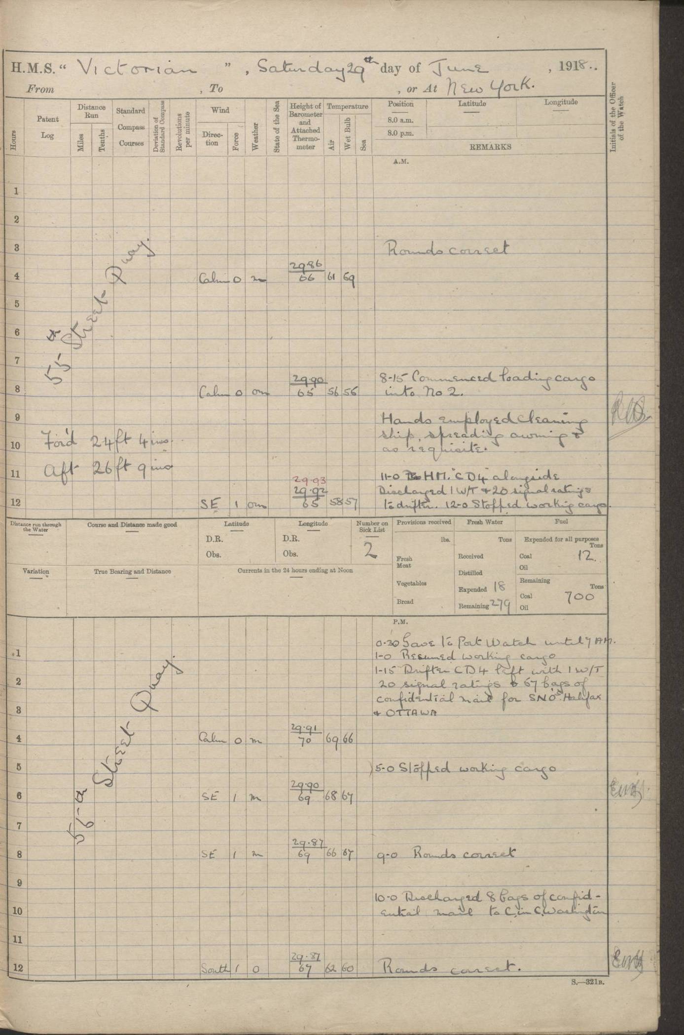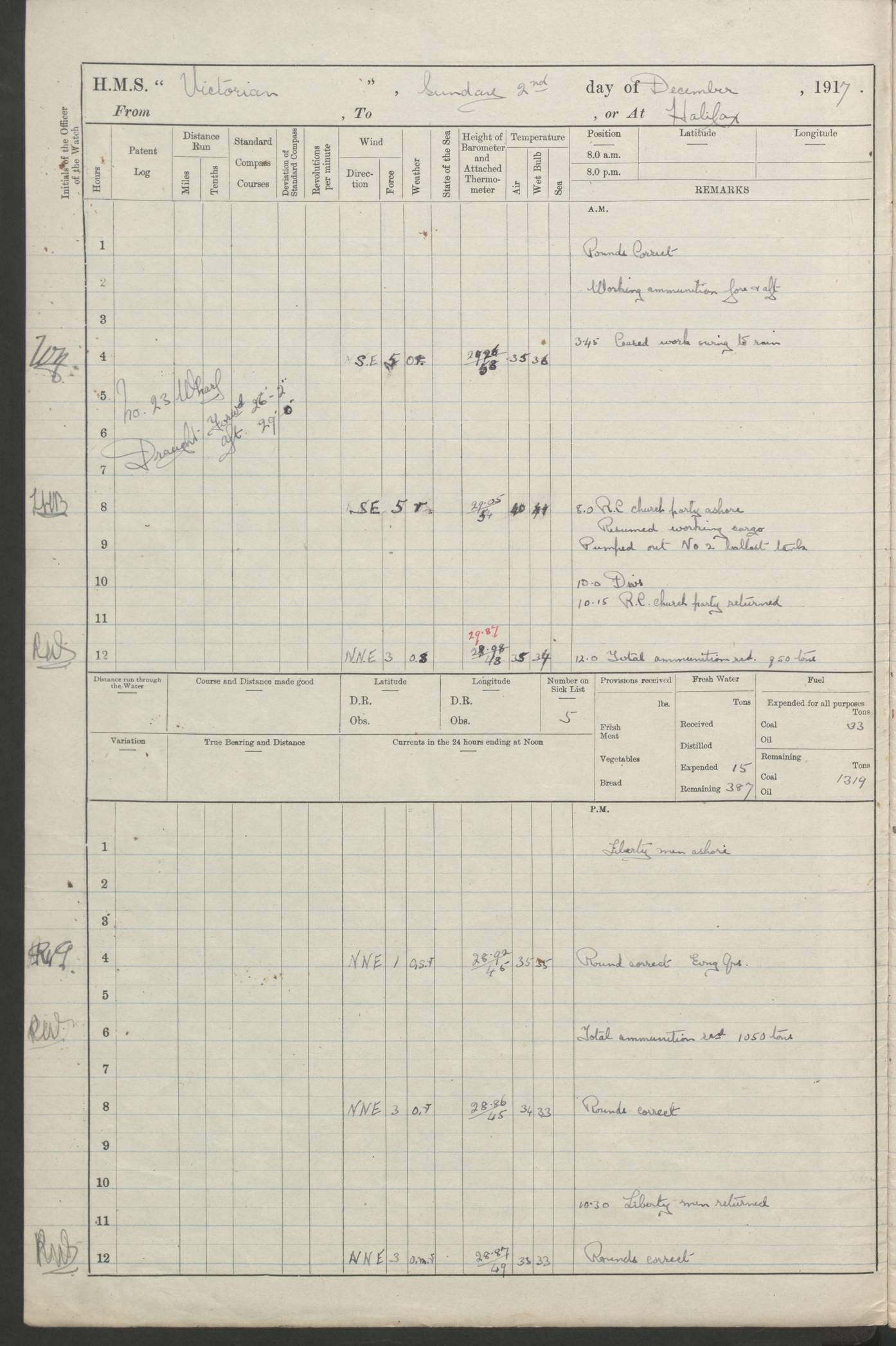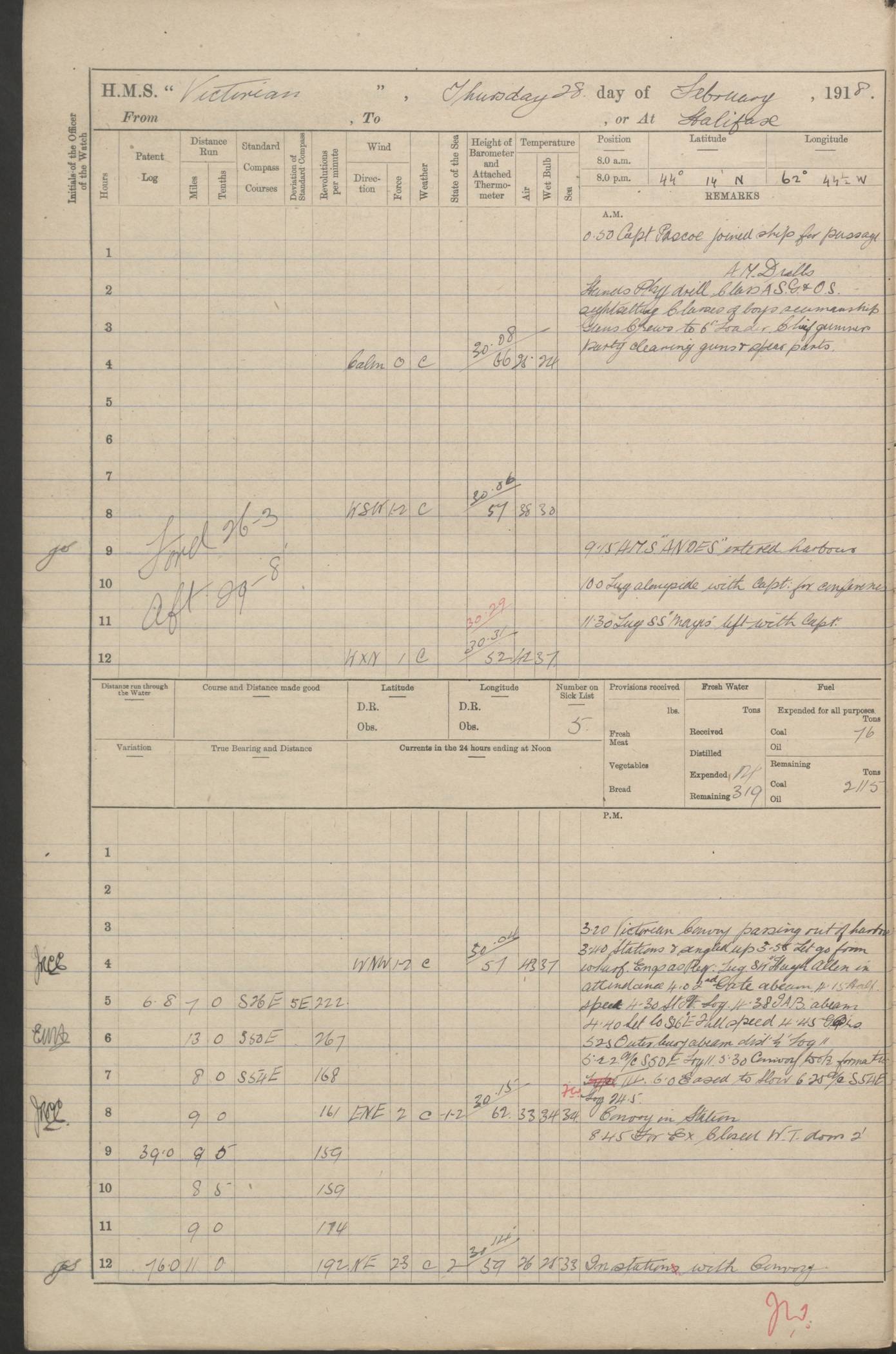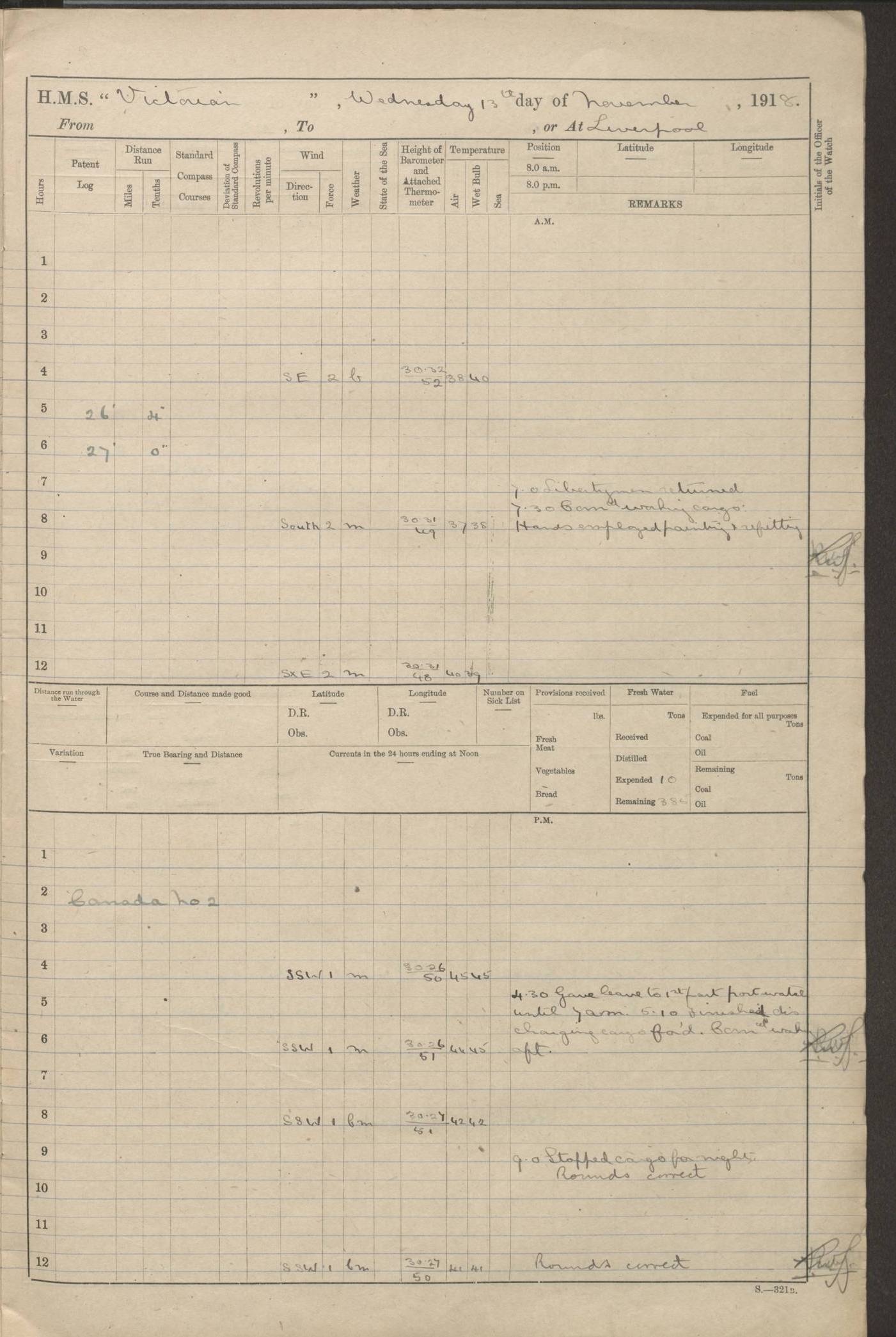 LOGS FOR JANUARY 1918 4caf8c4dcadfd341970358e2: (http://oldweather.s3.amazonaws.com/ADM 53-67407/ADM 53-67407-00001_0.jpg) [Left hand side of cover of Copy of Log for January 1918] 4caf8c4dcadfd341970358e3: (http://oldweather.s3.amazonaws.com/ADM 53-67407/ADM 53-67407-00001_1.jpg) [Right hand side of cover, signed by Navigating Officer, as before] 4caf8c4dcadfd341970358e4: (http://oldweather.s3.amazonaws.com/ADM 53-67407/ADM 53-67407-00002_0.jpg) [Blank page] 4caf8c4dcadfd341970358e5: (http://oldweather.s3.amazonaws.com/ADM 53-67407/ADM 53-67407-00002_1.jpg) [Page not filled in] 4caf8c4dcadfd341970358e6: (http://oldweather.s3.amazonaws.com/ADM 53-67407/ADM 53-67407-00003_0.jpg) [Details of Barometer and Thermometers, as previous month (though no numbers for Thermometers for Air Temperature)] 4caf8c4dcadfd341970358e7: (http://oldweather.s3.amazonaws.com/ADM 53-67407/ADM 53-67407-00003_1.jpg) 1 January 1918 From Liverpool to Halifax Lat 48.23, Long -45.67 [Position: 335 miles E of Newfoundland] 4.00am and 8.0am: In Station with convoy. am Drills: Tested Depth Charges. Class of boys Seamanship and ammunition. Sightsetters sight setting. Ordinary Seamen Seamanship. Royal Marines Signals. Deflection Teacher. Guns Crew of Morning watch to Loader. Noon: Altered course S77W, Log 87. In station with Convoy. pm: PM Drills. Guns Crews of Forenoon watch to Loader. Ship Company .22 Rim firing. 4.00pm: In station with Convoy. Evening Quarters. 4.12pm: Hauled in Log, foul and cleared. 5.00pm: Clocks put back 25 minutes. 6.00pm and Midnight: In station with Convoy. [Course and Distance made good: S54W, 335 miles] [Wind mostly southerly force 5 to 6 until 8pm, with rough sea for part of pm] 4caf8c4dcadfd341970358e8: (http://oldweather.s3.amazonaws.com/ADM 53-67407/ADM 53-67407-00004_0.jpg) 2 January 1918 From Liverpool to Halifax Lat 45.20, Long -51.15 [Position: 135 miles SE of Newfoundland] am: AM Drill. Tested Depth Charges. Hands Physical drill. Class Ordinary Seaman Gunners III 6 inch QF gun drill. Ordinary Seamen training Class ammunition. Class of Boys Torpedo Instructions. Gun layers and Trainers and Sight Setters Deflection Teacher. Guns crews of Morning watch to 6 inch Loader. 8.00am: In station with Convoy, altered course N65W, Log 36. Noon: Altered course N64W. SS METAGAMA proceeded to St John’s New Brunswick pm Drills: Junior Officers sightsetting. Guns Crews of Fornoon [Forenoon] watch 6 inch Loader. Foretopmen .22 Rim firing. 5.30pm: Clocks put back 30 minutes. [Distance made good: 299 miles] [Distance: to Halifax outer buoy = 521 miles] 4caf8c4dcadfd341970358e9: (http://oldweather.s3.amazonaws.com/ADM 53-67407/ADM 53-67407-00004_1.jpg) 3 January 1918 From Liverpool to Halifax Lat 44.83, Long -58.17 [Position 140 miles E of Nova Scotia] 8.30am: Commenced Sounding. [Course and Distance made good: S86W, 299 miles] [True Bearing and Distance: to Halifax outer buoy = S83.5W, 223 miles] 4caf8c4dcadfd341970358ea: (http://oldweather.s3.amazonaws.com/ADM 53-67407/ADM 53-67407-00005_0.jpg) 4 January 1918 From Liverpool to Halifax [and at Halifax NS] Lat 44.66, Long -63.58 [estimated] [Position: No 2 Pier, Halifax, Nova Scotia] 4.00am: Commenced Sounding. Increased to half Speed. 6.20am: Whistle buoy bearing N20W, altered course N22W, Log 85.5. 6.30am: Buoy abeam. 7.15am: Stopped and hauled in Log 96.5. 7.35am: Chebucto Light N49W. Proceeded North. 7.47am: Chebucto Light abeam. Dead Slow. 7.50am: Course and Speed as Requisite. 8.50am: First gate. 9.00am: Second gate. 9.10am: Pilot on board. Proceeded alongside No 2 Pier. Tugs Canso, Gladiator and Weatherspoon [probably WM Weatherspoon] assisting. 9.30am: Entered dock. 9.40am: Made fast. 10.00am: HE [His Excellency] Sir WE Davidson left ship. Cargo party Stevedores on board. [Wharf No 2] pm Drills: Chief Gunner parties sponging and cleaning out all guns. Remainder of hands employed cleaning holds for Cargo. 5.00pm: Liberty men ashore. [Distance made good: 240 miles] [Noon Position] [Halifax No 2 Wharf] [Fuel Remaining: Coal 1262 tons] [Rain for most of day, noon temperature 37F] [Note: Tug “Canso” (listed here as 126803) was built and registered in Yarmouth, Nova Scotia, in 1910 and owned by The Minister of Public Works for the Dominion of Canada, Ottawa. Tug “WM Weatherspoon” (listed here as 94697) was built in Digby, Nova Scotia, in 1890, registered in Sydney, Nova Scotia, in 1908 and owned by Hugh McDonald, Sydney.] 4caf8c4dcadfd341970358eb: (http://oldweather.s3.amazonaws.com/ADM 53-67407/ADM 53-67407-00005_1.jpg) 5 January 1918 At Halifax Lat 44.66, Long -63.58 [Position: No 2 Pier, Halifax, Nova Scotia] [Wharf No 2 Halifax] am Drills: Chief gunners parties examining exposed ammunition. Cleaning guns and Shells. am: Commenced loading Steel bars No 2 and No 4 Hatch. Hands employed taking stores on board and Saturday Routine. Party of Men ashore at dockyard for stores. 1.15pm: Liberty men ashore. 2.15pm: Resumed working Cargo No 4. 3.45pm and 4.45pm: Liberty men ashore. 4caf8c4dcadfd341970358ec: (http://oldweather.s3.amazonaws.com/ADM 53-67407/ADM 53-67407-00006_0.jpg) 6 January 1918 At Halifax Lat 44.66, Long -63.58 [Position: No 2 Pier, Halifax, Nova Scotia] [No 2 Pier] 8.00am: Rounds Correct. USS “SOUTH DAKOTA” entered harbour. 9.00am: Officer of guard left ship in cutter. 9.45am: Officer of guard returned. 10.00am: RC party ashore. Divisions and Captain’s Inspections and Divine Service. 11.00am: RC party returned. 2.00pm: Signal Rating discharged to the NIOBE. 4.30pm: Liberty men ashore. 10.00pm: Liberty men returned. [Note: USS “South Dakota” (Armored Cruiser No 9, later ACR-9) was built in California and launched in 1904; she was in commission from 1907 and in 1920 was reclassified as CA-9 and renamed “Huron”; she was sold for scrap in 1930; she was towed to Powell River, British Colombia, in 1931 and used as a breakwater (more details here).] 4caf8c4dcadfd341970358ed: (http://oldweather.s3.amazonaws.com/ADM 53-67407/