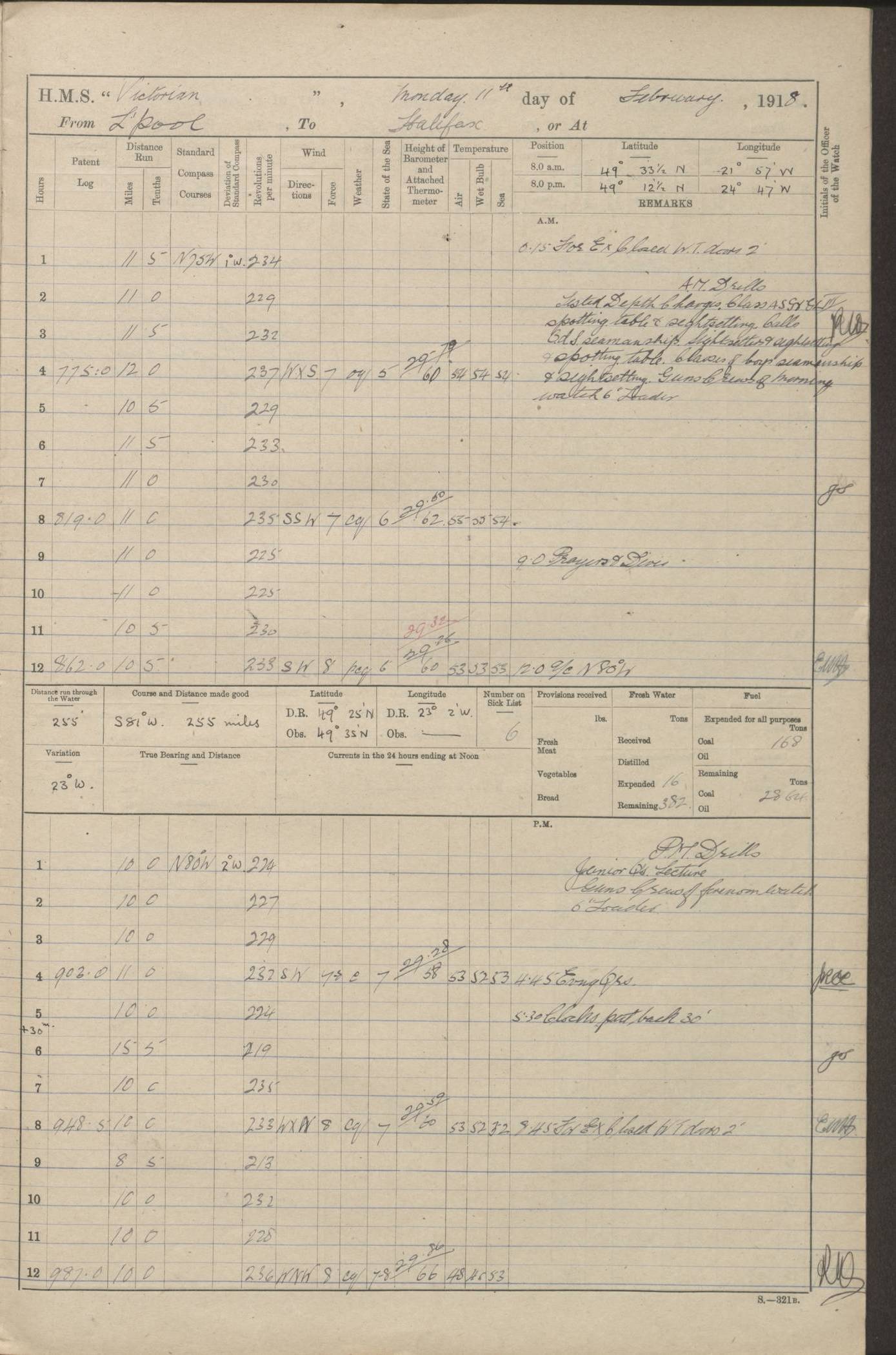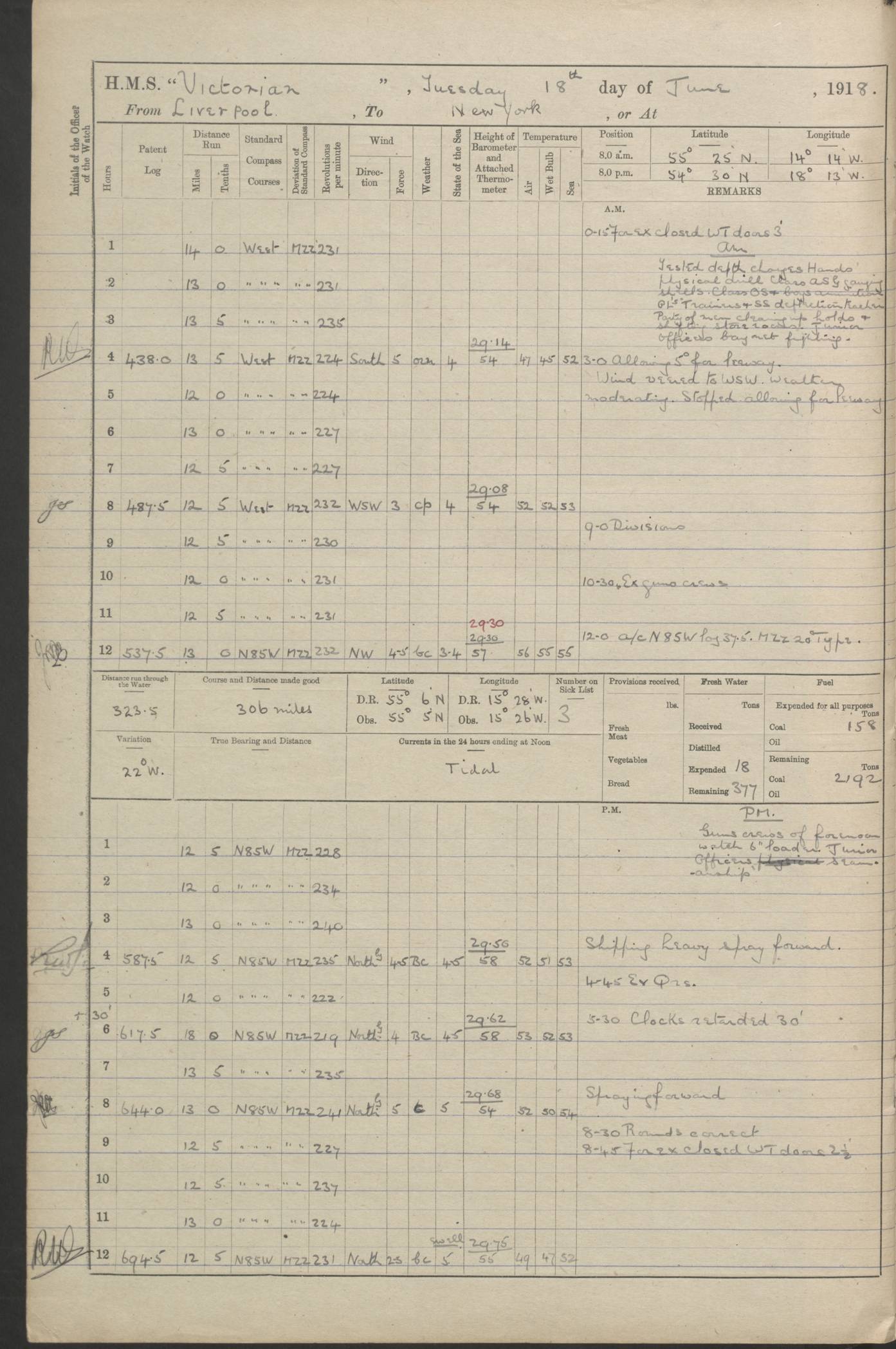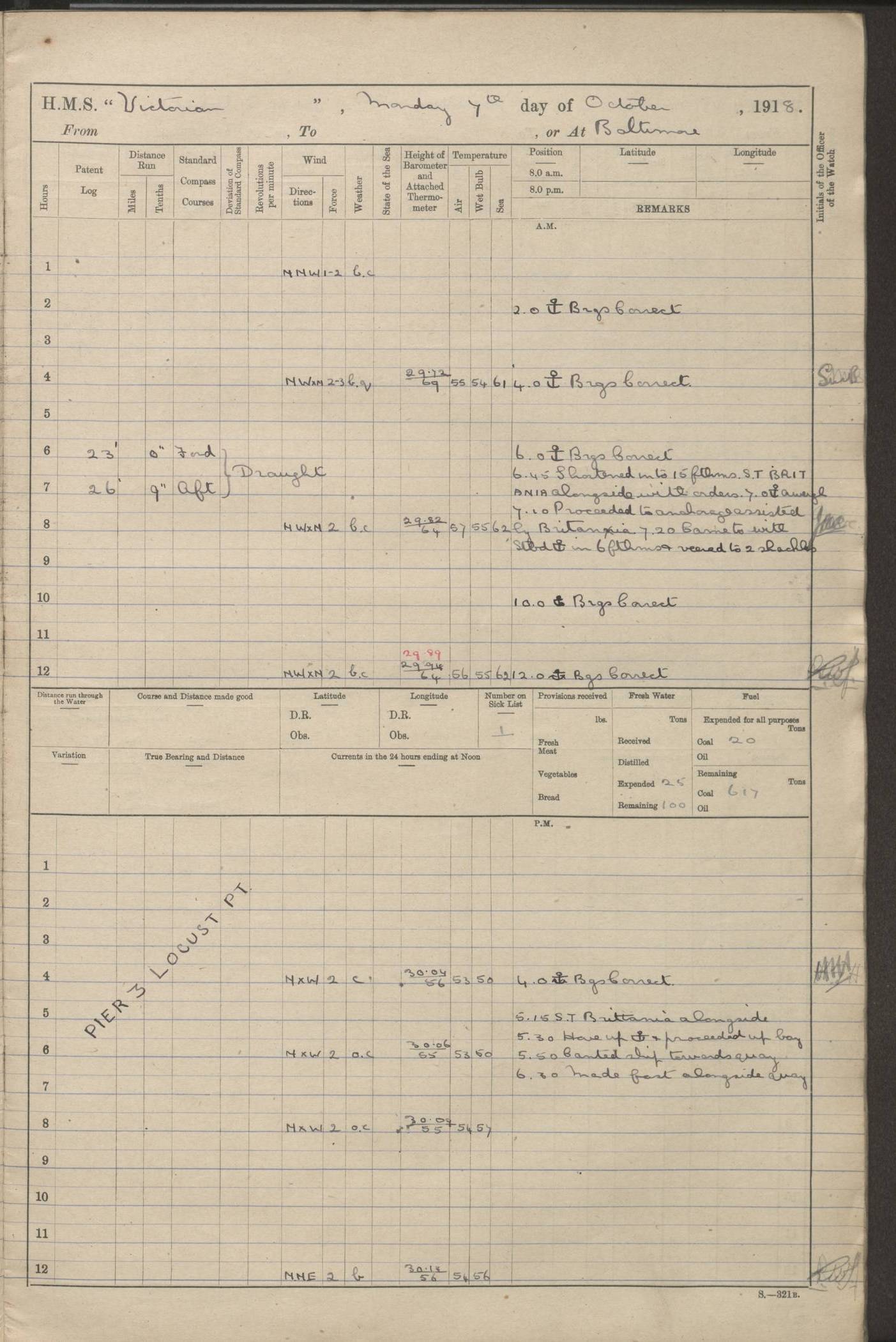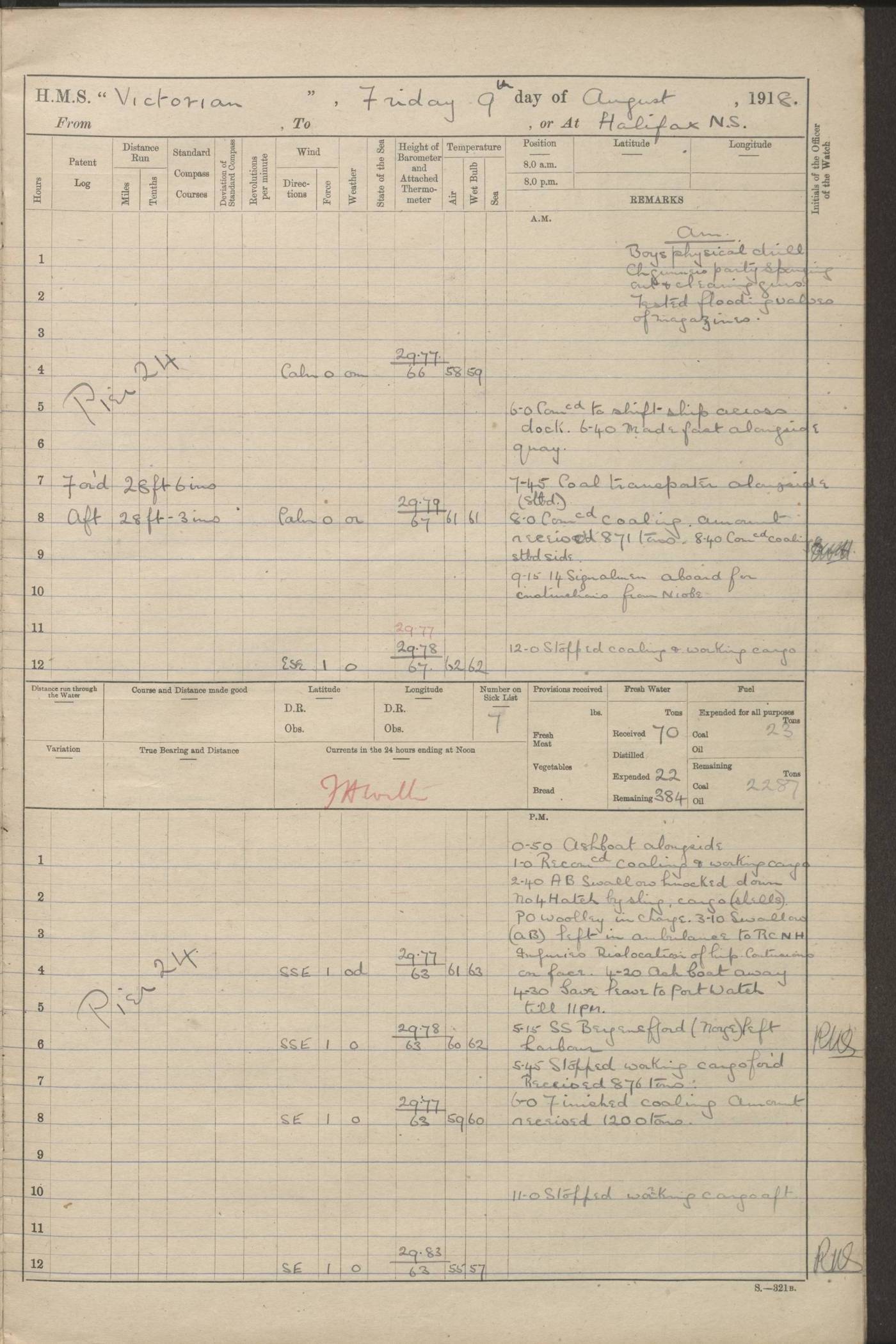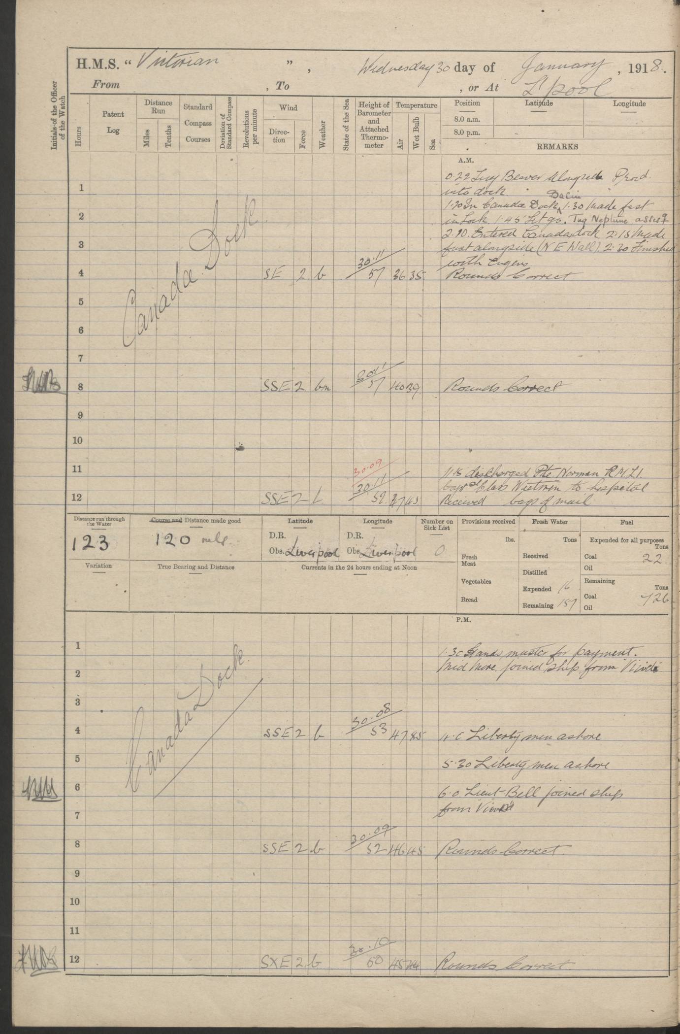 LOGS FOR JANUARY 1918 4caf8c4dcadfd341970358e2: (http://oldweather.s3.amazonaws.com/ADM 53-67407/ADM 53-67407-00001_0.jpg) [Left hand side of cover of Copy of Log for January 1918] 4caf8c4dcadfd341970358e3: (http://oldweather.s3.amazonaws.com/ADM 53-67407/ADM 53-67407-00001_1.jpg) [Right hand side of cover, signed by Navigating Officer, as before] 4caf8c4dcadfd341970358e4: (http://oldweather.s3.amazonaws.com/ADM 53-67407/ADM 53-67407-00002_0.jpg) [Blank page] 4caf8c4dcadfd341970358e5: (http://oldweather.s3.amazonaws.com/ADM 53-67407/ADM 53-67407-00002_1.jpg) [Page not filled in] 4caf8c4dcadfd341970358e6: (http://oldweather.s3.amazonaws.com/ADM 53-67407/ADM 53-67407-00003_0.jpg) [Details of Barometer and Thermometers, as previous month (though no numbers for Thermometers for Air Temperature)] 4caf8c4dcadfd341970358e7: (http://oldweather.s3.amazonaws.com/ADM 53-67407/ADM 53-67407-00003_1.jpg) 1 January 1918 From Liverpool to Halifax Lat 48.23, Long -45.67 [Position: 335 miles E of Newfoundland] 4.00am and 8.0am: In Station with convoy. am Drills: Tested Depth Charges. Class of boys Seamanship and ammunition. Sightsetters sight setting. Ordinary Seamen Seamanship. Royal Marines Signals. Deflection Teacher. Guns Crew of Morning watch to Loader. Noon: Altered course S77W, Log 87. In station with Convoy. pm: PM Drills. Guns Crews of Forenoon watch to Loader. Ship Company .22 Rim firing. 4.00pm: In station with Convoy. Evening Quarters. 4.12pm: Hauled in Log, foul and cleared. 5.00pm: Clocks put back 25 minutes. 6.00pm and Midnight: In station with Convoy. [Course and Distance made good: S54W, 335 miles] [Wind mostly southerly force 5 to 6 until 8pm, with rough sea for part of pm] 4caf8c4dcadfd341970358e8: (http://oldweather.s3.amazonaws.com/ADM 53-67407/ADM 53-67407-00004_0.jpg) 2 January 1918 From Liverpool to Halifax Lat 45.20, Long -51.15 [Position: 135 miles SE of Newfoundland] am: AM Drill. Tested Depth Charges. Hands Physical drill. Class Ordinary Seaman Gunners III 6 inch QF gun drill. Ordinary Seamen training Class ammunition. Class of Boys Torpedo Instructions. Gun layers and Trainers and Sight Setters Deflection Teacher. Guns crews of Morning watch to 6 inch Loader. 8.00am: In station with Convoy, altered course N65W, Log 36. Noon: Altered course N64W. SS METAGAMA proceeded to St John’s New Brunswick pm Drills: Junior Officers sightsetting. Guns Crews of Fornoon [Forenoon] watch 6 inch Loader. Foretopmen .22 Rim firing. 5.30pm: Clocks put back 30 minutes. [Distance made good: 299 miles] [Distance: to Halifax outer buoy = 521 miles] 4caf8c4dcadfd341970358e9: (http://oldweather.s3.amazonaws.com/ADM 53-67407/ADM 53-67407-00004_1.jpg) 3 January 1918 From Liverpool to Halifax Lat 44.83, Long -58.17 [Position 140 miles E of Nova Scotia] 8.30am: Commenced Sounding. [Course and Distance made good: S86W, 299 miles] [True Bearing and Distance: to Halifax outer buoy = S83.5W, 223 miles] 4caf8c4dcadfd341970358ea: (http://oldweather.s3.amazonaws.com/ADM 53-67407/ADM 53-67407-00005_0.jpg) 4 January 1918 From Liverpool to Halifax [and at Halifax NS] Lat 44.66, Long -63.58 [estimated] [Position: No 2 Pier, Halifax, Nova Scotia] 4.00am: Commenced Sounding. Increased to half Speed. 6.20am: Whistle buoy bearing N20W, altered course N22W, Log 85.5. 6.30am: Buoy abeam. 7.15am: Stopped and hauled in Log 96.5. 7.35am: Chebucto Light N49W. Proceeded North. 7.47am: Chebucto Light abeam. Dead Slow. 7.50am: Course and Speed as Requisite. 8.50am: First gate. 9.00am: Second gate. 9.10am: Pilot on board. Proceeded alongside No 2 Pier. Tugs Canso, Gladiator and Weatherspoon [probably WM Weatherspoon] assisting. 9.30am: Entered dock. 9.40am: Made fast. 10.00am: HE [His Excellency] Sir WE Davidson left ship. Cargo party Stevedores on board. [Wharf No 2] pm Drills: Chief Gunner parties sponging and cleaning out all guns. Remainder of hands employed cleaning holds for Cargo. 5.00pm: Liberty men ashore. [Distance made good: 240 miles] [Noon Position] [Halifax No 2 Wharf] [Fuel Remaining: Coal 1262 tons] [Rain for most of day, noon temperature 37F] [Note: Tug “Canso” (listed here as 126803) was built and registered in Yarmouth, Nova Scotia, in 1910 and owned by The Minister of Public Works for the Dominion of Canada, Ottawa. Tug “WM Weatherspoon” (listed here as 94697) was built in Digby, Nova Scotia, in 1890, registered in Sydney, Nova Scotia, in 1908 and owned by Hugh McDonald, Sydney.] 4caf8c4dcadfd341970358eb: (http://oldweather.s3.amazonaws.com/ADM 53-67407/ADM 53-67407-00005_1.jpg) 5 January 1918 At Halifax Lat 44.66, Long -63.58 [Position: No 2 Pier, Halifax, Nova Scotia] [Wharf No 2 Halifax] am Drills: Chief gunners parties examining exposed ammunition. Cleaning guns and Shells. am: Commenced loading Steel bars No 2 and No 4 Hatch. Hands employed taking stores on board and Saturday Routine. Party of Men ashore at dockyard for stores. 1.15pm: Liberty men ashore. 2.15pm: Resumed working Cargo No 4. 3.45pm and 4.45pm: Liberty men ashore. 4caf8c4dcadfd341970358ec: (http://oldweather.s3.amazonaws.com/ADM 53-67407/ADM 53-67407-00006_0.jpg) 6 January 1918 At Halifax Lat 44.66, Long -63.58 [Position: No 2 Pier, Halifax, Nova Scotia] [No 2 Pier] 8.00am: Rounds Correct. USS “SOUTH DAKOTA” entered harbour. 9.00am: Officer of guard left ship in cutter. 9.45am: Officer of guard returned. 10.00am: RC party ashore. Divisions and Captain’s Inspections and Divine Service. 11.00am: RC party returned. 2.00pm: Signal Rating discharged to the NIOBE. 4.30pm: Liberty men ashore. 10.00pm: Liberty men returned. [Note: USS “South Dakota” (Armored Cruiser No 9, later ACR-9) was built in California and launched in 1904; she was in commission from 1907 and in 1920 was reclassified as CA-9 and renamed “Huron”; she was sold for scrap in 1930; she was towed to Powell River, British Colombia, in 1931 and used as a breakwater (more details here).] 4caf8c4dcadfd341970358ed: (http://oldweather.s3.amazonaws.com/ADM 53-67407/