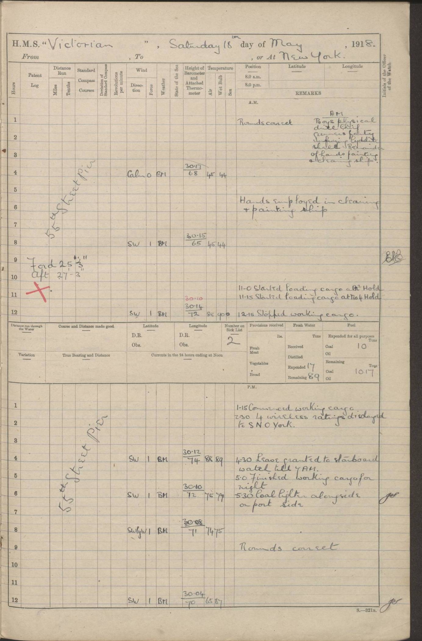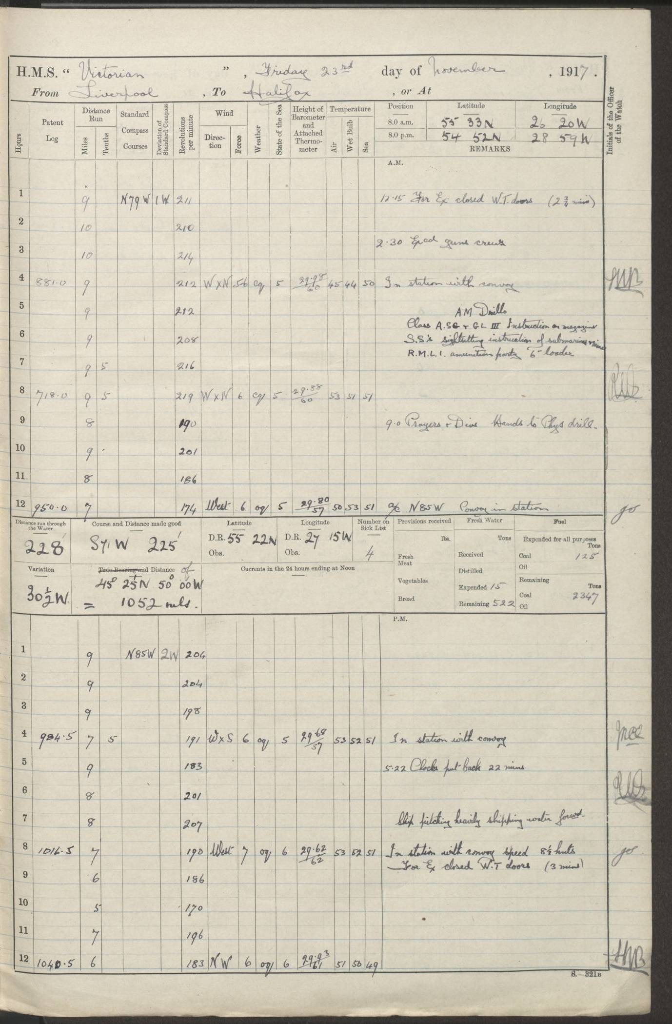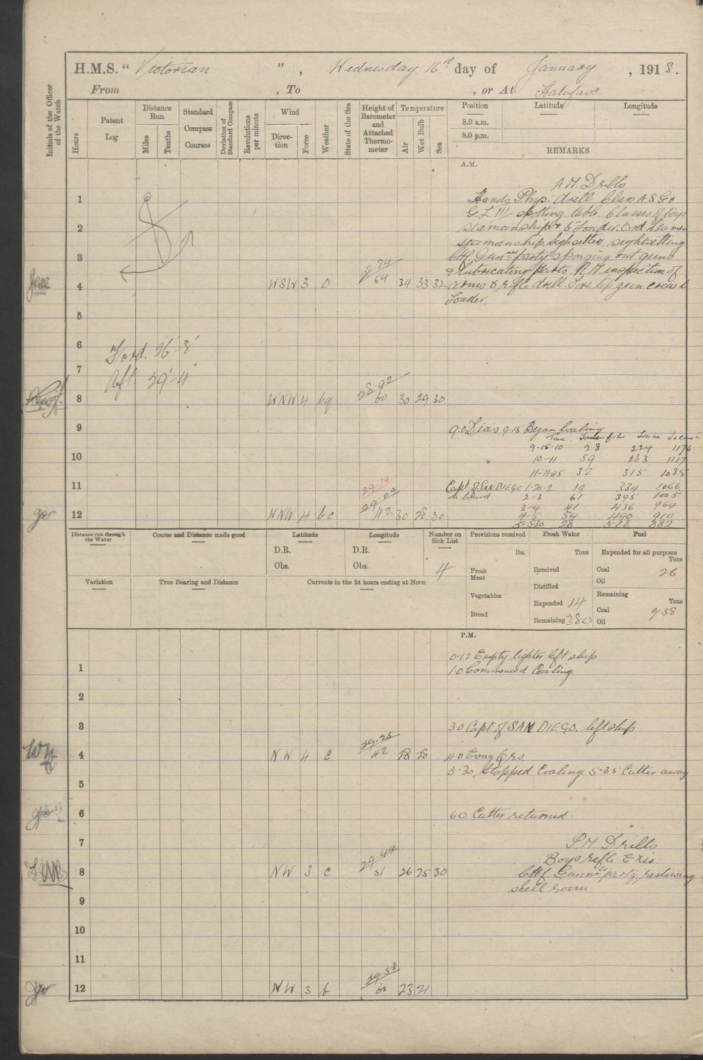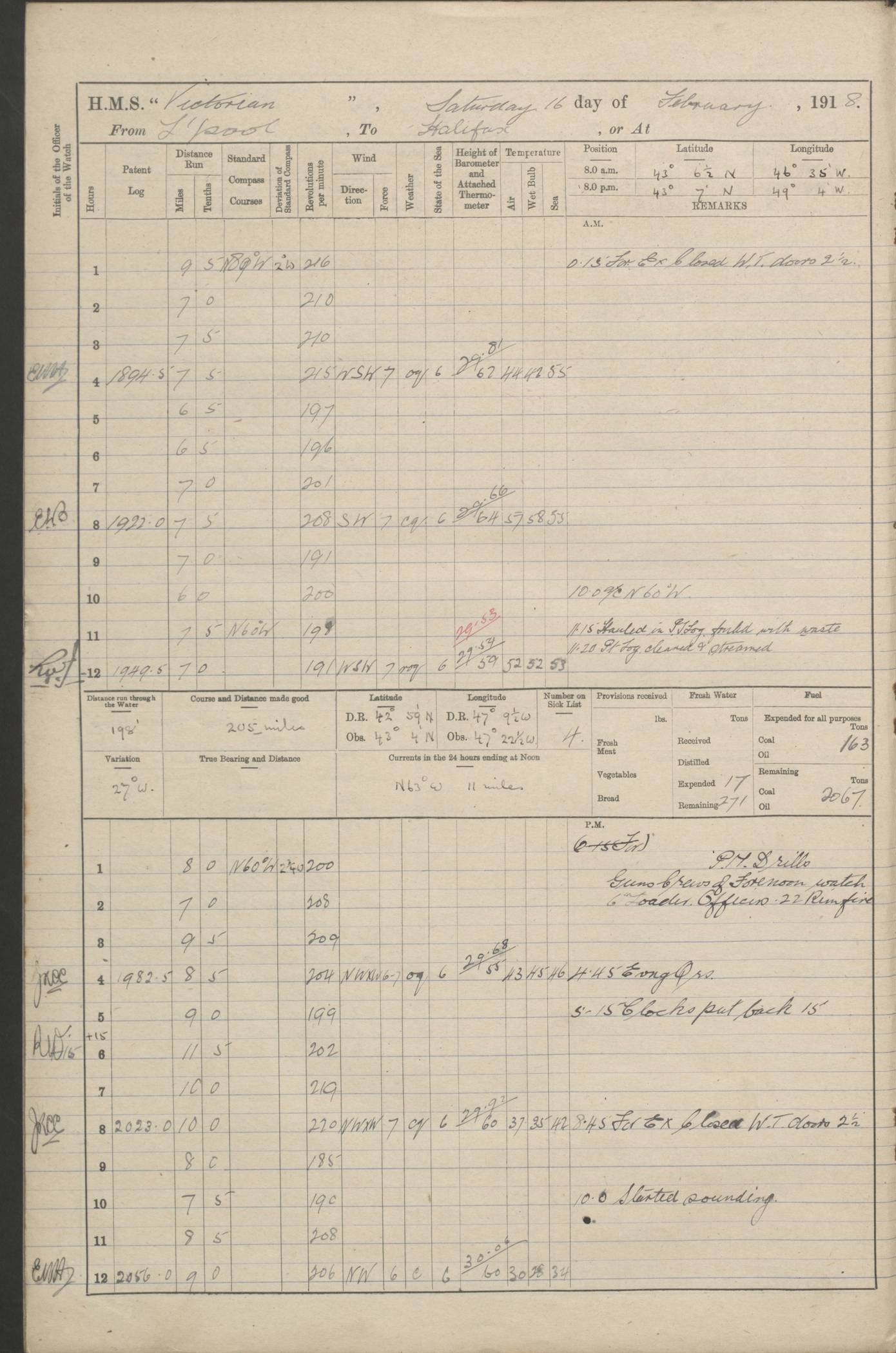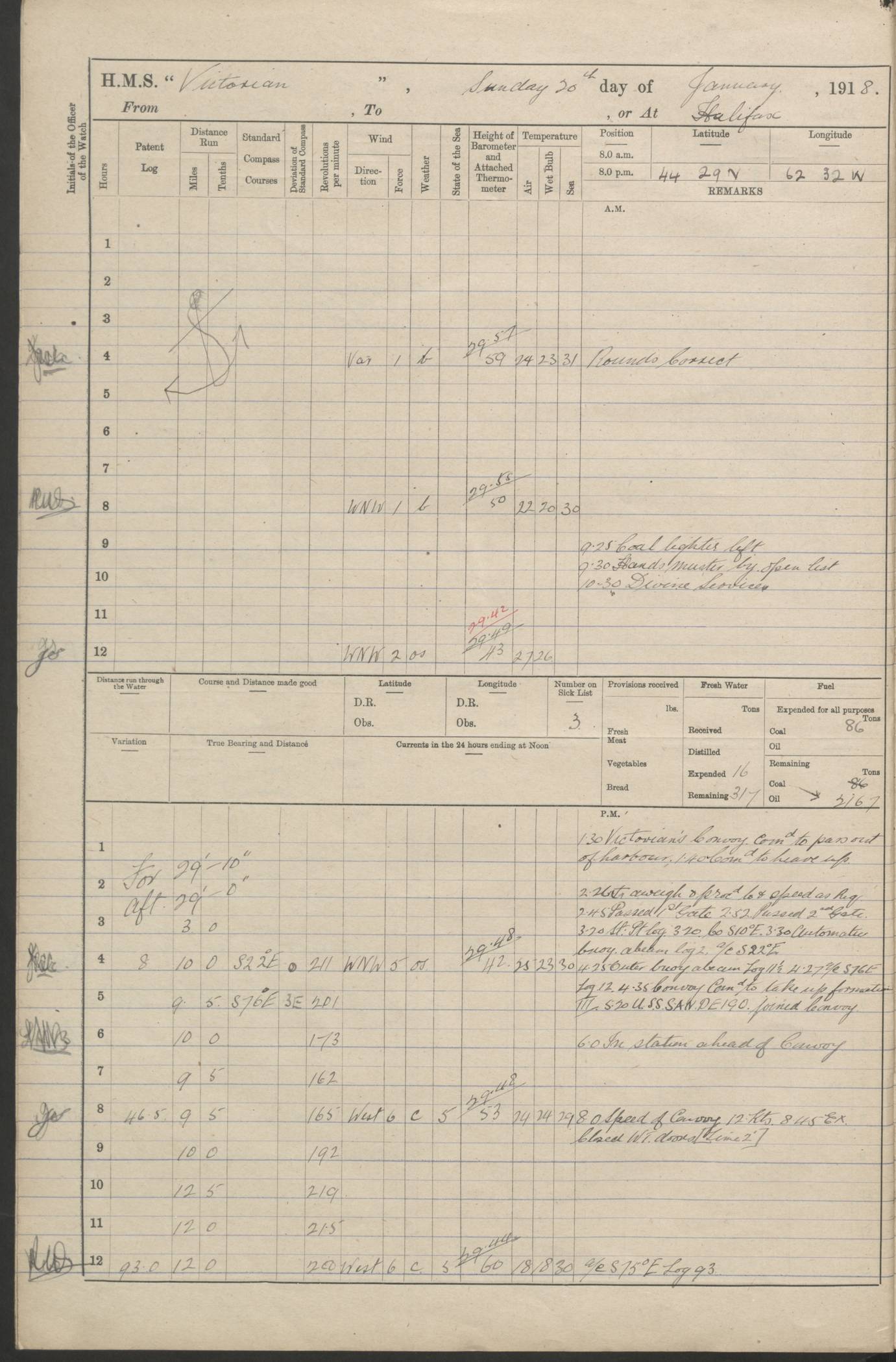 LOGS FOR JANUARY 1918 4caf8c4dcadfd341970358e2: (http://oldweather.s3.amazonaws.com/ADM 53-67407/ADM 53-67407-00001_0.jpg) [Left hand side of cover of Copy of Log for January 1918] 4caf8c4dcadfd341970358e3: (http://oldweather.s3.amazonaws.com/ADM 53-67407/ADM 53-67407-00001_1.jpg) [Right hand side of cover, signed by Navigating Officer, as before] 4caf8c4dcadfd341970358e4: (http://oldweather.s3.amazonaws.com/ADM 53-67407/ADM 53-67407-00002_0.jpg) [Blank page] 4caf8c4dcadfd341970358e5: (http://oldweather.s3.amazonaws.com/ADM 53-67407/ADM 53-67407-00002_1.jpg) [Page not filled in] 4caf8c4dcadfd341970358e6: (http://oldweather.s3.amazonaws.com/ADM 53-67407/ADM 53-67407-00003_0.jpg) [Details of Barometer and Thermometers, as previous month (though no numbers for Thermometers for Air Temperature)] 4caf8c4dcadfd341970358e7: (http://oldweather.s3.amazonaws.com/ADM 53-67407/ADM 53-67407-00003_1.jpg) 1 January 1918 From Liverpool to Halifax Lat 48.23, Long -45.67 [Position: 335 miles E of Newfoundland] 4.00am and 8.0am: In Station with convoy. am Drills: Tested Depth Charges. Class of boys Seamanship and ammunition. Sightsetters sight setting. Ordinary Seamen Seamanship. Royal Marines Signals. Deflection Teacher. Guns Crew of Morning watch to Loader. Noon: Altered course S77W, Log 87. In station with Convoy. pm: PM Drills. Guns Crews of Forenoon watch to Loader. Ship Company .22 Rim firing. 4.00pm: In station with Convoy. Evening Quarters. 4.12pm: Hauled in Log, foul and cleared. 5.00pm: Clocks put back 25 minutes. 6.00pm and Midnight: In station with Convoy. [Course and Distance made good: S54W, 335 miles] [Wind mostly southerly force 5 to 6 until 8pm, with rough sea for part of pm] 4caf8c4dcadfd341970358e8: (http://oldweather.s3.amazonaws.com/ADM 53-67407/ADM 53-67407-00004_0.jpg) 2 January 1918 From Liverpool to Halifax Lat 45.20, Long -51.15 [Position: 135 miles SE of Newfoundland] am: AM Drill. Tested Depth Charges. Hands Physical drill. Class Ordinary Seaman Gunners III 6 inch QF gun drill. Ordinary Seamen training Class ammunition. Class of Boys Torpedo Instructions. Gun layers and Trainers and Sight Setters Deflection Teacher. Guns crews of Morning watch to 6 inch Loader. 8.00am: In station with Convoy, altered course N65W, Log 36. Noon: Altered course N64W. SS METAGAMA proceeded to St John’s New Brunswick pm Drills: Junior Officers sightsetting. Guns Crews of Fornoon [Forenoon] watch 6 inch Loader. Foretopmen .22 Rim firing. 5.30pm: Clocks put back 30 minutes. [Distance made good: 299 miles] [Distance: to Halifax outer buoy = 521 miles] 4caf8c4dcadfd341970358e9: (http://oldweather.s3.amazonaws.com/ADM 53-67407/ADM 53-67407-00004_1.jpg) 3 January 1918 From Liverpool to Halifax Lat 44.83, Long -58.17 [Position 140 miles E of Nova Scotia] 8.30am: Commenced Sounding. [Course and Distance made good: S86W, 299 miles] [True Bearing and Distance: to Halifax outer buoy = S83.5W, 223 miles] 4caf8c4dcadfd341970358ea: (http://oldweather.s3.amazonaws.com/ADM 53-67407/ADM 53-67407-00005_0.jpg) 4 January 1918 From Liverpool to Halifax [and at Halifax NS] Lat 44.66, Long -63.58 [estimated] [Position: No 2 Pier, Halifax, Nova Scotia] 4.00am: Commenced Sounding. Increased to half Speed. 6.20am: Whistle buoy bearing N20W, altered course N22W, Log 85.5. 6.30am: Buoy abeam. 7.15am: Stopped and hauled in Log 96.5. 7.35am: Chebucto Light N49W. Proceeded North. 7.47am: Chebucto Light abeam. Dead Slow. 7.50am: Course and Speed as Requisite. 8.50am: First gate. 9.00am: Second gate. 9.10am: Pilot on board. Proceeded alongside No 2 Pier. Tugs Canso, Gladiator and Weatherspoon [probably WM Weatherspoon] assisting. 9.30am: Entered dock. 9.40am: Made fast. 10.00am: HE [His Excellency] Sir WE Davidson left ship. Cargo party Stevedores on board. [Wharf No 2] pm Drills: Chief Gunner parties sponging and cleaning out all guns. Remainder of hands employed cleaning holds for Cargo. 5.00pm: Liberty men ashore. [Distance made good: 240 miles] [Noon Position] [Halifax No 2 Wharf] [Fuel Remaining: Coal 1262 tons] [Rain for most of day, noon temperature 37F] [Note: Tug “Canso” (listed here as 126803) was built and registered in Yarmouth, Nova Scotia, in 1910 and owned by The Minister of Public Works for the Dominion of Canada, Ottawa. Tug “WM Weatherspoon” (listed here as 94697) was built in Digby, Nova Scotia, in 1890, registered in Sydney, Nova Scotia, in 1908 and owned by Hugh McDonald, Sydney.] 4caf8c4dcadfd341970358eb: (http://oldweather.s3.amazonaws.com/ADM 53-67407/ADM 53-67407-00005_1.jpg) 5 January 1918 At Halifax Lat 44.66, Long -63.58 [Position: No 2 Pier, Halifax, Nova Scotia] [Wharf No 2 Halifax] am Drills: Chief gunners parties examining exposed ammunition. Cleaning guns and Shells. am: Commenced loading Steel bars No 2 and No 4 Hatch. Hands employed taking stores on board and Saturday Routine. Party of Men ashore at dockyard for stores. 1.15pm: Liberty men ashore. 2.15pm: Resumed working Cargo No 4. 3.45pm and 4.45pm: Liberty men ashore. 4caf8c4dcadfd341970358ec: (http://oldweather.s3.amazonaws.com/ADM 53-67407/ADM 53-67407-00006_0.jpg) 6 January 1918 At Halifax Lat 44.66, Long -63.58 [Position: No 2 Pier, Halifax, Nova Scotia] [No 2 Pier] 8.00am: Rounds Correct. USS “SOUTH DAKOTA” entered harbour. 9.00am: Officer of guard left ship in cutter. 9.45am: Officer of guard returned. 10.00am: RC party ashore. Divisions and Captain’s Inspections and Divine Service. 11.00am: RC party returned. 2.00pm: Signal Rating discharged to the NIOBE. 4.30pm: Liberty men ashore. 10.00pm: Liberty men returned. [Note: USS “South Dakota” (Armored Cruiser No 9, later ACR-9) was built in California and launched in 1904; she was in commission from 1907 and in 1920 was reclassified as CA-9 and renamed “Huron”; she was sold for scrap in 1930; she was towed to Powell River, British Colombia, in 1931 and used as a breakwater (more details here).] 4caf8c4dcadfd341970358ed: (http://oldweather.s3.amazonaws.com/ADM 53-67407/