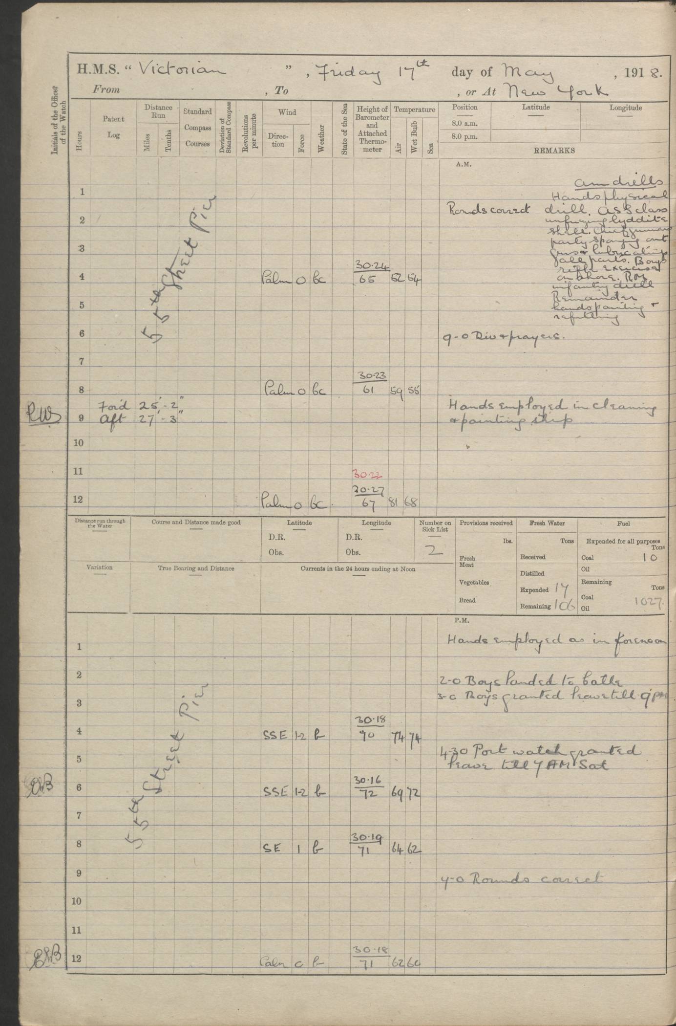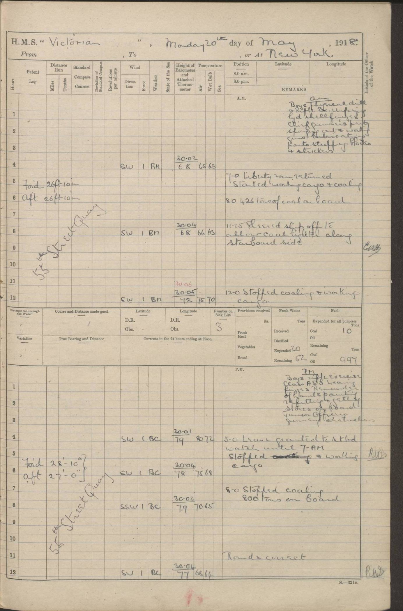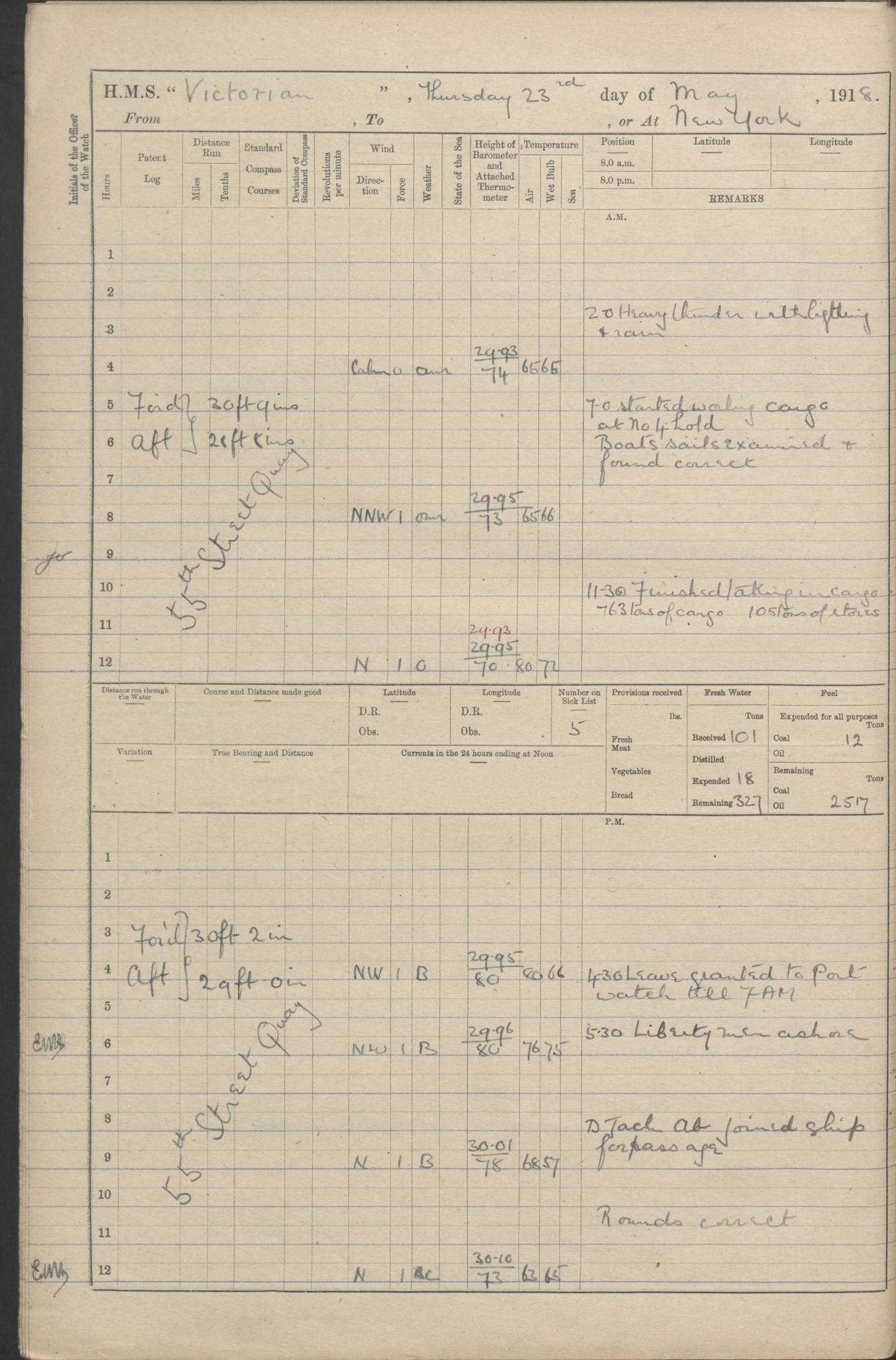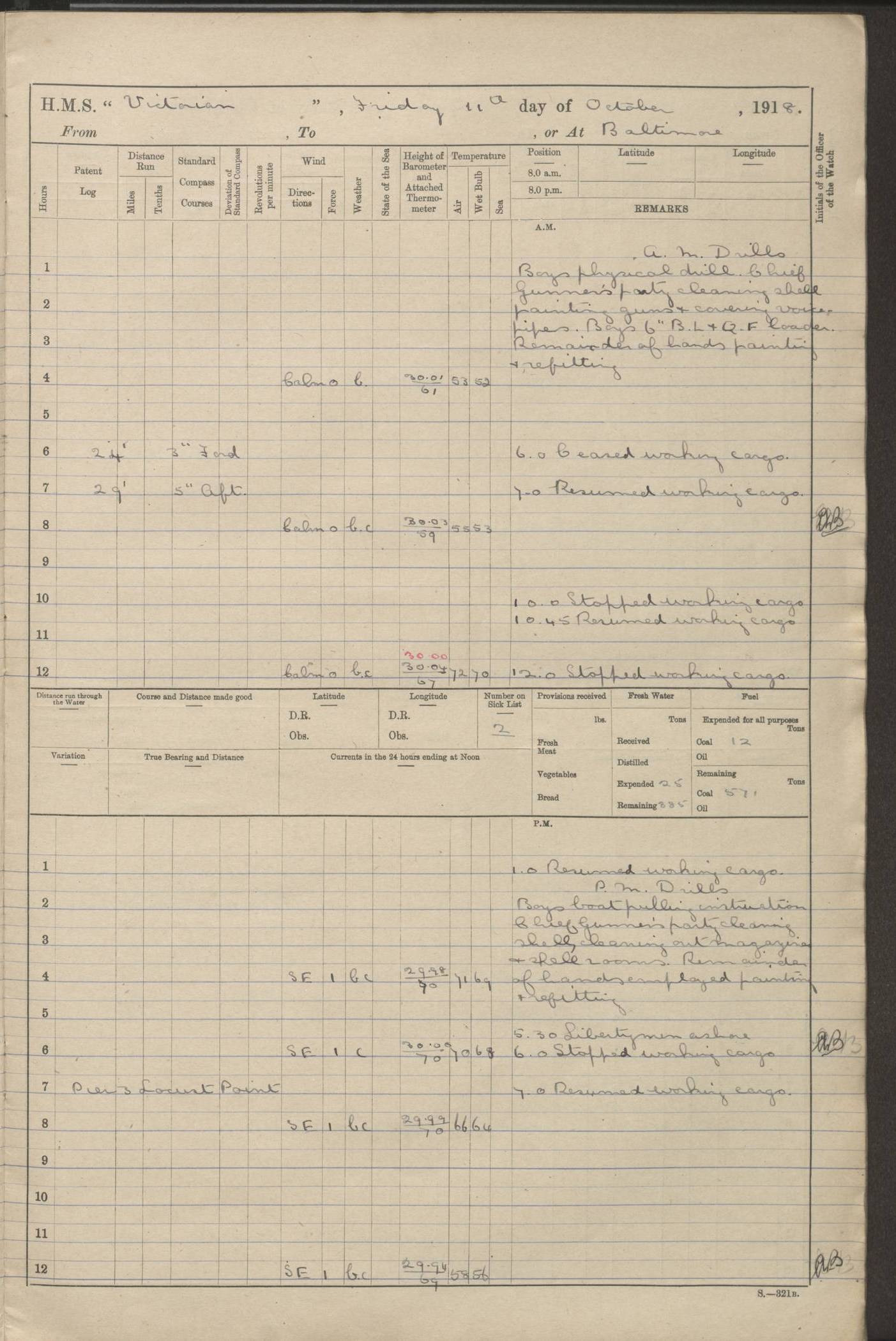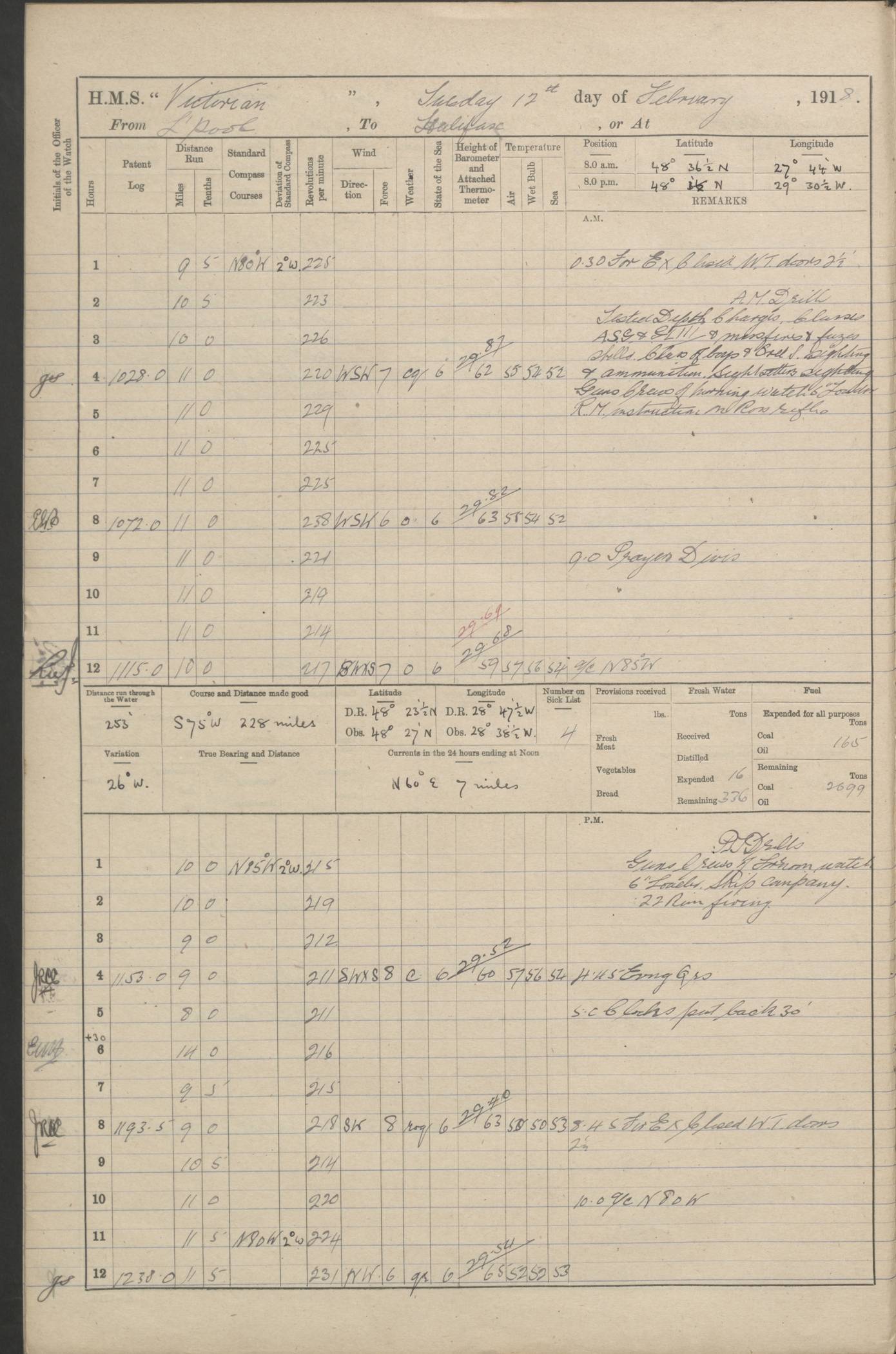 LOGS FOR JANUARY 1918 4caf8c4dcadfd341970358e2: (http://oldweather.s3.amazonaws.com/ADM 53-67407/ADM 53-67407-00001_0.jpg) [Left hand side of cover of Copy of Log for January 1918] 4caf8c4dcadfd341970358e3: (http://oldweather.s3.amazonaws.com/ADM 53-67407/ADM 53-67407-00001_1.jpg) [Right hand side of cover, signed by Navigating Officer, as before] 4caf8c4dcadfd341970358e4: (http://oldweather.s3.amazonaws.com/ADM 53-67407/ADM 53-67407-00002_0.jpg) [Blank page] 4caf8c4dcadfd341970358e5: (http://oldweather.s3.amazonaws.com/ADM 53-67407/ADM 53-67407-00002_1.jpg) [Page not filled in] 4caf8c4dcadfd341970358e6: (http://oldweather.s3.amazonaws.com/ADM 53-67407/ADM 53-67407-00003_0.jpg) [Details of Barometer and Thermometers, as previous month (though no numbers for Thermometers for Air Temperature)] 4caf8c4dcadfd341970358e7: (http://oldweather.s3.amazonaws.com/ADM 53-67407/ADM 53-67407-00003_1.jpg) 1 January 1918 From Liverpool to Halifax Lat 48.23, Long -45.67 [Position: 335 miles E of Newfoundland] 4.00am and 8.0am: In Station with convoy. am Drills: Tested Depth Charges. Class of boys Seamanship and ammunition. Sightsetters sight setting. Ordinary Seamen Seamanship. Royal Marines Signals. Deflection Teacher. Guns Crew of Morning watch to Loader. Noon: Altered course S77W, Log 87. In station with Convoy. pm: PM Drills. Guns Crews of Forenoon watch to Loader. Ship Company .22 Rim firing. 4.00pm: In station with Convoy. Evening Quarters. 4.12pm: Hauled in Log, foul and cleared. 5.00pm: Clocks put back 25 minutes. 6.00pm and Midnight: In station with Convoy. [Course and Distance made good: S54W, 335 miles] [Wind mostly southerly force 5 to 6 until 8pm, with rough sea for part of pm] 4caf8c4dcadfd341970358e8: (http://oldweather.s3.amazonaws.com/ADM 53-67407/ADM 53-67407-00004_0.jpg) 2 January 1918 From Liverpool to Halifax Lat 45.20, Long -51.15 [Position: 135 miles SE of Newfoundland] am: AM Drill. Tested Depth Charges. Hands Physical drill. Class Ordinary Seaman Gunners III 6 inch QF gun drill. Ordinary Seamen training Class ammunition. Class of Boys Torpedo Instructions. Gun layers and Trainers and Sight Setters Deflection Teacher. Guns crews of Morning watch to 6 inch Loader. 8.00am: In station with Convoy, altered course N65W, Log 36. Noon: Altered course N64W. SS METAGAMA proceeded to St John’s New Brunswick pm Drills: Junior Officers sightsetting. Guns Crews of Fornoon [Forenoon] watch 6 inch Loader. Foretopmen .22 Rim firing. 5.30pm: Clocks put back 30 minutes. [Distance made good: 299 miles] [Distance: to Halifax outer buoy = 521 miles] 4caf8c4dcadfd341970358e9: (http://oldweather.s3.amazonaws.com/ADM 53-67407/ADM 53-67407-00004_1.jpg) 3 January 1918 From Liverpool to Halifax Lat 44.83, Long -58.17 [Position 140 miles E of Nova Scotia] 8.30am: Commenced Sounding. [Course and Distance made good: S86W, 299 miles] [True Bearing and Distance: to Halifax outer buoy = S83.5W, 223 miles] 4caf8c4dcadfd341970358ea: (http://oldweather.s3.amazonaws.com/ADM 53-67407/ADM 53-67407-00005_0.jpg) 4 January 1918 From Liverpool to Halifax [and at Halifax NS] Lat 44.66, Long -63.58 [estimated] [Position: No 2 Pier, Halifax, Nova Scotia] 4.00am: Commenced Sounding. Increased to half Speed. 6.20am: Whistle buoy bearing N20W, altered course N22W, Log 85.5. 6.30am: Buoy abeam. 7.15am: Stopped and hauled in Log 96.5. 7.35am: Chebucto Light N49W. Proceeded North. 7.47am: Chebucto Light abeam. Dead Slow. 7.50am: Course and Speed as Requisite. 8.50am: First gate. 9.00am: Second gate. 9.10am: Pilot on board. Proceeded alongside No 2 Pier. Tugs Canso, Gladiator and Weatherspoon [probably WM Weatherspoon] assisting. 9.30am: Entered dock. 9.40am: Made fast. 10.00am: HE [His Excellency] Sir WE Davidson left ship. Cargo party Stevedores on board. [Wharf No 2] pm Drills: Chief Gunner parties sponging and cleaning out all guns. Remainder of hands employed cleaning holds for Cargo. 5.00pm: Liberty men ashore. [Distance made good: 240 miles] [Noon Position] [Halifax No 2 Wharf] [Fuel Remaining: Coal 1262 tons] [Rain for most of day, noon temperature 37F] [Note: Tug “Canso” (listed here as 126803) was built and registered in Yarmouth, Nova Scotia, in 1910 and owned by The Minister of Public Works for the Dominion of Canada, Ottawa. Tug “WM Weatherspoon” (listed here as 94697) was built in Digby, Nova Scotia, in 1890, registered in Sydney, Nova Scotia, in 1908 and owned by Hugh McDonald, Sydney.] 4caf8c4dcadfd341970358eb: (http://oldweather.s3.amazonaws.com/ADM 53-67407/ADM 53-67407-00005_1.jpg) 5 January 1918 At Halifax Lat 44.66, Long -63.58 [Position: No 2 Pier, Halifax, Nova Scotia] [Wharf No 2 Halifax] am Drills: Chief gunners parties examining exposed ammunition. Cleaning guns and Shells. am: Commenced loading Steel bars No 2 and No 4 Hatch. Hands employed taking stores on board and Saturday Routine. Party of Men ashore at dockyard for stores. 1.15pm: Liberty men ashore. 2.15pm: Resumed working Cargo No 4. 3.45pm and 4.45pm: Liberty men ashore. 4caf8c4dcadfd341970358ec: (http://oldweather.s3.amazonaws.com/ADM 53-67407/ADM 53-67407-00006_0.jpg) 6 January 1918 At Halifax Lat 44.66, Long -63.58 [Position: No 2 Pier, Halifax, Nova Scotia] [No 2 Pier] 8.00am: Rounds Correct. USS “SOUTH DAKOTA” entered harbour. 9.00am: Officer of guard left ship in cutter. 9.45am: Officer of guard returned. 10.00am: RC party ashore. Divisions and Captain’s Inspections and Divine Service. 11.00am: RC party returned. 2.00pm: Signal Rating discharged to the NIOBE. 4.30pm: Liberty men ashore. 10.00pm: Liberty men returned. [Note: USS “South Dakota” (Armored Cruiser No 9, later ACR-9) was built in California and launched in 1904; she was in commission from 1907 and in 1920 was reclassified as CA-9 and renamed “Huron”; she was sold for scrap in 1930; she was towed to Powell River, British Colombia, in 1931 and used as a breakwater (more details here).] 4caf8c4dcadfd341970358ed: (http://oldweather.s3.amazonaws.com/ADM 53-67407/