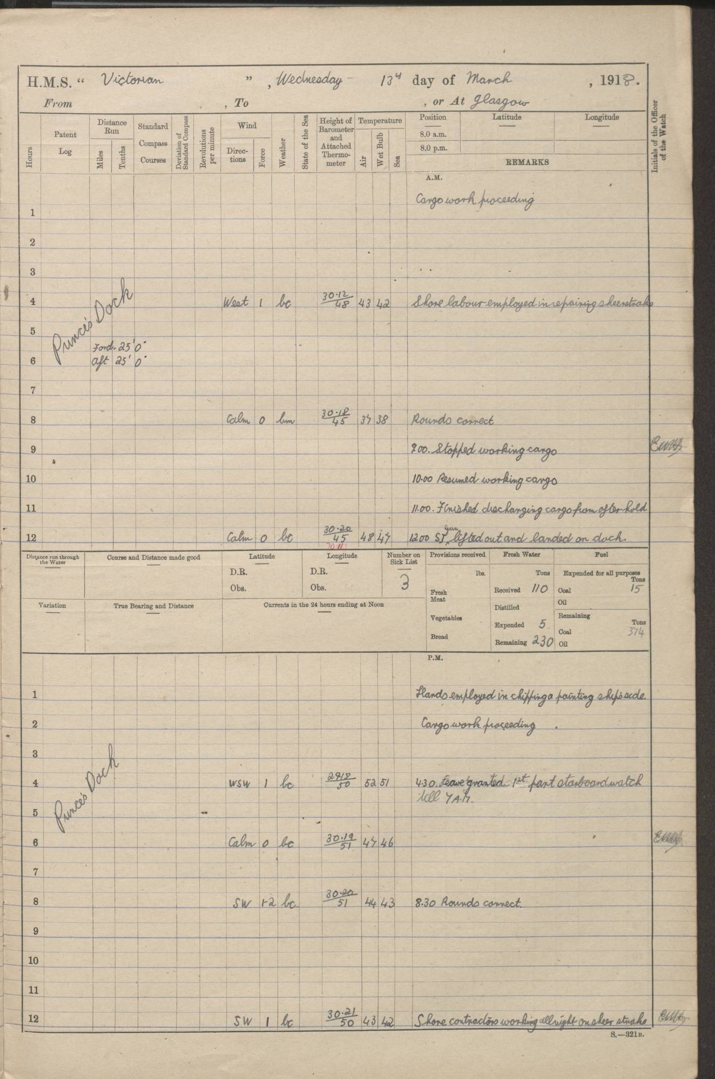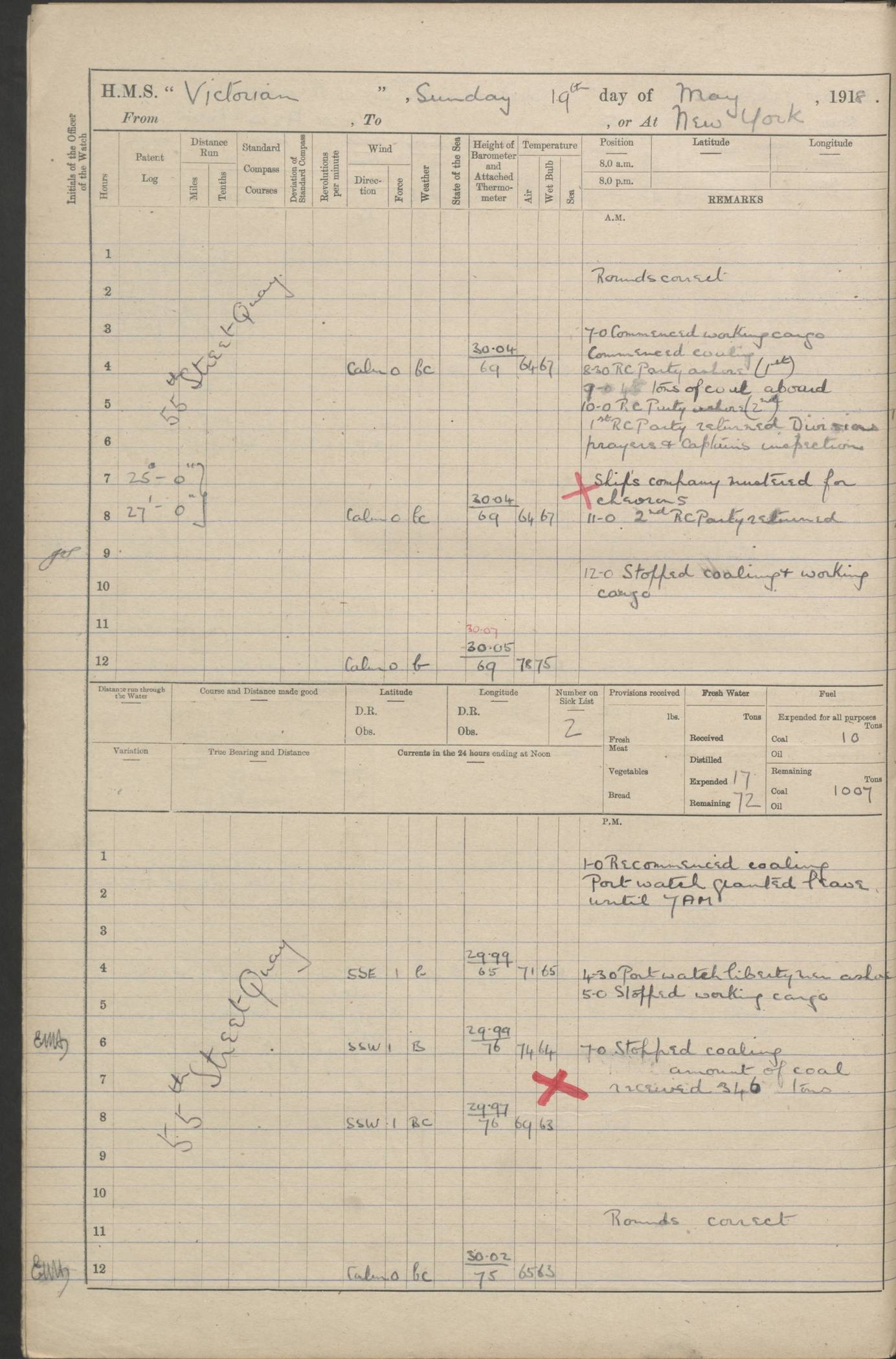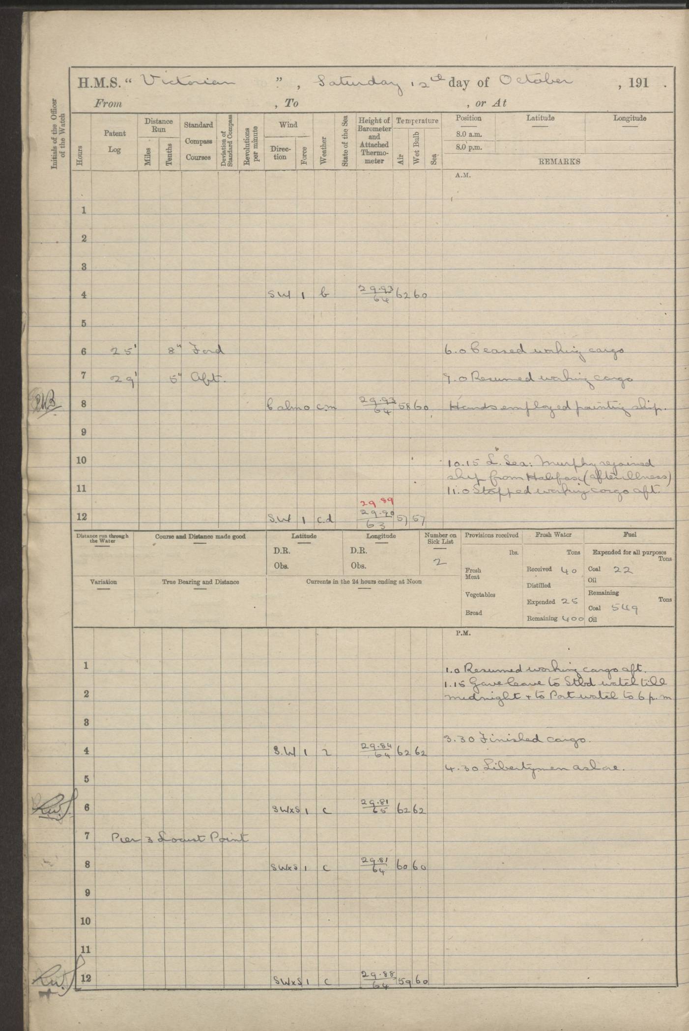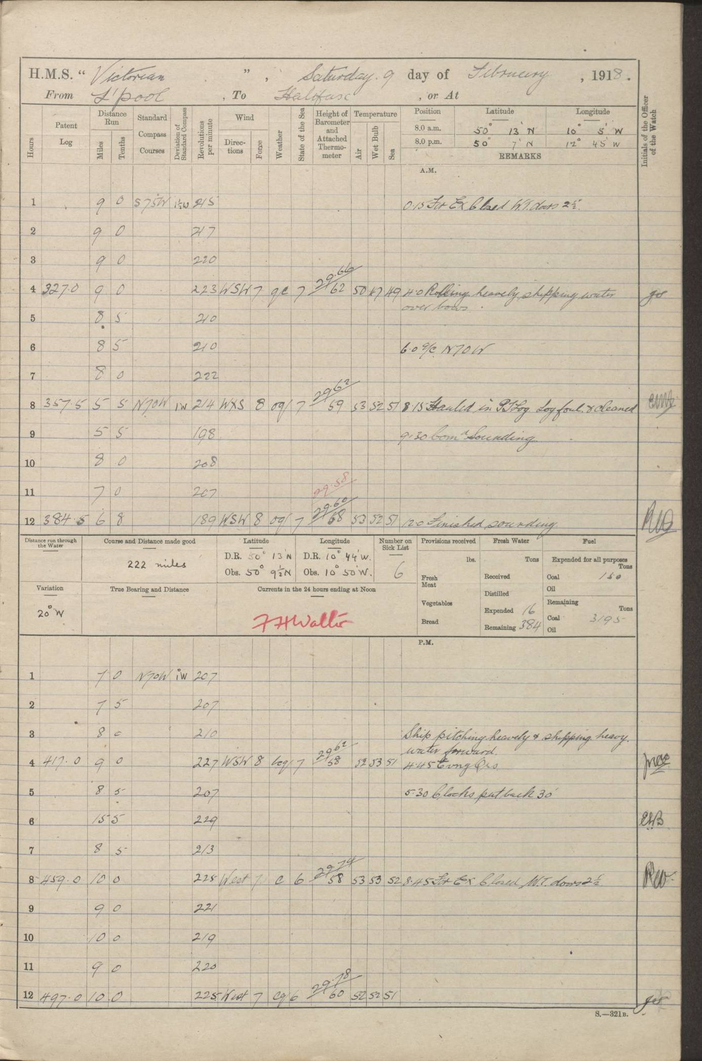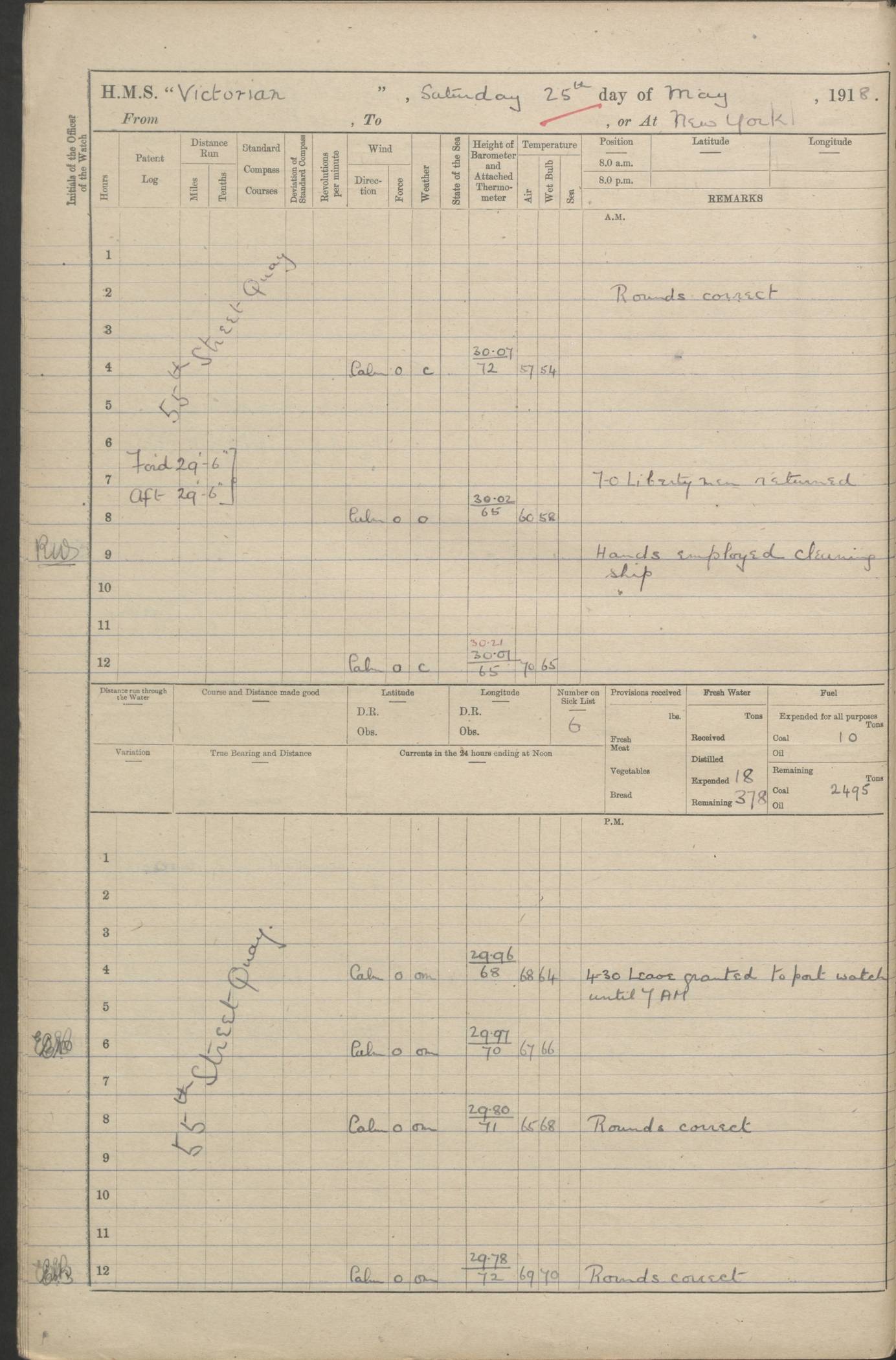 LOGS FOR JANUARY 1918 4caf8c4dcadfd341970358e2: (http://oldweather.s3.amazonaws.com/ADM 53-67407/ADM 53-67407-00001_0.jpg) [Left hand side of cover of Copy of Log for January 1918] 4caf8c4dcadfd341970358e3: (http://oldweather.s3.amazonaws.com/ADM 53-67407/ADM 53-67407-00001_1.jpg) [Right hand side of cover, signed by Navigating Officer, as before] 4caf8c4dcadfd341970358e4: (http://oldweather.s3.amazonaws.com/ADM 53-67407/ADM 53-67407-00002_0.jpg) [Blank page] 4caf8c4dcadfd341970358e5: (http://oldweather.s3.amazonaws.com/ADM 53-67407/ADM 53-67407-00002_1.jpg) [Page not filled in] 4caf8c4dcadfd341970358e6: (http://oldweather.s3.amazonaws.com/ADM 53-67407/ADM 53-67407-00003_0.jpg) [Details of Barometer and Thermometers, as previous month (though no numbers for Thermometers for Air Temperature)] 4caf8c4dcadfd341970358e7: (http://oldweather.s3.amazonaws.com/ADM 53-67407/ADM 53-67407-00003_1.jpg) 1 January 1918 From Liverpool to Halifax Lat 48.23, Long -45.67 [Position: 335 miles E of Newfoundland] 4.00am and 8.0am: In Station with convoy. am Drills: Tested Depth Charges. Class of boys Seamanship and ammunition. Sightsetters sight setting. Ordinary Seamen Seamanship. Royal Marines Signals. Deflection Teacher. Guns Crew of Morning watch to Loader. Noon: Altered course S77W, Log 87. In station with Convoy. pm: PM Drills. Guns Crews of Forenoon watch to Loader. Ship Company .22 Rim firing. 4.00pm: In station with Convoy. Evening Quarters. 4.12pm: Hauled in Log, foul and cleared. 5.00pm: Clocks put back 25 minutes. 6.00pm and Midnight: In station with Convoy. [Course and Distance made good: S54W, 335 miles] [Wind mostly southerly force 5 to 6 until 8pm, with rough sea for part of pm] 4caf8c4dcadfd341970358e8: (http://oldweather.s3.amazonaws.com/ADM 53-67407/ADM 53-67407-00004_0.jpg) 2 January 1918 From Liverpool to Halifax Lat 45.20, Long -51.15 [Position: 135 miles SE of Newfoundland] am: AM Drill. Tested Depth Charges. Hands Physical drill. Class Ordinary Seaman Gunners III 6 inch QF gun drill. Ordinary Seamen training Class ammunition. Class of Boys Torpedo Instructions. Gun layers and Trainers and Sight Setters Deflection Teacher. Guns crews of Morning watch to 6 inch Loader. 8.00am: In station with Convoy, altered course N65W, Log 36. Noon: Altered course N64W. SS METAGAMA proceeded to St John’s New Brunswick pm Drills: Junior Officers sightsetting. Guns Crews of Fornoon [Forenoon] watch 6 inch Loader. Foretopmen .22 Rim firing. 5.30pm: Clocks put back 30 minutes. [Distance made good: 299 miles] [Distance: to Halifax outer buoy = 521 miles] 4caf8c4dcadfd341970358e9: (http://oldweather.s3.amazonaws.com/ADM 53-67407/ADM 53-67407-00004_1.jpg) 3 January 1918 From Liverpool to Halifax Lat 44.83, Long -58.17 [Position 140 miles E of Nova Scotia] 8.30am: Commenced Sounding. [Course and Distance made good: S86W, 299 miles] [True Bearing and Distance: to Halifax outer buoy = S83.5W, 223 miles] 4caf8c4dcadfd341970358ea: (http://oldweather.s3.amazonaws.com/ADM 53-67407/ADM 53-67407-00005_0.jpg) 4 January 1918 From Liverpool to Halifax [and at Halifax NS] Lat 44.66, Long -63.58 [estimated] [Position: No 2 Pier, Halifax, Nova Scotia] 4.00am: Commenced Sounding. Increased to half Speed. 6.20am: Whistle buoy bearing N20W, altered course N22W, Log 85.5. 6.30am: Buoy abeam. 7.15am: Stopped and hauled in Log 96.5. 7.35am: Chebucto Light N49W. Proceeded North. 7.47am: Chebucto Light abeam. Dead Slow. 7.50am: Course and Speed as Requisite. 8.50am: First gate. 9.00am: Second gate. 9.10am: Pilot on board. Proceeded alongside No 2 Pier. Tugs Canso, Gladiator and Weatherspoon [probably WM Weatherspoon] assisting. 9.30am: Entered dock. 9.40am: Made fast. 10.00am: HE [His Excellency] Sir WE Davidson left ship. Cargo party Stevedores on board. [Wharf No 2] pm Drills: Chief Gunner parties sponging and cleaning out all guns. Remainder of hands employed cleaning holds for Cargo. 5.00pm: Liberty men ashore. [Distance made good: 240 miles] [Noon Position] [Halifax No 2 Wharf] [Fuel Remaining: Coal 1262 tons] [Rain for most of day, noon temperature 37F] [Note: Tug “Canso” (listed here as 126803) was built and registered in Yarmouth, Nova Scotia, in 1910 and owned by The Minister of Public Works for the Dominion of Canada, Ottawa. Tug “WM Weatherspoon” (listed here as 94697) was built in Digby, Nova Scotia, in 1890, registered in Sydney, Nova Scotia, in 1908 and owned by Hugh McDonald, Sydney.] 4caf8c4dcadfd341970358eb: (http://oldweather.s3.amazonaws.com/ADM 53-67407/ADM 53-67407-00005_1.jpg) 5 January 1918 At Halifax Lat 44.66, Long -63.58 [Position: No 2 Pier, Halifax, Nova Scotia] [Wharf No 2 Halifax] am Drills: Chief gunners parties examining exposed ammunition. Cleaning guns and Shells. am: Commenced loading Steel bars No 2 and No 4 Hatch. Hands employed taking stores on board and Saturday Routine. Party of Men ashore at dockyard for stores. 1.15pm: Liberty men ashore. 2.15pm: Resumed working Cargo No 4. 3.45pm and 4.45pm: Liberty men ashore. 4caf8c4dcadfd341970358ec: (http://oldweather.s3.amazonaws.com/ADM 53-67407/ADM 53-67407-00006_0.jpg) 6 January 1918 At Halifax Lat 44.66, Long -63.58 [Position: No 2 Pier, Halifax, Nova Scotia] [No 2 Pier] 8.00am: Rounds Correct. USS “SOUTH DAKOTA” entered harbour. 9.00am: Officer of guard left ship in cutter. 9.45am: Officer of guard returned. 10.00am: RC party ashore. Divisions and Captain’s Inspections and Divine Service. 11.00am: RC party returned. 2.00pm: Signal Rating discharged to the NIOBE. 4.30pm: Liberty men ashore. 10.00pm: Liberty men returned. [Note: USS “South Dakota” (Armored Cruiser No 9, later ACR-9) was built in California and launched in 1904; she was in commission from 1907 and in 1920 was reclassified as CA-9 and renamed “Huron”; she was sold for scrap in 1930; she was towed to Powell River, British Colombia, in 1931 and used as a breakwater (more details here).] 4caf8c4dcadfd341970358ed: (http://oldweather.s3.amazonaws.com/ADM 53-67407/
