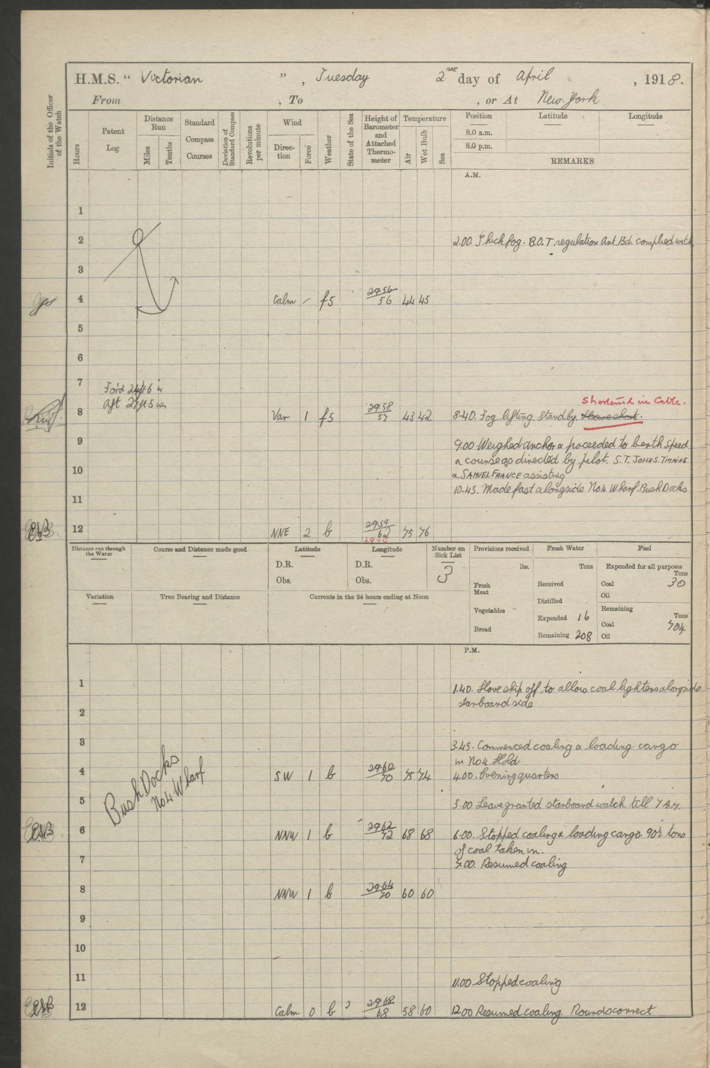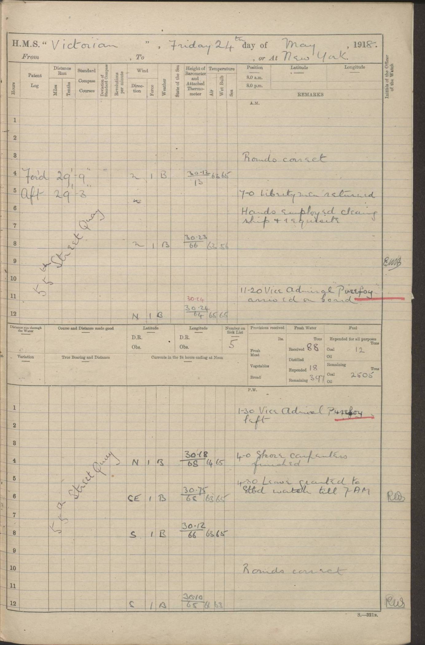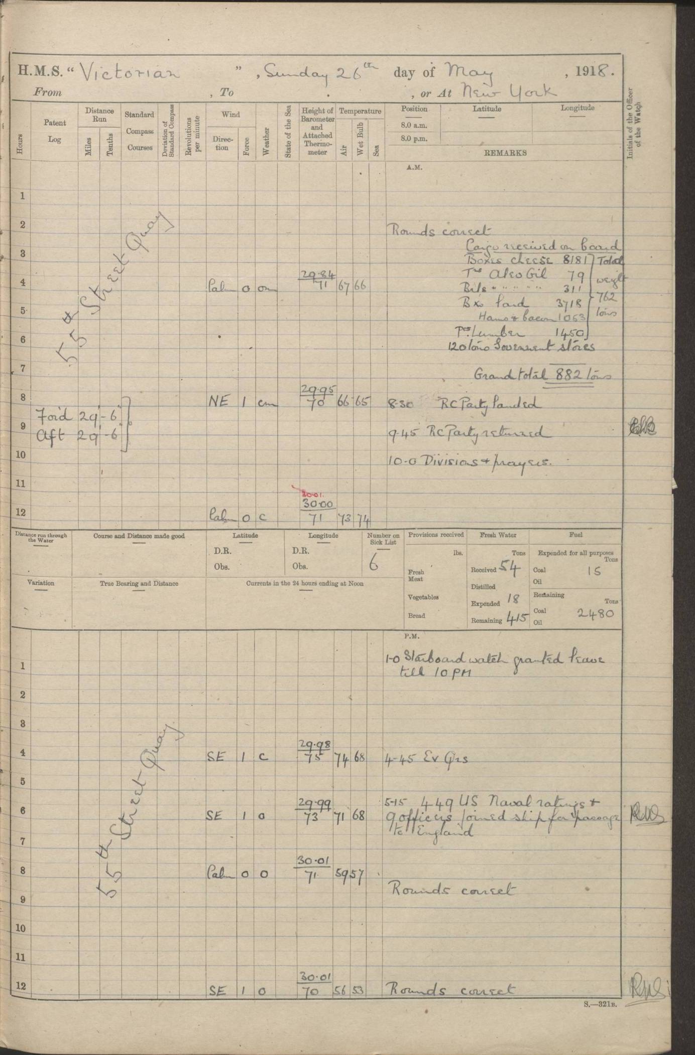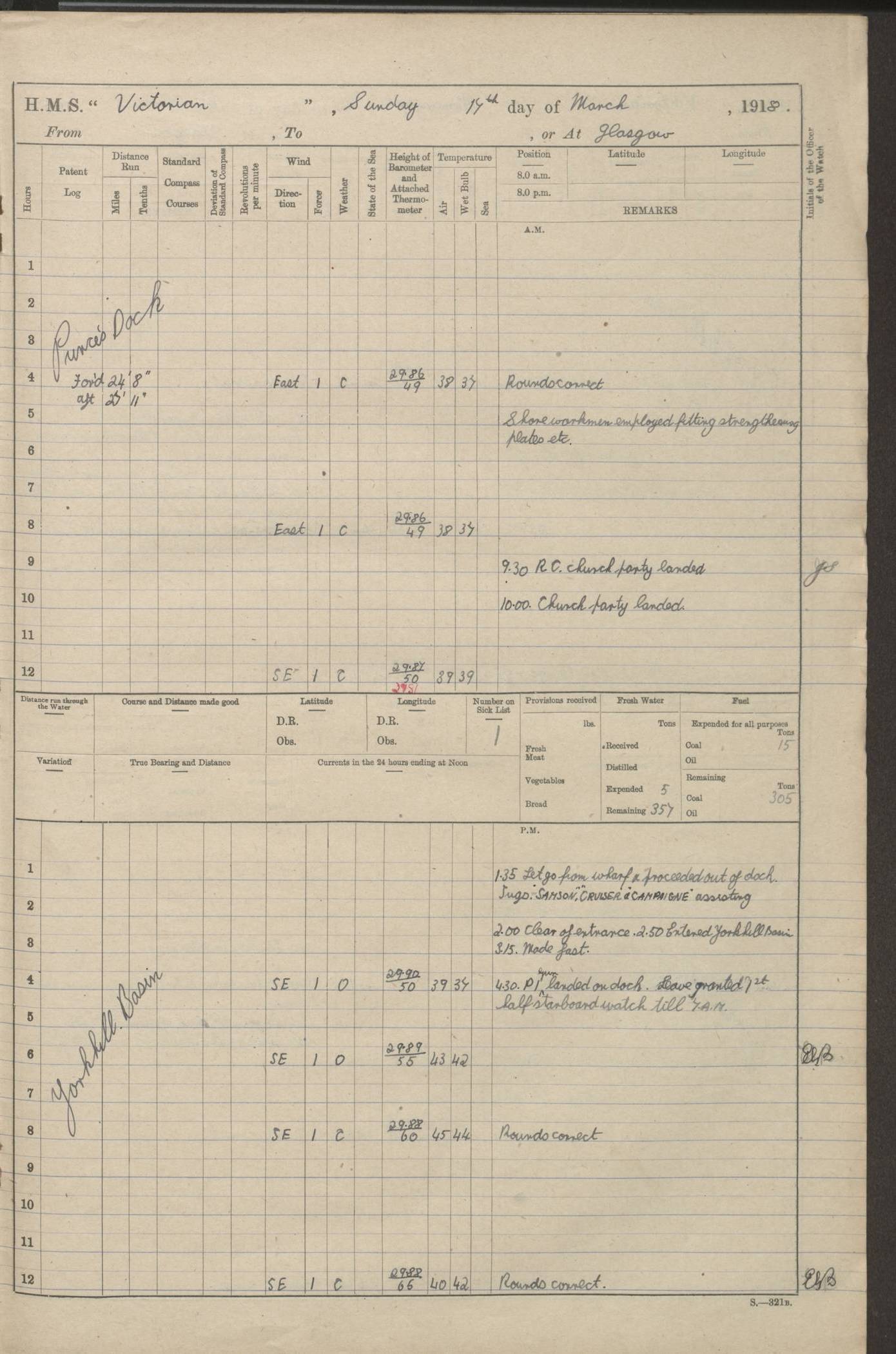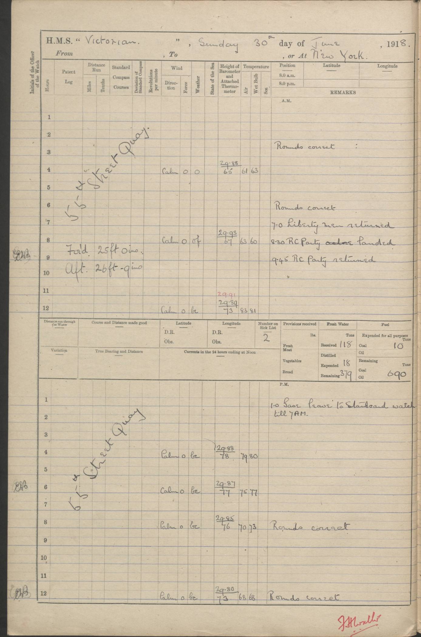 LOGS FOR JANUARY 1918 4caf8c4dcadfd341970358e2: (http://oldweather.s3.amazonaws.com/ADM 53-67407/ADM 53-67407-00001_0.jpg) [Left hand side of cover of Copy of Log for January 1918] 4caf8c4dcadfd341970358e3: (http://oldweather.s3.amazonaws.com/ADM 53-67407/ADM 53-67407-00001_1.jpg) [Right hand side of cover, signed by Navigating Officer, as before] 4caf8c4dcadfd341970358e4: (http://oldweather.s3.amazonaws.com/ADM 53-67407/ADM 53-67407-00002_0.jpg) [Blank page] 4caf8c4dcadfd341970358e5: (http://oldweather.s3.amazonaws.com/ADM 53-67407/ADM 53-67407-00002_1.jpg) [Page not filled in] 4caf8c4dcadfd341970358e6: (http://oldweather.s3.amazonaws.com/ADM 53-67407/ADM 53-67407-00003_0.jpg) [Details of Barometer and Thermometers, as previous month (though no numbers for Thermometers for Air Temperature)] 4caf8c4dcadfd341970358e7: (http://oldweather.s3.amazonaws.com/ADM 53-67407/ADM 53-67407-00003_1.jpg) 1 January 1918 From Liverpool to Halifax Lat 48.23, Long -45.67 [Position: 335 miles E of Newfoundland] 4.00am and 8.0am: In Station with convoy. am Drills: Tested Depth Charges. Class of boys Seamanship and ammunition. Sightsetters sight setting. Ordinary Seamen Seamanship. Royal Marines Signals. Deflection Teacher. Guns Crew of Morning watch to Loader. Noon: Altered course S77W, Log 87. In station with Convoy. pm: PM Drills. Guns Crews of Forenoon watch to Loader. Ship Company .22 Rim firing. 4.00pm: In station with Convoy. Evening Quarters. 4.12pm: Hauled in Log, foul and cleared. 5.00pm: Clocks put back 25 minutes. 6.00pm and Midnight: In station with Convoy. [Course and Distance made good: S54W, 335 miles] [Wind mostly southerly force 5 to 6 until 8pm, with rough sea for part of pm] 4caf8c4dcadfd341970358e8: (http://oldweather.s3.amazonaws.com/ADM 53-67407/ADM 53-67407-00004_0.jpg) 2 January 1918 From Liverpool to Halifax Lat 45.20, Long -51.15 [Position: 135 miles SE of Newfoundland] am: AM Drill. Tested Depth Charges. Hands Physical drill. Class Ordinary Seaman Gunners III 6 inch QF gun drill. Ordinary Seamen training Class ammunition. Class of Boys Torpedo Instructions. Gun layers and Trainers and Sight Setters Deflection Teacher. Guns crews of Morning watch to 6 inch Loader. 8.00am: In station with Convoy, altered course N65W, Log 36. Noon: Altered course N64W. SS METAGAMA proceeded to St John’s New Brunswick pm Drills: Junior Officers sightsetting. Guns Crews of Fornoon [Forenoon] watch 6 inch Loader. Foretopmen .22 Rim firing. 5.30pm: Clocks put back 30 minutes. [Distance made good: 299 miles] [Distance: to Halifax outer buoy = 521 miles] 4caf8c4dcadfd341970358e9: (http://oldweather.s3.amazonaws.com/ADM 53-67407/ADM 53-67407-00004_1.jpg) 3 January 1918 From Liverpool to Halifax Lat 44.83, Long -58.17 [Position 140 miles E of Nova Scotia] 8.30am: Commenced Sounding. [Course and Distance made good: S86W, 299 miles] [True Bearing and Distance: to Halifax outer buoy = S83.5W, 223 miles] 4caf8c4dcadfd341970358ea: (http://oldweather.s3.amazonaws.com/ADM 53-67407/ADM 53-67407-00005_0.jpg) 4 January 1918 From Liverpool to Halifax [and at Halifax NS] Lat 44.66, Long -63.58 [estimated] [Position: No 2 Pier, Halifax, Nova Scotia] 4.00am: Commenced Sounding. Increased to half Speed. 6.20am: Whistle buoy bearing N20W, altered course N22W, Log 85.5. 6.30am: Buoy abeam. 7.15am: Stopped and hauled in Log 96.5. 7.35am: Chebucto Light N49W. Proceeded North. 7.47am: Chebucto Light abeam. Dead Slow. 7.50am: Course and Speed as Requisite. 8.50am: First gate. 9.00am: Second gate. 9.10am: Pilot on board. Proceeded alongside No 2 Pier. Tugs Canso, Gladiator and Weatherspoon [probably WM Weatherspoon] assisting. 9.30am: Entered dock. 9.40am: Made fast. 10.00am: HE [His Excellency] Sir WE Davidson left ship. Cargo party Stevedores on board. [Wharf No 2] pm Drills: Chief Gunner parties sponging and cleaning out all guns. Remainder of hands employed cleaning holds for Cargo. 5.00pm: Liberty men ashore. [Distance made good: 240 miles] [Noon Position] [Halifax No 2 Wharf] [Fuel Remaining: Coal 1262 tons] [Rain for most of day, noon temperature 37F] [Note: Tug “Canso” (listed here as 126803) was built and registered in Yarmouth, Nova Scotia, in 1910 and owned by The Minister of Public Works for the Dominion of Canada, Ottawa. Tug “WM Weatherspoon” (listed here as 94697) was built in Digby, Nova Scotia, in 1890, registered in Sydney, Nova Scotia, in 1908 and owned by Hugh McDonald, Sydney.] 4caf8c4dcadfd341970358eb: (http://oldweather.s3.amazonaws.com/ADM 53-67407/ADM 53-67407-00005_1.jpg) 5 January 1918 At Halifax Lat 44.66, Long -63.58 [Position: No 2 Pier, Halifax, Nova Scotia] [Wharf No 2 Halifax] am Drills: Chief gunners parties examining exposed ammunition. Cleaning guns and Shells. am: Commenced loading Steel bars No 2 and No 4 Hatch. Hands employed taking stores on board and Saturday Routine. Party of Men ashore at dockyard for stores. 1.15pm: Liberty men ashore. 2.15pm: Resumed working Cargo No 4. 3.45pm and 4.45pm: Liberty men ashore. 4caf8c4dcadfd341970358ec: (http://oldweather.s3.amazonaws.com/ADM 53-67407/ADM 53-67407-00006_0.jpg) 6 January 1918 At Halifax Lat 44.66, Long -63.58 [Position: No 2 Pier, Halifax, Nova Scotia] [No 2 Pier] 8.00am: Rounds Correct. USS “SOUTH DAKOTA” entered harbour. 9.00am: Officer of guard left ship in cutter. 9.45am: Officer of guard returned. 10.00am: RC party ashore. Divisions and Captain’s Inspections and Divine Service. 11.00am: RC party returned. 2.00pm: Signal Rating discharged to the NIOBE. 4.30pm: Liberty men ashore. 10.00pm: Liberty men returned. [Note: USS “South Dakota” (Armored Cruiser No 9, later ACR-9) was built in California and launched in 1904; she was in commission from 1907 and in 1920 was reclassified as CA-9 and renamed “Huron”; she was sold for scrap in 1930; she was towed to Powell River, British Colombia, in 1931 and used as a breakwater (more details here).] 4caf8c4dcadfd341970358ed: (http://oldweather.s3.amazonaws.com/ADM 53-67407/