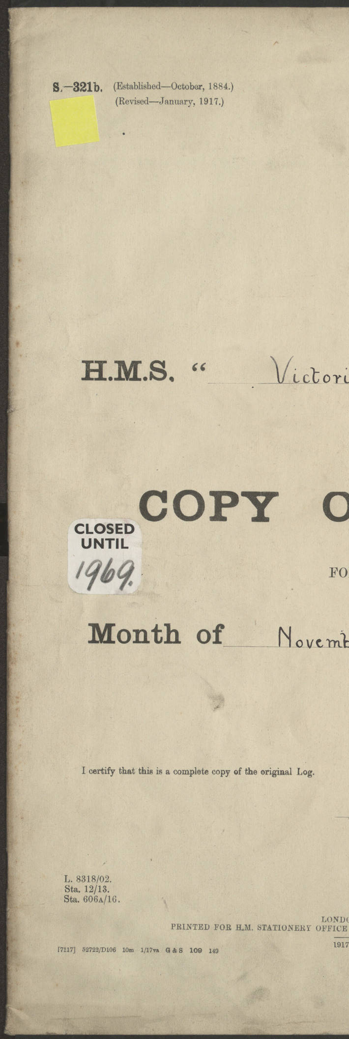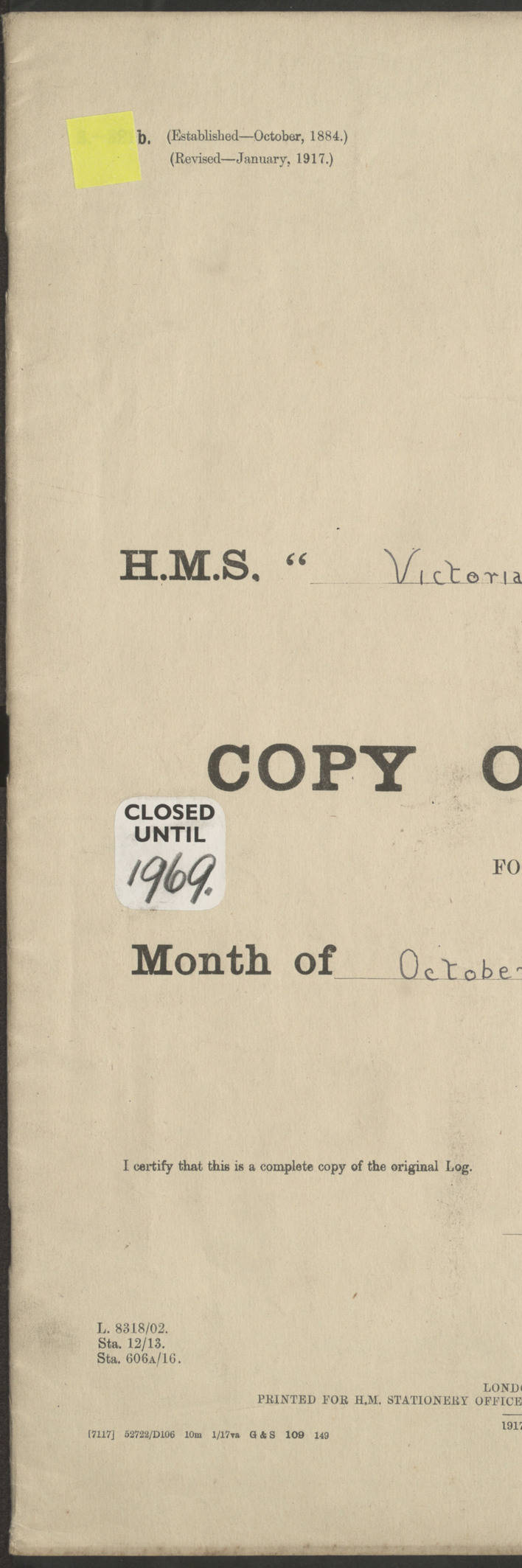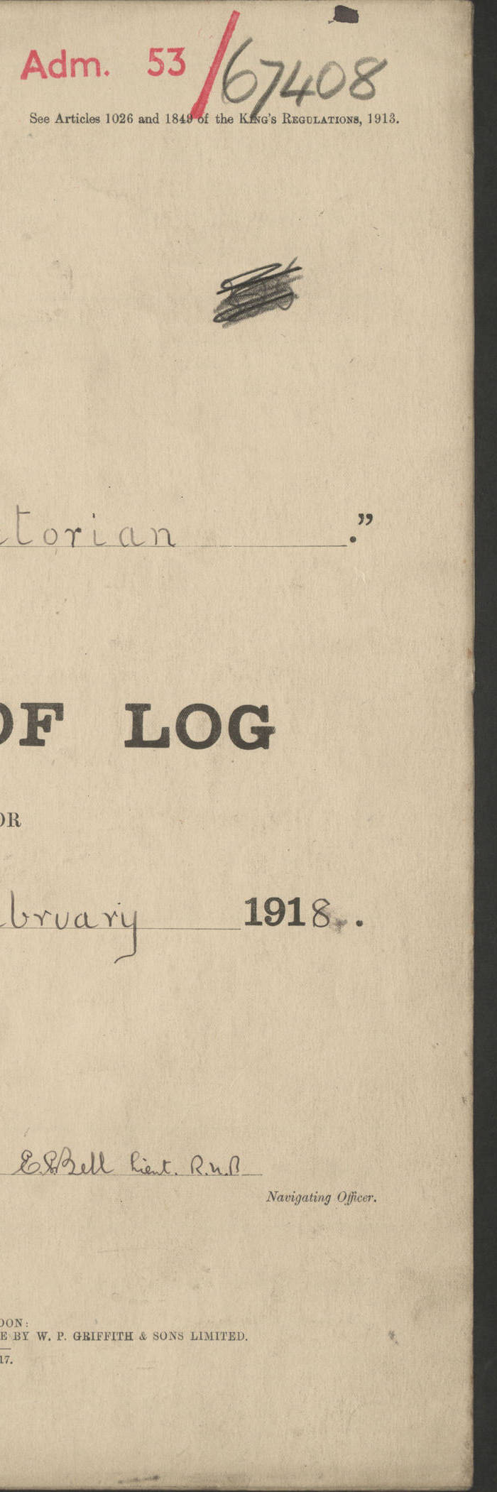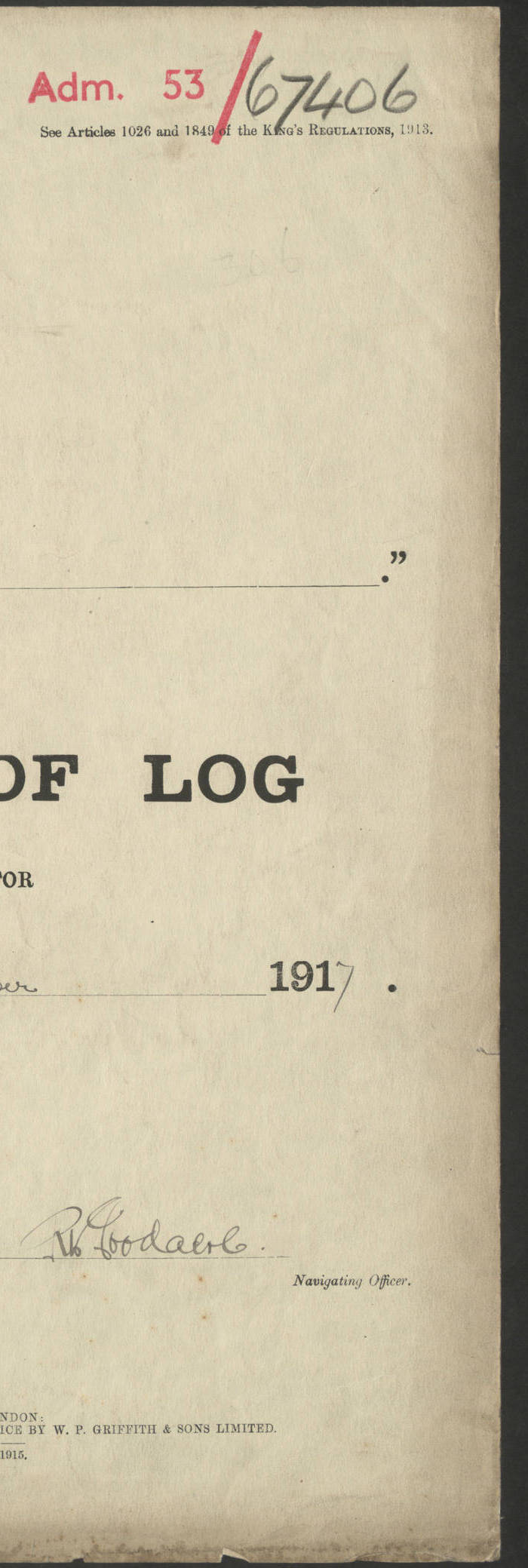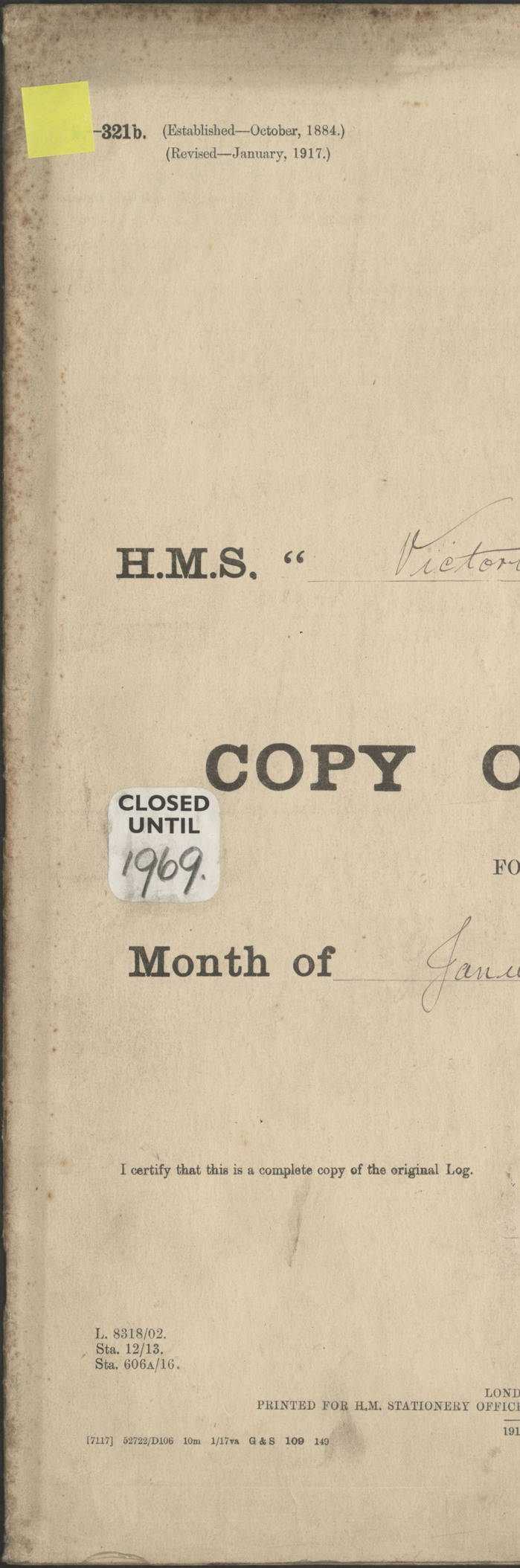 LOGS FOR JANUARY 1917 4caf8c46cadfd341970356ea: (http://oldweather.s3.amazonaws.com/ADM 53-67395/ADM 53-67395-001_0.jpg) [Left hand side of cover of Copy of Log for January 1917] 4caf8c46cadfd341970356eb: (http://oldweather.s3.amazonaws.com/ADM 53-67395/ADM 53-67395-001_1.jpg) [Right hand side of cover, signed by RW Goodacre, Navigating Officer] 4caf8c46cadfd341970356ec: (http://oldweather.s3.amazonaws.com/ADM 53-67395/ADM 53-67395-002_0.jpg) [Blank page] 4caf8c46cadfd341970356ed: (http://oldweather.s3.amazonaws.com/ADM 53-67395/ADM 53-67395-002_1.jpg) [Page not completed but signed FH Walter, Captain, dated 1.2.17] [Note: Captain Frederic Henry Walter RN (18 August 1872 to 29 July 1949) was Captain of HMS Victorian from 2 June 1915 to 27 August 1918.] 4caf8c46cadfd341970356ee: (http://oldweather.s3.amazonaws.com/ADM 53-67395/ADM 53-67395-003_0.jpg) [Details of Barometer and Thermometers as follows:]