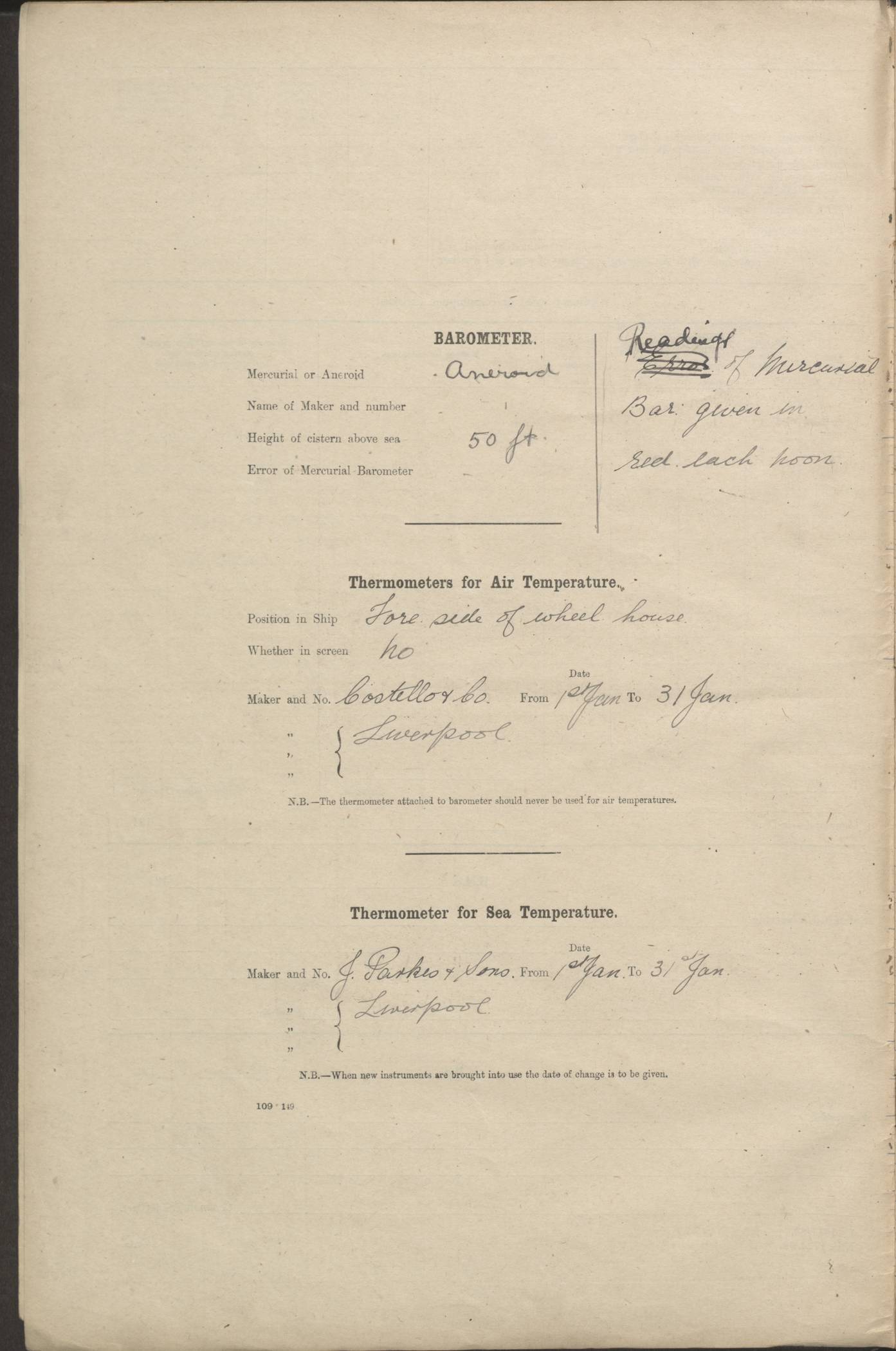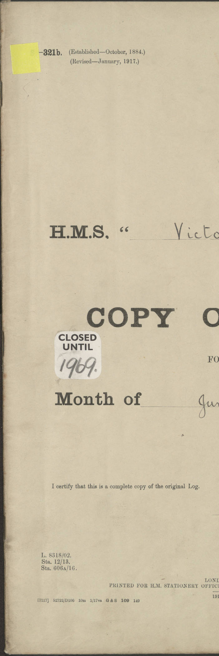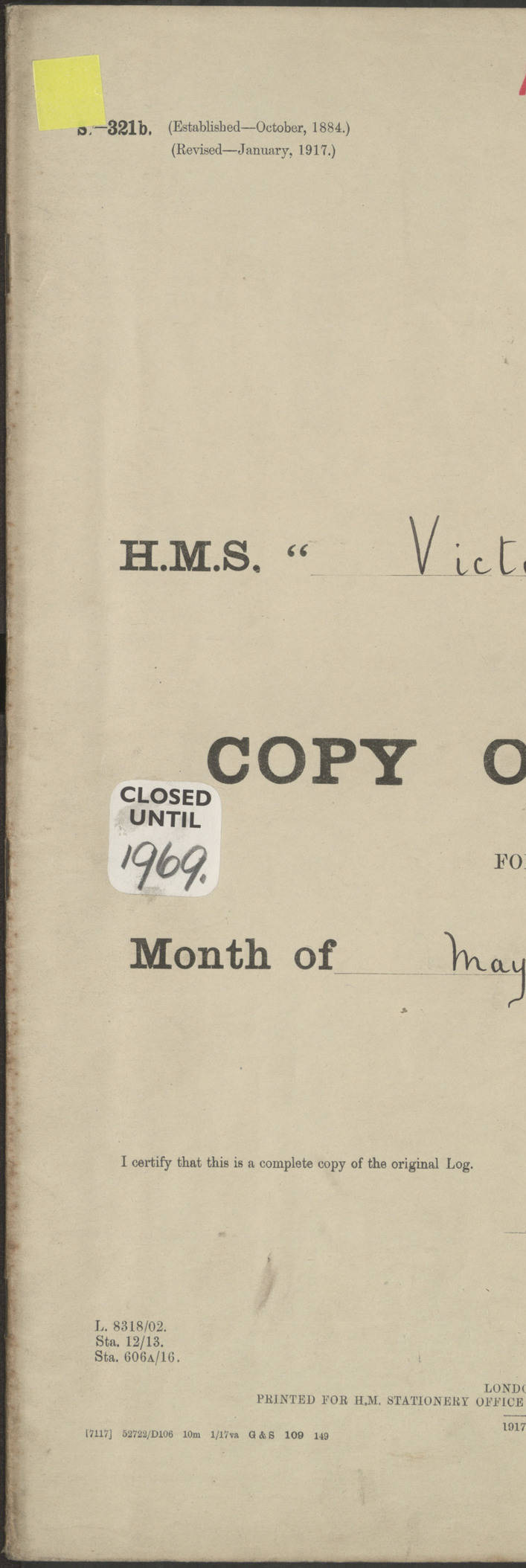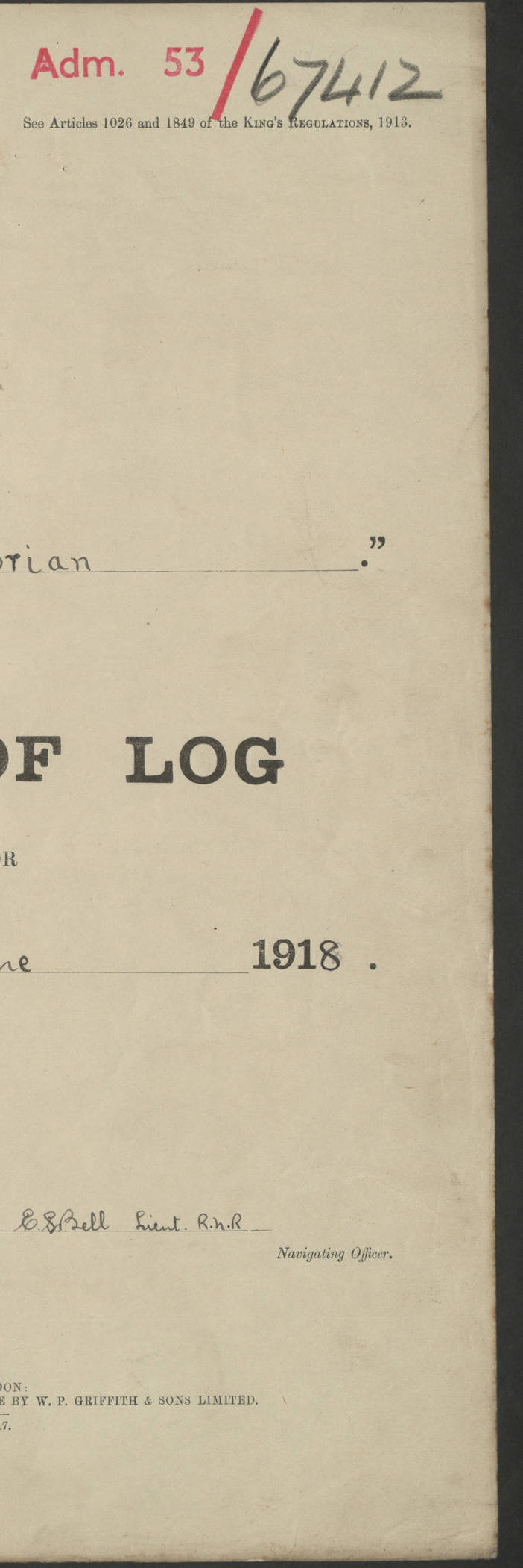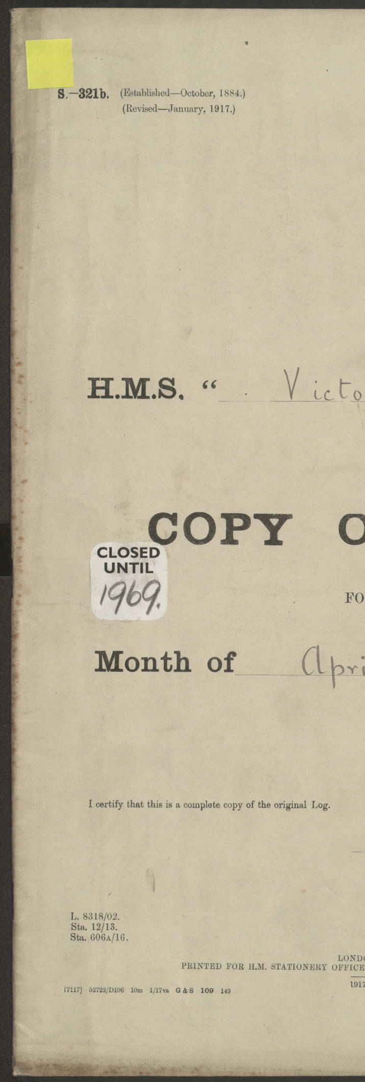 LOGS FOR JANUARY 1917 4caf8c46cadfd341970356ea: (http://oldweather.s3.amazonaws.com/ADM 53-67395/ADM 53-67395-001_0.jpg) [Left hand side of cover of Copy of Log for January 1917] 4caf8c46cadfd341970356eb: (http://oldweather.s3.amazonaws.com/ADM 53-67395/ADM 53-67395-001_1.jpg) [Right hand side of cover, signed by RW Goodacre, Navigating Officer] 4caf8c46cadfd341970356ec: (http://oldweather.s3.amazonaws.com/ADM 53-67395/ADM 53-67395-002_0.jpg) [Blank page] 4caf8c46cadfd341970356ed: (http://oldweather.s3.amazonaws.com/ADM 53-67395/ADM 53-67395-002_1.jpg) [Page not completed but signed FH Walter, Captain, dated 1.2.17] [Note: Captain Frederic Henry Walter RN (18 August 1872 to 29 July 1949) was Captain of HMS Victorian from 2 June 1915 to 27 August 1918.] 4caf8c46cadfd341970356ee: (http://oldweather.s3.amazonaws.com/ADM 53-67395/ADM 53-67395-003_0.jpg) [Details of Barometer and Thermometers as follows:]