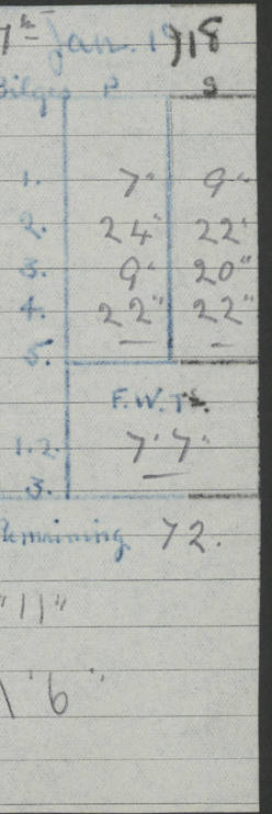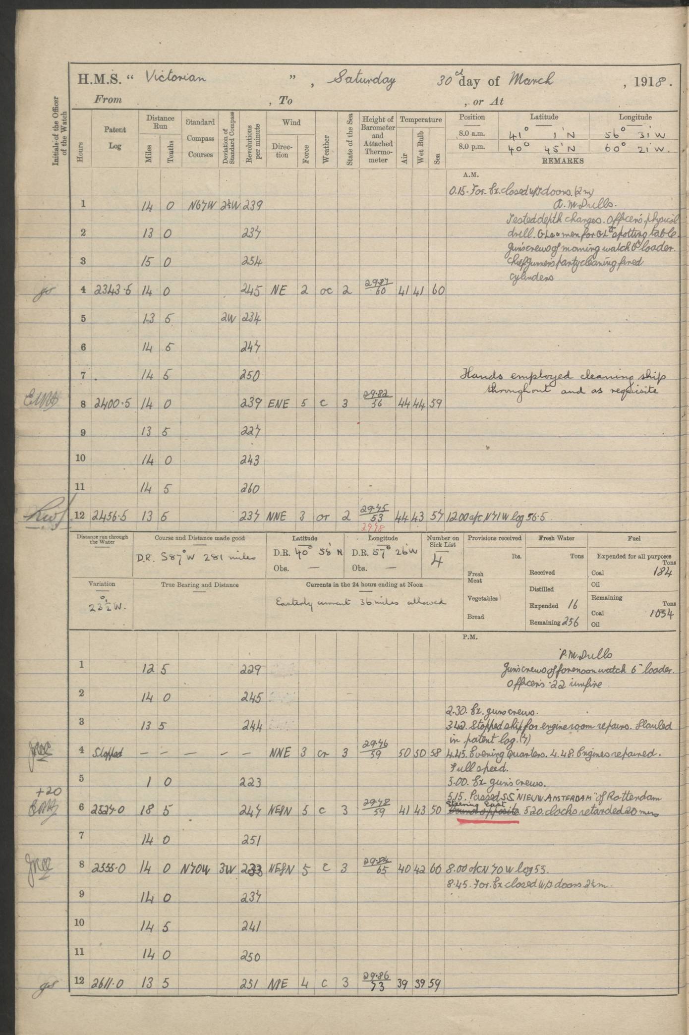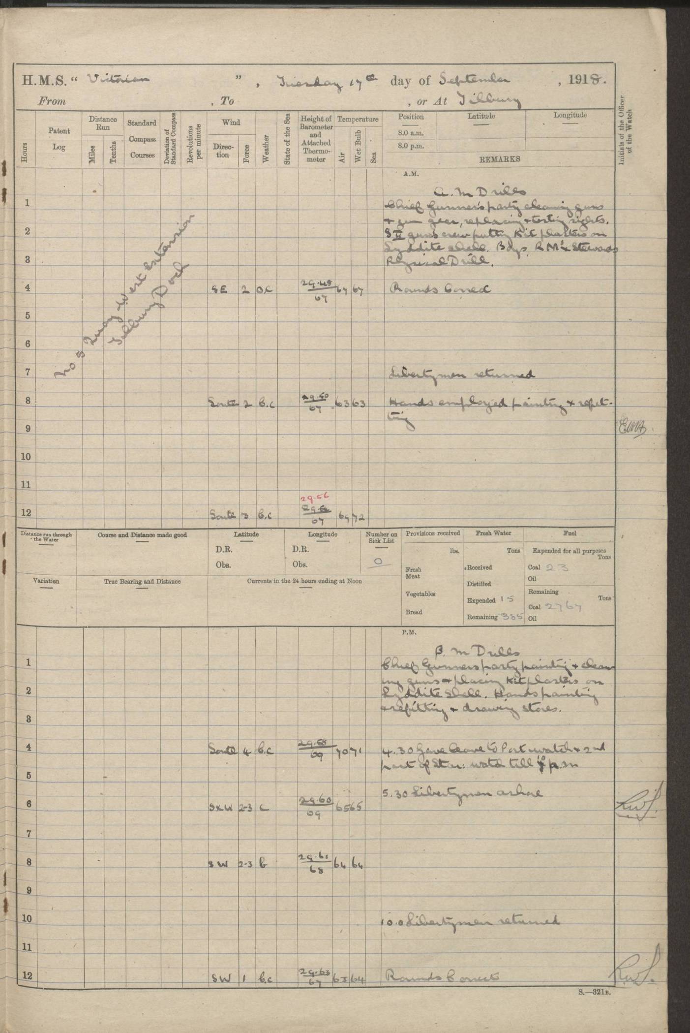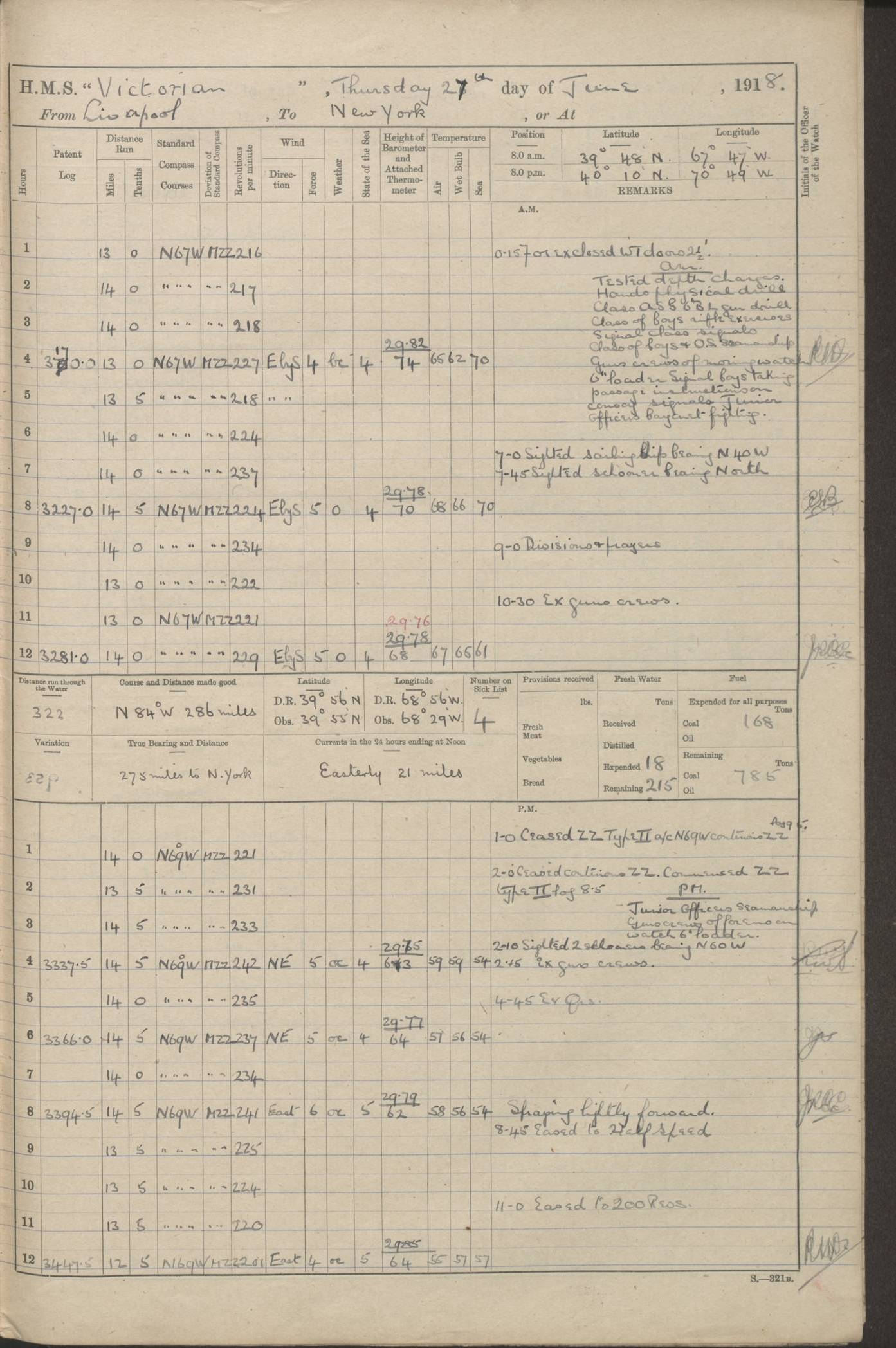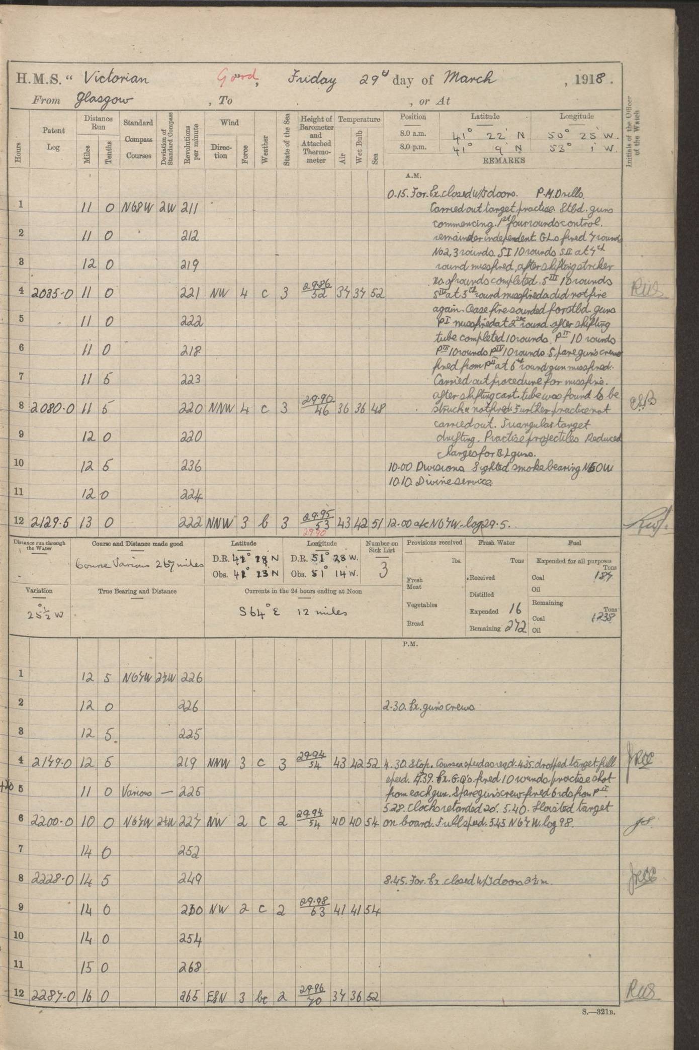 4caf8c46cadfd341970356ef: (http://oldweather.s3.amazonaws.com/ADM 53-67395/ADM 53-67395-003_1.jpg) 1 January 1917 On Patrol Lat 64.50, Long -10.17 [Position: 110 miles E of Iceland] 0.15am: Closed WTD [Watertight Doors] for exercise 2 minutes. 3.00am: Exercised guns crews. 5.00am: Altered course S25W. 9.00am: Divisions. Hands physical drill. Boys 6 inch QF [Quick Firing] gun drill. Training class 6 inch BL [Breech Loading] gun drill. Guns crews morning watch loader. GLs [Gunlayers], SSs [Sightsetters] and Trs [Trainers] deflection teacher. 6.00pm: Altered course N45E. 8.45pm: Closed WTD for exercise 2.25 minutes. 11.00pm: Exercised guns crews. Midnight: Altered course N25E. [Distance made good: 239 miles] [Number on sick list: 7] [Wind mostly westerly, force 5 or 6 from 8am to 8pm, sea rough from noon to 8pm; weather mostly cloudy, noon temperature 41F, sea temperature 38F] 4caf8c46cadfd341970356f0: (http://oldweather.s3.amazonaws.com/ADM 53-67395/ADM 53-67395-004_0.jpg) 2 January 1917 On Patrol Lat 64.27, Long -9.03 [Position: 160 miles E of Iceland] 8.15am: Tested depth charges. 9.00am: Divisions and Prayers. Hands physical drill. Training class ammunition. Boys ammunition. 10.00am: Increased to Full Speed. Royal Marines deflection teacher. 10.25am: Eased to slow. GLs, SSs and Trs deflection teacher. Guns crews forenoon watch loader. [Distance made good: 240 miles] [Number on sick list: 8] 4caf8c46cadfd341970356f1: (http://oldweather.s3.amazonaws.com/ADM 53-67395/ADM 53-67395-004_1.jpg) 3 January 1917 On Patrol Lat 66.13, Long -10.03 [Position: 130 miles E of Iceland] 9.30am: Exercised collision stations. [Distance made good: 253 miles] [Number on sick list: 9] 4caf8c46cadfd341970356f2: (http://oldweather.s3.amazonaws.com/ADM 53-67395/ADM 53-67395-005_0.jpg) 4 January 1917 On Patrol Lat 65.43, Long -8.07 [Position: 160 miles E of Iceland] 8.15am: Tested depth charge. 2.07pm: Altered course S81W. Exchanged pendants with HMS PATUCA. 2.15pm: Exercised general Quarters. 2.43pm: Steam Cutter left ship for HMS PATUCA for confidential mail. 3.15pm: Proceeded N17E. Slow. [Distance made good: 243 miles] [Number on sick list: 10] 4caf8c46cadfd341970356f3: (http://oldweather.s3.amazonaws.com/ADM 53-67395/ADM 53-67395-005_1.jpg) 5 January 1917 On patrol Lat 65.28, Long -9.17 [Position: 130 miles E of Iceland] 9.20am: Dropped target and circled round Full Speed. Carried out 1 inch aiming from 6 inch guns and .45 aiming from 6 pounders. 10.20am: Exchanged pennants with HMS Andes. 10.30am: Target inboard. Engines and Courses as requisite. 11.05am: Boat left for HMS ANDES for confidential mail. 11.35am: Boat returned. Proceeded N83W. [Distance run through the Water: 232 miles] [Number on sick list: 12] [Noon air and sea temperature 33F, rain and snow in evening] 4caf8c46cadfd341970356f4: (http://oldweather.s3.amazonaws.com/ADM 53-67395/ADM 53-67395-006_0.jpg) 6 January 1917 On Patrol Lat 65.78, Long -12.37 [Position: 40 miles E of Iceland] 10.00pm: Commenced ZZ [Zig Zag] (Type III). [Distance made good: 264 miles] [Number on sick list: 13] 4caf8c46cadfd341970356f5: (http://oldweather.s3.amazonaws.com/ADM 53-67395/ADM 53-67395-006_1.jpg) 7 January 1917 From Patrol to Busta Voe Lat 62.65, Long -5.27 [Position: 40 miles NE of Faroe Islands] 1.30am: All clocks advanced 1 hour. 7.00am: Stopped ZZ. Hands employed preparing ship for coaling. 10.55am: Sighted Faroes S53W. Noon: Altered course S21E. MZZ [Mean Zig Zag]. 4.45pm: Evening Quarters and Divine Service. 5.00pm: Commenced ZZ (Type III) 40 degrees. 6.00pm: Altered course S25E, MZZ (Type III) 40 degrees. 6.15pm: Altered course N20W, MZZ (Type III 40 degrees). [Course and Distance made good: S44.5E, 265 miles] [True Bearing and Distance: of Esha Ness S38.5E, 166 miles] [Number on sick list: 13] [Fuel Remaining: Coal 1646 tons] [Easterly or north easterly wind force 6 from 8am, sea rough or very rough; weather mostly cloudy, noon temperature 39F, sea temperature 43F] 4caf8c46cadfd341970356f6: (http://oldweather.s3.amazonaws.com/ADM 53-67395/ADM 53-67395-007_0.jpg) 8 January 1917 At Busta Voe Lat 60.38, Long -1.36 [estimated] [Position: Busta Voe, Shetland Islands] 4.15am: Eshaness Light Observed S30W. 5.35am: Observed Swarbacks Light S29E. 6.00am: Altered course S32E, MZZ. 6.10am: Hauled in Patent Log. Increased to Full Speed. 7.08am: Swarbacks Light abeam. 7.15am: Passed gate. Engines and Courses as requisite to anchorage. 7.50am: Anchored in 15 fathoms Starboard anchor and veered to 7.5 fathoms of cable. [Arrival Draught: Forward 22’ 6”, Aft 29’ 0”] [Anchor Bearings: Ship's head N45E, Kirk N66E, Busta Flagstaff N63W, Hevden Ness S16W] [All coaling gear on board and on both colliers examined and found correct [entry in red ink], [signed] WA Hawkes Lieutenant Commander] 8.40am: Colliers “QUEENSGARTH” alongside port and SIR ARTHUR alongside Starboard. 9.00am: Mails on board. 9.30am: Commenced coaling. [Coaling Time, Tons and Total shown for 9.30am, 10.0am, 11.0am] 11.00am: Fleet surgeon from [HMS] “Gibraltar” visited ship. 11.15am: “Flying Breeze” alongside. Noon: Ceased coaling for dinner. 1.00pm: Resumed coaling. [Coaling Time, Tons, Total shown for times 1 - 2 to 5 - 6, last total 724 tons] 6.00pm: Ceased coaling for night. 7.25pm: “Flying Breeze” alongside. 8.00pm: “Flying Breeze” left. [Distance run through the Water: 234 miles] [Course and Distance made good: 212 miles] [Number on sick list: 13] [Fuel Remaining: Coal 1552 tons] [Note: SS “Queensgarth” was a British cargo collier built in Middlesbrough in 1908 and owned by Rea Shipping Company, Liverpool; she was sold to Cory Colliers, London in 1920 and was renamed “Corfell”; in 1933 she was sold to a Greek company and became “Ais Giorgis”; she was broken up in 1953. SS “Sir Arthur” was a British cargo ship built in Sunderland in 1911 for Cory Colliers, London; she was renamed “Corglen” in 1920; in 1927 she was sold to H Harrison (Shipping) and was rena