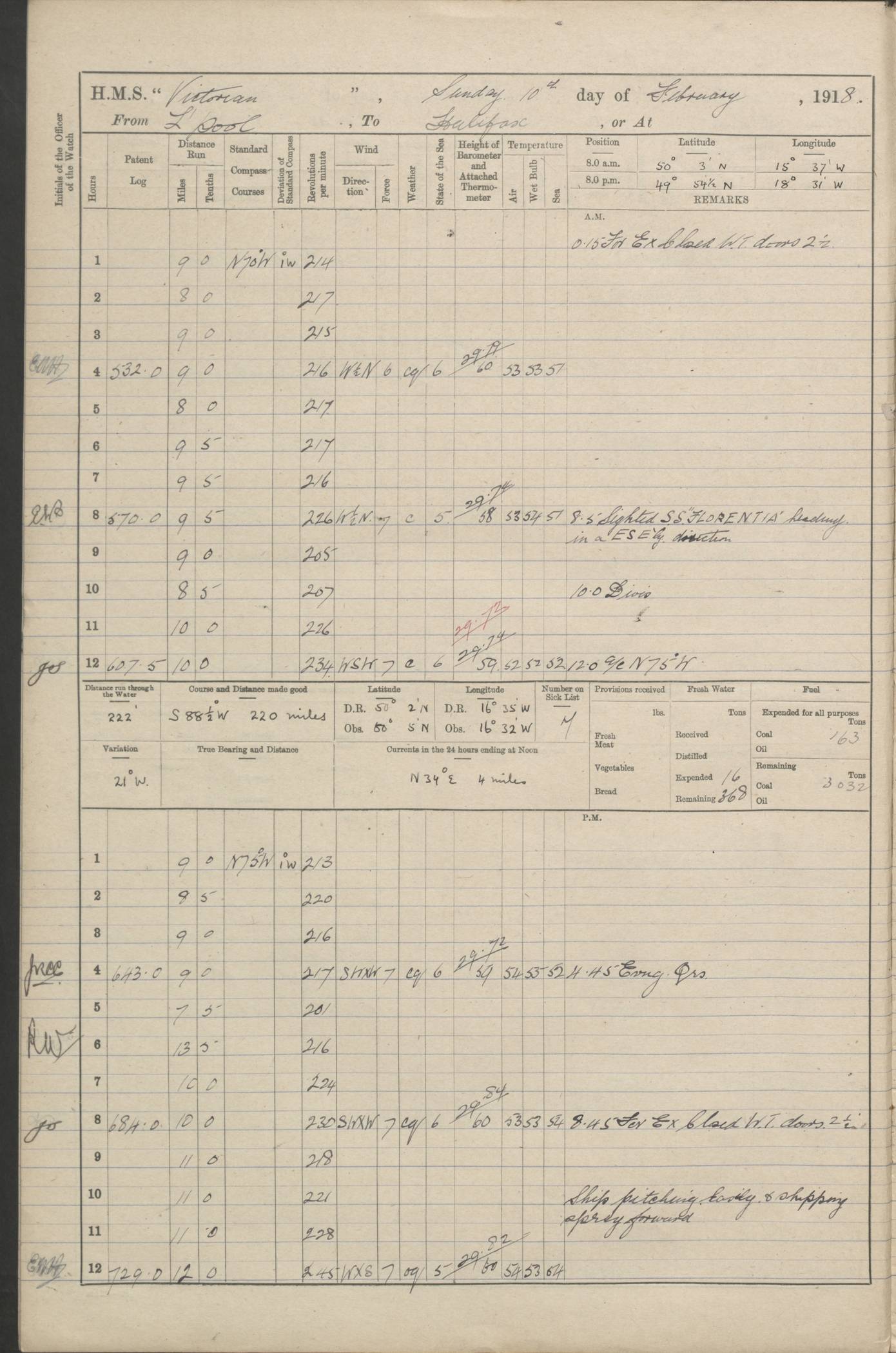 LOGS FOR JANUARY 1916 4caf8c3fcadfd341970354ec: (http://oldweather.s3.amazonaws.com/ADM 53-67383/ADM 53-67383-001_0.jpg) 4caf8c3fcadfd341970354ed: (http://oldweather.s3.amazonaws.com/ADM 53-67383/ADM 53-67383-001_1.jpg) 4caf8c3fcadfd341970354ee: (http://oldweather.s3.amazonaws.com/ADM 53-67383/ADM 53-67383-002_0.jpg) 4caf8c3fcadfd341970354ef: (http://oldweather.s3.amazonaws.com/ADM 53-67383/ADM 53-67383-002_1.jpg) 4caf8c3fcadfd341970354f0: (http://oldweather.s3.amazonaws.com/ADM 53-67383/ADM 53-67383-003_0.jpg) 4caf8c3fcadfd341970354f1: (http://oldweather.s3.amazonaws.com/ADM 53-67383/ADM 53-67383-003_1.jpg) 1 January 1916 Busto Voe Lat 60.4, Long -1.4 [Position: Busta Voe Shetland Islands] 7.20am: Chaplain of HMS "Gibraltar" on board 8.00am: Holy communion administered 8.15am: HMS "Duke of Cornwall" left anchorage 8.15am: Commenced coaling 9.20am: Collier SS "Cairnnevis" left ship's side 10.10am: Collier SS "Burnhope" came alongside 11.15am: HMS "Gibraltar" chaplain left ship 2.10pm: Cutter from shore with confidential mails 2.45pm: Dinghy's crew employed taking in stores 4.25pm: Water boat alongside 5.30pm: Finished coaling. Total tons on board 1500 9.15pm: Water boat left 4caf8c3fcadfd341970354f2: (http://oldweather.s3.amazonaws.com/ADM 53-67383/ADM 53-67383-004_0.jpg) 2 January 1916 Busto Voe Lat 60.4, Long -1.4 [Position: Busta Voe Shetland Islands] 8.37am: Collier SS "Burnhope" left ships side 9.50am: Collier SS "Barmoor" left ships side 10.40am: Weighed port anchor 0.35pm: Captain of HMS "Ebro" on board 2.00pm: Tug "Flying Breeze" alongside 2.00pm: Captain of HMS "Ebro" left ship 2.25pm: Cutter left for shore with mails 3.38pm: Stopped let go starboard anchor and sent dinghy ashore for letter 4.00pm: Weighed starboard anchor. Engines as requisite for passing down Voe 4.35pm: Swarbacks Light abeam 9.00pm: Intercepted Norge Steamer SS "Imo" with Armed Guard from HMS "Teutonic" in charge 4caf8c3fcadfd341970354f3: (http://oldweather.s3.amazonaws.com/ADM 53-67383/ADM 53-67383-004_1.jpg) 3 January 1916 On patrol Lat 61.0, Long -6.8 [Position: 70 miles S of Faroe Islands] 0.50am: Intercepted Danish SS "Shalholt" bound Leith 0.53am: "Shalholt" allowed to proceed: 0.00pm: Sighted: Faroe Isles 3.30pm: Intercepted Danish SS "Gullfoss" bound to Reykjavik. Allowed to proceed 3.45pm: Stopped and boarded Danish Barque "Viking" 4.40pm: "Viking" allowed to proceed 4caf8c3fcadfd341970354f4: (http://oldweather.s3.amazonaws.com/ADM 53-67383/ADM 53-67383-005_0.jpg) 4 January 1916 On patrol Lat 60.2, Long -10.6 [Position: 170 miles SW of Faroe Islands] [Full day's training] 4caf8c3fcadfd341970354f5: (http://oldweather.s3.amazonaws.com/ADM 53-67383/ADM 53-67383-005_1.jpg) 5 January 1916 On patrol Lat 59.9, Long -10.8 [Position: 200 miles SW of Faroe Islands] [Full day's training] 4caf8c3fcadfd341970354f6: (http://oldweather.s3.amazonaws.com/ADM 53-67383/ADM 53-67383-006_0.jpg) 6 January 1916 On patrol Lat 60.0, Long -10.5 [Position: 185 miles SW of Faroe Islands] [Full day's training] 4caf8c40cadfd341970354f7: (http://oldweather.s3.amazonaws.com/ADM 53-67383/ADM 53-67383-006_1.jpg) 7 January 1916 On patrol Lat 60.0, Long -10.8 [Position: 195 miles SW of Faroe Islands] [Full day's training] 4caf8c40cadfd341970354f8: (http://oldweather.s3.amazonaws.com/ADM 53-67383/ADM 53-67383-007_0.jpg) 8 January 1916 On patrol Lat 59.8, Long -9.5 [Position: 175 miles SW of Faroe Islands] 10.00am: Circling around for compass errors [Log shows table of deviations for range of Ship's Headings] 4caf8c40cadfd341970354f9: (http://oldweather.s3.amazonaws.com/ADM 53-67383/ADM 53-67383-007_1.jpg) 9 January 1916 On patrol Lat 60.1, Long -9.6 [Position: 160 miles SW of Faroe Islands] 10.30am: Divisions and Captain's inspection 4caf8c40cadfd341970354fc: (http://oldweather.s3.amazonaws.com/ADM 53-67383/ADM 53-67383-009_0.jpg) 10 January 1916 On patrol Lat 59.9, Long -8.6 [Position: 160 miles SSW of Faroe Islands] 3.00am: Ship rolling and pitching heavily during watch 2.00pm: Ship rolling heavily during watch 3.00pm: Heavy seas stove in boarding boat. Altered course N23W to secure same. 3.15pm: Boarding boat secured. Altered course N70W 4caf8c40cadfd341970354fd: (http://oldweather.s3.amazonaws.com/ADM 53-67383/ADM 53-67383-009_1.jpg) 11 January 1916 On patrol Lat 60.0, Long -8.2 [Position: 150 miles SSW of Faroe Islands] 4.45am: Intercepted Norge SS "Peter Hamre" 4.50am: Circled round steamer. Engines as requisite 5.05am: In company with SS "Peter Hamre" 10.30am: Stopped and boarded SS "Peter Hamre" 10.40am: SS "Peter Hamre" proceeded to Kirkwall under Armed Guard Sub Lieut Shearer in charge 4caf8c40cadfd341970354fe: (http://oldweather.s3.amazonaws.com/ADM 53-67383/ADM 53-67383-010_0.jpg) 12 January 1916 On patrol Lat 60.5, Long -9.4 [Position: 130 miles SW of Faroe Islands] [Full day's training] 4caf8c40cadfd341970354ff: (http://oldweather.s3.amazonaws.com/ADM 53-67383/ADM 53-67383-010_1.jpg) 13 January 1916 On patrol Lat 60.5, Long -9.2 [Position: 130 miles SW of Faroe Islands] 9.00am: Exchanged pendants with HMS "Patia" 4caf8c40cadfd34197035500: (http://oldweather.s3.amazonaws.com/ADM 53-67383/ADM 53-67383-011_0.jpg) 14 January 1916 On patrol Lat 60.5, Long -9.3 [Position: 135 miles SW of Faroe Islands] [Full day's training] 4caf8c40cadfd34197035501: (http://oldweather.s3.amazonaws.com/ADM 53-67383/ADM 53-67383-011_1.jpg) 15 January 1916 Bound for Liverpool Lat 56.2, Long -7.8 [Position: 57 miles E of Isle of Mull] 2.30pm: Sounding every half hour during watch 5.00pm: Sighted Rathlin Isle 5.19pm: Passing down Rathlin Sound 6.15pm: Sighted Maidens Light S12E 11.45pm: Sighted Chickens Light 0.5ml abeam 4caf8c40cadfd34197035502: (http://oldweather.s3.amazonaws.com/ADM 53-67383/ADM 53-67383-012_0.jpg) 16 January 1916 From Patrol to Liverpool Lat 53.5, Long -3.2 [Position: Liverpool] 2.35am: Sighted Gt Orme Head Light S18W 3.30am: Sighted Bar Light Ship S28E 5.05am: Pilot aboard. Formby Light abeam 6.30am: Turned ship assisted by Tug 