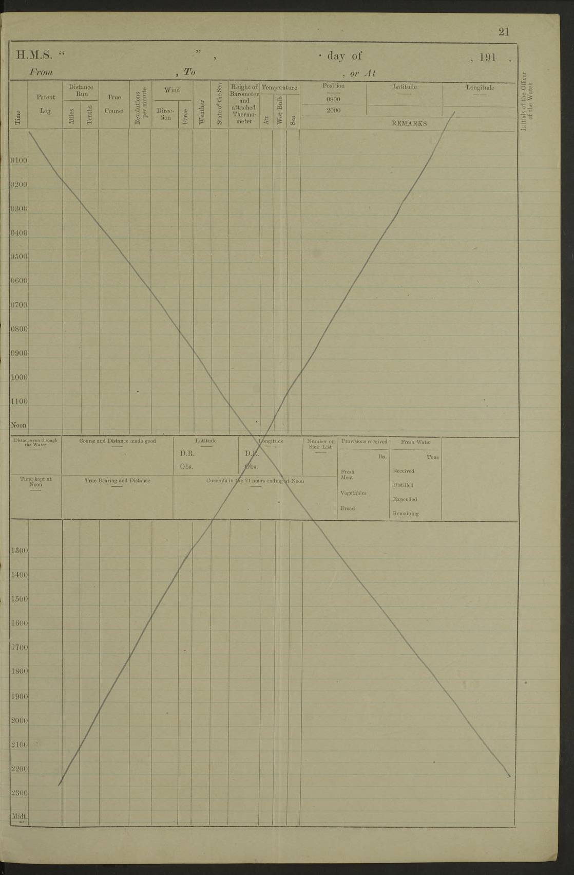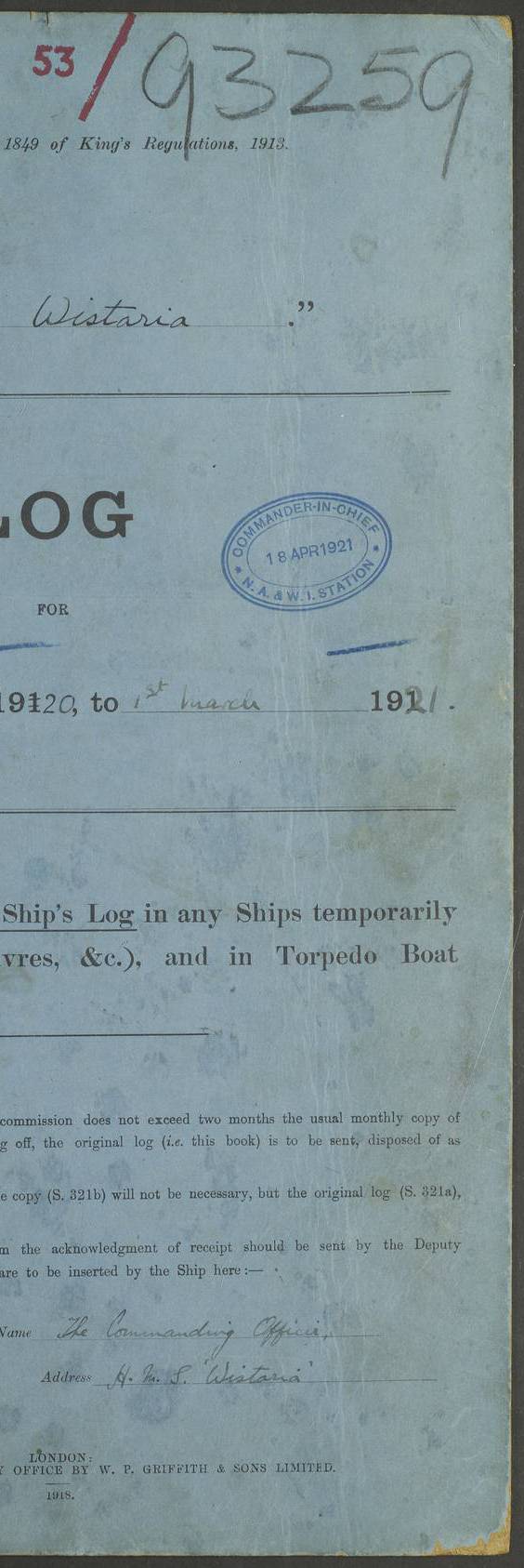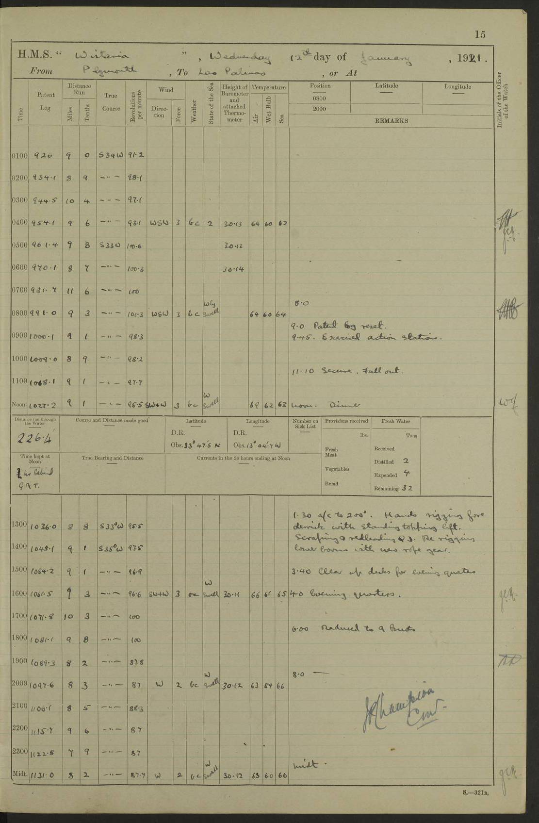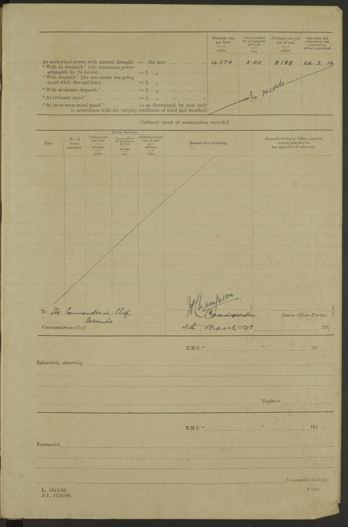 (Maps prepared using Journey Plotter, developed by Maikel. The Plots can only be approximate. They are made by joining-up positions on successive days, and sometimes positions are not given. There will therefore be occasions when the ship appears to have travelled overland) LOG BOOK – DECEMBER 29TH 1920 TO MARCH 1ST 1921 4f73c9e5a2fc8ea903000960: (https://s3.amazonaws.com:443/oldweather/ADM53-93259/0001_0.jpg) 4f73c9e5a2fc8ea903000961: (https://s3.amazonaws.com:443/oldweather/ADM53-93259/0001_1.jpg) 4f73c9e5a2fc8ea903000962: (https://s3.amazonaws.com:443/oldweather/ADM53-93259/0002_0.jpg) 4f73c9e6a2fc8ea903000963: (https://s3.amazonaws.com:443/oldweather/ADM53-93259/0002_1.jpg) At authorised power with natural draught: - Distance run per hour, miles: 16.376 - Coal expended for all purposes per hour, tons: 2.00 - Distance run per ton of coal, miles: 8.1888 - Date when this information was obtained by actual experiment: 24-3-16 To the Commander-in-Chief, Bermuda [Page signed JP Champion, Commander, 4th March 1921] 4f73c9e6a2fc8ea903000964: (https://s3.amazonaws.com:443/oldweather/ADM53-93259/0003_0.jpg)