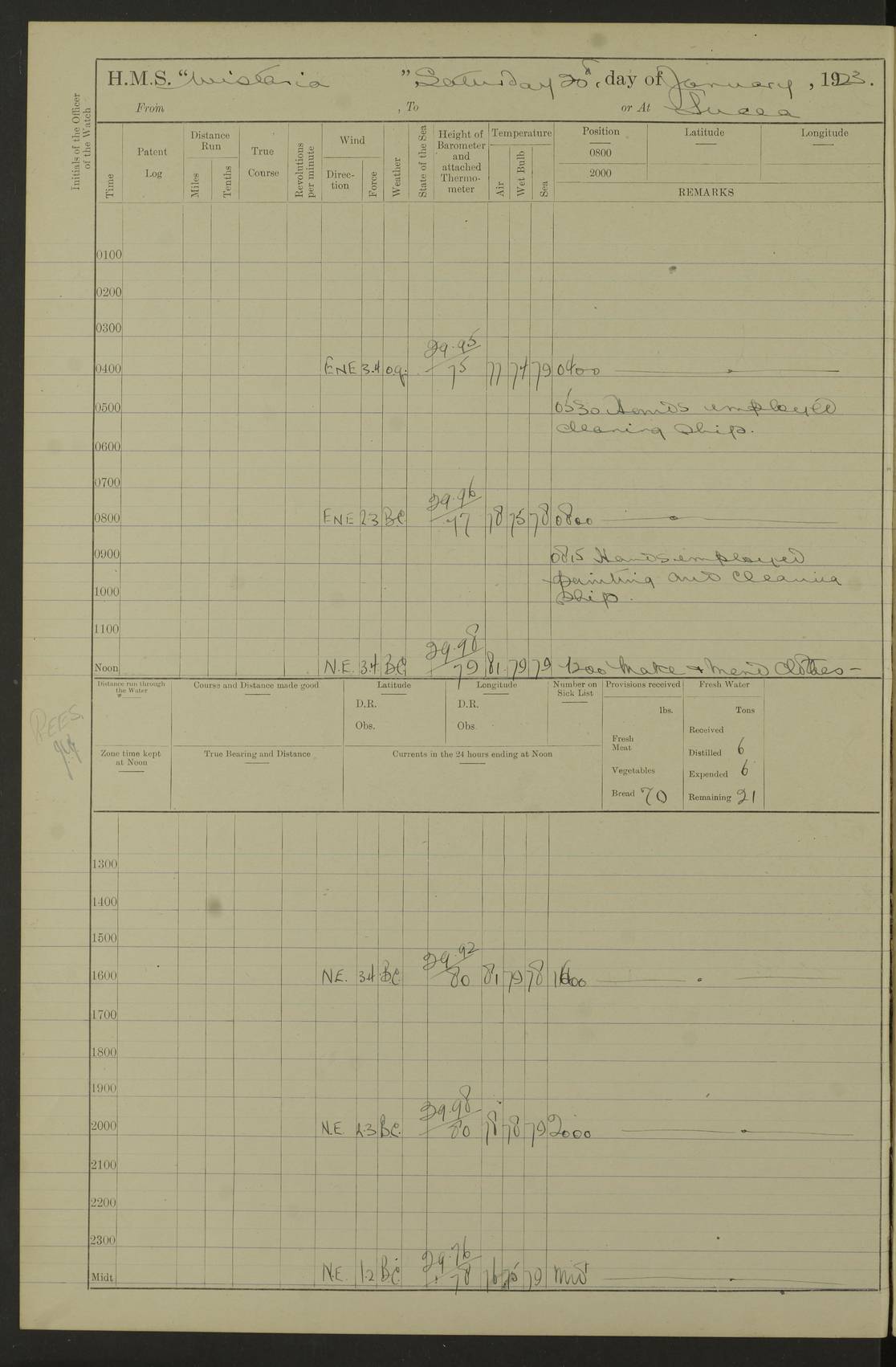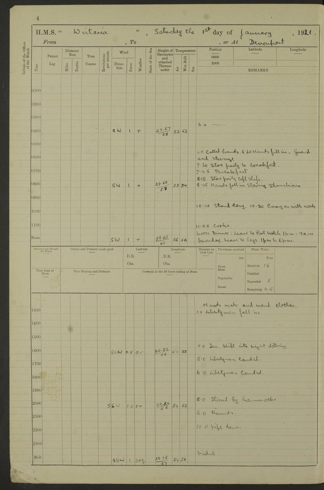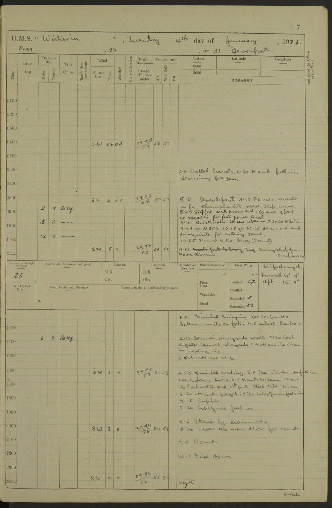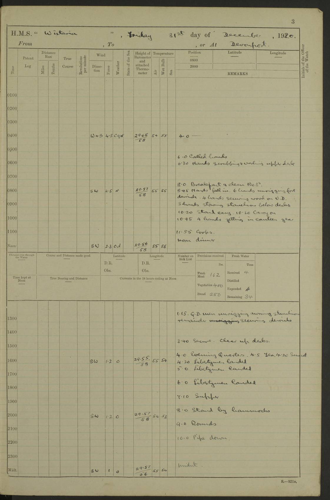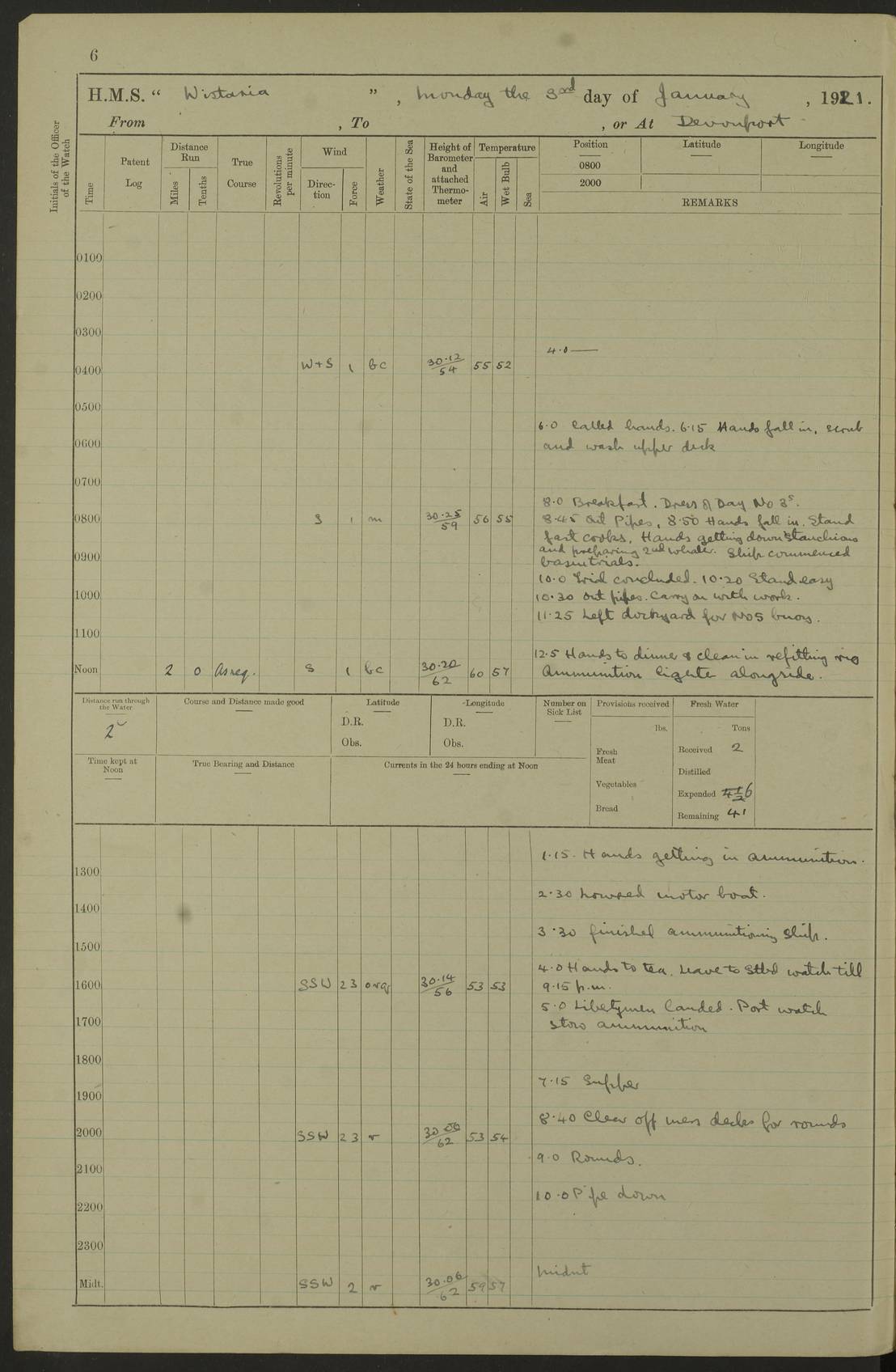 LOGS FOR DECEMBER 1920 4f73c9e6a2fc8ea903000965: (https://s3.amazonaws.com:443/oldweather/ADM53-93259/0003_1.jpg) 29 December 1920 At Devonport Lat 50.38, Long -4.19 9.0am: Commissioned with Chatham Crew 11.55am: Cooks to galley am: Sub Lt Jenks joined ship 1.10pm: Out pipes 1.15pm: Hands fall in. Employed in scrubbing and washing upper deck 3.30pm: Leave to 1st and 2nd watches 4 pm-7 am. Liberty men to clean 4.0pm: Liberty men fall in. Tea 4.15pm: Sunset 5.0pm: Liberty men fall in 6.0pm: Liberty men fall in 7.10pm: 1st Lieutenant returned from sick berth 7.15pm: Supper 8.0pm: Stand by hammocks 8.40pm: Clear off mess decks for rounds 9.0pm: Rounds 10.0pm: Pipe down 12.0pm: Rounds correct 4f73c9e7a2fc8ea903000966: (https://s3.amazonaws.com:443/oldweather/ADM53-93259/0004_0.jpg) 30 December 1920 At Devonport Lat 50.38, Long -4.19 6.0am: Called hands 6.30am: Hands fall in. Scrub & wash upper decks 7.20am: Quarters clean guns 7.50am: Secure 8.0am: Breakfast. Dress of day N°3 8.40am: Out pipes. Hands fall in am: Hands working main derrick. 4 hands & 1 Leading Seaman working with Chief Writer with stationery 10.20am: Stand easy 10.30am: Carry on with work 11.0am: Hands getting in provisions 11.30am: Afternoon watchmen to dinner noon: Dinner 1.15pm: Hands fall in. 1 Leading Seaman & hands with Chief Writer. 1 Leading Seaman & 2 AB Electr. Light. 3 AB with ship’s steward. 3 hands cleaning guns 3.40pm: Secure. Clear up decks 4.0pm: Evening Quarters. Sunset 4.24pm: Exercised collision stations 4.30pm: Secure. Tea. Leave to 2nd & 3rd watches 5 pm to 7 am 6.0pm: Liberty men fall in 7.15pm: Supper 8.0pm: Stand by hammocks 9.0pm: Rounds 10.0pm: Pipe down 4f73c9e7a2fc8ea903000967: (https://s3.amazonaws.com:443/oldweather/ADM53-93259/0004_1.jpg) 31 December 1920 At Devonport Lat 50.38, Long -4.19 6.30am: Hands scrubbing & washing upper decks 8.0am: Breakfast & clean Number 3 8.45am: Hands fall in. 6 hands unrigging fore derrick. 4 hands securing wood on upper deck. 3 hands stowing stanchions below decks 10.20am: Stand easy 10.30am: Carry on 10.45am: 4 hands getting in canteen gear 11.55am: Cooks noon: Dinner 1.15pm: Q.D. men unrigging awning stanchions, remainder securing derricks 3.40pm: Secure. Clear up decks 4.0pm: Evening Quarters 4.05pm: Tea 4.20pm: Sunset 7.10pm: Supper 8.0pm: Stand by hammocks LOGS FOR JANUARY 1921 4f73c9e7a2fc8ea903000968: (https://s3.amazonaws.com:443/oldweather/ADM53-93259/0005_0.jpg) 1 January 1921 At Devonport Lat 50.38, Long -4.19 6.0am: Called hands 6.30am: Hands fall in. Guard and steerage 7.30am: Store party to breakfast 7.45am: Breakfast 8.15am: Store party left ship 8.45am: Hands fall in. Stowing stanchions 10.20am: Stand easy 10.30am: Carry on with work noon: Dinner. Leave to Port watch 1 pm-7 am Monday. Leave to boys 1 pm to 6 pm pm: Hands make and mend clothes 4.0pm: Tea. Shift into night clothing 8.0pm: Stand by hammocks 4f73c9e8a2fc8ea903000969: (https://s3.amazonaws.com:443/oldweather/ADM53-93259/0005_1.jpg) 2 January 1921 At Devonport Lat 50.38, Long -4.19 7.0am: Hands fall in, scrub upper deck 8.0am: Breakfast and clean Number 2s 8.45am: Clear up decks for divisions 10.0am: Divisions 4.0pm: Tea. Shift into night clothing 8.0pm: Stand by hammocks 8.30pm: Clear up mess decks and flats for rounds 8.55pm: Clear off mess decks for rounds 9.0pm: Rounds 4f73c9e8a2fc8ea90300096a: (https://s3.amazonaws.com:443/oldweather/ADM53-93259/0006_0.jpg) 3 January 1921 At Devonport Lat 50.38, Long -4.19 6.15am: Hands fall in, scrub and wash upper deck 8.0am: Breakfast. Dress of day Number 3s 8.50am: Hands fall in. Stand fast cooks. Hands getting down stanchions and preparing 2nd whaler. Ship commenced basin trials 10.0am: Trial concluded 11.25am: Left dockyard for Number 5 buoy 12.05am: Hands to dinner & clean in refitting rig. Ammunition lighter alongside 1.15pm: Hands getting in ammunition 2.30pm: Lowered motor boat 3.30pm: Finished ammunitioning ship 5.0pm: Liberty men landed. Port watch store ammunition 8.40pm: Clear off mess deck for rounds 4f73c9e9a2fc8ea90300096b: (https://s3.amazonaws.com:443/oldweather/ADM53-93259/0006_1.jpg) 4 January 1921 At Devonport Lat 50.38, Long -4.19 6.30am: Hands fall in. Securing for sea 8.15am: Forecastle men muster on Forecastle, unshackle reeve ship wire 8.45am: Slipped and proceeded. Course and speed as required for full power trial 9.15am: Breakwater Lt Ho abeam 9.20am: Course S30E 10.30am: Altered course NE and as requisite for entering sound 10.55am: Secured to No 1 buoy (Sound) 11.30am: Made fast to buoy. Tug swung ship for compasses 1.0pm: Finished swinging for compasses. Forecastle men muster on forecastle 1.15pm: Entered harbour 2.15pm: Secured alongside wall 2.20pm: Coal lighter secured alongside 2.40pm: Hands to clear in coaling rig 3.0pm: Hands coal ship 4.55pm: Finished coaling 5.20pm: Hands fall in wash down decks 6.20pm: Hands paid 8.0pm: Stand by hammocks 8.20pm: Clear up mess decks for rounds 4f73c9e9a2fc8ea90300096c: (https://s3.amazonaws.com:443/oldweather/ADM53-93259/0007_0.jpg) 5 January 1921 At Devonport Lat 50.38, Long -4.19 6.30am: Hands fall in. Guard and steerage 8.0am: Carpenter & 4 hands employed in dockyard 8.10am: Ash lighter alongside 8.45am: Hands securing ship for sea 10.30am: Carry on. Hands to General Quarters 11.15am: Quarters clean guns 11.30am: Secure. Return rags 11.35am: Clear up decks noon: Store party returned. Hands to dinner 1.15pm: Hands fall in. 4 hands with carpenter, 2 with steward. Remainder securing ship for sea 4f73c9e9a2fc8ea90300096d: (https://s3.amazonaws.com:443/oldweather/ADM53-93259/0007_1.jpg) 6 January 1921 At Devonport Lat 50.38, Long -4.19 8.30am: Hands employed cleaning ship 10.50am: Chief of Staff inspected ship 11.33am: Chief of Staff left ship Ice sent. 12 cases received on board 1.15pm: Hands fall in. Getting in beef and replacing motor boats davit 2.0pm: 1 Leading Stoker discharged to hospital 4f73c9eaa2fc8ea90300096e: (https://s3.amazonaws.com:443/oldweather/ADM53-93259/00