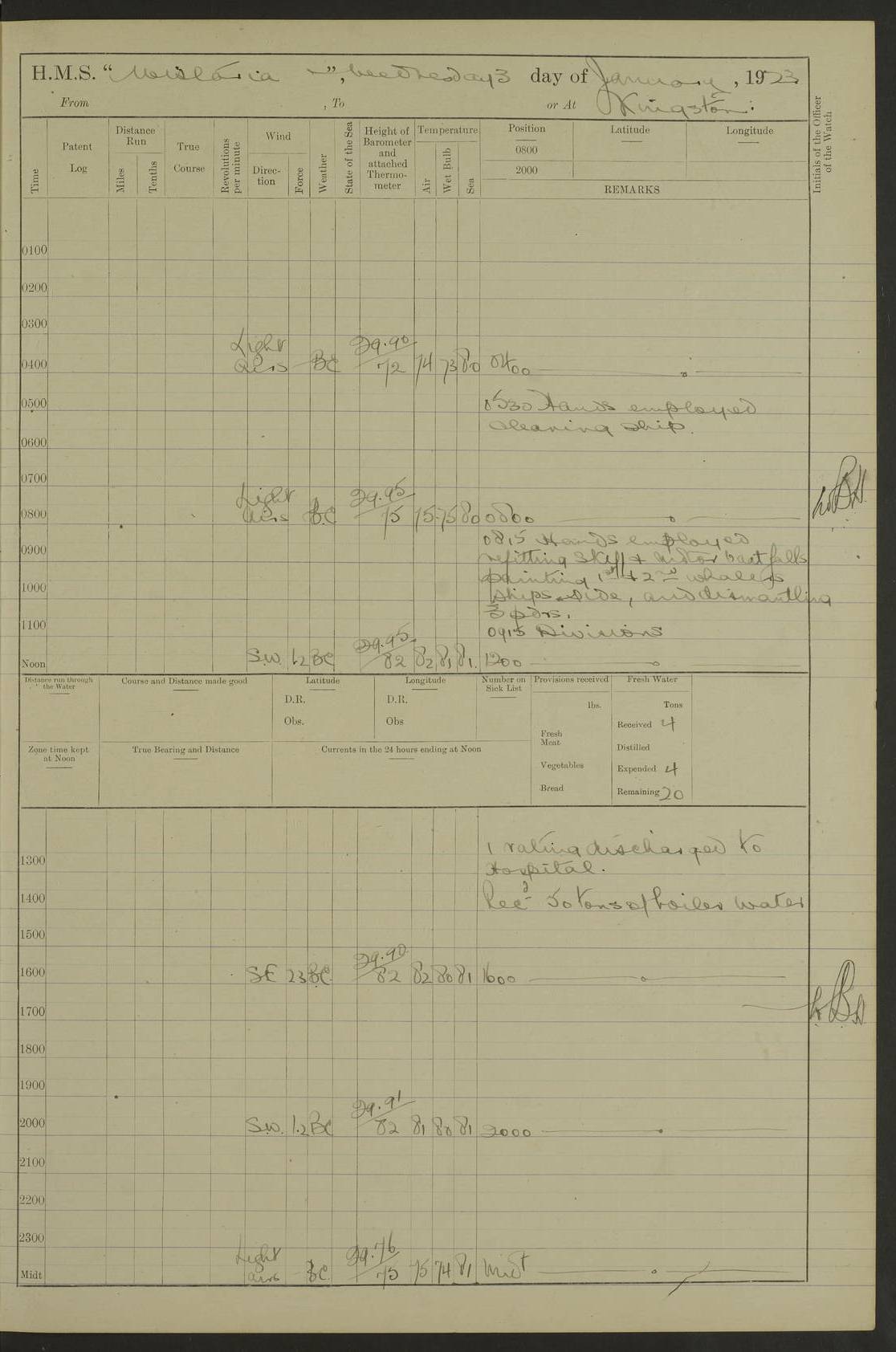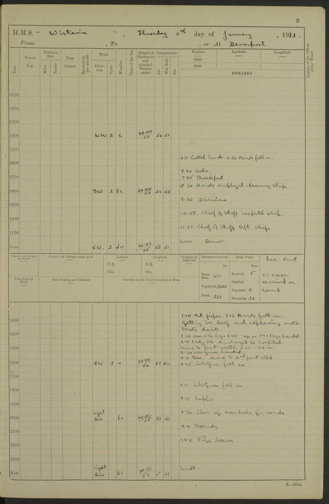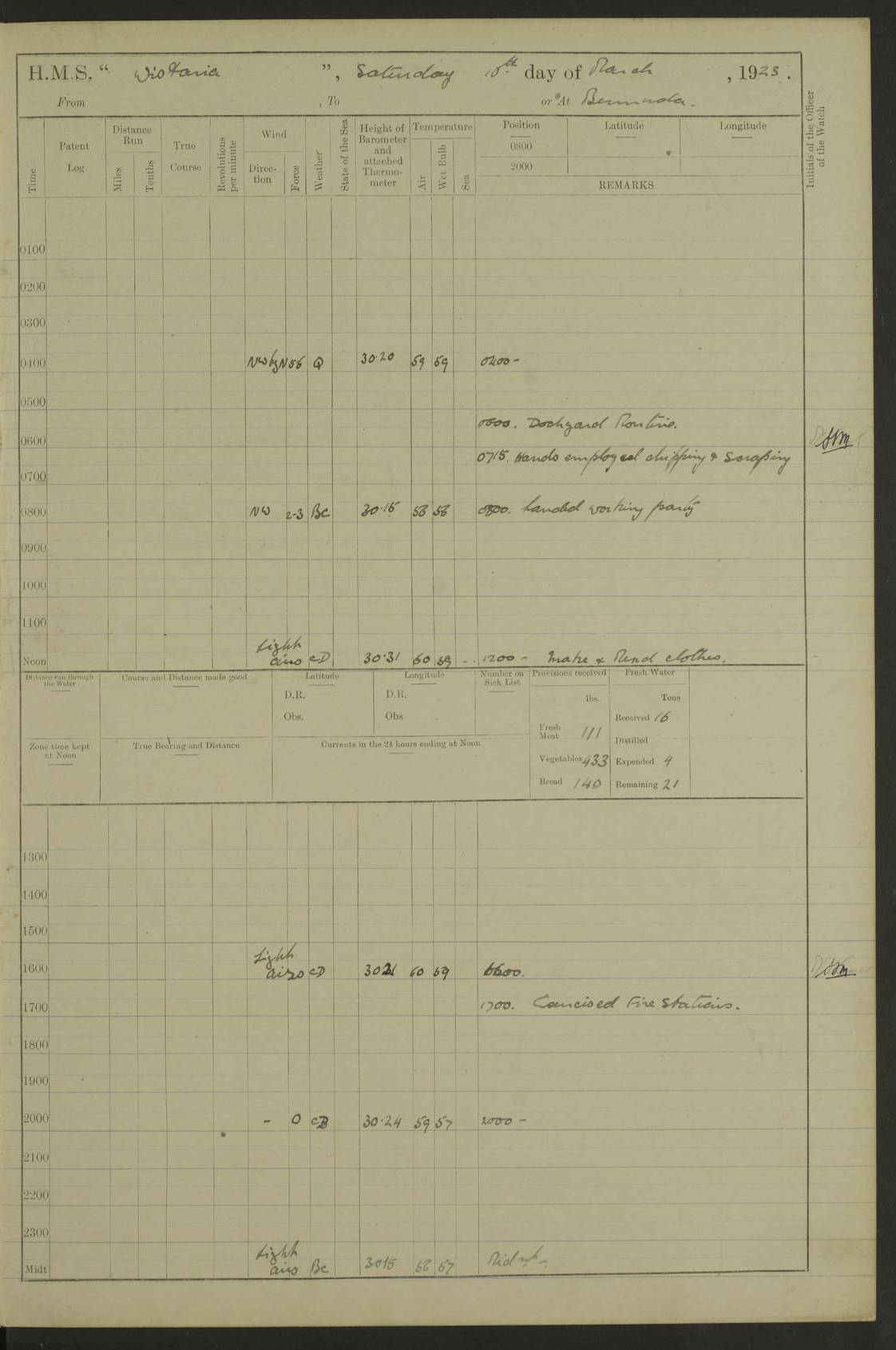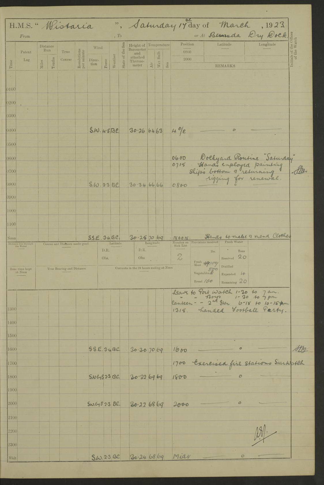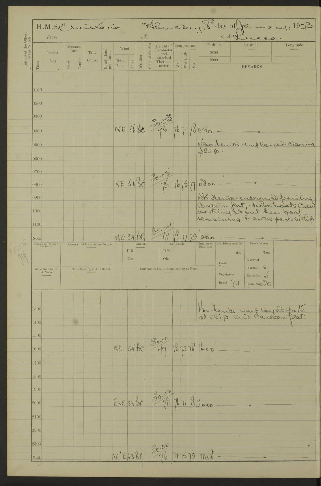 LOGS FOR DECEMBER 1920 4f73c9e6a2fc8ea903000965: (https://s3.amazonaws.com:443/oldweather/ADM53-93259/0003_1.jpg) 29 December 1920 At Devonport Lat 50.38, Long -4.19 9.0am: Commissioned with Chatham Crew 11.55am: Cooks to galley am: Sub Lt Jenks joined ship 1.10pm: Out pipes 1.15pm: Hands fall in. Employed in scrubbing and washing upper deck 3.30pm: Leave to 1st and 2nd watches 4 pm-7 am. Liberty men to clean 4.0pm: Liberty men fall in. Tea 4.15pm: Sunset 5.0pm: Liberty men fall in 6.0pm: Liberty men fall in 7.10pm: 1st Lieutenant returned from sick berth 7.15pm: Supper 8.0pm: Stand by hammocks 8.40pm: Clear off mess decks for rounds 9.0pm: Rounds 10.0pm: Pipe down 12.0pm: Rounds correct 4f73c9e7a2fc8ea903000966: (https://s3.amazonaws.com:443/oldweather/ADM53-93259/0004_0.jpg) 30 December 1920 At Devonport Lat 50.38, Long -4.19 6.0am: Called hands 6.30am: Hands fall in. Scrub & wash upper decks 7.20am: Quarters clean guns 7.50am: Secure 8.0am: Breakfast. Dress of day N°3 8.40am: Out pipes. Hands fall in am: Hands working main derrick. 4 hands & 1 Leading Seaman working with Chief Writer with stationery 10.20am: Stand easy 10.30am: Carry on with work 11.0am: Hands getting in provisions 11.30am: Afternoon watchmen to dinner noon: Dinner 1.15pm: Hands fall in. 1 Leading Seaman & hands with Chief Writer. 1 Leading Seaman & 2 AB Electr. Light. 3 AB with ship’s steward. 3 hands cleaning guns 3.40pm: Secure. Clear up decks 4.0pm: Evening Quarters. Sunset 4.24pm: Exercised collision stations 4.30pm: Secure. Tea. Leave to 2nd & 3rd watches 5 pm to 7 am 6.0pm: Liberty men fall in 7.15pm: Supper 8.0pm: Stand by hammocks 9.0pm: Rounds 10.0pm: Pipe down 4f73c9e7a2fc8ea903000967: (https://s3.amazonaws.com:443/oldweather/ADM53-93259/0004_1.jpg) 31 December 1920 At Devonport Lat 50.38, Long -4.19 6.30am: Hands scrubbing & washing upper decks 8.0am: Breakfast & clean Number 3 8.45am: Hands fall in. 6 hands unrigging fore derrick. 4 hands securing wood on upper deck. 3 hands stowing stanchions below decks 10.20am: Stand easy 10.30am: Carry on 10.45am: 4 hands getting in canteen gear 11.55am: Cooks noon: Dinner 1.15pm: Q.D. men unrigging awning stanchions, remainder securing derricks 3.40pm: Secure. Clear up decks 4.0pm: Evening Quarters 4.05pm: Tea 4.20pm: Sunset 7.10pm: Supper 8.0pm: Stand by hammocks LOGS FOR JANUARY 1921 4f73c9e7a2fc8ea903000968: (https://s3.amazonaws.com:443/oldweather/ADM53-93259/0005_0.jpg) 1 January 1921 At Devonport Lat 50.38, Long -4.19 6.0am: Called hands 6.30am: Hands fall in. Guard and steerage 7.30am: Store party to breakfast 7.45am: Breakfast 8.15am: Store party left ship 8.45am: Hands fall in. Stowing stanchions 10.20am: Stand easy 10.30am: Carry on with work noon: Dinner. Leave to Port watch 1 pm-7 am Monday. Leave to boys 1 pm to 6 pm pm: Hands make and mend clothes 4.0pm: Tea. Shift into night clothing 8.0pm: Stand by hammocks 4f73c9e8a2fc8ea903000969: (https://s3.amazonaws.com:443/oldweather/ADM53-93259/0005_1.jpg) 2 January 1921 At Devonport Lat 50.38, Long -4.19 7.0am: Hands fall in, scrub upper deck 8.0am: Breakfast and clean Number 2s 8.45am: Clear up decks for divisions 10.0am: Divisions 4.0pm: Tea. Shift into night clothing 8.0pm: Stand by hammocks 8.30pm: Clear up mess decks and flats for rounds 8.55pm: Clear off mess decks for rounds 9.0pm: Rounds 4f73c9e8a2fc8ea90300096a: (https://s3.amazonaws.com:443/oldweather/ADM53-93259/0006_0.jpg) 3 January 1921 At Devonport Lat 50.38, Long -4.19 6.15am: Hands fall in, scrub and wash upper deck 8.0am: Breakfast. Dress of day Number 3s 8.50am: Hands fall in. Stand fast cooks. Hands getting down stanchions and preparing 2nd whaler. Ship commenced basin trials 10.0am: Trial concluded 11.25am: Left dockyard for Number 5 buoy 12.05am: Hands to dinner & clean in refitting rig. Ammunition lighter alongside 1.15pm: Hands getting in ammunition 2.30pm: Lowered motor boat 3.30pm: Finished ammunitioning ship 5.0pm: Liberty men landed. Port watch store ammunition 8.40pm: Clear off mess deck for rounds 4f73c9e9a2fc8ea90300096b: (https://s3.amazonaws.com:443/oldweather/ADM53-93259/0006_1.jpg) 4 January 1921 At Devonport Lat 50.38, Long -4.19 6.30am: Hands fall in. Securing for sea 8.15am: Forecastle men muster on Forecastle, unshackle reeve ship wire 8.45am: Slipped and proceeded. Course and speed as required for full power trial 9.15am: Breakwater Lt Ho abeam 9.20am: Course S30E 10.30am: Altered course NE and as requisite for entering sound 10.55am: Secured to No 1 buoy (Sound) 11.30am: Made fast to buoy. Tug swung ship for compasses 1.0pm: Finished swinging for compasses. Forecastle men muster on forecastle 1.15pm: Entered harbour 2.15pm: Secured alongside wall 2.20pm: Coal lighter secured alongside 2.40pm: Hands to clear in coaling rig 3.0pm: Hands coal ship 4.55pm: Finished coaling 5.20pm: Hands fall in wash down decks 6.20pm: Hands paid 8.0pm: Stand by hammocks 8.20pm: Clear up mess decks for rounds 4f73c9e9a2fc8ea90300096c: (https://s3.amazonaws.com:443/oldweather/ADM53-93259/0007_0.jpg) 5 January 1921 At Devonport Lat 50.38, Long -4.19 6.30am: Hands fall in. Guard and steerage 8.0am: Carpenter & 4 hands employed in dockyard 8.10am: Ash lighter alongside 8.45am: Hands securing ship for sea 10.30am: Carry on. Hands to General Quarters 11.15am: Quarters clean guns 11.30am: Secure. Return rags 11.35am: Clear up decks noon: Store party returned. Hands to dinner 1.15pm: Hands fall in. 4 hands with carpenter, 2 with steward. Remainder securing ship for sea 4f73c9e9a2fc8ea90300096d: (https://s3.amazonaws.com:443/oldweather/ADM53-93259/0007_1.jpg) 6 January 1921 At Devonport Lat 50.38, Long -4.19 8.30am: Hands employed cleaning ship 10.50am: Chief of Staff inspected ship 11.33am: Chief of Staff left ship Ice sent. 12 cases received on board 1.15pm: Hands fall in. Getting in beef and replacing motor boats davit 2.0pm: 1 Leading Stoker discharged to hospital 4f73c9eaa2fc8ea90300096e: (https://s3.amazonaws.com:443/oldweather/ADM53-93259/00