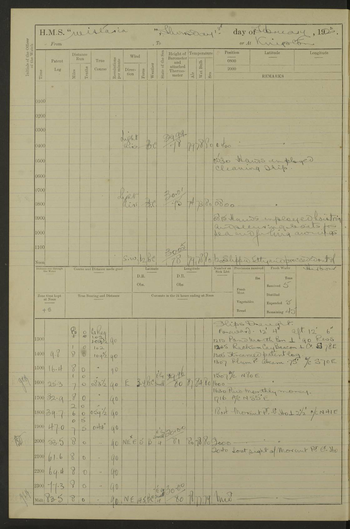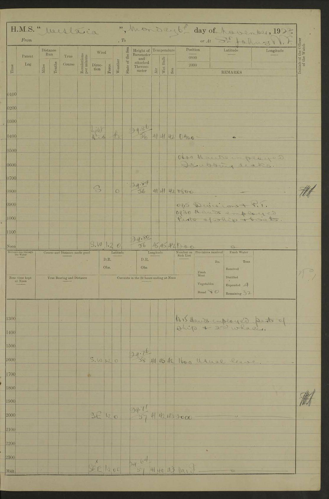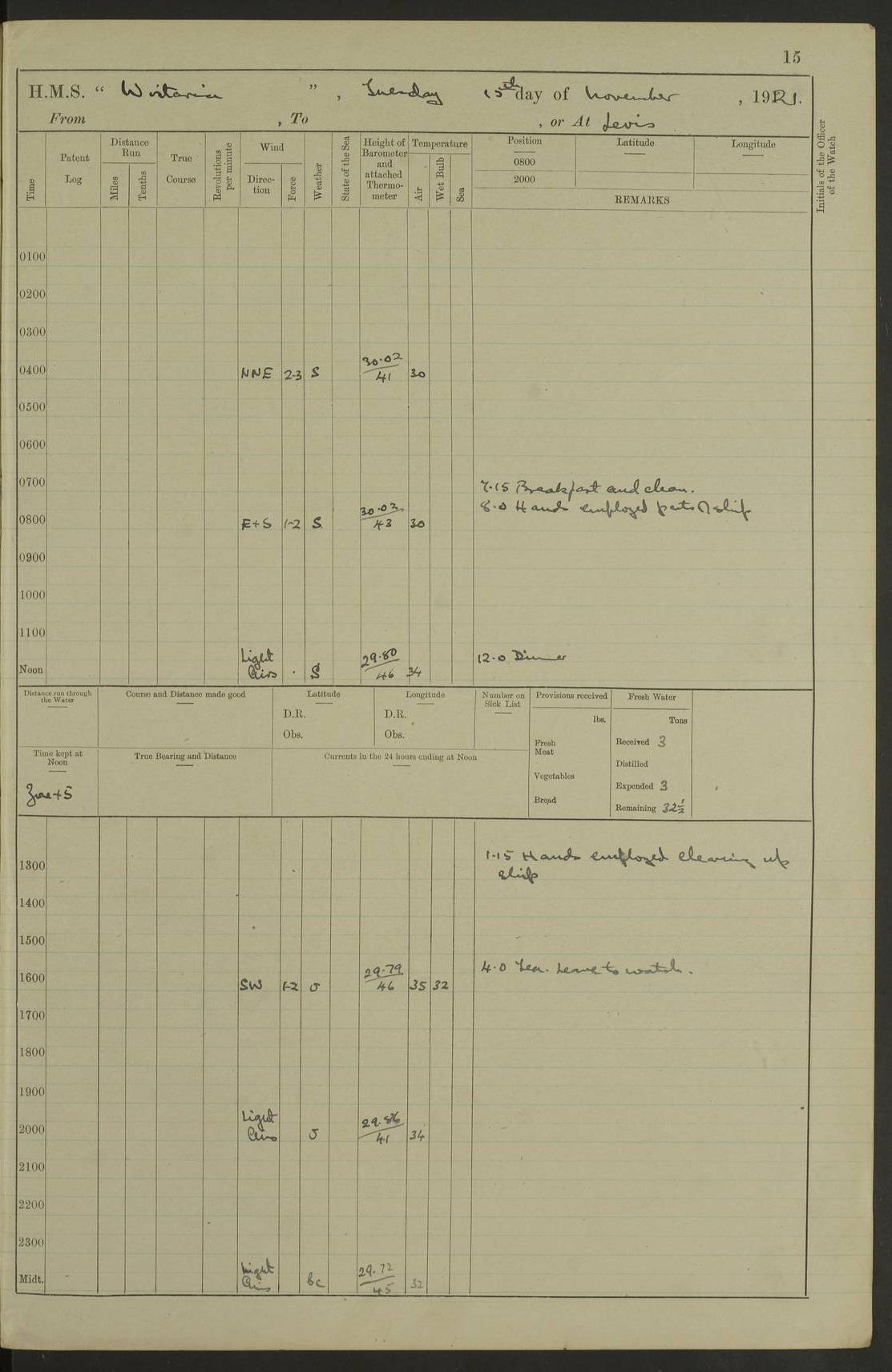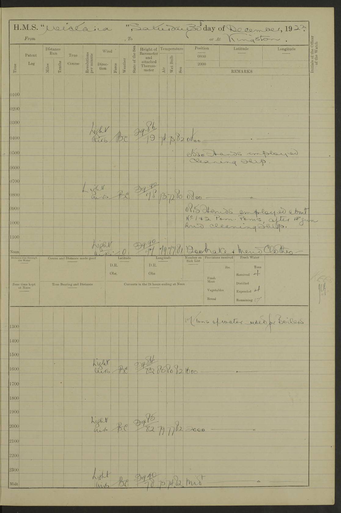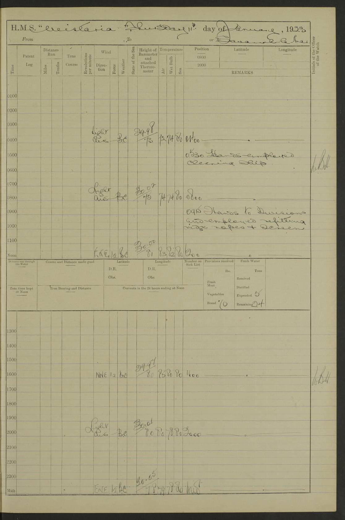 LOGS FOR DECEMBER 1920 4f73c9e6a2fc8ea903000965: (https://s3.amazonaws.com:443/oldweather/ADM53-93259/0003_1.jpg) 29 December 1920 At Devonport Lat 50.38, Long -4.19 9.0am: Commissioned with Chatham Crew 11.55am: Cooks to galley am: Sub Lt Jenks joined ship 1.10pm: Out pipes 1.15pm: Hands fall in. Employed in scrubbing and washing upper deck 3.30pm: Leave to 1st and 2nd watches 4 pm-7 am. Liberty men to clean 4.0pm: Liberty men fall in. Tea 4.15pm: Sunset 5.0pm: Liberty men fall in 6.0pm: Liberty men fall in 7.10pm: 1st Lieutenant returned from sick berth 7.15pm: Supper 8.0pm: Stand by hammocks 8.40pm: Clear off mess decks for rounds 9.0pm: Rounds 10.0pm: Pipe down 12.0pm: Rounds correct 4f73c9e7a2fc8ea903000966: (https://s3.amazonaws.com:443/oldweather/ADM53-93259/0004_0.jpg) 30 December 1920 At Devonport Lat 50.38, Long -4.19 6.0am: Called hands 6.30am: Hands fall in. Scrub & wash upper decks 7.20am: Quarters clean guns 7.50am: Secure 8.0am: Breakfast. Dress of day N°3 8.40am: Out pipes. Hands fall in am: Hands working main derrick. 4 hands & 1 Leading Seaman working with Chief Writer with stationery 10.20am: Stand easy 10.30am: Carry on with work 11.0am: Hands getting in provisions 11.30am: Afternoon watchmen to dinner noon: Dinner 1.15pm: Hands fall in. 1 Leading Seaman & hands with Chief Writer. 1 Leading Seaman & 2 AB Electr. Light. 3 AB with ship’s steward. 3 hands cleaning guns 3.40pm: Secure. Clear up decks 4.0pm: Evening Quarters. Sunset 4.24pm: Exercised collision stations 4.30pm: Secure. Tea. Leave to 2nd & 3rd watches 5 pm to 7 am 6.0pm: Liberty men fall in 7.15pm: Supper 8.0pm: Stand by hammocks 9.0pm: Rounds 10.0pm: Pipe down 4f73c9e7a2fc8ea903000967: (https://s3.amazonaws.com:443/oldweather/ADM53-93259/0004_1.jpg) 31 December 1920 At Devonport Lat 50.38, Long -4.19 6.30am: Hands scrubbing & washing upper decks 8.0am: Breakfast & clean Number 3 8.45am: Hands fall in. 6 hands unrigging fore derrick. 4 hands securing wood on upper deck. 3 hands stowing stanchions below decks 10.20am: Stand easy 10.30am: Carry on 10.45am: 4 hands getting in canteen gear 11.55am: Cooks noon: Dinner 1.15pm: Q.D. men unrigging awning stanchions, remainder securing derricks 3.40pm: Secure. Clear up decks 4.0pm: Evening Quarters 4.05pm: Tea 4.20pm: Sunset 7.10pm: Supper 8.0pm: Stand by hammocks LOGS FOR JANUARY 1921 4f73c9e7a2fc8ea903000968: (https://s3.amazonaws.com:443/oldweather/ADM53-93259/0005_0.jpg) 1 January 1921 At Devonport Lat 50.38, Long -4.19 6.0am: Called hands 6.30am: Hands fall in. Guard and steerage 7.30am: Store party to breakfast 7.45am: Breakfast 8.15am: Store party left ship 8.45am: Hands fall in. Stowing stanchions 10.20am: Stand easy 10.30am: Carry on with work noon: Dinner. Leave to Port watch 1 pm-7 am Monday. Leave to boys 1 pm to 6 pm pm: Hands make and mend clothes 4.0pm: Tea. Shift into night clothing 8.0pm: Stand by hammocks 4f73c9e8a2fc8ea903000969: (https://s3.amazonaws.com:443/oldweather/ADM53-93259/0005_1.jpg) 2 January 1921 At Devonport Lat 50.38, Long -4.19 7.0am: Hands fall in, scrub upper deck 8.0am: Breakfast and clean Number 2s 8.45am: Clear up decks for divisions 10.0am: Divisions 4.0pm: Tea. Shift into night clothing 8.0pm: Stand by hammocks 8.30pm: Clear up mess decks and flats for rounds 8.55pm: Clear off mess decks for rounds 9.0pm: Rounds 4f73c9e8a2fc8ea90300096a: (https://s3.amazonaws.com:443/oldweather/ADM53-93259/0006_0.jpg) 3 January 1921 At Devonport Lat 50.38, Long -4.19 6.15am: Hands fall in, scrub and wash upper deck 8.0am: Breakfast. Dress of day Number 3s 8.50am: Hands fall in. Stand fast cooks. Hands getting down stanchions and preparing 2nd whaler. Ship commenced basin trials 10.0am: Trial concluded 11.25am: Left dockyard for Number 5 buoy 12.05am: Hands to dinner & clean in refitting rig. Ammunition lighter alongside 1.15pm: Hands getting in ammunition 2.30pm: Lowered motor boat 3.30pm: Finished ammunitioning ship 5.0pm: Liberty men landed. Port watch store ammunition 8.40pm: Clear off mess deck for rounds 4f73c9e9a2fc8ea90300096b: (https://s3.amazonaws.com:443/oldweather/ADM53-93259/0006_1.jpg) 4 January 1921 At Devonport Lat 50.38, Long -4.19 6.30am: Hands fall in. Securing for sea 8.15am: Forecastle men muster on Forecastle, unshackle reeve ship wire 8.45am: Slipped and proceeded. Course and speed as required for full power trial 9.15am: Breakwater Lt Ho abeam 9.20am: Course S30E 10.30am: Altered course NE and as requisite for entering sound 10.55am: Secured to No 1 buoy (Sound) 11.30am: Made fast to buoy. Tug swung ship for compasses 1.0pm: Finished swinging for compasses. Forecastle men muster on forecastle 1.15pm: Entered harbour 2.15pm: Secured alongside wall 2.20pm: Coal lighter secured alongside 2.40pm: Hands to clear in coaling rig 3.0pm: Hands coal ship 4.55pm: Finished coaling 5.20pm: Hands fall in wash down decks 6.20pm: Hands paid 8.0pm: Stand by hammocks 8.20pm: Clear up mess decks for rounds 4f73c9e9a2fc8ea90300096c: (https://s3.amazonaws.com:443/oldweather/ADM53-93259/0007_0.jpg) 5 January 1921 At Devonport Lat 50.38, Long -4.19 6.30am: Hands fall in. Guard and steerage 8.0am: Carpenter & 4 hands employed in dockyard 8.10am: Ash lighter alongside 8.45am: Hands securing ship for sea 10.30am: Carry on. Hands to General Quarters 11.15am: Quarters clean guns 11.30am: Secure. Return rags 11.35am: Clear up decks noon: Store party returned. Hands to dinner 1.15pm: Hands fall in. 4 hands with carpenter, 2 with steward. Remainder securing ship for sea 4f73c9e9a2fc8ea90300096d: (https://s3.amazonaws.com:443/oldweather/ADM53-93259/0007_1.jpg) 6 January 1921 At Devonport Lat 50.38, Long -4.19 8.30am: Hands employed cleaning ship 10.50am: Chief of Staff inspected ship 11.33am: Chief of Staff left ship Ice sent. 12 cases received on board 1.15pm: Hands fall in. Getting in beef and replacing motor boats davit 2.0pm: 1 Leading Stoker discharged to hospital 4f73c9eaa2fc8ea90300096e: (https://s3.amazonaws.com:443/oldweather/ADM53-93259/00