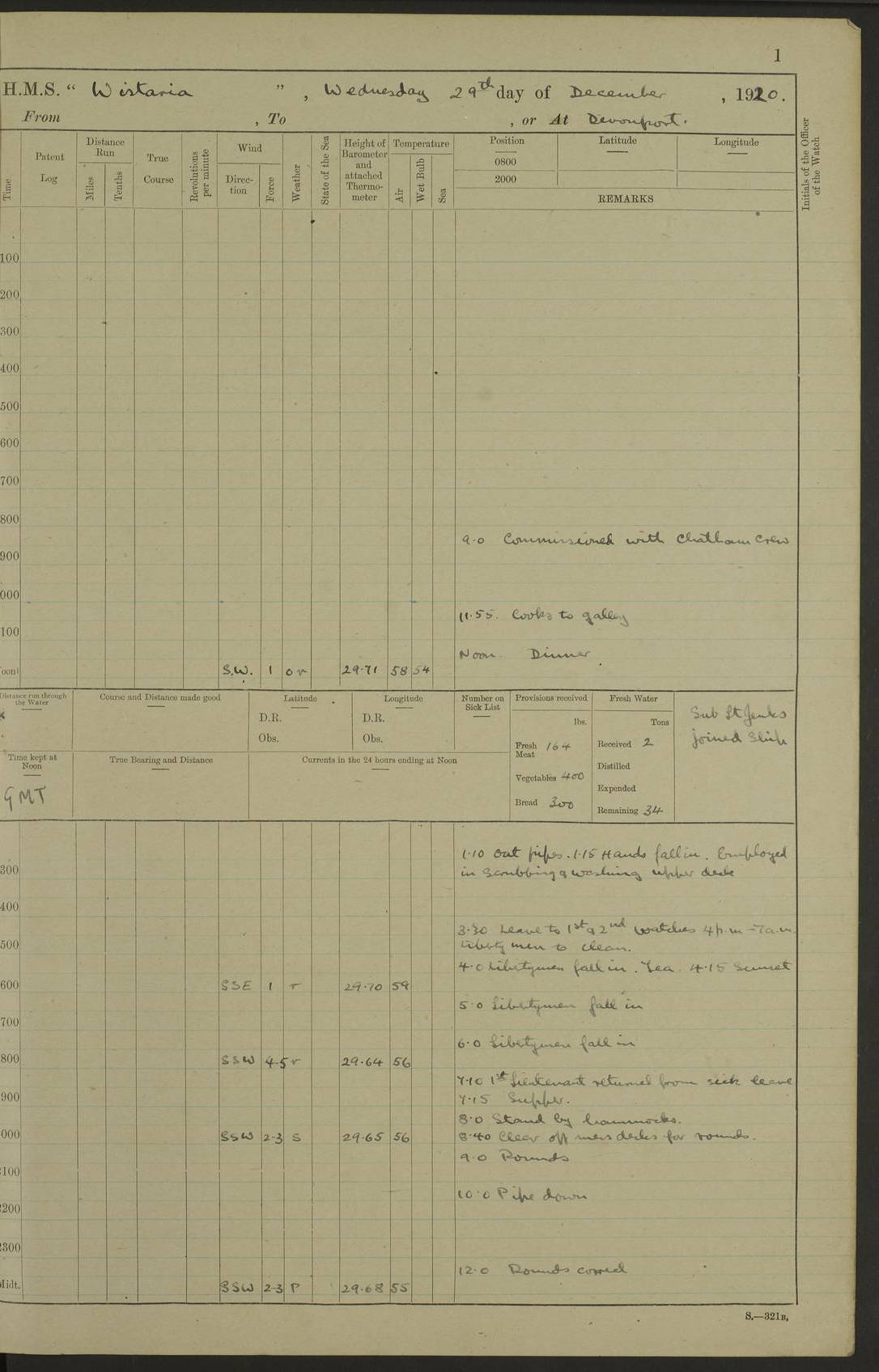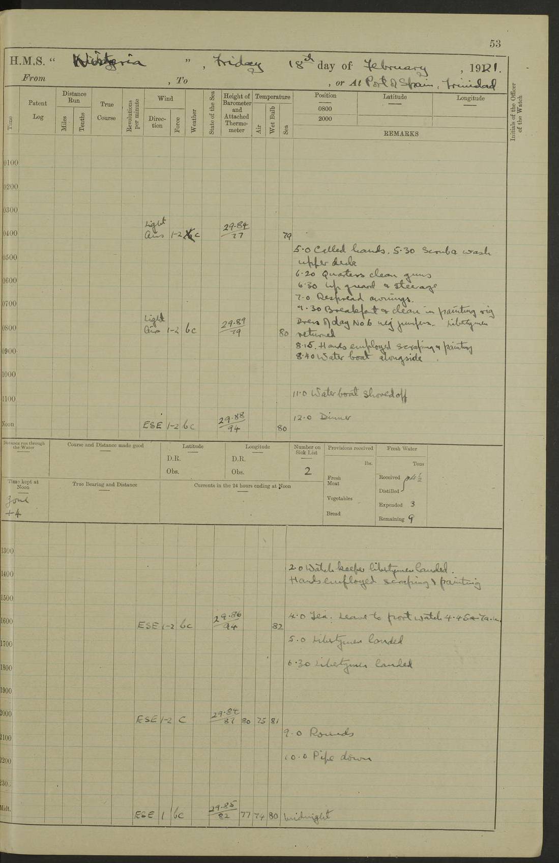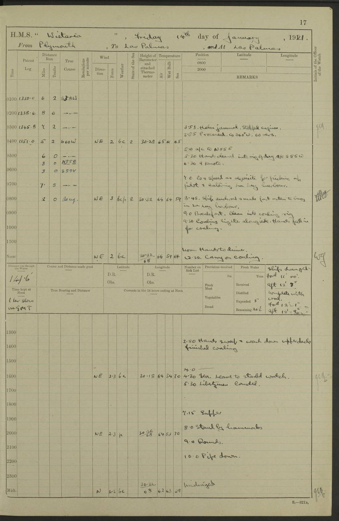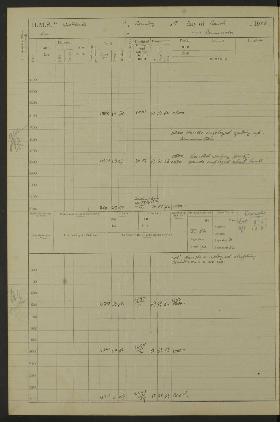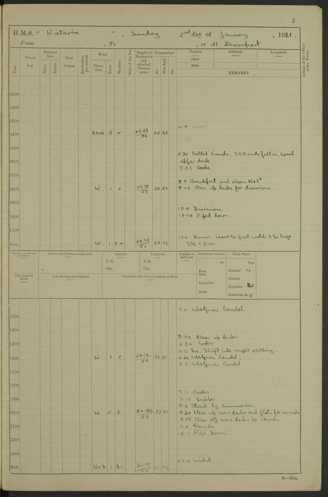 LOGS FOR DECEMBER 1920 4f73c9e6a2fc8ea903000965: (https://s3.amazonaws.com:443/oldweather/ADM53-93259/0003_1.jpg) 29 December 1920 At Devonport Lat 50.38, Long -4.19 9.0am: Commissioned with Chatham Crew 11.55am: Cooks to galley am: Sub Lt Jenks joined ship 1.10pm: Out pipes 1.15pm: Hands fall in. Employed in scrubbing and washing upper deck 3.30pm: Leave to 1st and 2nd watches 4 pm-7 am. Liberty men to clean 4.0pm: Liberty men fall in. Tea 4.15pm: Sunset 5.0pm: Liberty men fall in 6.0pm: Liberty men fall in 7.10pm: 1st Lieutenant returned from sick berth 7.15pm: Supper 8.0pm: Stand by hammocks 8.40pm: Clear off mess decks for rounds 9.0pm: Rounds 10.0pm: Pipe down 12.0pm: Rounds correct 4f73c9e7a2fc8ea903000966: (https://s3.amazonaws.com:443/oldweather/ADM53-93259/0004_0.jpg) 30 December 1920 At Devonport Lat 50.38, Long -4.19 6.0am: Called hands 6.30am: Hands fall in. Scrub & wash upper decks 7.20am: Quarters clean guns 7.50am: Secure 8.0am: Breakfast. Dress of day N°3 8.40am: Out pipes. Hands fall in am: Hands working main derrick. 4 hands & 1 Leading Seaman working with Chief Writer with stationery 10.20am: Stand easy 10.30am: Carry on with work 11.0am: Hands getting in provisions 11.30am: Afternoon watchmen to dinner noon: Dinner 1.15pm: Hands fall in. 1 Leading Seaman & hands with Chief Writer. 1 Leading Seaman & 2 AB Electr. Light. 3 AB with ship’s steward. 3 hands cleaning guns 3.40pm: Secure. Clear up decks 4.0pm: Evening Quarters. Sunset 4.24pm: Exercised collision stations 4.30pm: Secure. Tea. Leave to 2nd & 3rd watches 5 pm to 7 am 6.0pm: Liberty men fall in 7.15pm: Supper 8.0pm: Stand by hammocks 9.0pm: Rounds 10.0pm: Pipe down 4f73c9e7a2fc8ea903000967: (https://s3.amazonaws.com:443/oldweather/ADM53-93259/0004_1.jpg) 31 December 1920 At Devonport Lat 50.38, Long -4.19 6.30am: Hands scrubbing & washing upper decks 8.0am: Breakfast & clean Number 3 8.45am: Hands fall in. 6 hands unrigging fore derrick. 4 hands securing wood on upper deck. 3 hands stowing stanchions below decks 10.20am: Stand easy 10.30am: Carry on 10.45am: 4 hands getting in canteen gear 11.55am: Cooks noon: Dinner 1.15pm: Q.D. men unrigging awning stanchions, remainder securing derricks 3.40pm: Secure. Clear up decks 4.0pm: Evening Quarters 4.05pm: Tea 4.20pm: Sunset 7.10pm: Supper 8.0pm: Stand by hammocks LOGS FOR JANUARY 1921 4f73c9e7a2fc8ea903000968: (https://s3.amazonaws.com:443/oldweather/ADM53-93259/0005_0.jpg) 1 January 1921 At Devonport Lat 50.38, Long -4.19 6.0am: Called hands 6.30am: Hands fall in. Guard and steerage 7.30am: Store party to breakfast 7.45am: Breakfast 8.15am: Store party left ship 8.45am: Hands fall in. Stowing stanchions 10.20am: Stand easy 10.30am: Carry on with work noon: Dinner. Leave to Port watch 1 pm-7 am Monday. Leave to boys 1 pm to 6 pm pm: Hands make and mend clothes 4.0pm: Tea. Shift into night clothing 8.0pm: Stand by hammocks 4f73c9e8a2fc8ea903000969: (https://s3.amazonaws.com:443/oldweather/ADM53-93259/0005_1.jpg) 2 January 1921 At Devonport Lat 50.38, Long -4.19 7.0am: Hands fall in, scrub upper deck 8.0am: Breakfast and clean Number 2s 8.45am: Clear up decks for divisions 10.0am: Divisions 4.0pm: Tea. Shift into night clothing 8.0pm: Stand by hammocks 8.30pm: Clear up mess decks and flats for rounds 8.55pm: Clear off mess decks for rounds 9.0pm: Rounds 4f73c9e8a2fc8ea90300096a: (https://s3.amazonaws.com:443/oldweather/ADM53-93259/0006_0.jpg) 3 January 1921 At Devonport Lat 50.38, Long -4.19 6.15am: Hands fall in, scrub and wash upper deck 8.0am: Breakfast. Dress of day Number 3s 8.50am: Hands fall in. Stand fast cooks. Hands getting down stanchions and preparing 2nd whaler. Ship commenced basin trials 10.0am: Trial concluded 11.25am: Left dockyard for Number 5 buoy 12.05am: Hands to dinner & clean in refitting rig. Ammunition lighter alongside 1.15pm: Hands getting in ammunition 2.30pm: Lowered motor boat 3.30pm: Finished ammunitioning ship 5.0pm: Liberty men landed. Port watch store ammunition 8.40pm: Clear off mess deck for rounds 4f73c9e9a2fc8ea90300096b: (https://s3.amazonaws.com:443/oldweather/ADM53-93259/0006_1.jpg) 4 January 1921 At Devonport Lat 50.38, Long -4.19 6.30am: Hands fall in. Securing for sea 8.15am: Forecastle men muster on Forecastle, unshackle reeve ship wire 8.45am: Slipped and proceeded. Course and speed as required for full power trial 9.15am: Breakwater Lt Ho abeam 9.20am: Course S30E 10.30am: Altered course NE and as requisite for entering sound 10.55am: Secured to No 1 buoy (Sound) 11.30am: Made fast to buoy. Tug swung ship for compasses 1.0pm: Finished swinging for compasses. Forecastle men muster on forecastle 1.15pm: Entered harbour 2.15pm: Secured alongside wall 2.20pm: Coal lighter secured alongside 2.40pm: Hands to clear in coaling rig 3.0pm: Hands coal ship 4.55pm: Finished coaling 5.20pm: Hands fall in wash down decks 6.20pm: Hands paid 8.0pm: Stand by hammocks 8.20pm: Clear up mess decks for rounds 4f73c9e9a2fc8ea90300096c: (https://s3.amazonaws.com:443/oldweather/ADM53-93259/0007_0.jpg) 5 January 1921 At Devonport Lat 50.38, Long -4.19 6.30am: Hands fall in. Guard and steerage 8.0am: Carpenter & 4 hands employed in dockyard 8.10am: Ash lighter alongside 8.45am: Hands securing ship for sea 10.30am: Carry on. Hands to General Quarters 11.15am: Quarters clean guns 11.30am: Secure. Return rags 11.35am: Clear up decks noon: Store party returned. Hands to dinner 1.15pm: Hands fall in. 4 hands with carpenter, 2 with steward. Remainder securing ship for sea 4f73c9e9a2fc8ea90300096d: (https://s3.amazonaws.com:443/oldweather/ADM53-93259/0007_1.jpg) 6 January 1921 At Devonport Lat 50.38, Long -4.19 8.30am: Hands employed cleaning ship 10.50am: Chief of Staff inspected ship 11.33am: Chief of Staff left ship Ice sent. 12 cases received on board 1.15pm: Hands fall in. Getting in beef and replacing motor boats davit 2.0pm: 1 Leading Stoker discharged to hospital 4f73c9eaa2fc8ea90300096e: (https://s3.amazonaws.com:443/oldweather/ADM53-93259/00