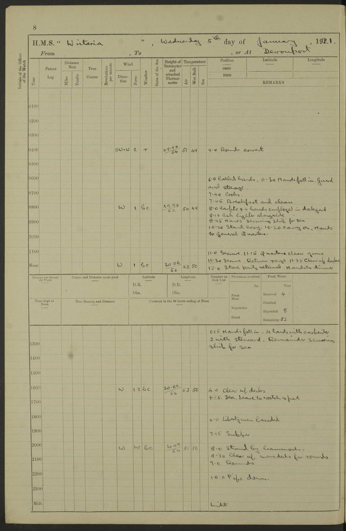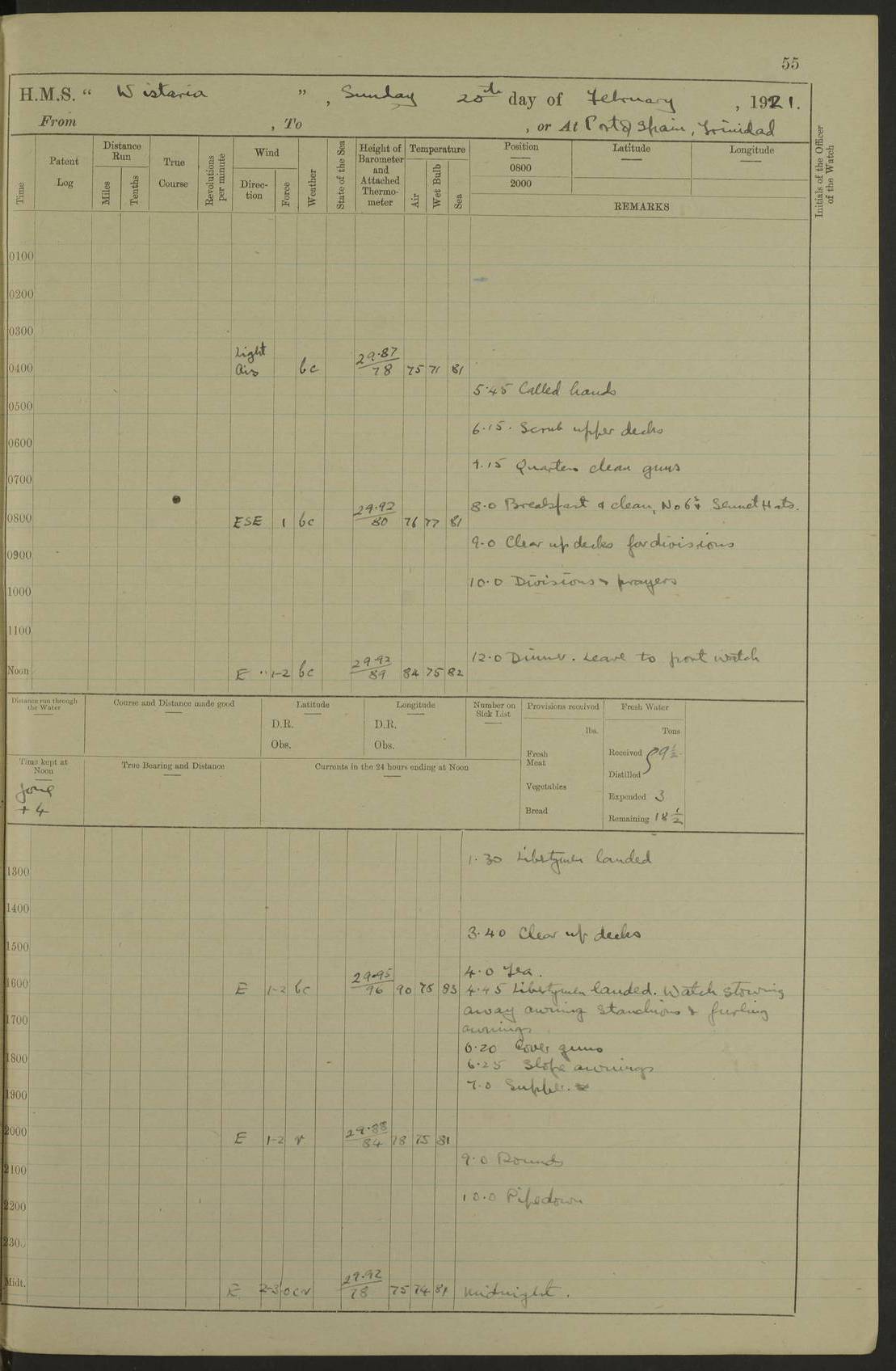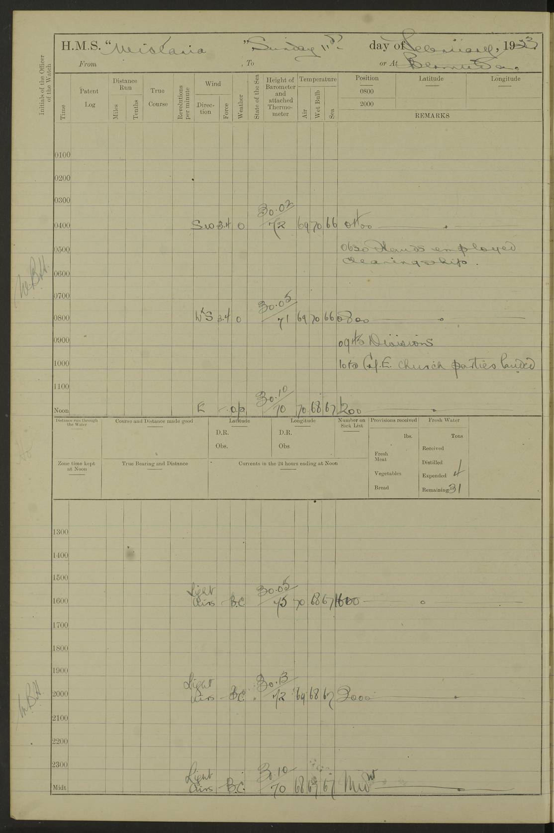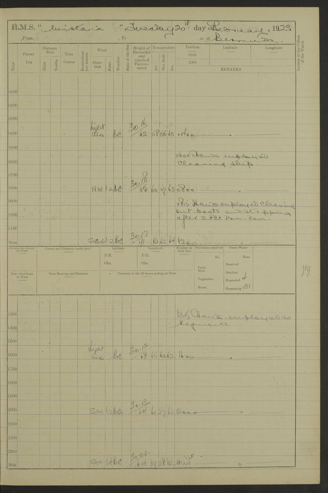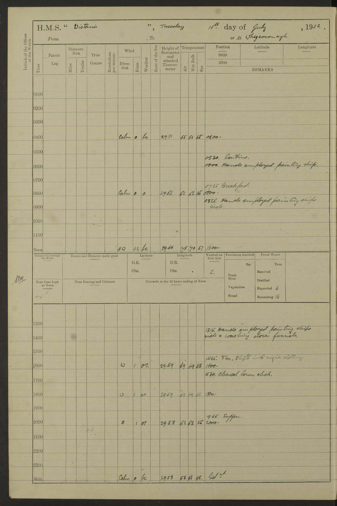 LOGS FOR DECEMBER 1920 4f73c9e6a2fc8ea903000965: (https://s3.amazonaws.com:443/oldweather/ADM53-93259/0003_1.jpg) 29 December 1920 At Devonport Lat 50.38, Long -4.19 9.0am: Commissioned with Chatham Crew 11.55am: Cooks to galley am: Sub Lt Jenks joined ship 1.10pm: Out pipes 1.15pm: Hands fall in. Employed in scrubbing and washing upper deck 3.30pm: Leave to 1st and 2nd watches 4 pm-7 am. Liberty men to clean 4.0pm: Liberty men fall in. Tea 4.15pm: Sunset 5.0pm: Liberty men fall in 6.0pm: Liberty men fall in 7.10pm: 1st Lieutenant returned from sick berth 7.15pm: Supper 8.0pm: Stand by hammocks 8.40pm: Clear off mess decks for rounds 9.0pm: Rounds 10.0pm: Pipe down 12.0pm: Rounds correct 4f73c9e7a2fc8ea903000966: (https://s3.amazonaws.com:443/oldweather/ADM53-93259/0004_0.jpg) 30 December 1920 At Devonport Lat 50.38, Long -4.19 6.0am: Called hands 6.30am: Hands fall in. Scrub & wash upper decks 7.20am: Quarters clean guns 7.50am: Secure 8.0am: Breakfast. Dress of day N°3 8.40am: Out pipes. Hands fall in am: Hands working main derrick. 4 hands & 1 Leading Seaman working with Chief Writer with stationery 10.20am: Stand easy 10.30am: Carry on with work 11.0am: Hands getting in provisions 11.30am: Afternoon watchmen to dinner noon: Dinner 1.15pm: Hands fall in. 1 Leading Seaman & hands with Chief Writer. 1 Leading Seaman & 2 AB Electr. Light. 3 AB with ship’s steward. 3 hands cleaning guns 3.40pm: Secure. Clear up decks 4.0pm: Evening Quarters. Sunset 4.24pm: Exercised collision stations 4.30pm: Secure. Tea. Leave to 2nd & 3rd watches 5 pm to 7 am 6.0pm: Liberty men fall in 7.15pm: Supper 8.0pm: Stand by hammocks 9.0pm: Rounds 10.0pm: Pipe down 4f73c9e7a2fc8ea903000967: (https://s3.amazonaws.com:443/oldweather/ADM53-93259/0004_1.jpg) 31 December 1920 At Devonport Lat 50.38, Long -4.19 6.30am: Hands scrubbing & washing upper decks 8.0am: Breakfast & clean Number 3 8.45am: Hands fall in. 6 hands unrigging fore derrick. 4 hands securing wood on upper deck. 3 hands stowing stanchions below decks 10.20am: Stand easy 10.30am: Carry on 10.45am: 4 hands getting in canteen gear 11.55am: Cooks noon: Dinner 1.15pm: Q.D. men unrigging awning stanchions, remainder securing derricks 3.40pm: Secure. Clear up decks 4.0pm: Evening Quarters 4.05pm: Tea 4.20pm: Sunset 7.10pm: Supper 8.0pm: Stand by hammocks LOGS FOR JANUARY 1921 4f73c9e7a2fc8ea903000968: (https://s3.amazonaws.com:443/oldweather/ADM53-93259/0005_0.jpg) 1 January 1921 At Devonport Lat 50.38, Long -4.19 6.0am: Called hands 6.30am: Hands fall in. Guard and steerage 7.30am: Store party to breakfast 7.45am: Breakfast 8.15am: Store party left ship 8.45am: Hands fall in. Stowing stanchions 10.20am: Stand easy 10.30am: Carry on with work noon: Dinner. Leave to Port watch 1 pm-7 am Monday. Leave to boys 1 pm to 6 pm pm: Hands make and mend clothes 4.0pm: Tea. Shift into night clothing 8.0pm: Stand by hammocks 4f73c9e8a2fc8ea903000969: (https://s3.amazonaws.com:443/oldweather/ADM53-93259/0005_1.jpg) 2 January 1921 At Devonport Lat 50.38, Long -4.19 7.0am: Hands fall in, scrub upper deck 8.0am: Breakfast and clean Number 2s 8.45am: Clear up decks for divisions 10.0am: Divisions 4.0pm: Tea. Shift into night clothing 8.0pm: Stand by hammocks 8.30pm: Clear up mess decks and flats for rounds 8.55pm: Clear off mess decks for rounds 9.0pm: Rounds 4f73c9e8a2fc8ea90300096a: (https://s3.amazonaws.com:443/oldweather/ADM53-93259/0006_0.jpg) 3 January 1921 At Devonport Lat 50.38, Long -4.19 6.15am: Hands fall in, scrub and wash upper deck 8.0am: Breakfast. Dress of day Number 3s 8.50am: Hands fall in. Stand fast cooks. Hands getting down stanchions and preparing 2nd whaler. Ship commenced basin trials 10.0am: Trial concluded 11.25am: Left dockyard for Number 5 buoy 12.05am: Hands to dinner & clean in refitting rig. Ammunition lighter alongside 1.15pm: Hands getting in ammunition 2.30pm: Lowered motor boat 3.30pm: Finished ammunitioning ship 5.0pm: Liberty men landed. Port watch store ammunition 8.40pm: Clear off mess deck for rounds 4f73c9e9a2fc8ea90300096b: (https://s3.amazonaws.com:443/oldweather/ADM53-93259/0006_1.jpg) 4 January 1921 At Devonport Lat 50.38, Long -4.19 6.30am: Hands fall in. Securing for sea 8.15am: Forecastle men muster on Forecastle, unshackle reeve ship wire 8.45am: Slipped and proceeded. Course and speed as required for full power trial 9.15am: Breakwater Lt Ho abeam 9.20am: Course S30E 10.30am: Altered course NE and as requisite for entering sound 10.55am: Secured to No 1 buoy (Sound) 11.30am: Made fast to buoy. Tug swung ship for compasses 1.0pm: Finished swinging for compasses. Forecastle men muster on forecastle 1.15pm: Entered harbour 2.15pm: Secured alongside wall 2.20pm: Coal lighter secured alongside 2.40pm: Hands to clear in coaling rig 3.0pm: Hands coal ship 4.55pm: Finished coaling 5.20pm: Hands fall in wash down decks 6.20pm: Hands paid 8.0pm: Stand by hammocks 8.20pm: Clear up mess decks for rounds 4f73c9e9a2fc8ea90300096c: (https://s3.amazonaws.com:443/oldweather/ADM53-93259/0007_0.jpg) 5 January 1921 At Devonport Lat 50.38, Long -4.19 6.30am: Hands fall in. Guard and steerage 8.0am: Carpenter & 4 hands employed in dockyard 8.10am: Ash lighter alongside 8.45am: Hands securing ship for sea 10.30am: Carry on. Hands to General Quarters 11.15am: Quarters clean guns 11.30am: Secure. Return rags 11.35am: Clear up decks noon: Store party returned. Hands to dinner 1.15pm: Hands fall in. 4 hands with carpenter, 2 with steward. Remainder securing ship for sea 4f73c9e9a2fc8ea90300096d: (https://s3.amazonaws.com:443/oldweather/ADM53-93259/0007_1.jpg) 6 January 1921 At Devonport Lat 50.38, Long -4.19 8.30am: Hands employed cleaning ship 10.50am: Chief of Staff inspected ship 11.33am: Chief of Staff left ship Ice sent. 12 cases received on board 1.15pm: Hands fall in. Getting in beef and replacing motor boats davit 2.0pm: 1 Leading Stoker discharged to hospital 4f73c9eaa2fc8ea90300096e: (https://s3.amazonaws.com:443/oldweather/ADM53-93259/00